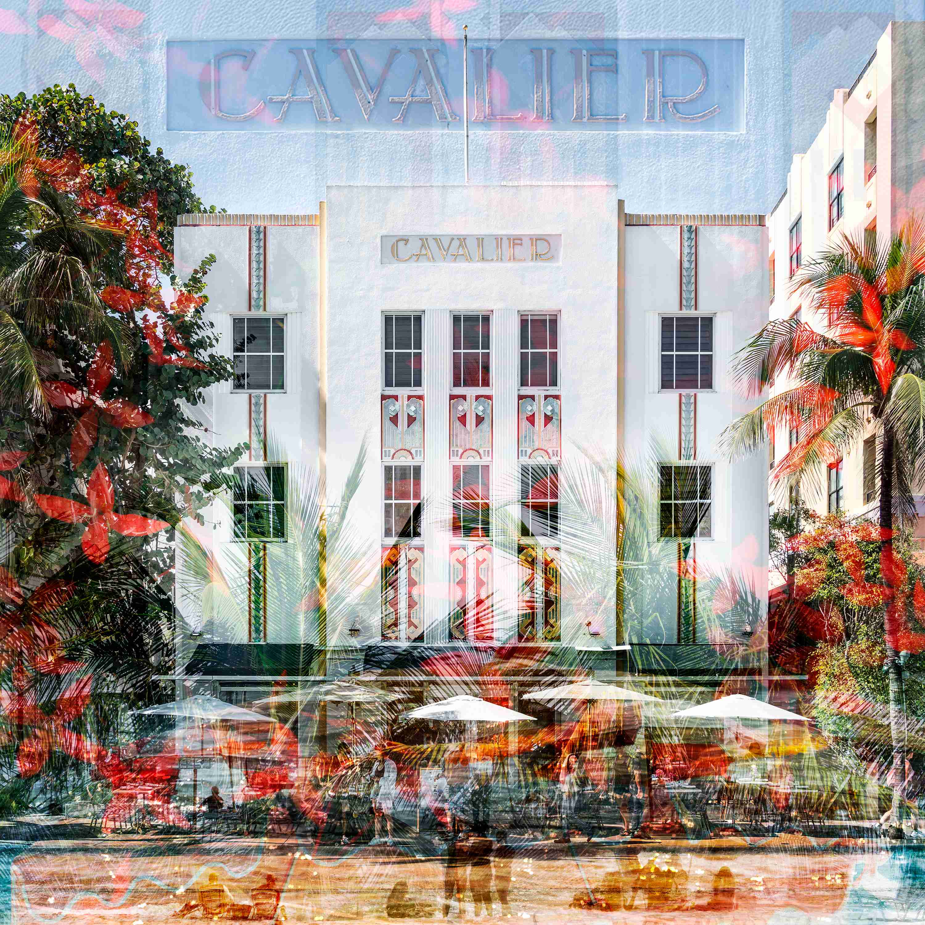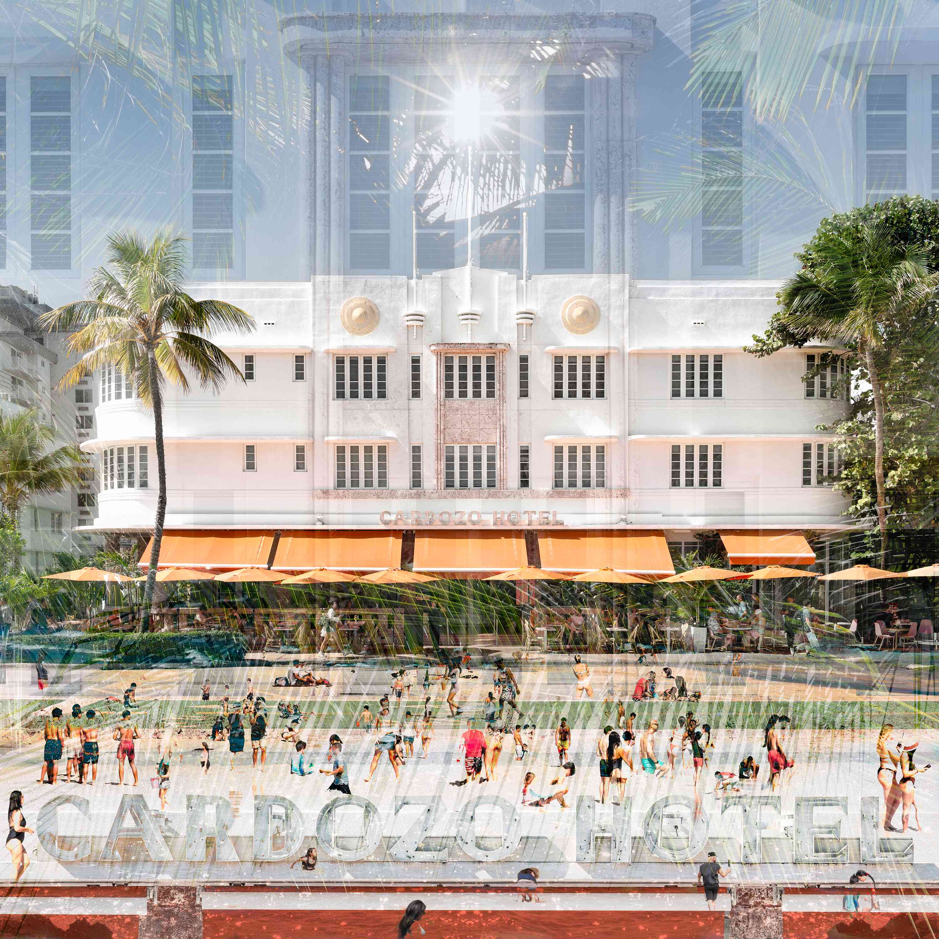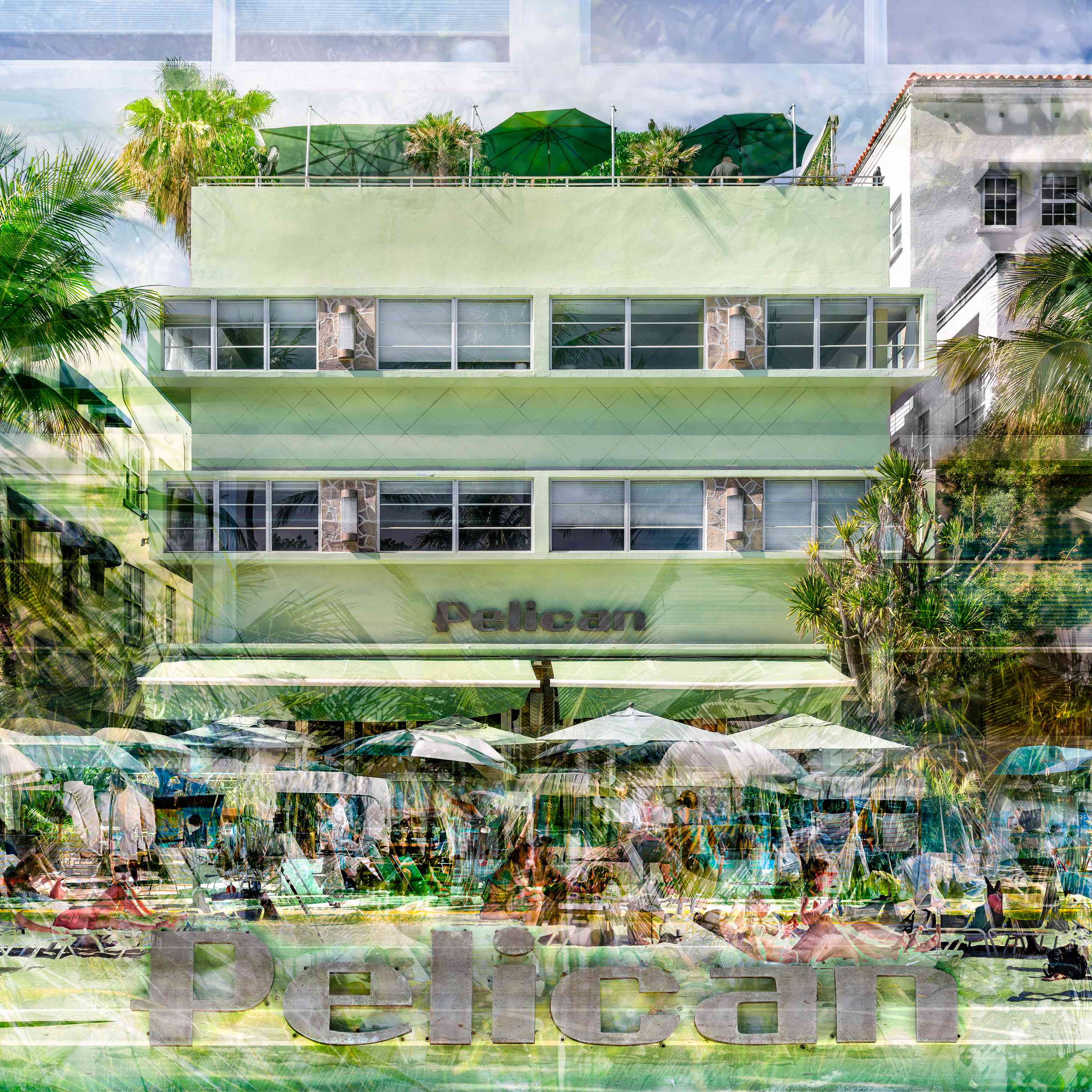 This series transmits the feeling of walking by these architectural gems on Ocean Drive, enjoying the beach and embracing the natural environment of South Beach. The layered photographs capture the overall design of these masterpieces, with their sleek lines, geometric patterns, and pastel hues, as well as some of their details, while also blending with the life that pulses around them. Each layer is a memory, a moment that catches the eye: the beachgoers, the sun, the palm trees, and the way the light reflects off the ocean. While combined through the work, they create a composition converging past and present, blending architecture, humanity, and nature. The spirit of South Beach emerges as experienced and remembered.