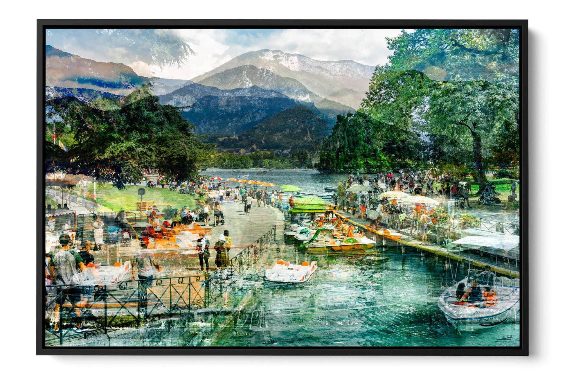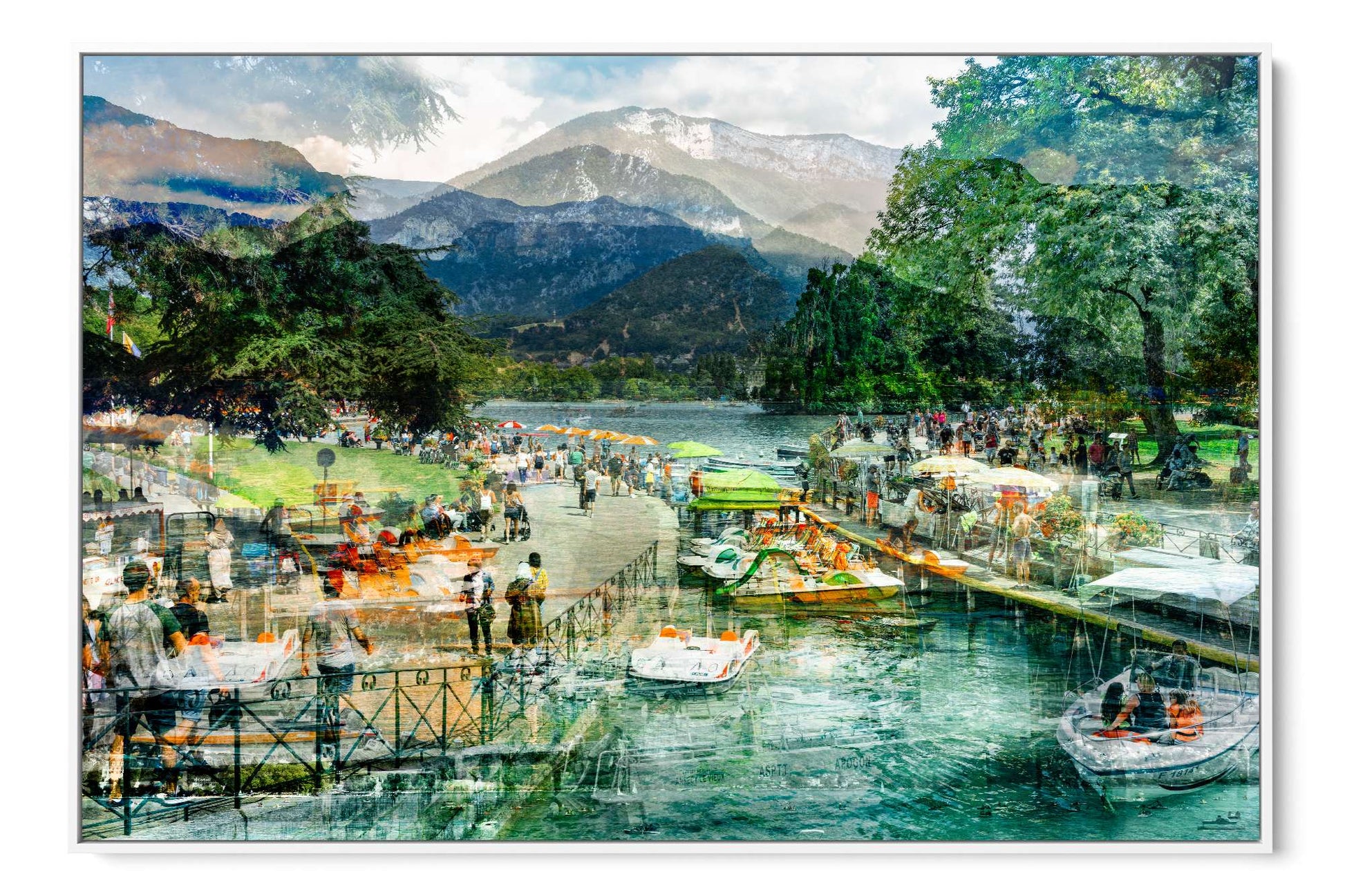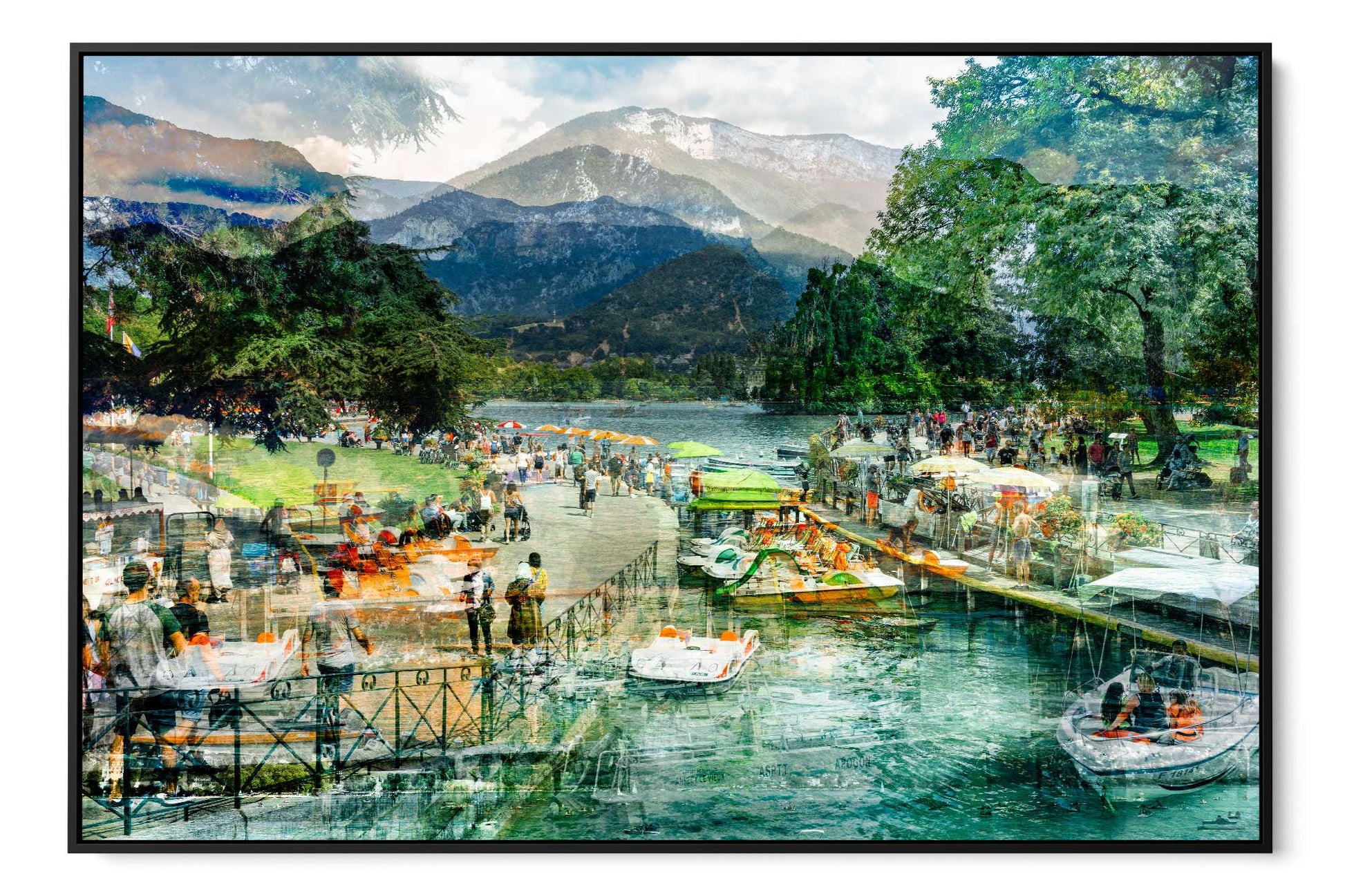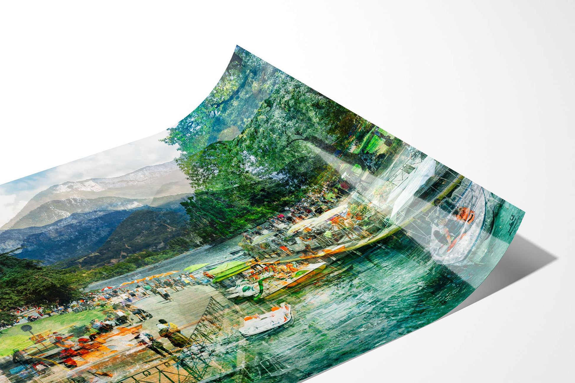 In Afternoon Walk at Lake Annecy, Charlotte Fonne captures the essence of her hometown through her signature layered photographic technique, blending reality and memory. The artwork evokes the serene green and turquoise waters of Lake Annecy framed by the French Alps, where boaters drift, walkers stroll, and the soft rhythm of summer afternoons unfolds. Inspired by Impressionist painters, this fine art photography print merges multiple photographs into a dreamlike scene, blurring the boundary between observation and remembrance.