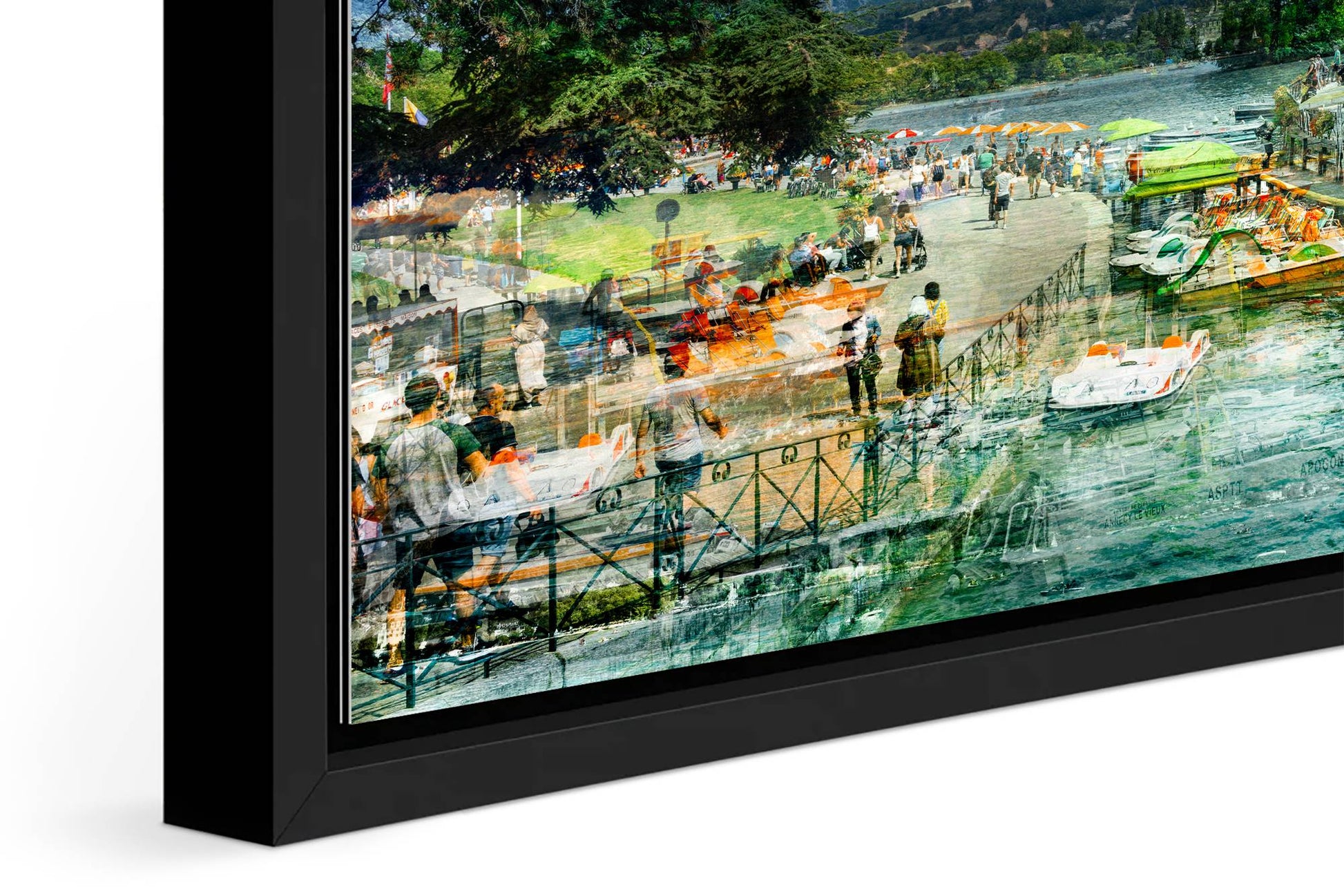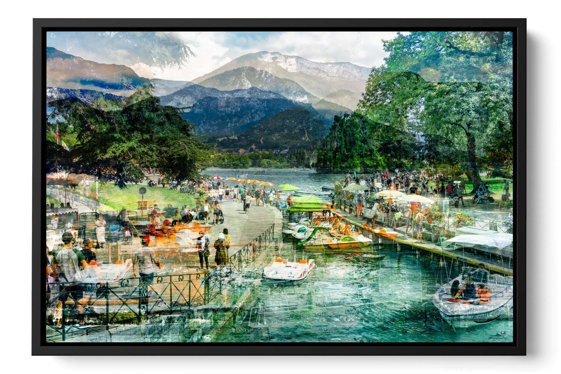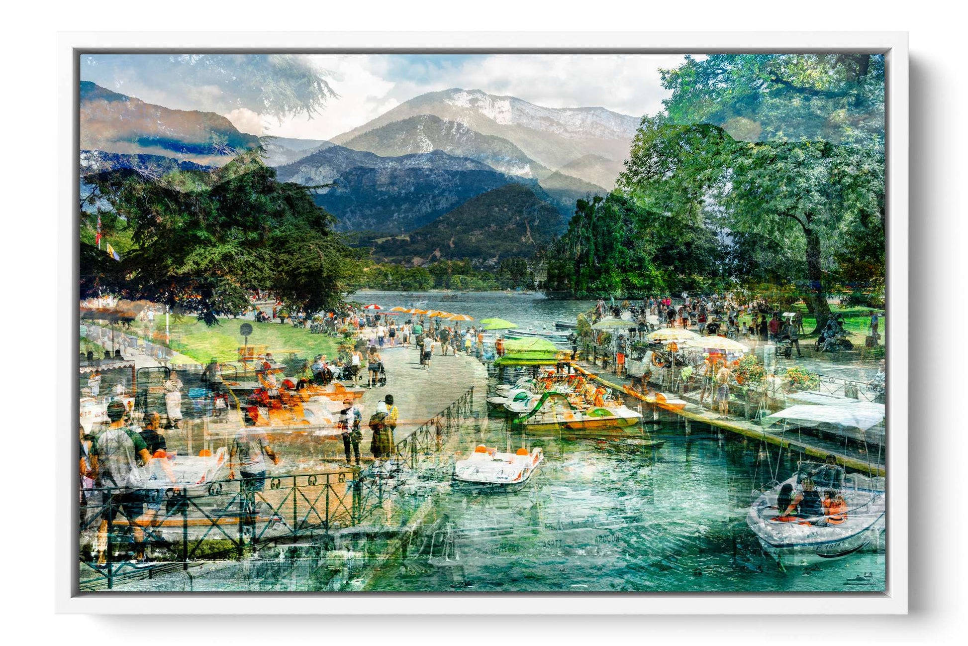 In Afternoon Walk at Lake Annecy, Charlotte Fonne captures the essence of her hometown through her signature layered photographic technique, blending reality and memory. The artwork evokes the serene green and turquoise waters of Lake Annecy framed by the French Alps, where boaters drift, walkers stroll, and the soft rhythm of summer afternoons unfolds. Inspired by Impressionist painters, this fine art photography print merges multiple photographs into a dreamlike scene, blurring the boundary between observation and remembrance.