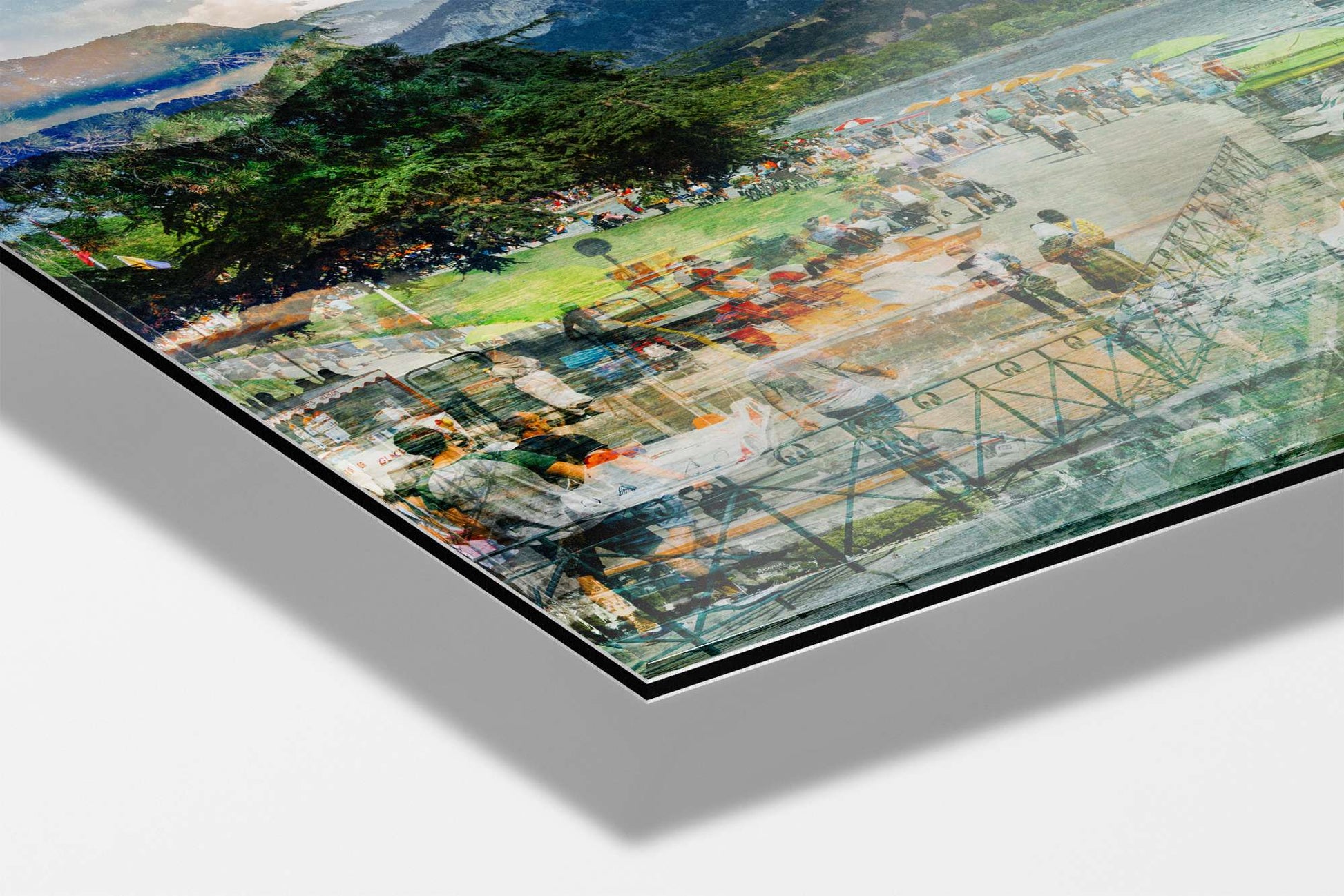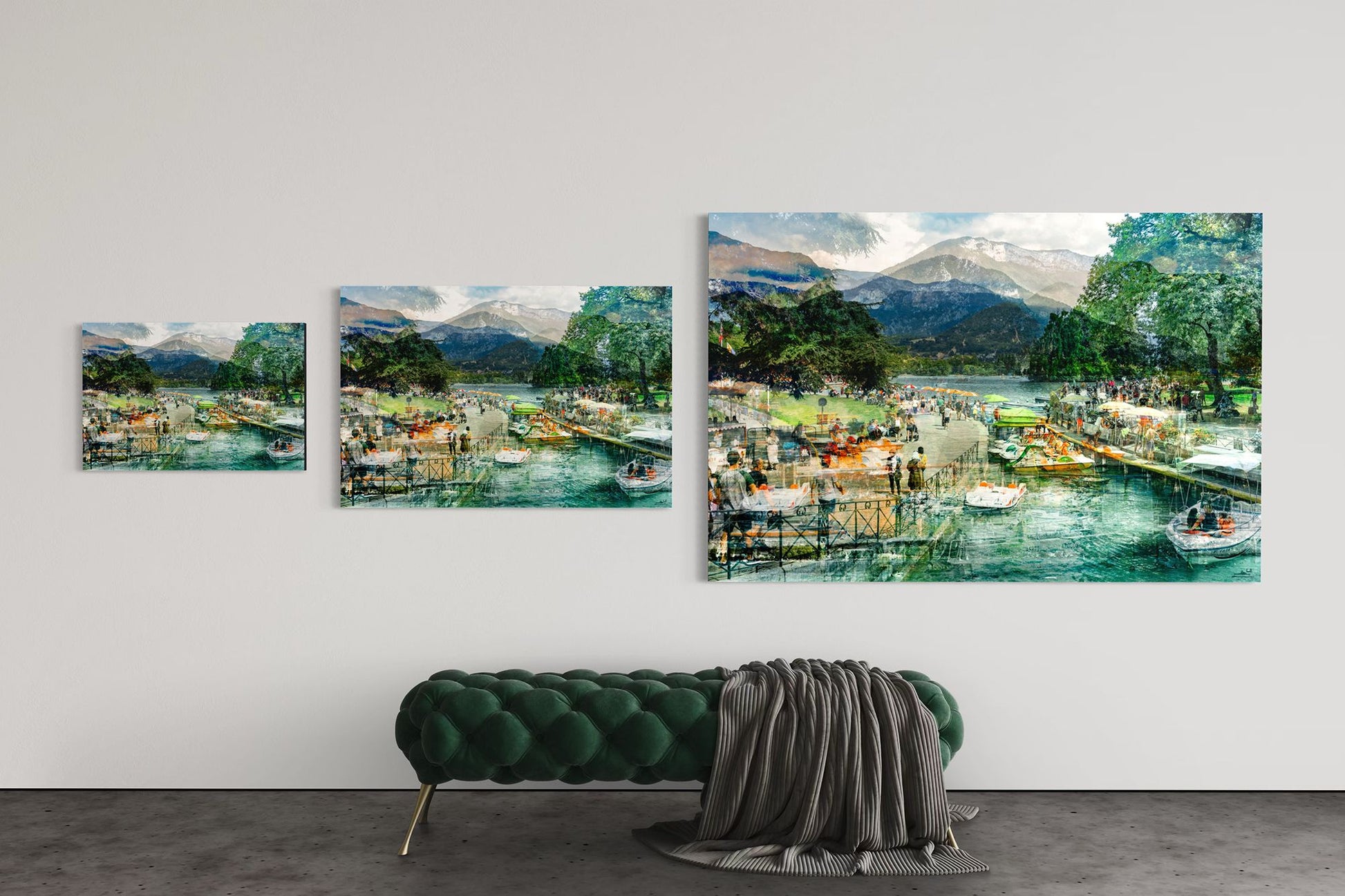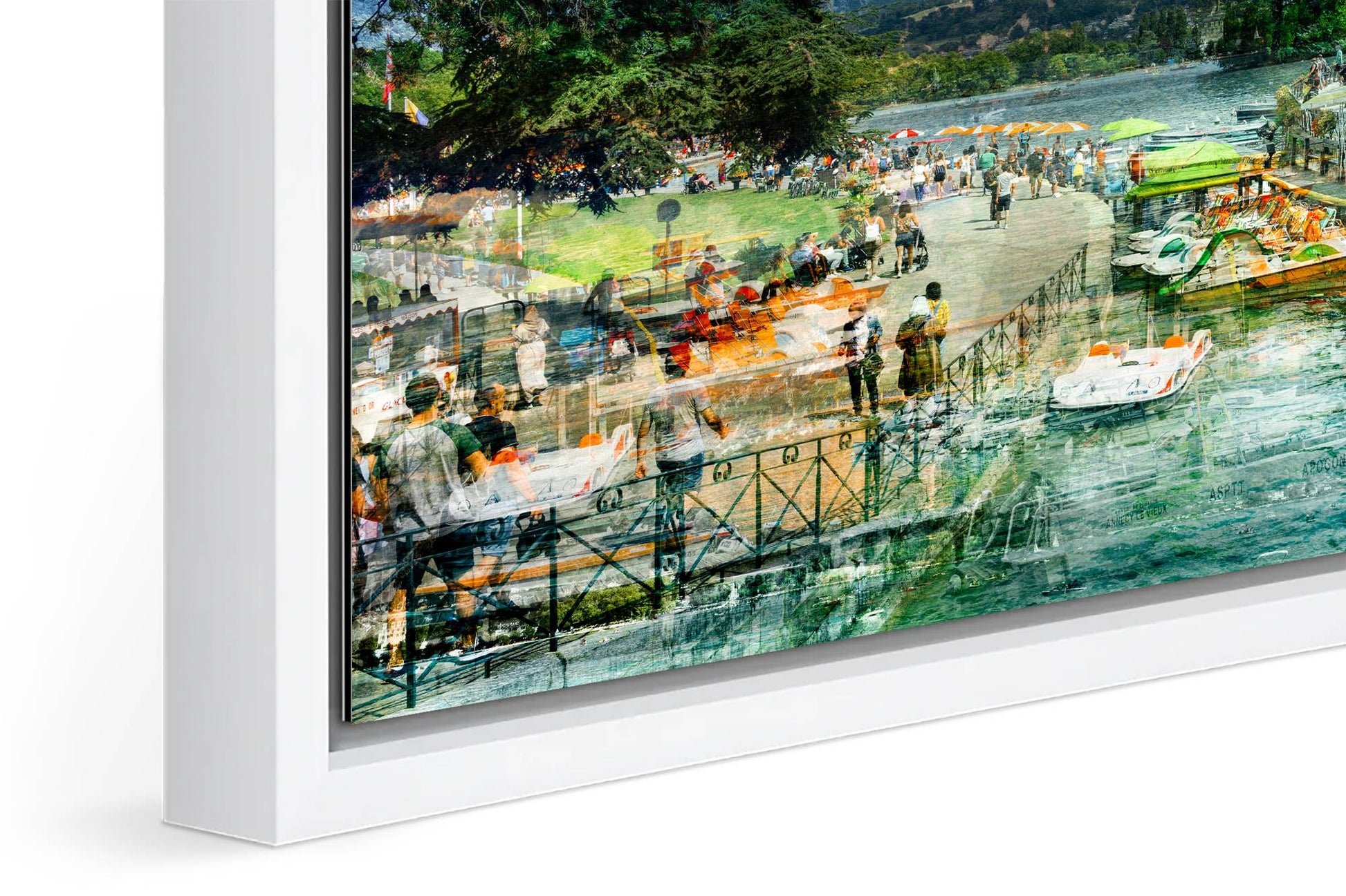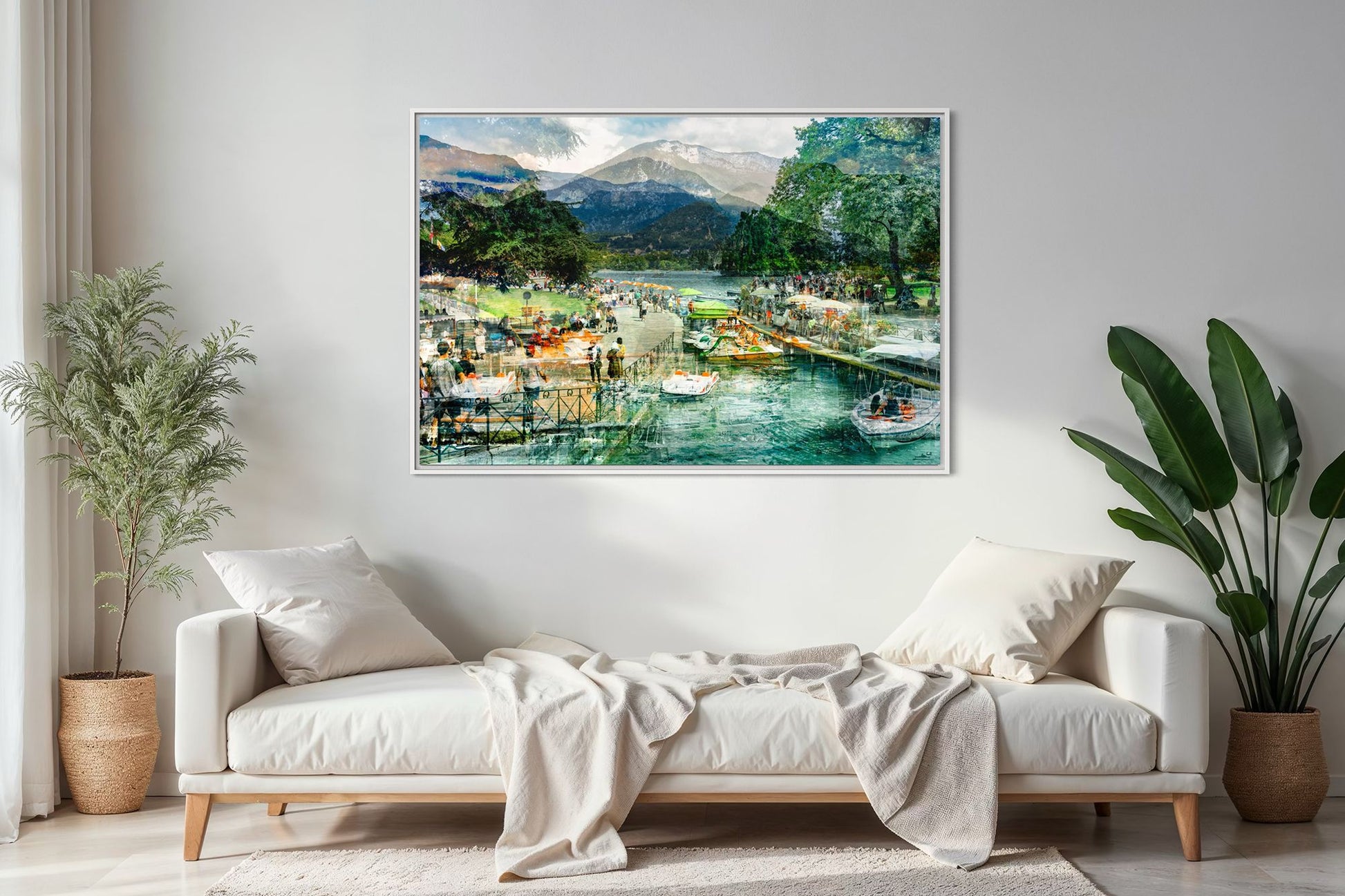 In Afternoon Walk at Lake Annecy, Charlotte Fonne captures the essence of her hometown through her signature layered photographic technique, blending reality and memory. The artwork evokes the serene green and turquoise waters of Lake Annecy framed by the French Alps, where boaters drift, walkers stroll, and the soft rhythm of summer afternoons unfolds. Inspired by Impressionist painters, this fine art photography print merges multiple photographs into a dreamlike scene, blurring the boundary between observation and remembrance.