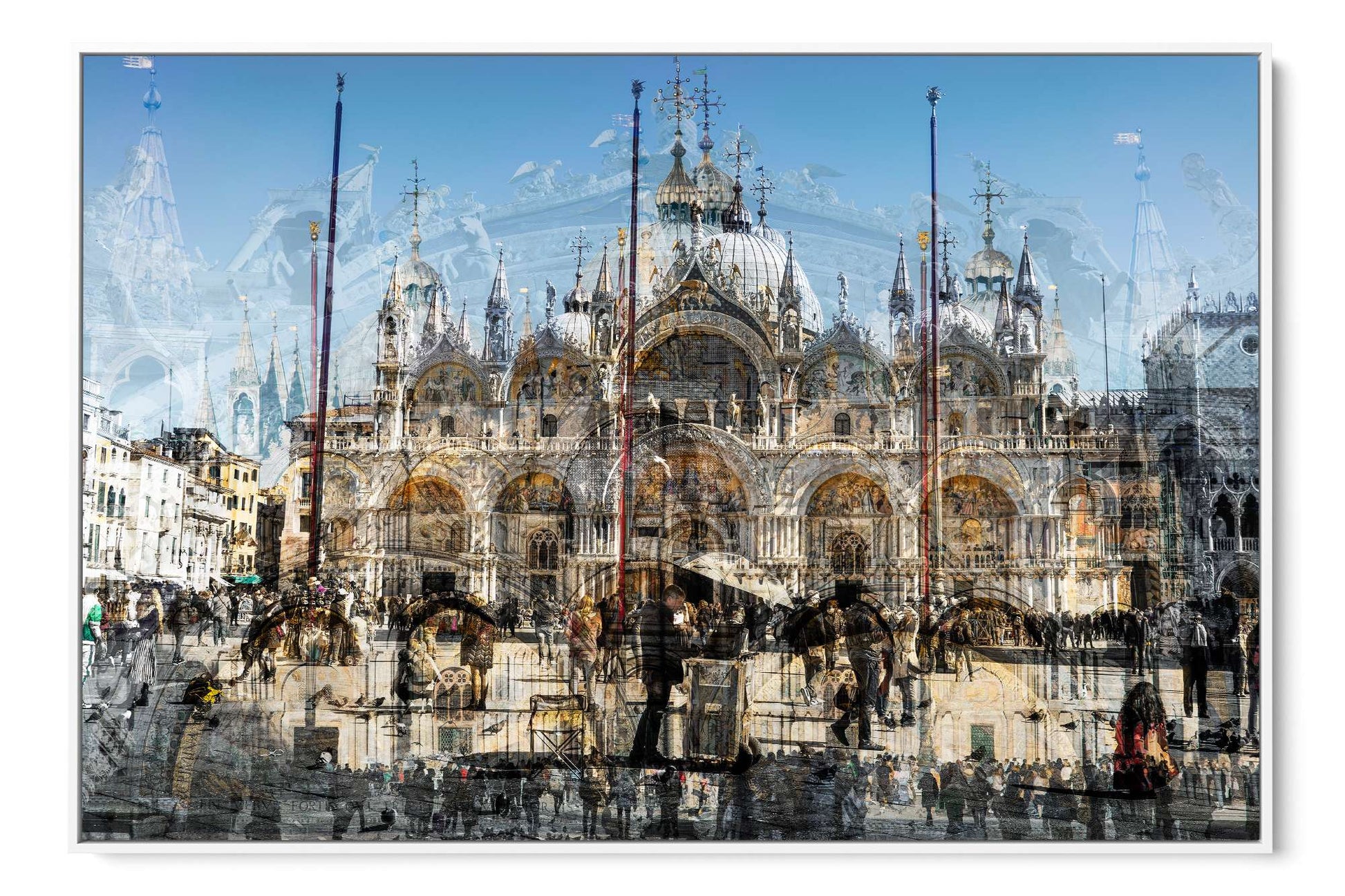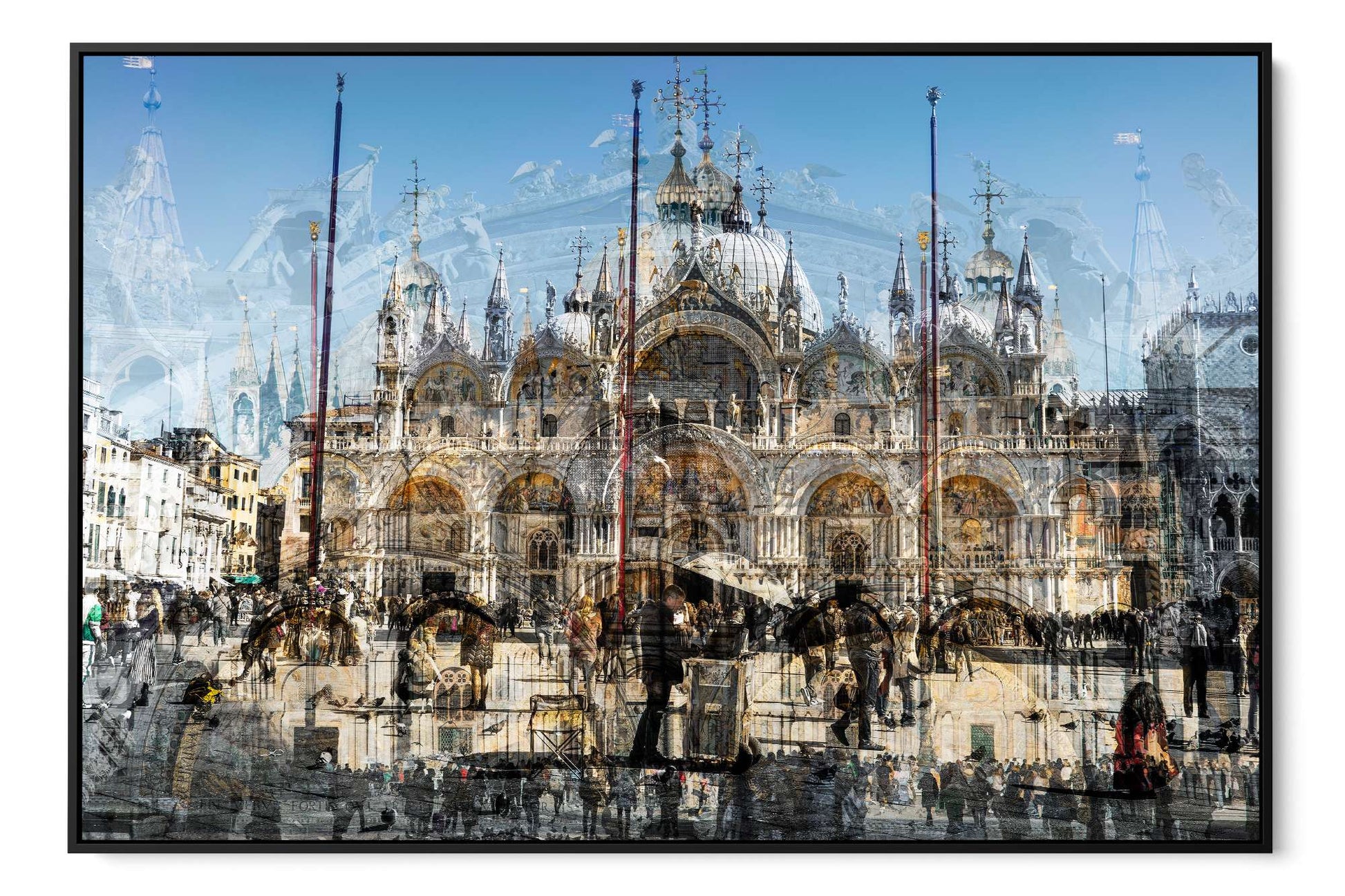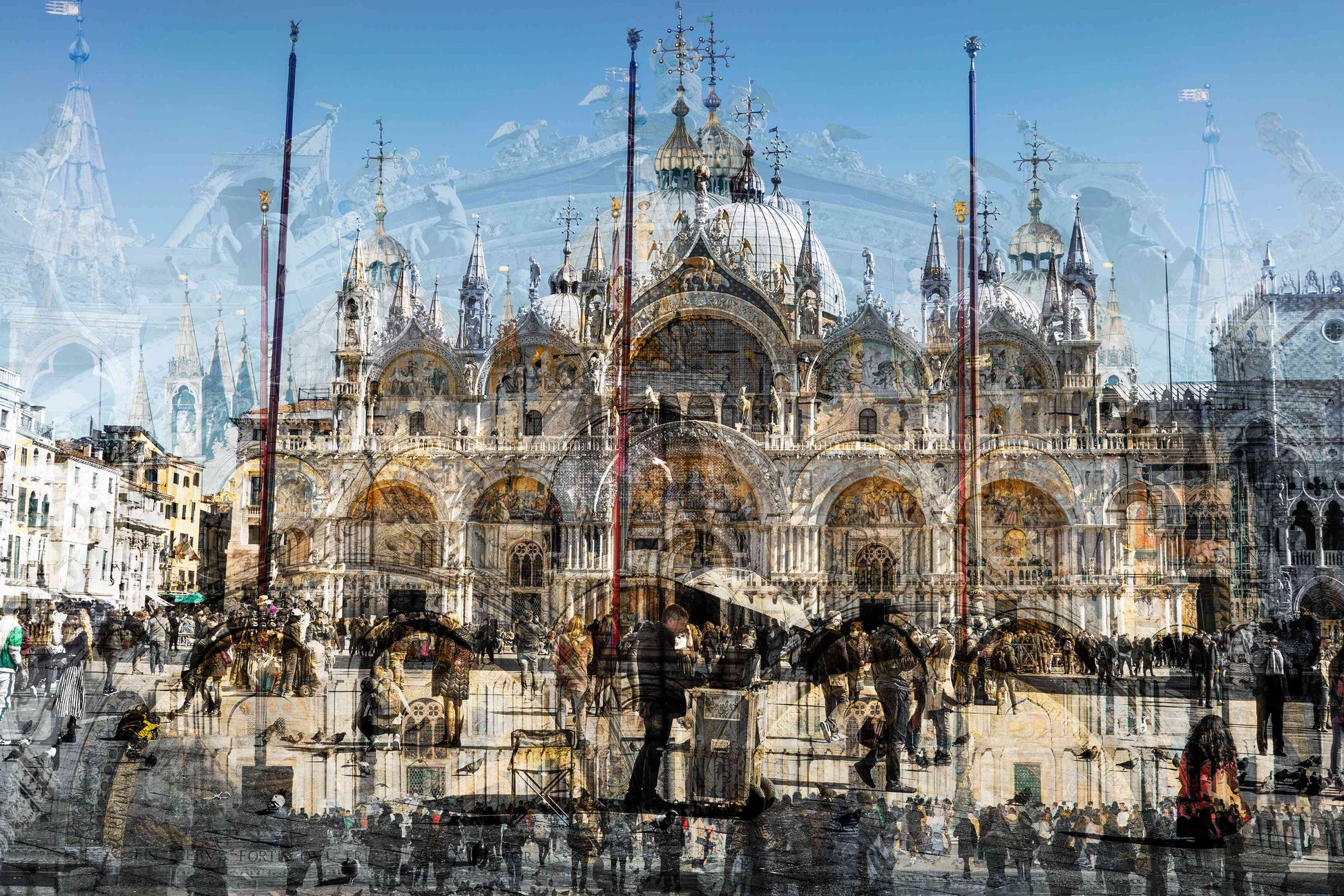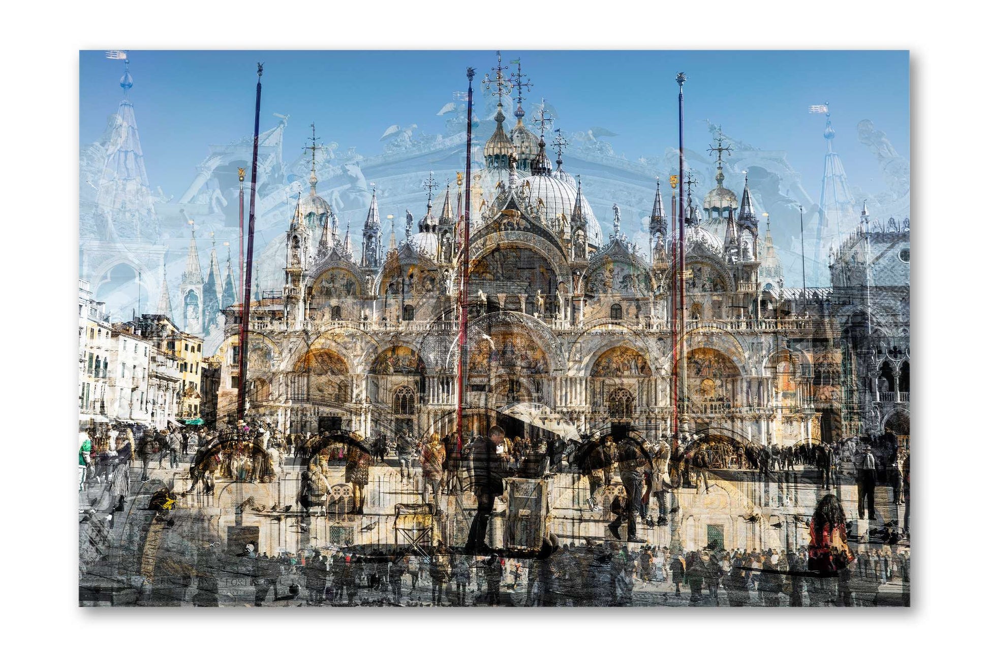 In Basilica di San Marco, Charlotte Fonne captures the grandeur and beauty of Saint Mark’s Basilica in Venice through her layered photographic technique. This Cubist-inspired artwork blends multiple angles and perspectives into a dynamic visual experience. The piece reveals the iconic façade of this Italian Byzantine masterpiece of art, sculpture, and painting. Details of the monument are brought into perspective, including its arches, statues, bas-reliefs, the five ornate portals framed by marble columns, the five golden-domed rooftops, and the Horses of Saint Mark. Charlotte’s composition also reflects the contrast between the timeless architecture and crowds of captivated visitors who come year-round to admire this wonder. This fine art photography print depicts the ambiance of one of Venice’s iconic landmarks with unique rhythm and historical richness.