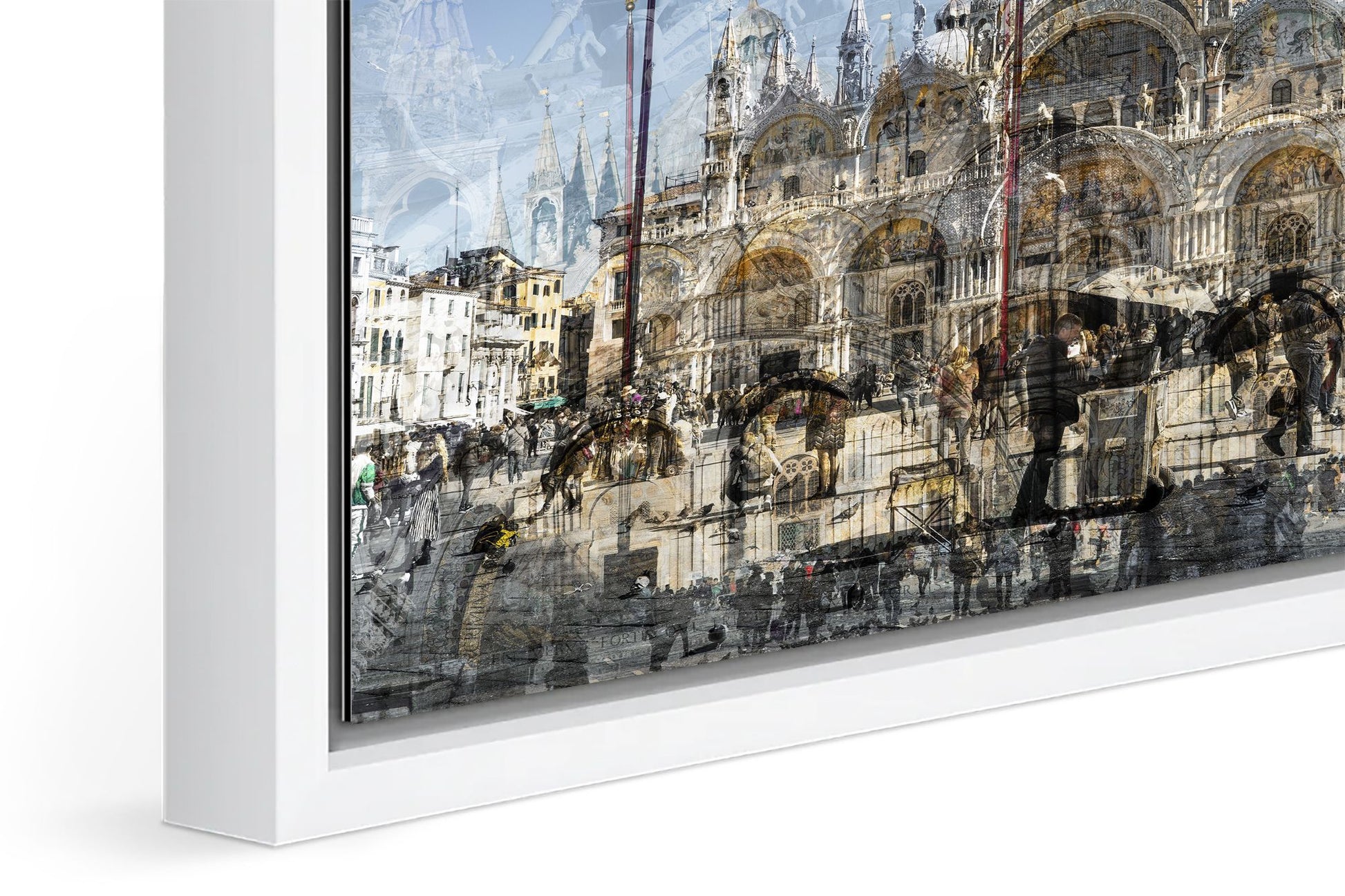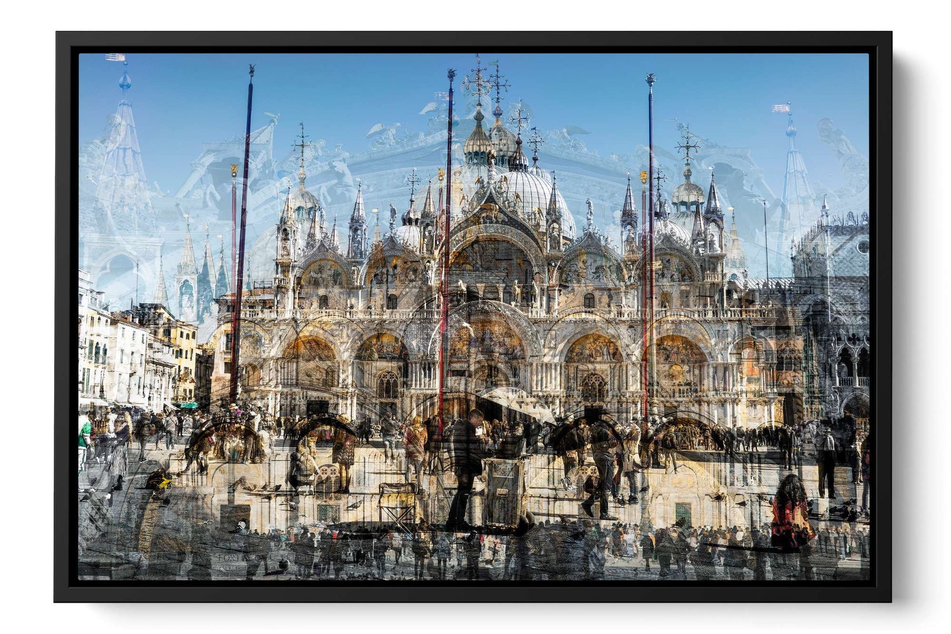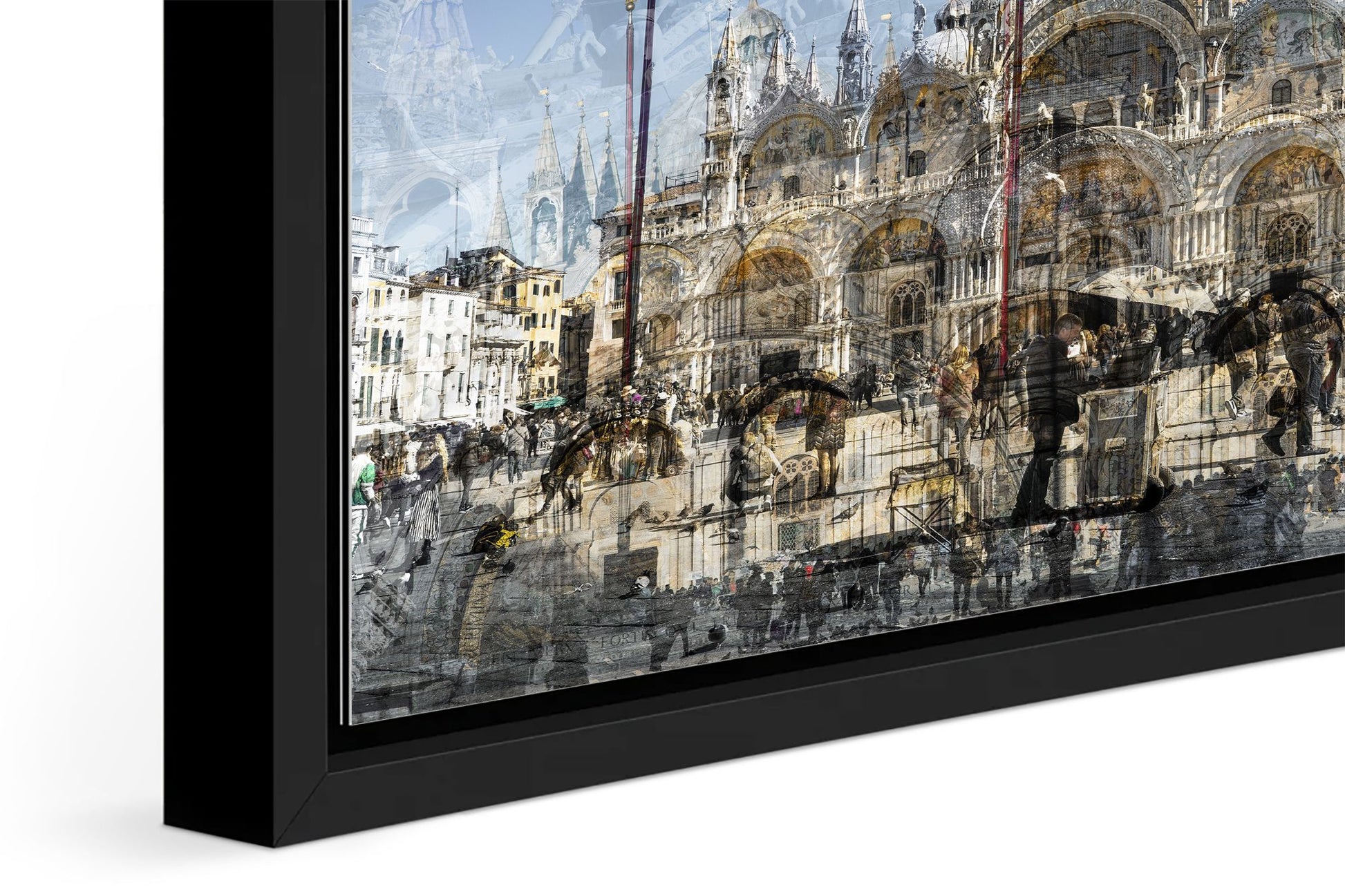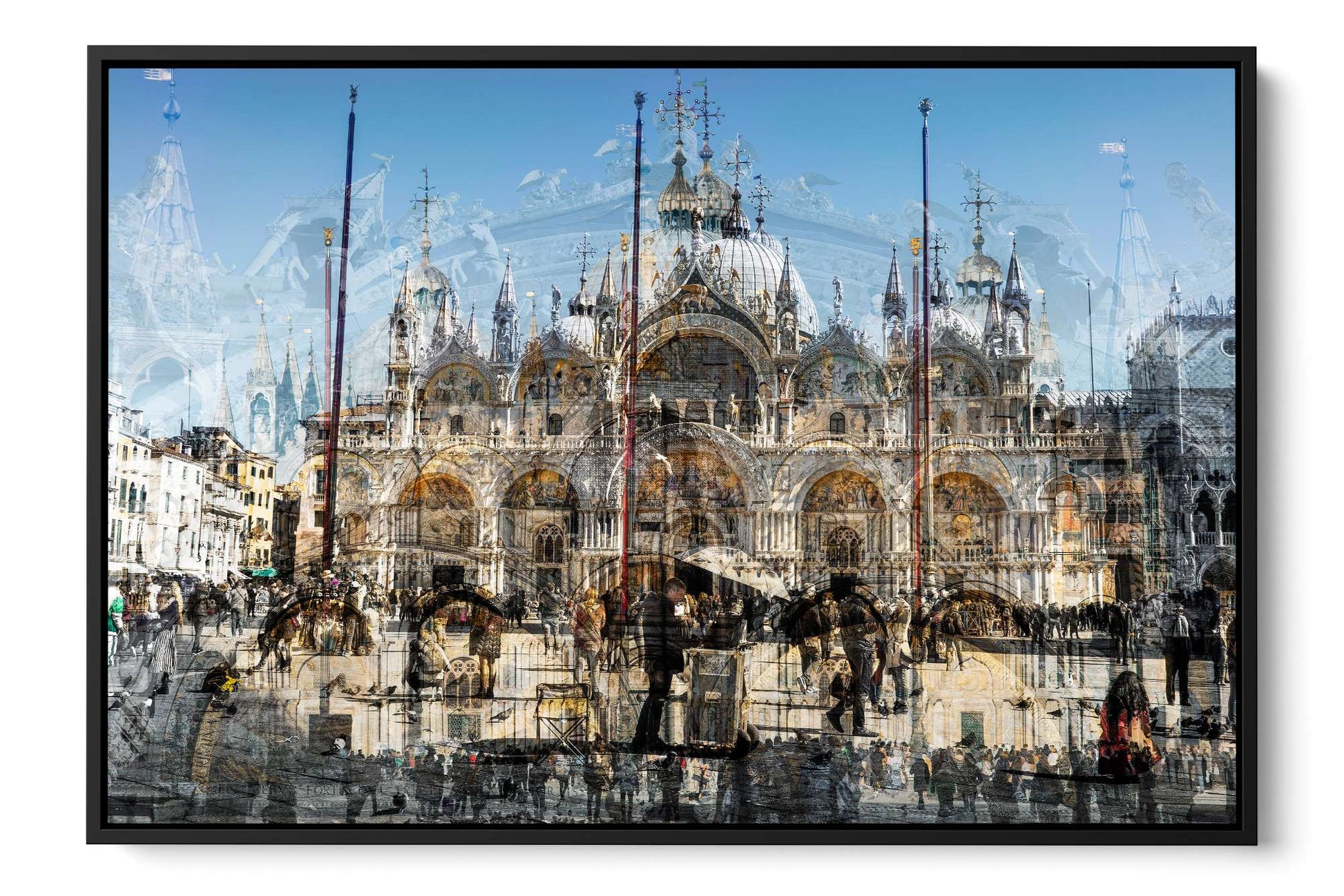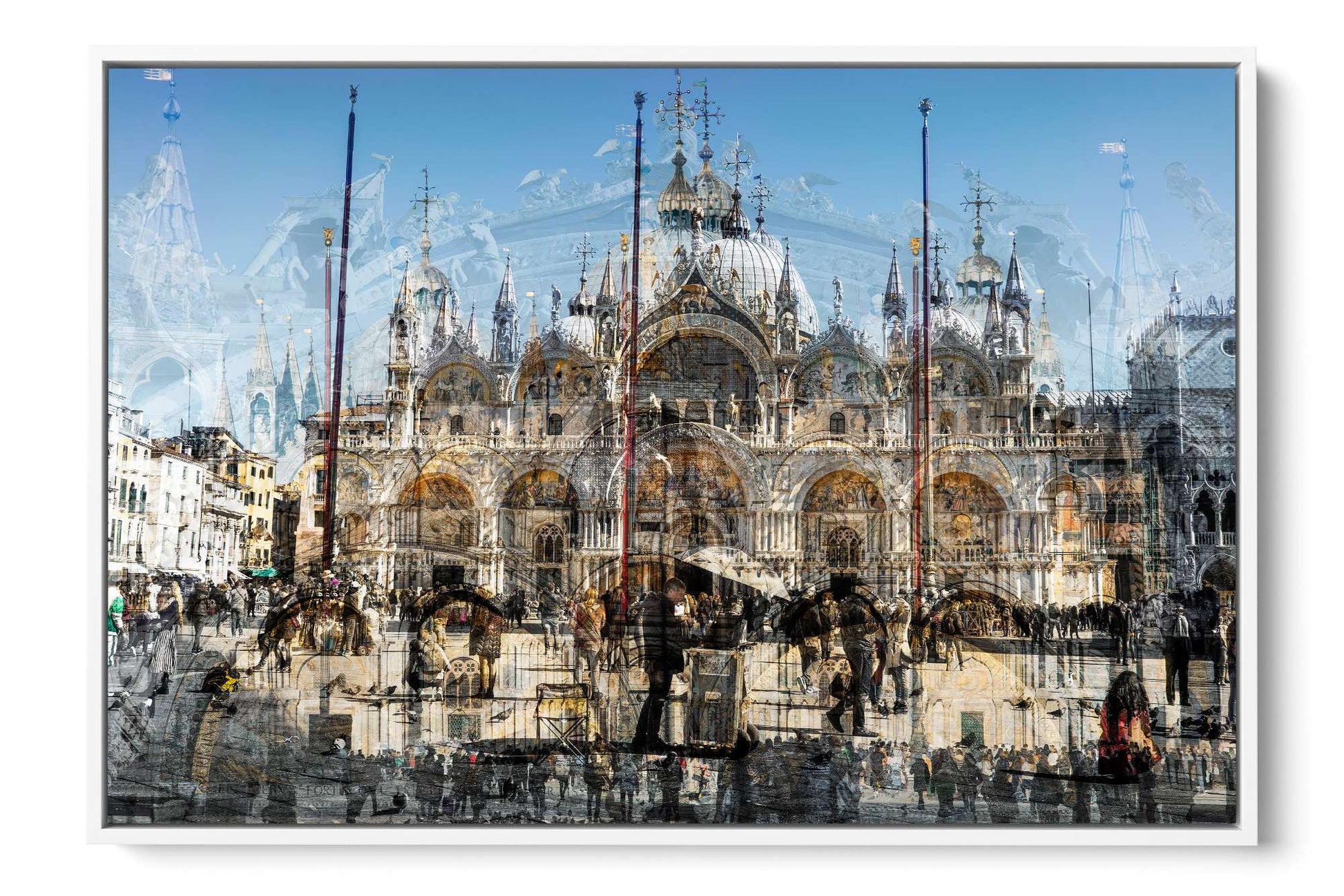 In Basilica di San Marco, Charlotte Fonne captures the grandeur and beauty of Saint Mark’s Basilica in Venice through her layered photographic technique. This Cubist-inspired artwork blends multiple angles and perspectives into a dynamic visual experience. The piece reveals the iconic façade of this Italian Byzantine masterpiece of art, sculpture, and painting. Details of the monument are brought into perspective, including its arches, statues, bas-reliefs, the five ornate portals framed by marble columns, the five golden-domed rooftops, and the Horses of Saint Mark. Charlotte’s composition also reflects the contrast between the timeless architecture and crowds of captivated visitors who come year-round to admire this wonder. This fine art photography print depicts the ambiance of one of Venice’s iconic landmarks with unique rhythm and historical richness.