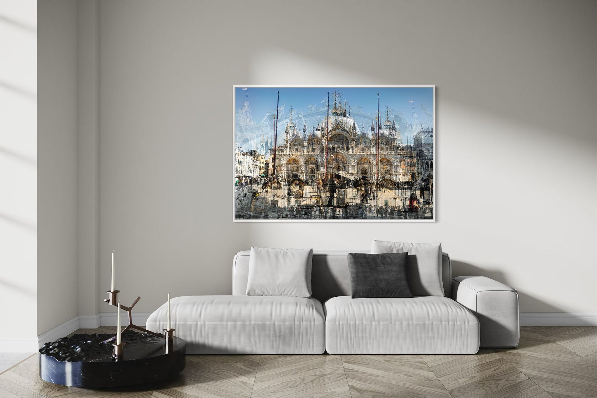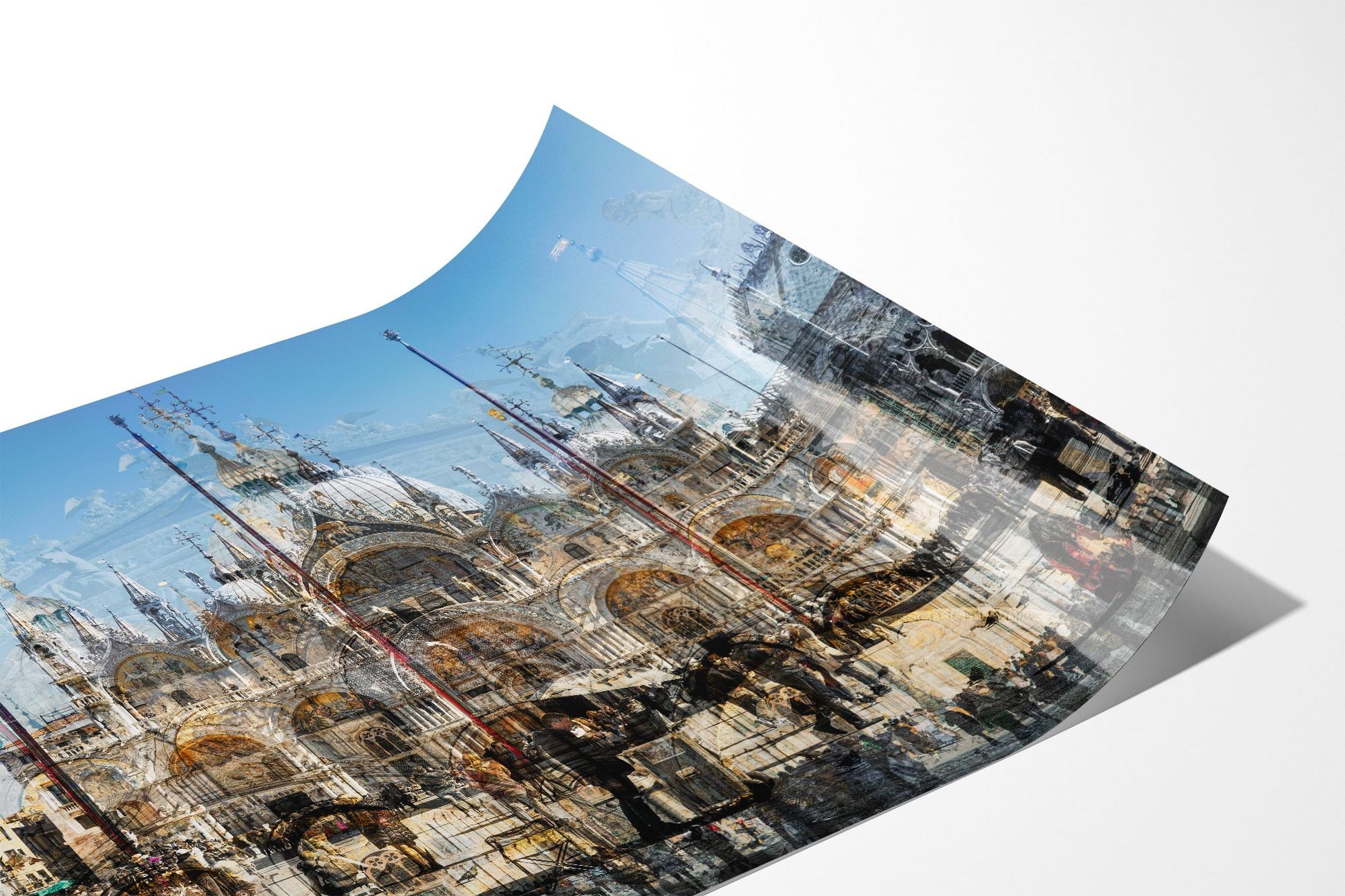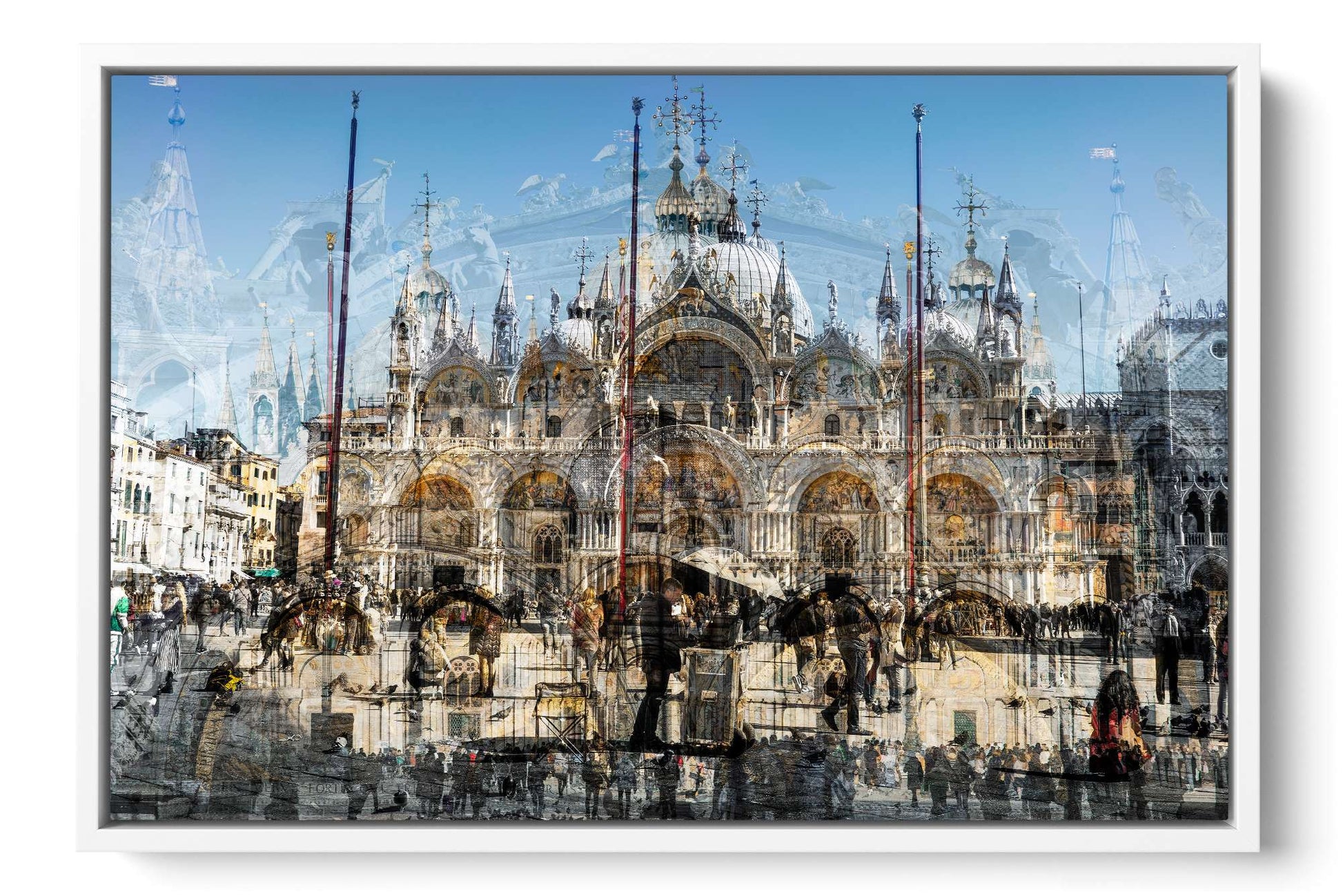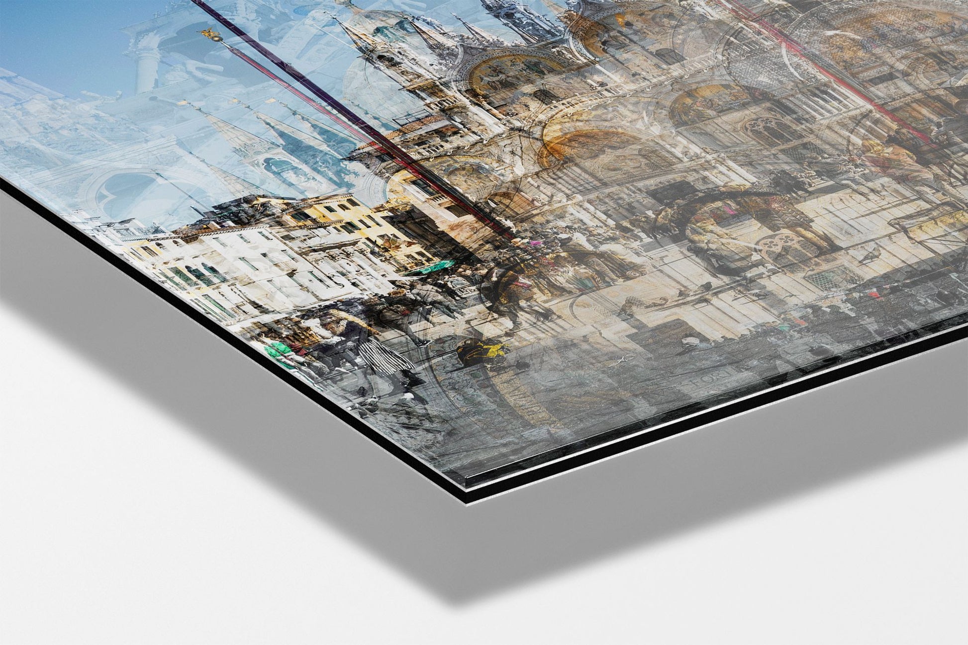 In Basilica di San Marco, Charlotte Fonne captures the grandeur and beauty of Saint Mark’s Basilica in Venice through her layered photographic technique. This Cubist-inspired artwork blends multiple angles and perspectives into a dynamic visual experience. The piece reveals the iconic façade of this Italian Byzantine masterpiece of art, sculpture, and painting. Details of the monument are brought into perspective, including its arches, statues, bas-reliefs, the five ornate portals framed by marble columns, the five golden-domed rooftops, and the Horses of Saint Mark. Charlotte’s composition also reflects the contrast between the timeless architecture and crowds of captivated visitors who come year-round to admire this wonder. This fine art photography print depicts the ambiance of one of Venice’s iconic landmarks with unique rhythm and historical richness.