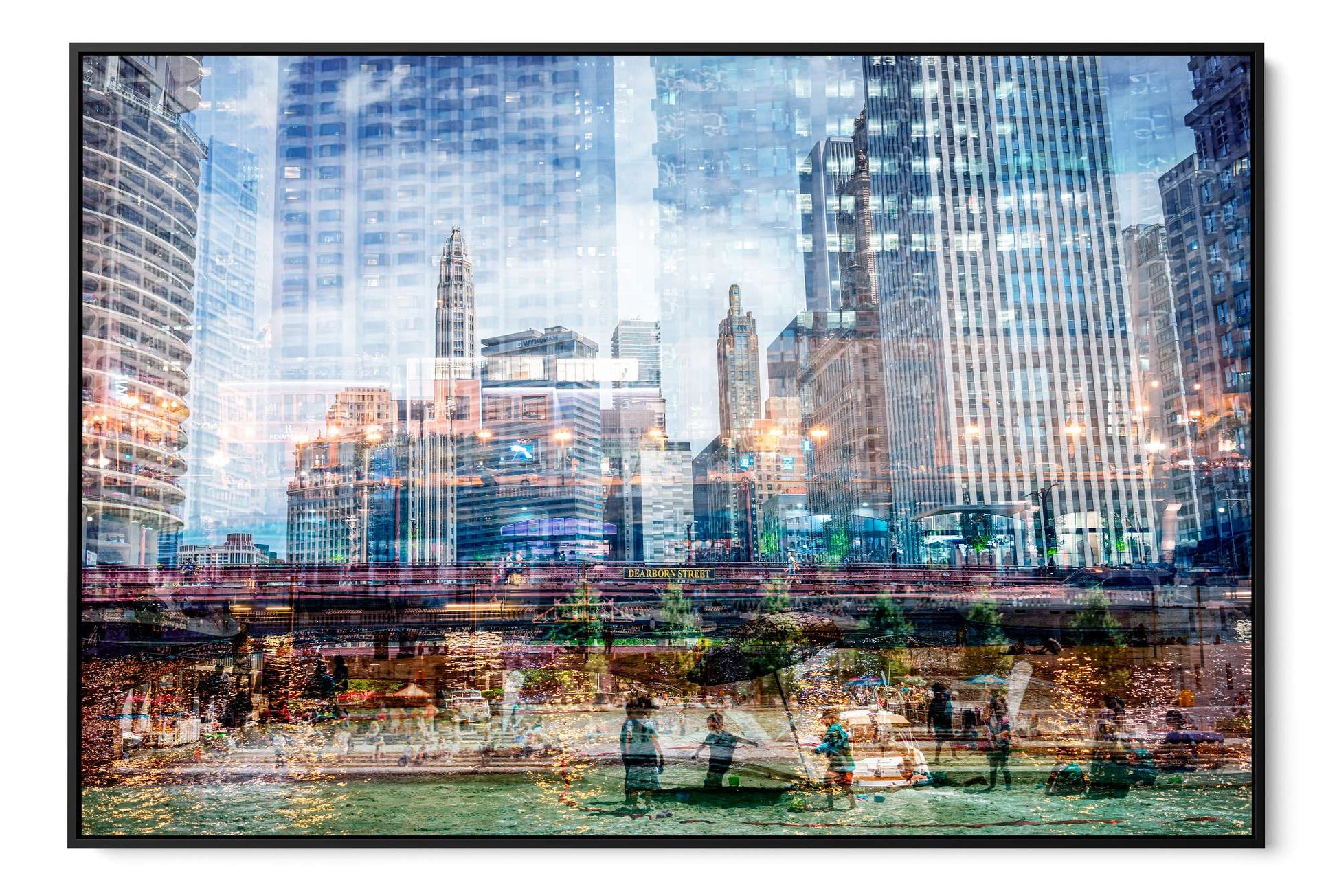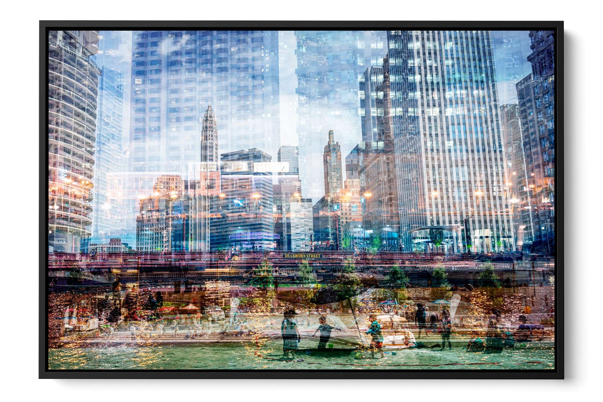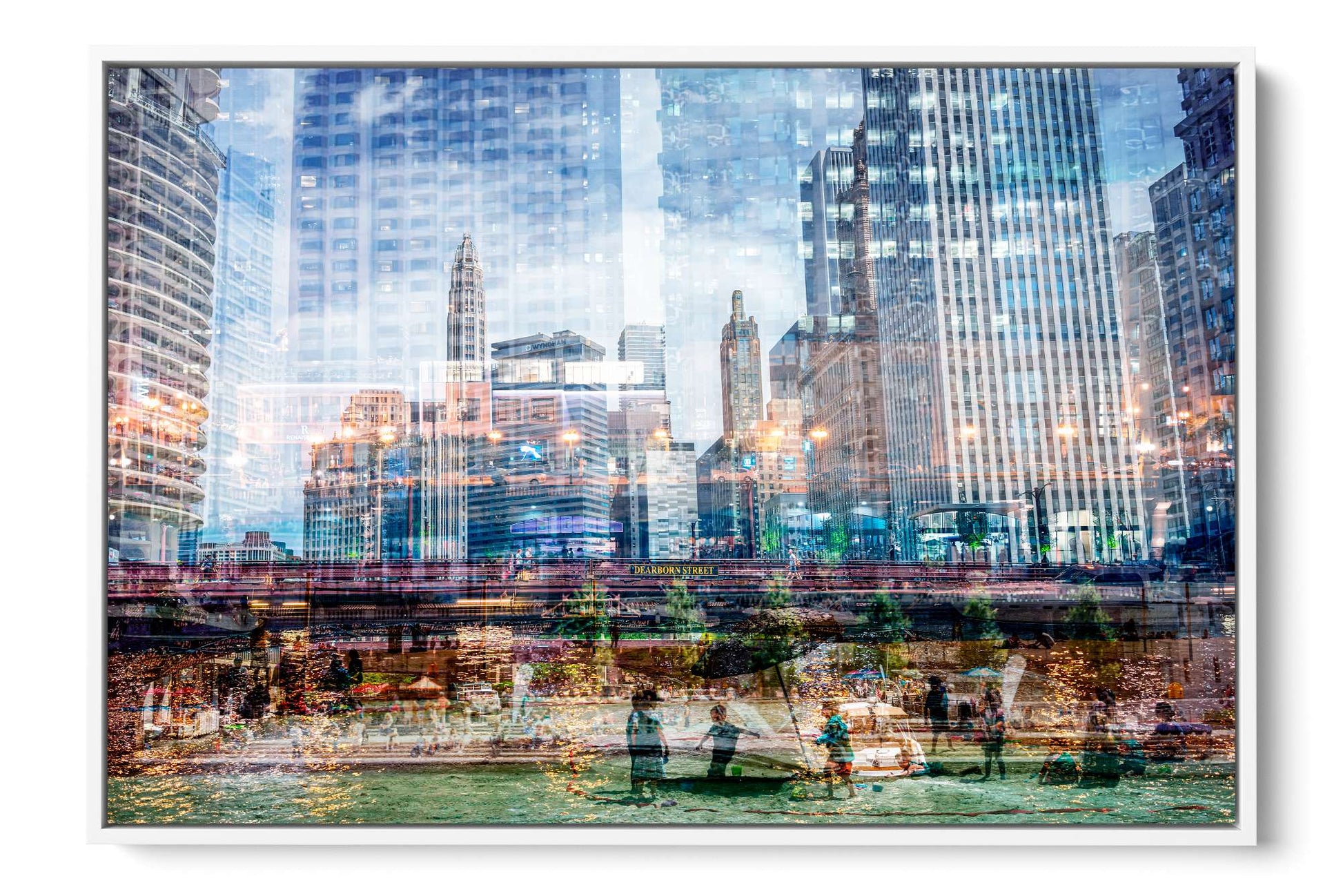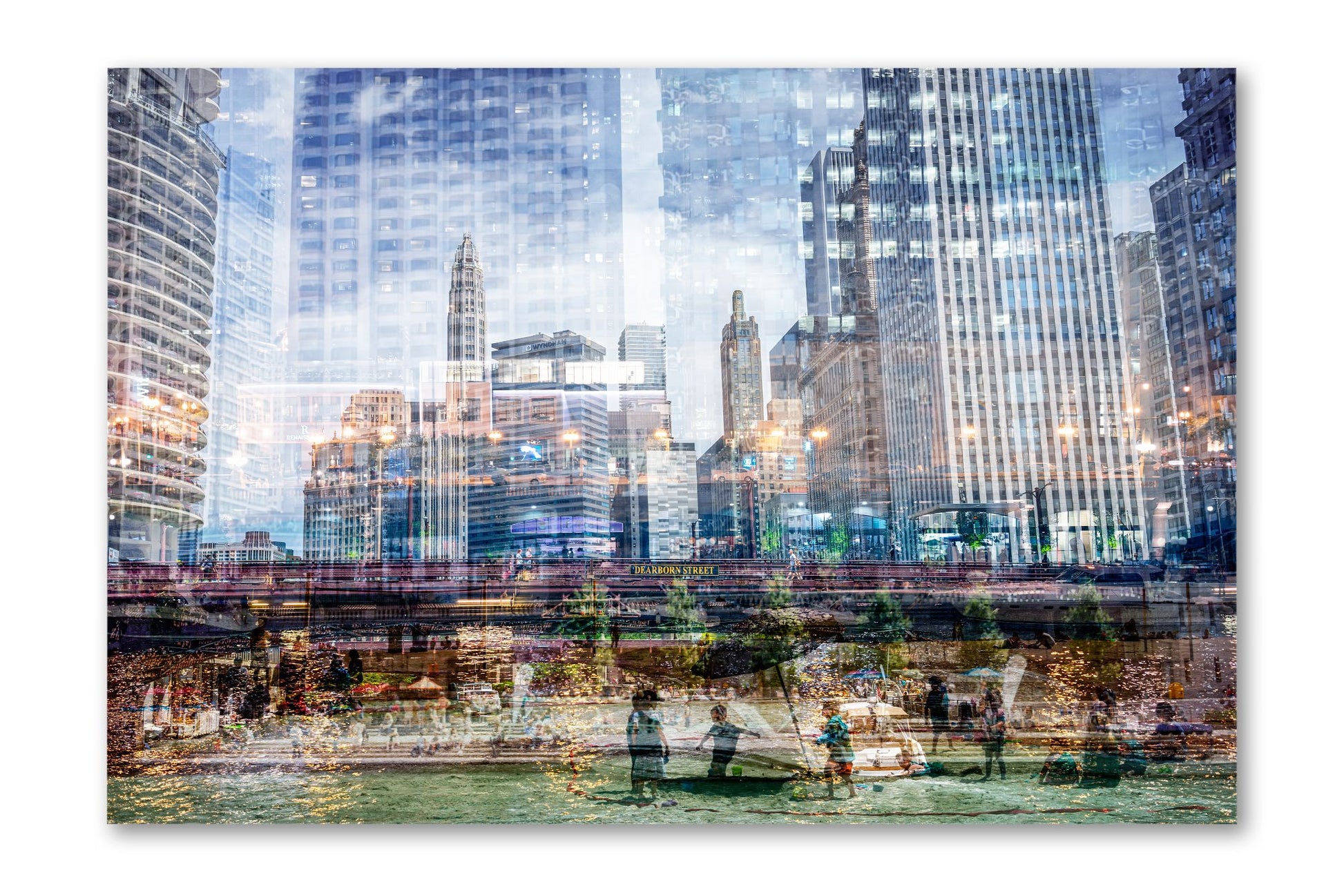 In Chicago Blue, Charlotte Fonne captures the energy and architectural diversity of Chicago through her layered photographic technique, blending reality and memory. The artwork highlights the Dearborn Street Bridge spanning the Chicago River, connecting the Near North Side with The Loop, while the Riverwalk below comes alive with locals and visitors enjoying the city’s rhythm. Architectural landmarks including the round Marina City towers, the golden-topped Carbide and Carbon Building, the sleek Mather Tower, the graceful Regalia Tower, the historic Jewelers’ Building, and the elegant London House are blended into the composition. The shores of Oak Street Beach along Lake Michigan add a serene counterpoint to the urban scene. This fine art photography print reinterprets Chicago as an emotional panorama, capturing scale, light, and the life of the city.