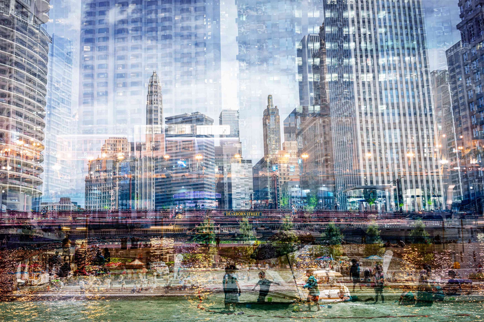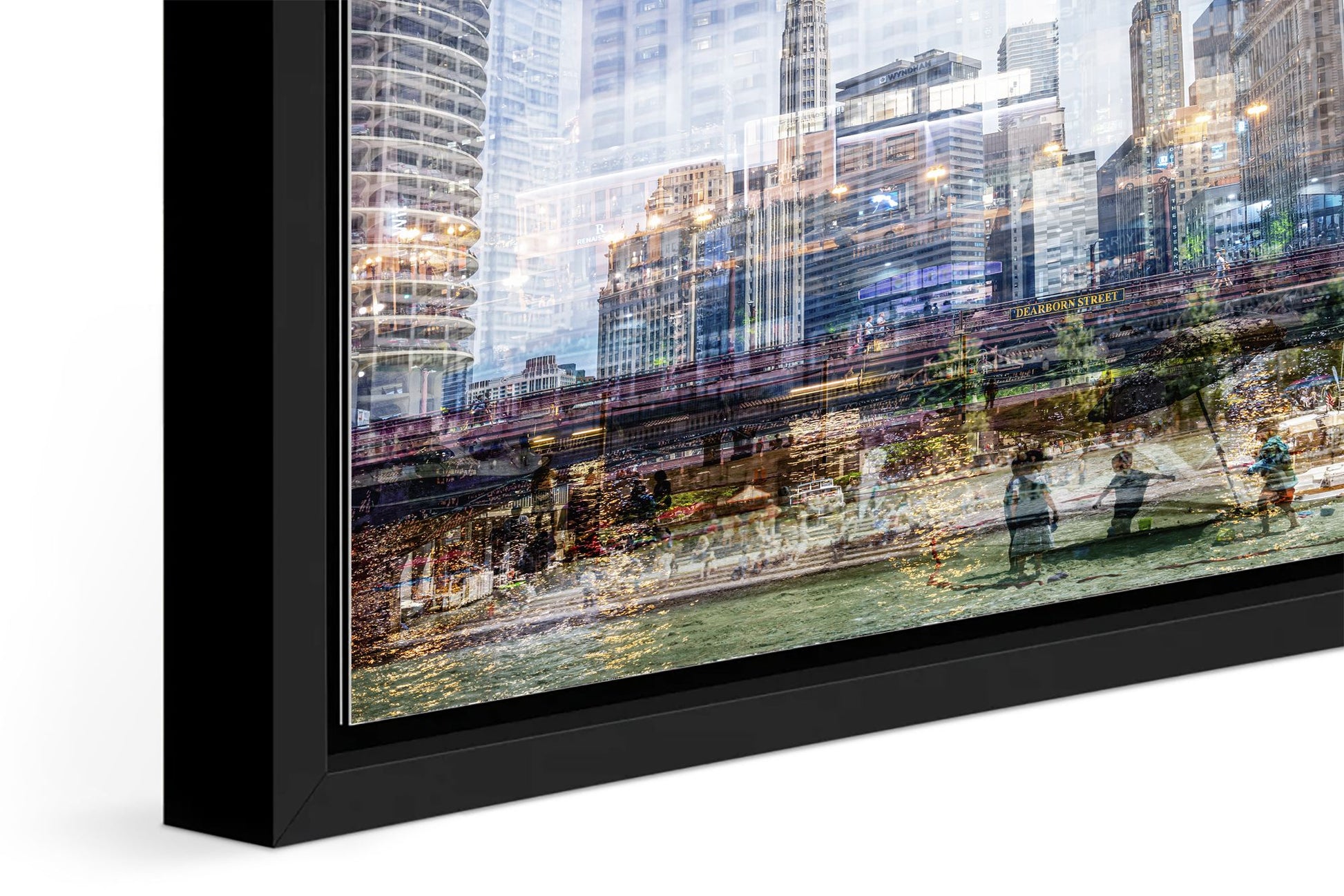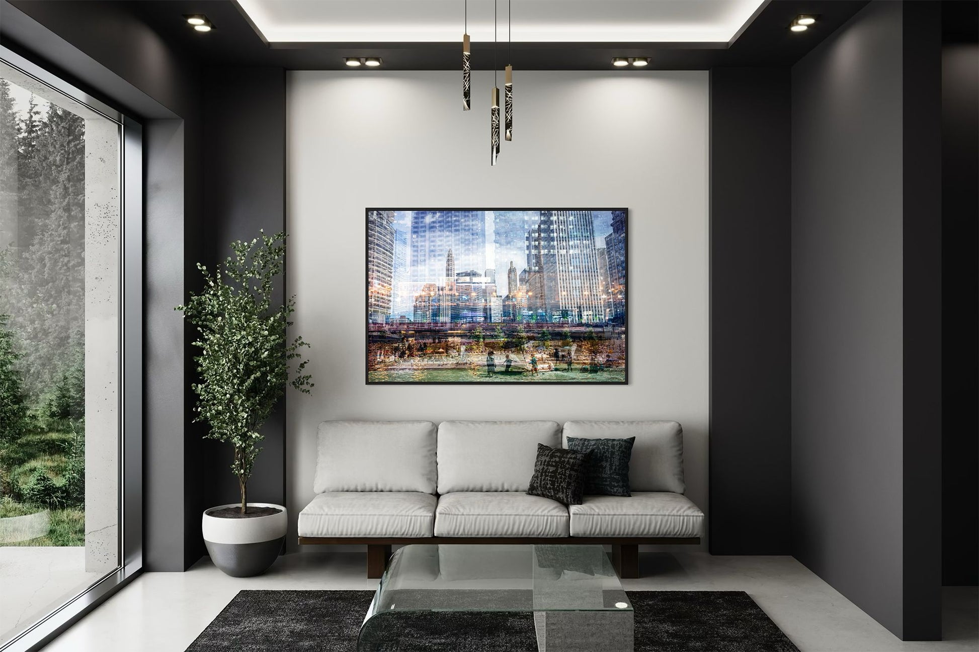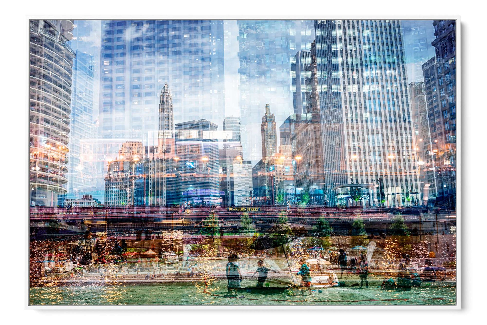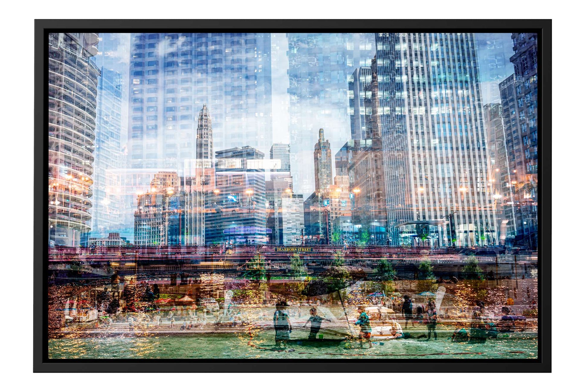 In Chicago Blue, Charlotte Fonne captures the energy and architectural diversity of Chicago through her layered photographic technique, blending reality and memory. The artwork highlights the Dearborn Street Bridge spanning the Chicago River, connecting the Near North Side with The Loop, while the Riverwalk below comes alive with locals and visitors enjoying the city’s rhythm. Architectural landmarks including the round Marina City towers, the golden-topped Carbide and Carbon Building, the sleek Mather Tower, the graceful Regalia Tower, the historic Jewelers’ Building, and the elegant London House are blended into the composition. The shores of Oak Street Beach along Lake Michigan add a serene counterpoint to the urban scene. This fine art photography print reinterprets Chicago as an emotional panorama, capturing scale, light, and the life of the city.
