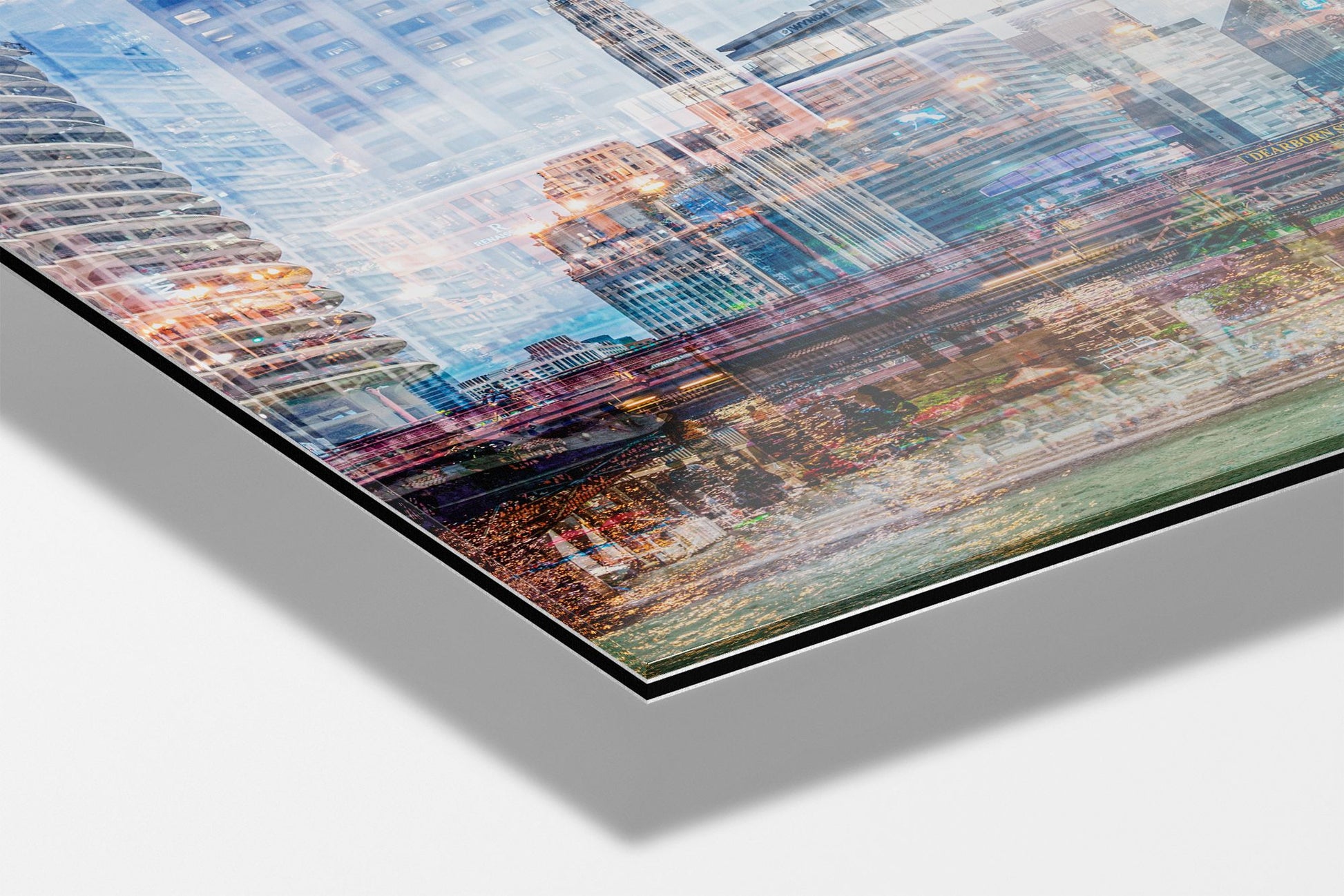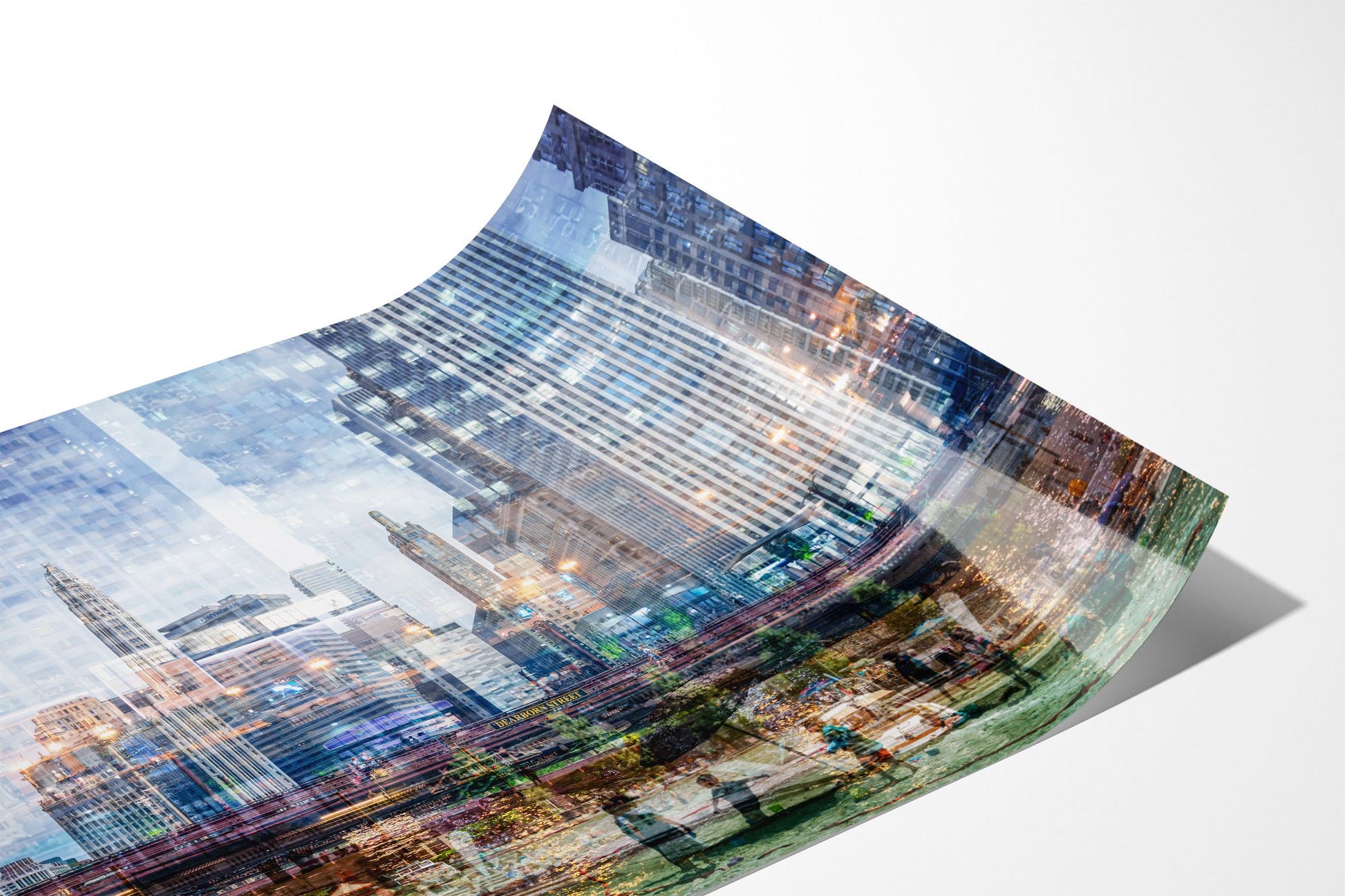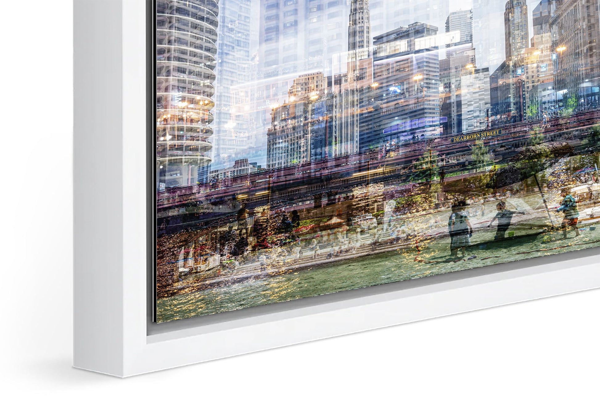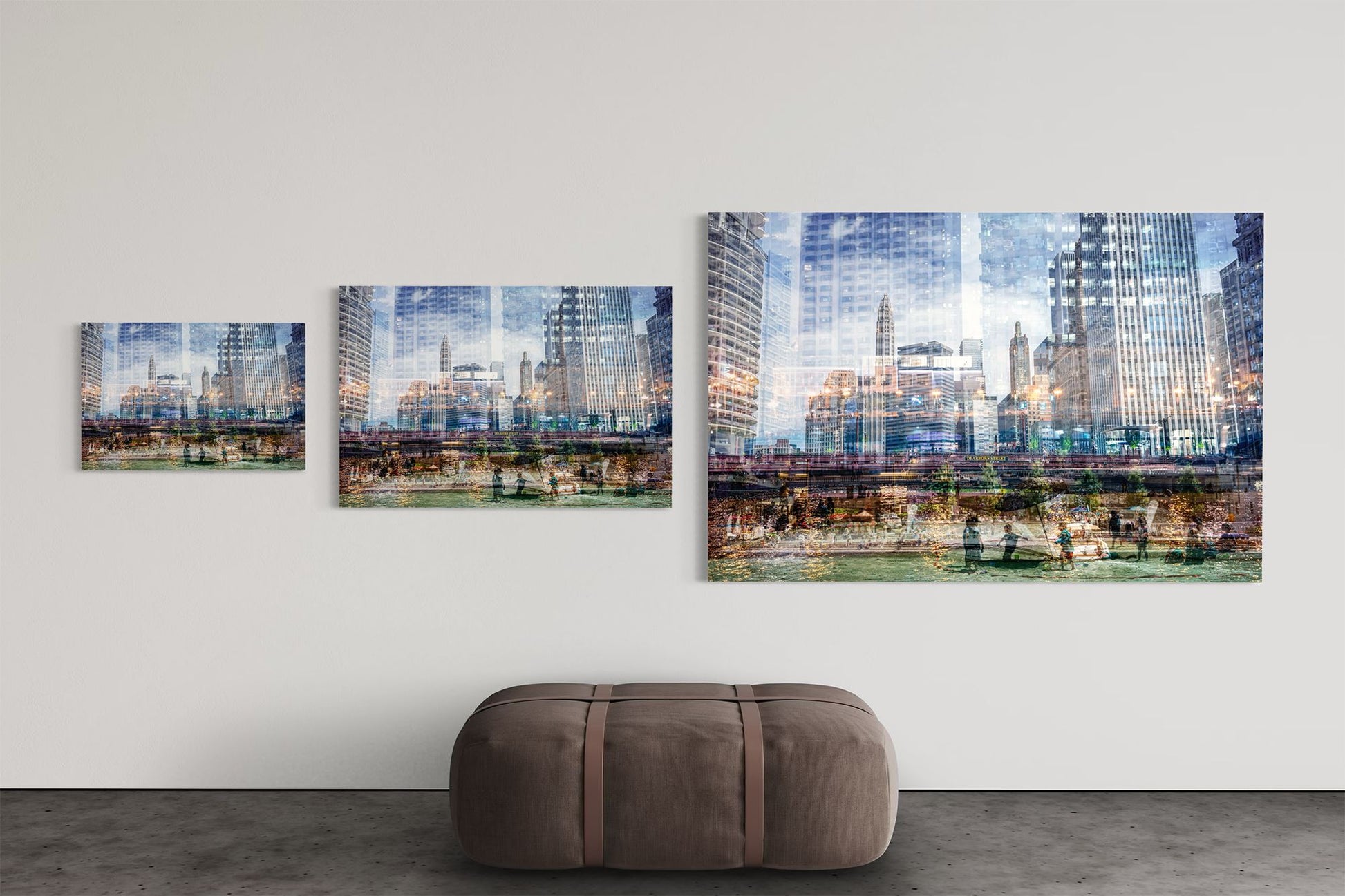In Chicago Blue, Charlotte Fonne captures the energy and architectural diversity of Chicago through her layered photographic technique, blending reality and memory. The artwork highlights the Dearborn Street Bridge spanning the Chicago River, connecting the Near North Side with The Loop, while the Riverwalk below comes alive with locals and visitors enjoying the city’s rhythm. Architectural landmarks including the round Marina City towers, the golden-topped Carbide and Carbon Building, the sleek Mather Tower, the graceful Regalia Tower, the historic Jewelers’ Building, and the elegant London House are blended into the composition. The shores of Oak Street Beach along Lake Michigan add a serene counterpoint to the urban scene. This fine art photography print reinterprets Chicago as an emotional panorama, capturing scale, light, and the life of the city.