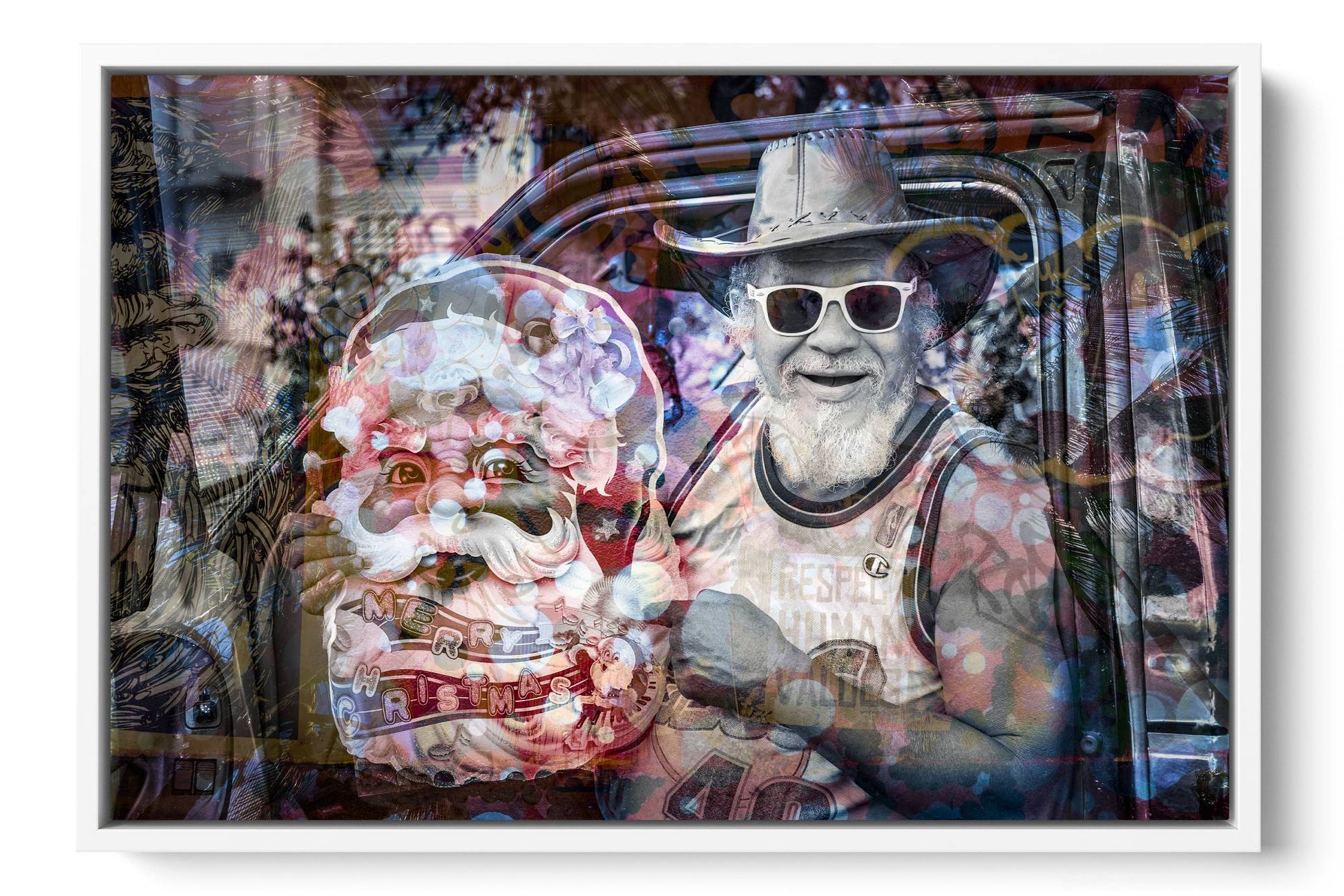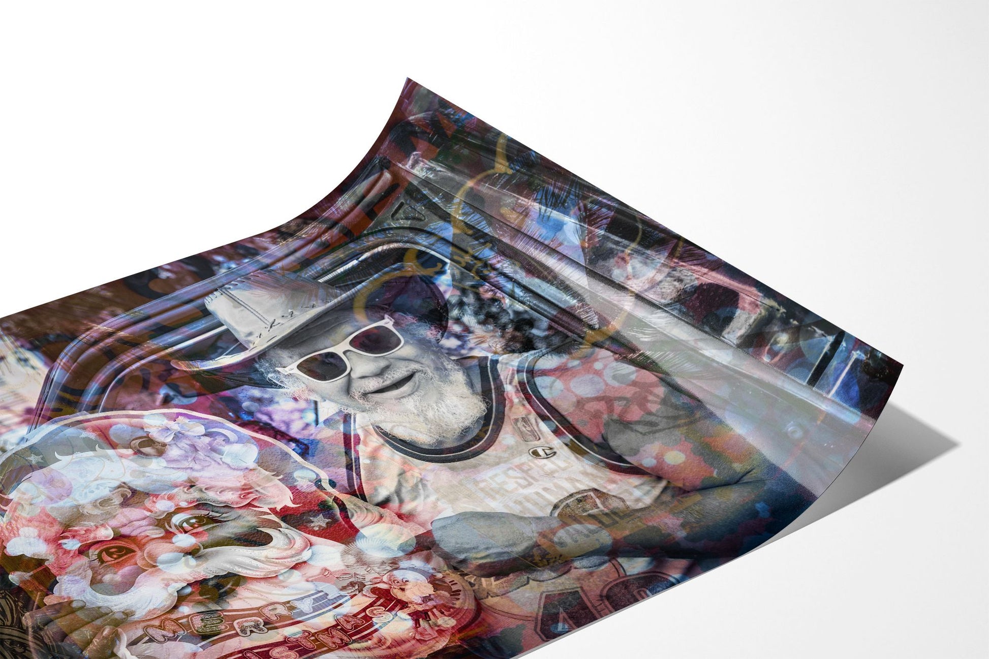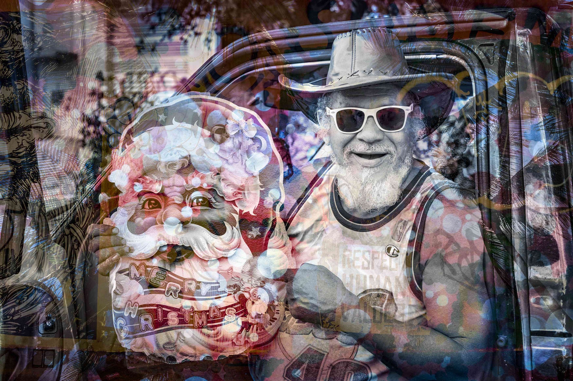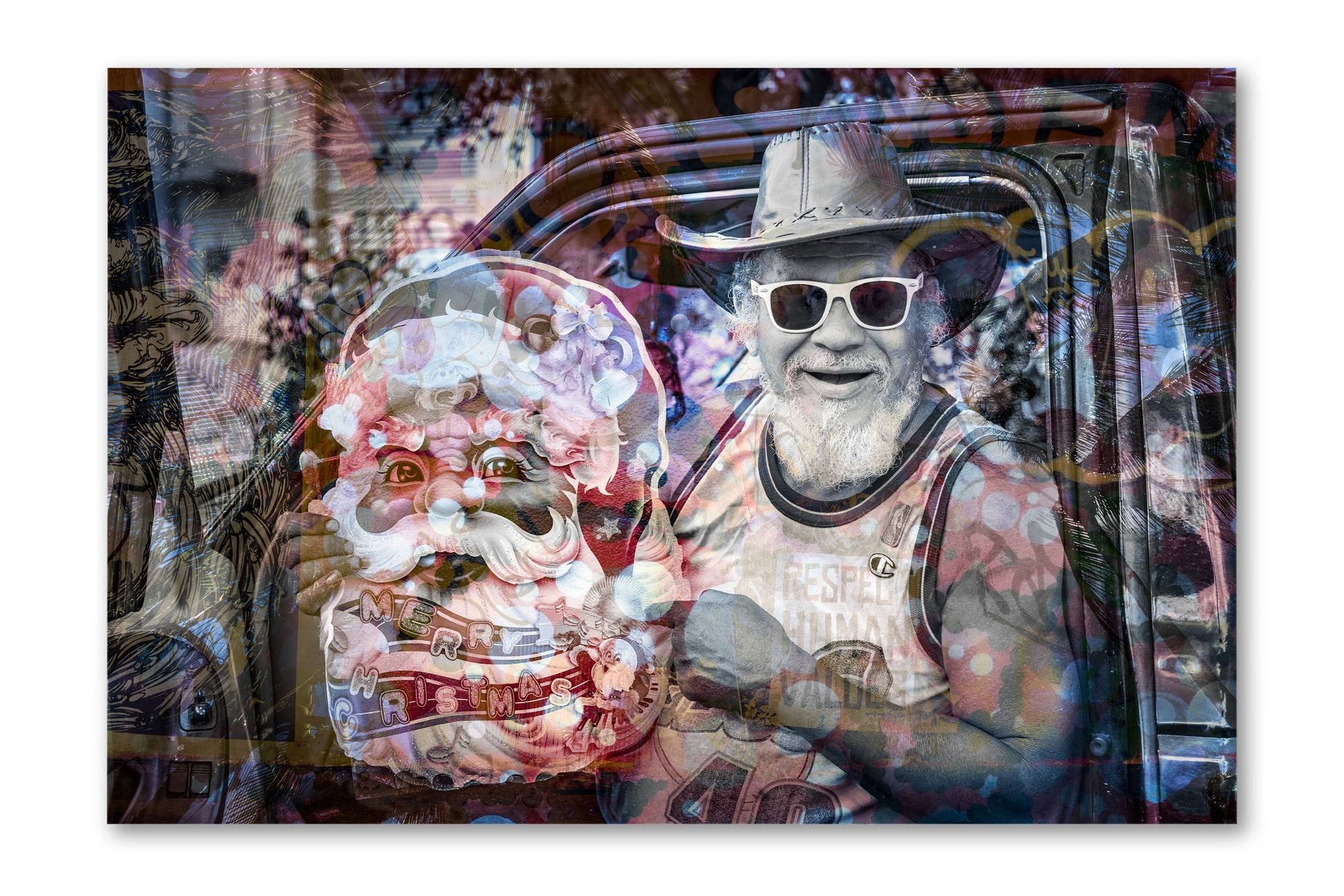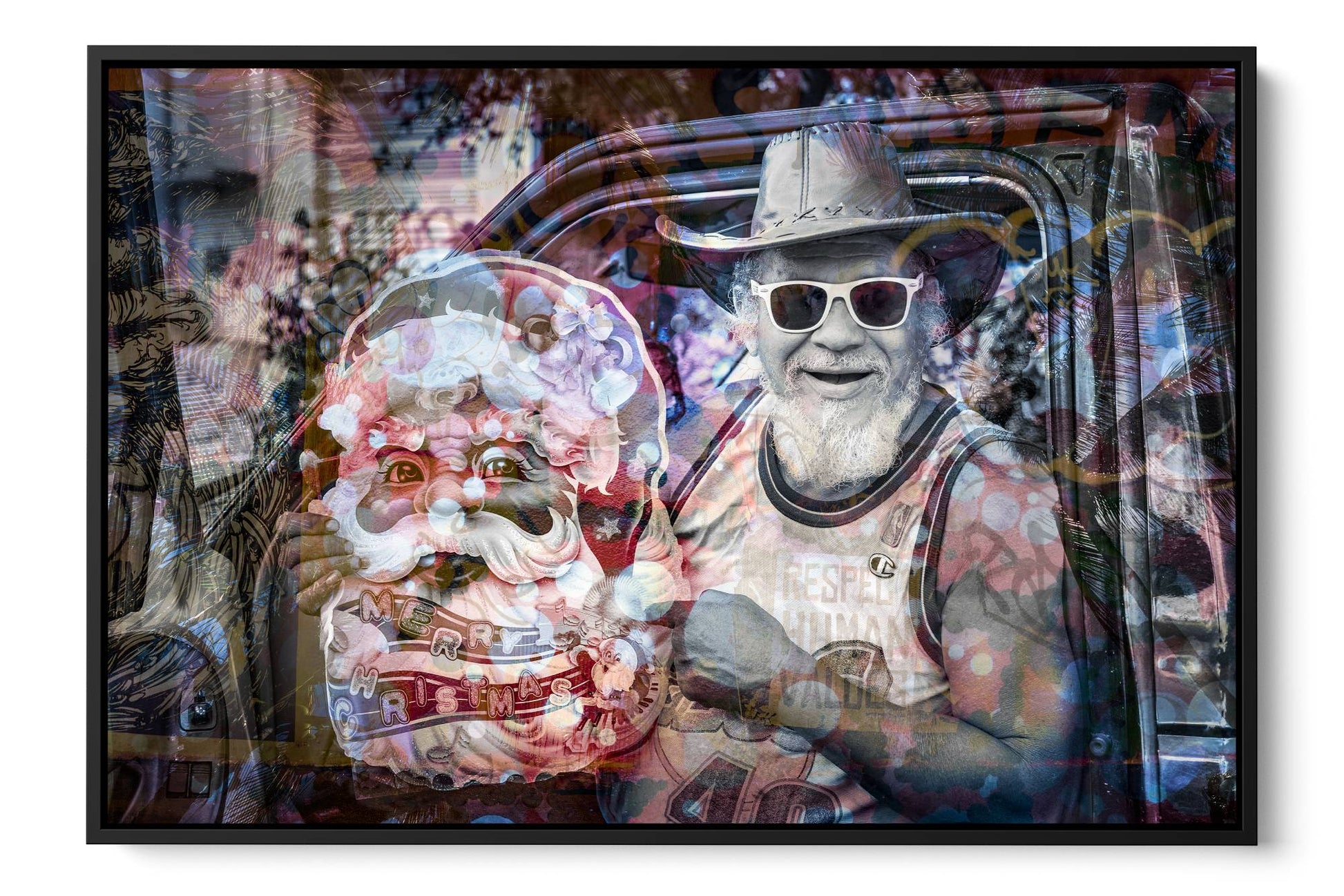In Christmas in Wynwood, Charlotte Fonne creates a portrait of a man holding a Merry Christmas sign in Miami through her layered photographic technique. Each element of the artwork is carefully selected to represent his environment, forming a visual exploration of identity and celebration. The fusion of his face, wearing a white beard like Santa Claus, with elements of the Wynwood district, including mural colors, urban drawings, and palm trees, adds depth and reflects the festive spirit of December under the sun. This fine art photography print captures both the character of the subject and the joyful energy of Wynwood during the holiday season.