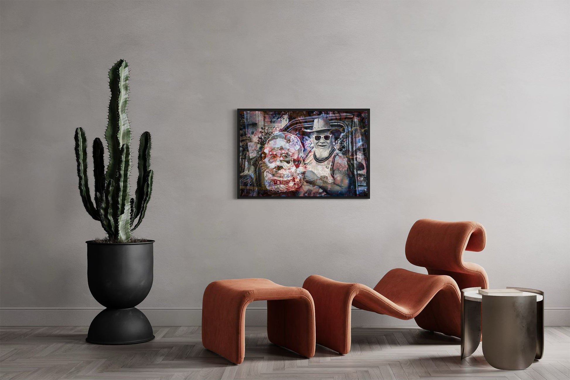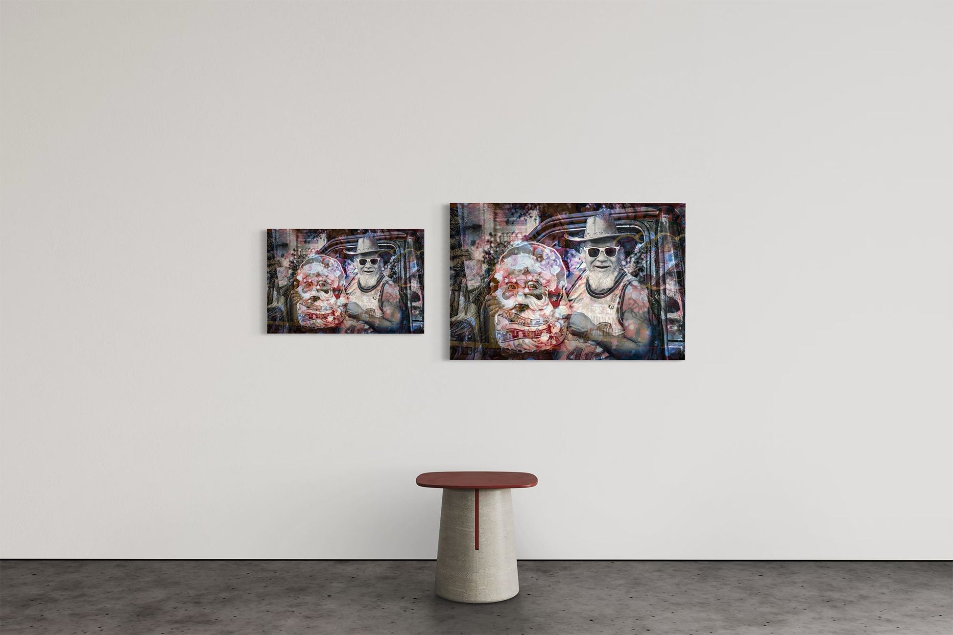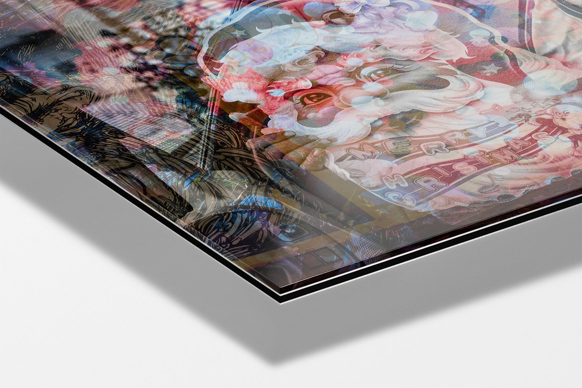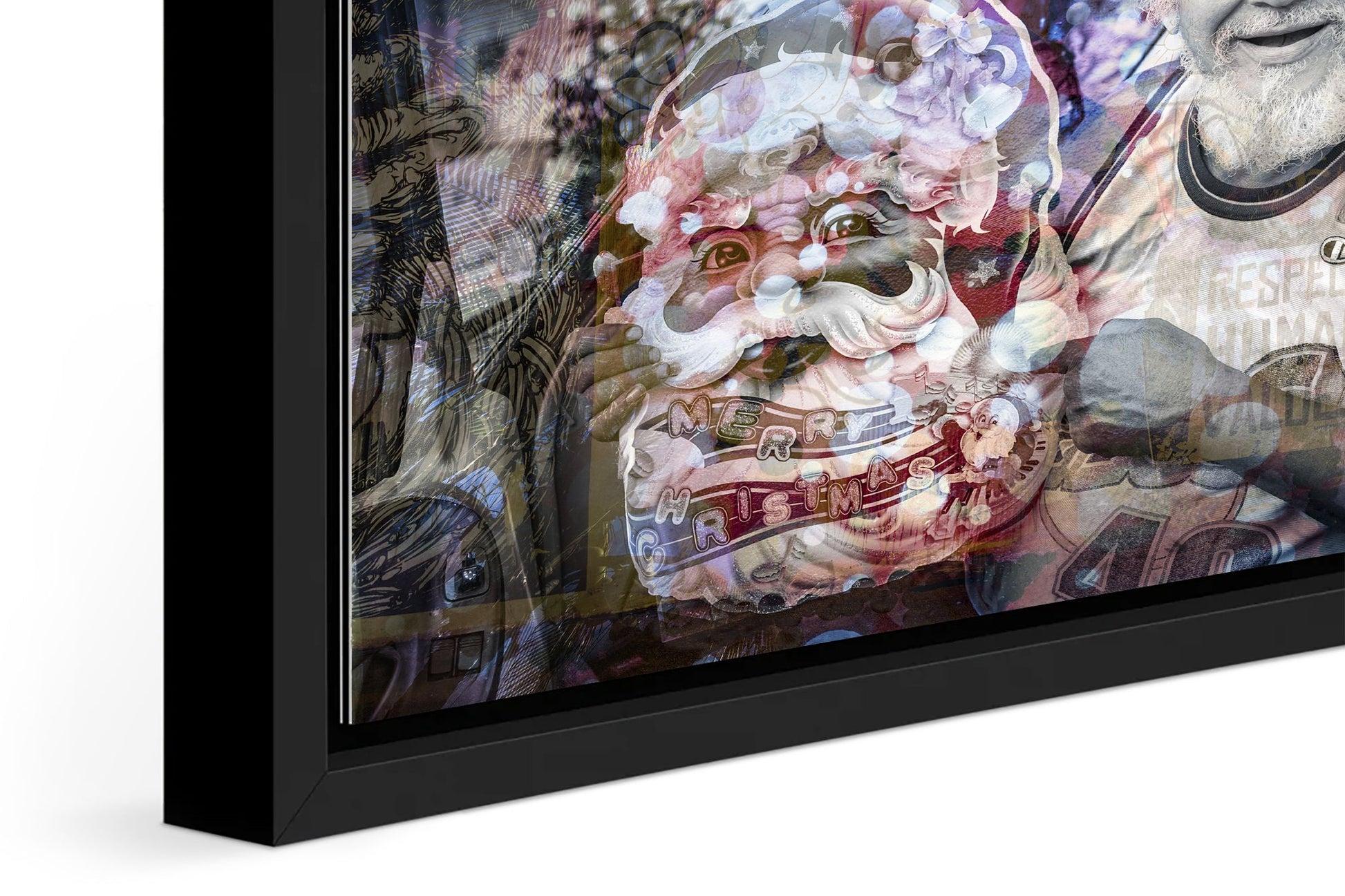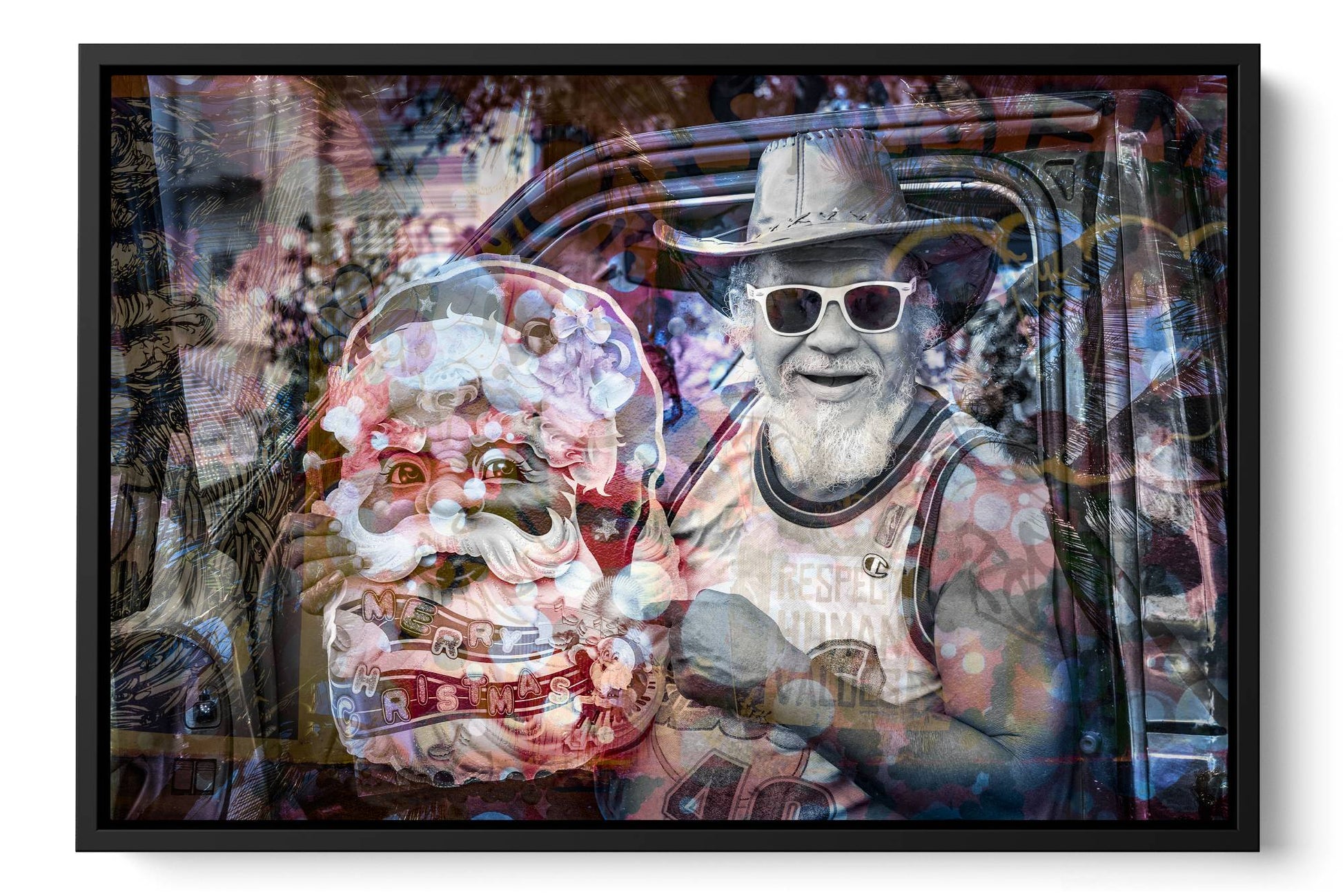 In Christmas in Wynwood, Charlotte Fonne creates a portrait of a man holding a Merry Christmas sign in Miami through her layered photographic technique. Each element of the artwork is carefully selected to represent his environment, forming a visual exploration of identity and celebration. The fusion of his face, wearing a white beard like Santa Claus, with elements of the Wynwood district, including mural colors, urban drawings, and palm trees, adds depth and reflects the festive spirit of December under the sun. This fine art photography print captures both the character of the subject and the joyful energy of Wynwood during the holiday season.