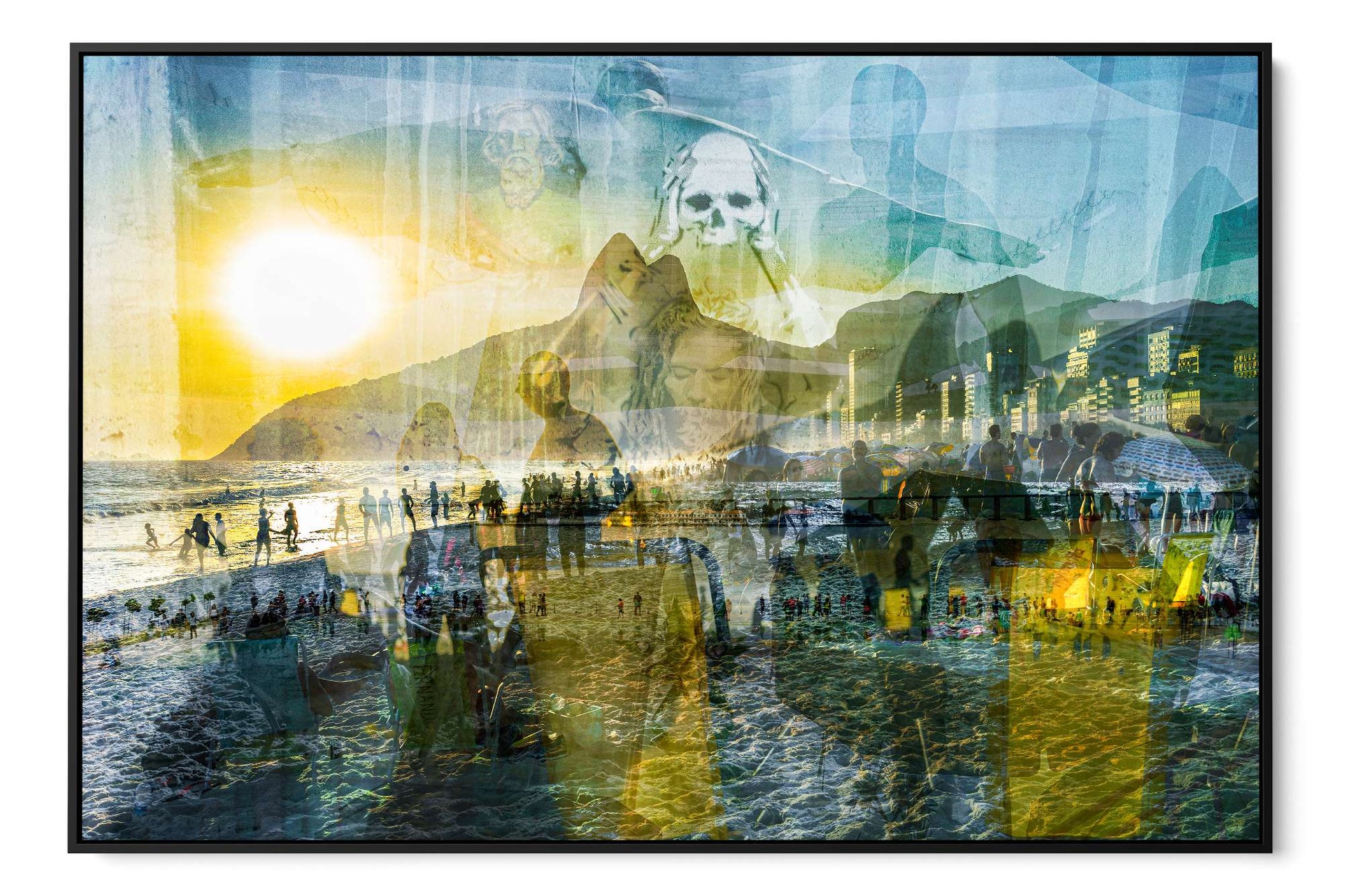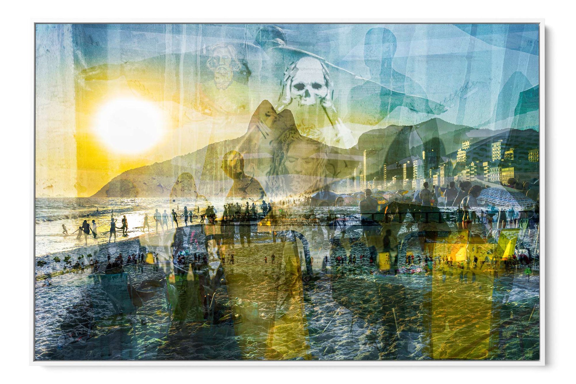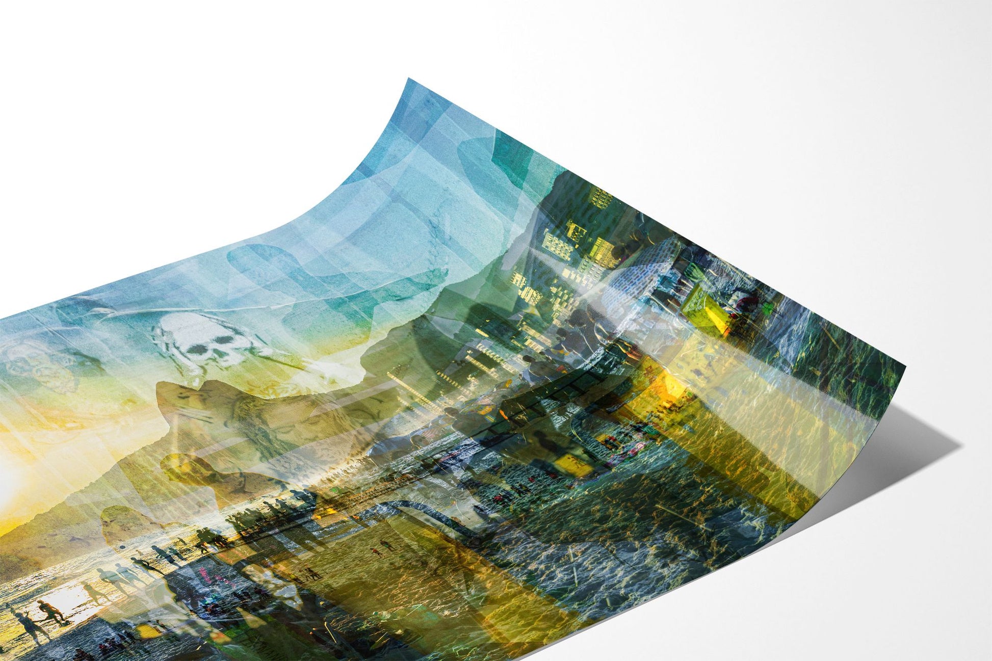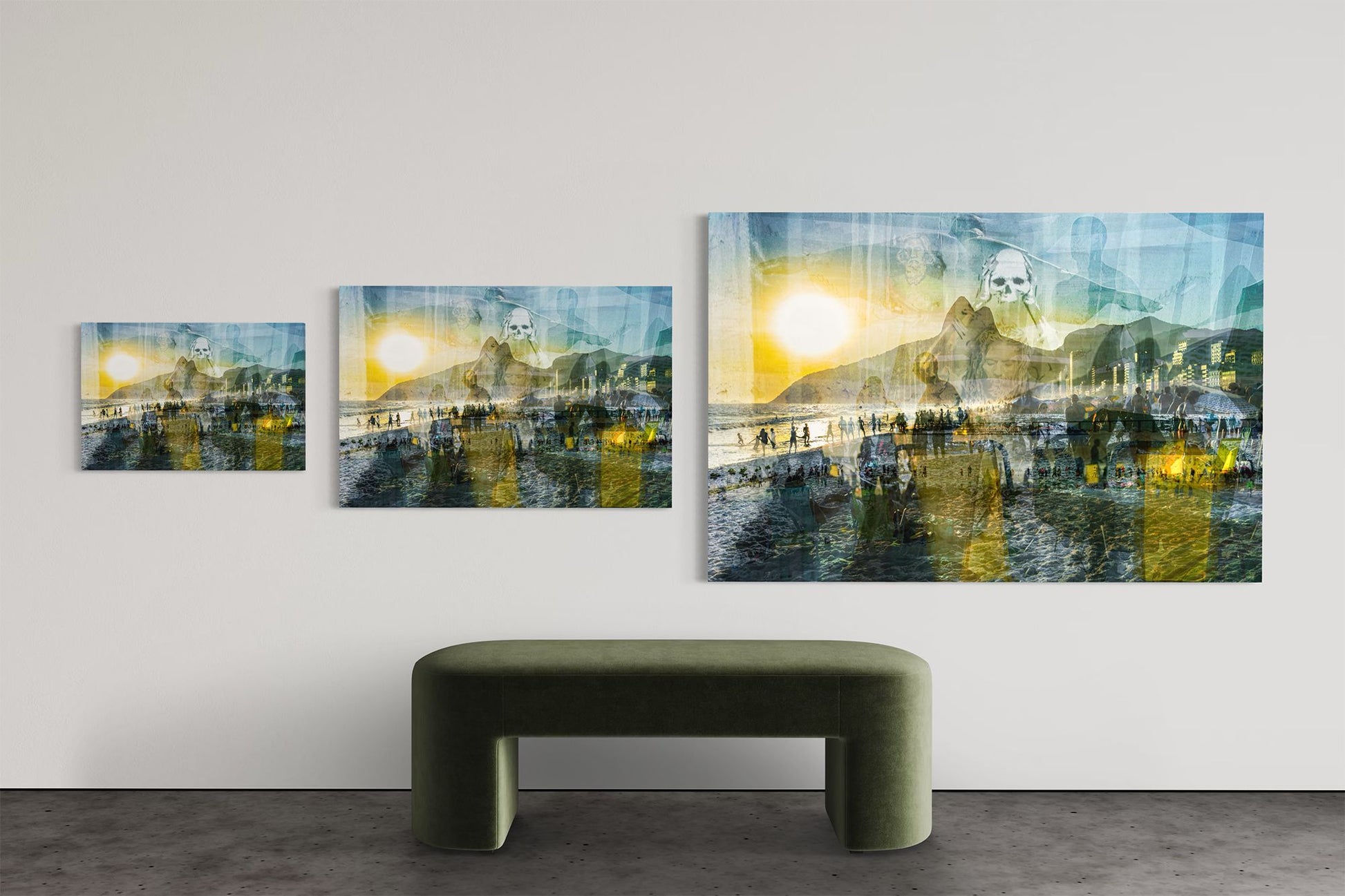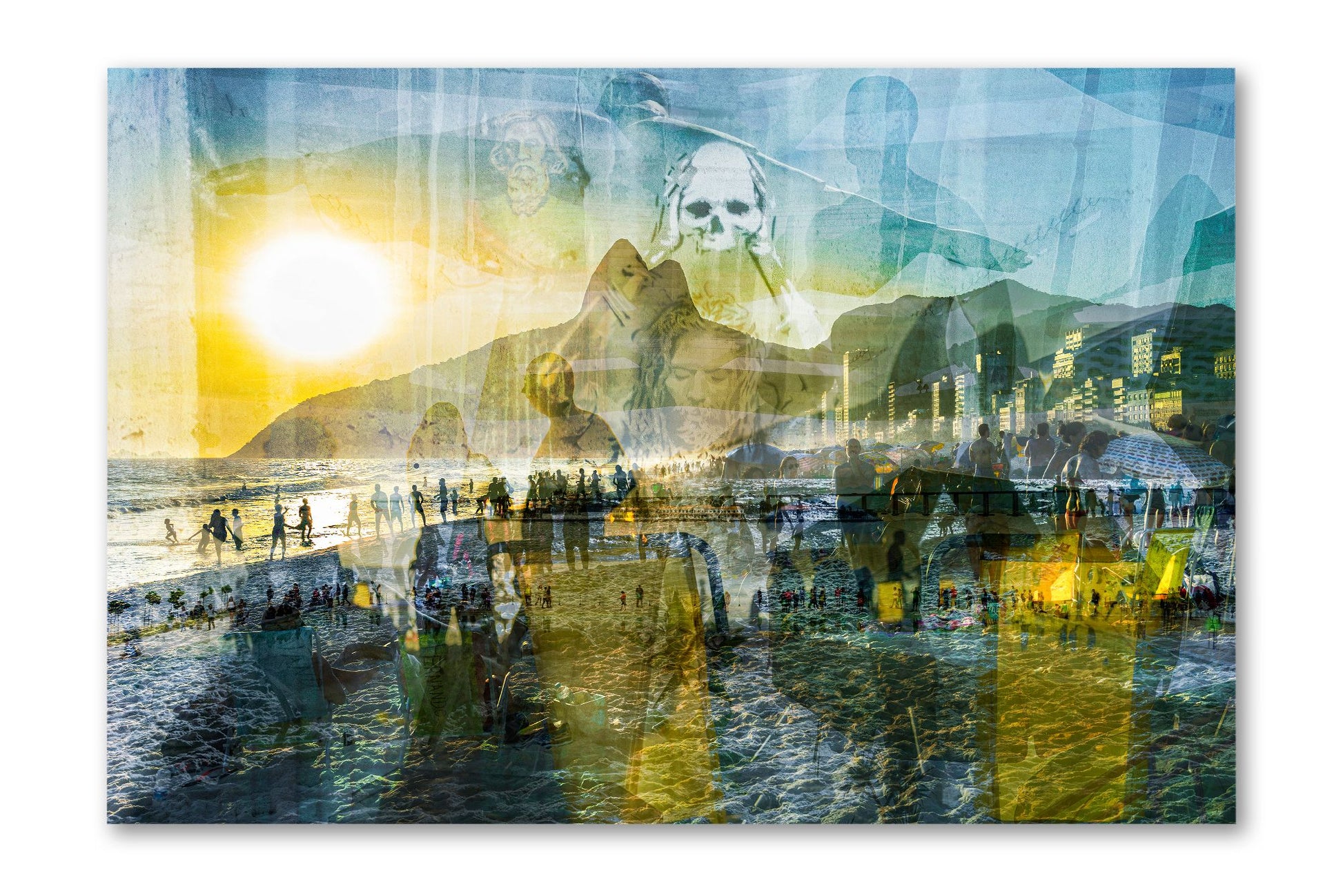 In Cidade Maravilhosa, Charlotte Fonne captures the spirit of Rio de Janeiro through a layered photographic exploration that blends reality and memory. The artwork evokes the energy of Ipanema Beach, with sunbathers, players of frescobol, and casual conversations bathed in the golden hour. The iconic Dois Irmãos mountains form the backdrop as Christ the Redeemer oversees the city. Unexpected details, like a skull mural from a quiet side street, tiny figures exploring the Museu do Amanhã, and São Judas Tadeu from a local church, add contemplative depth. This fine art photography print is a personal interpretation of Rio as an emotional topography where energy, light, and spirituality coexist.