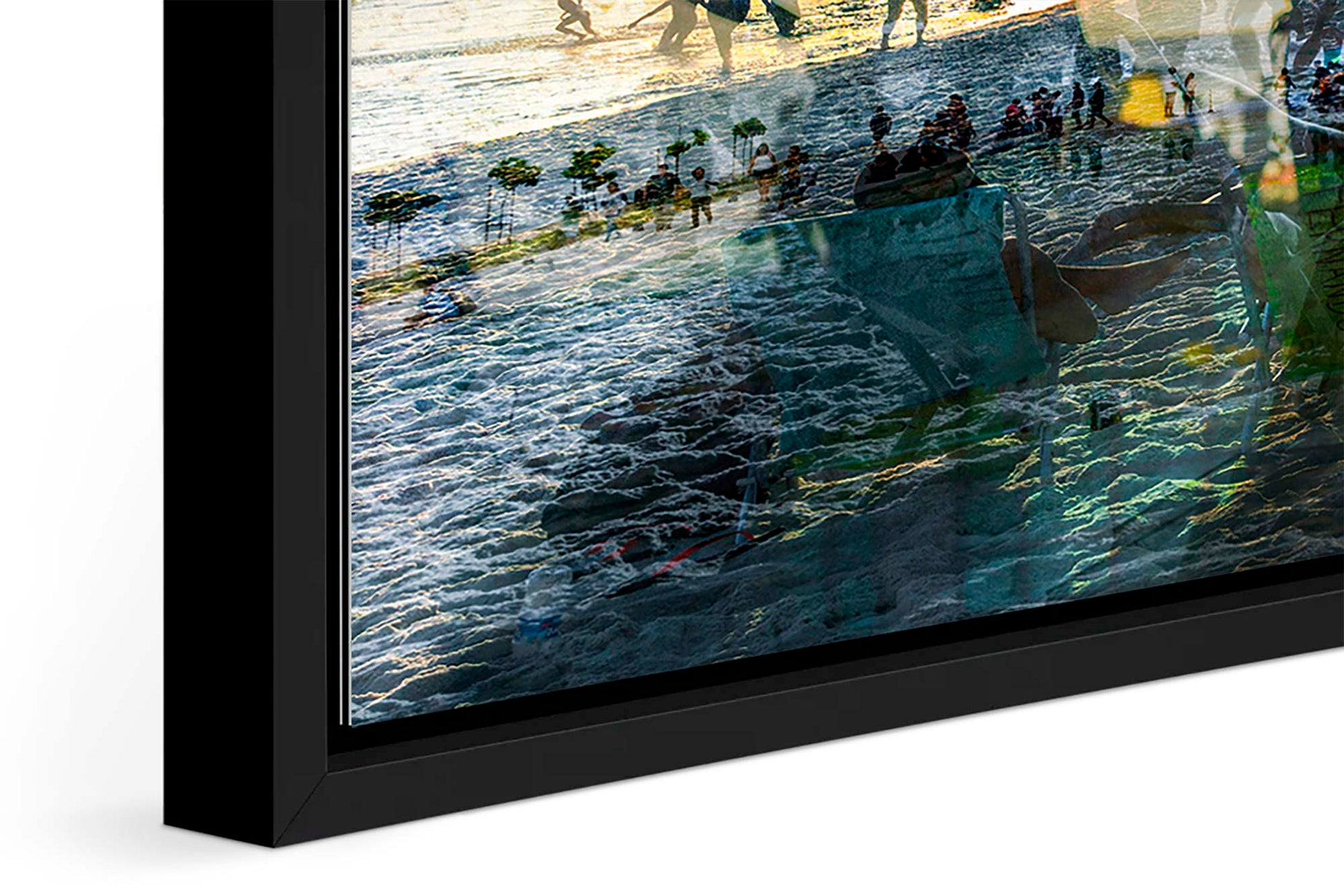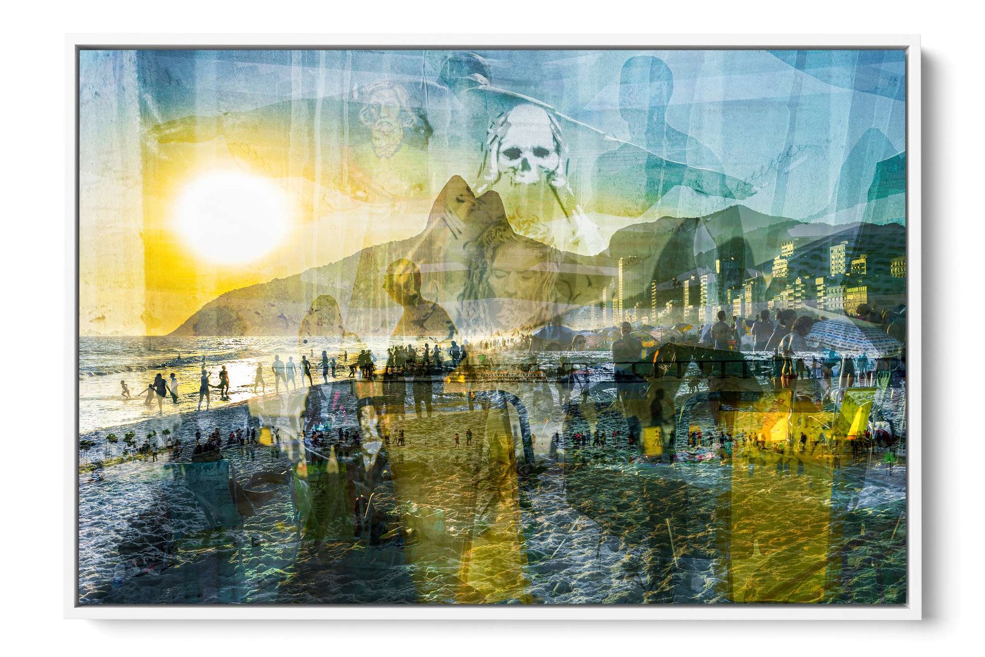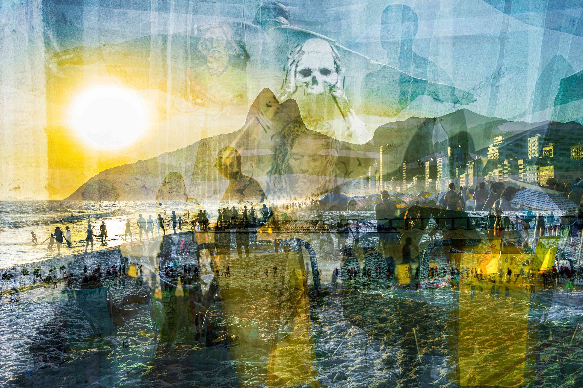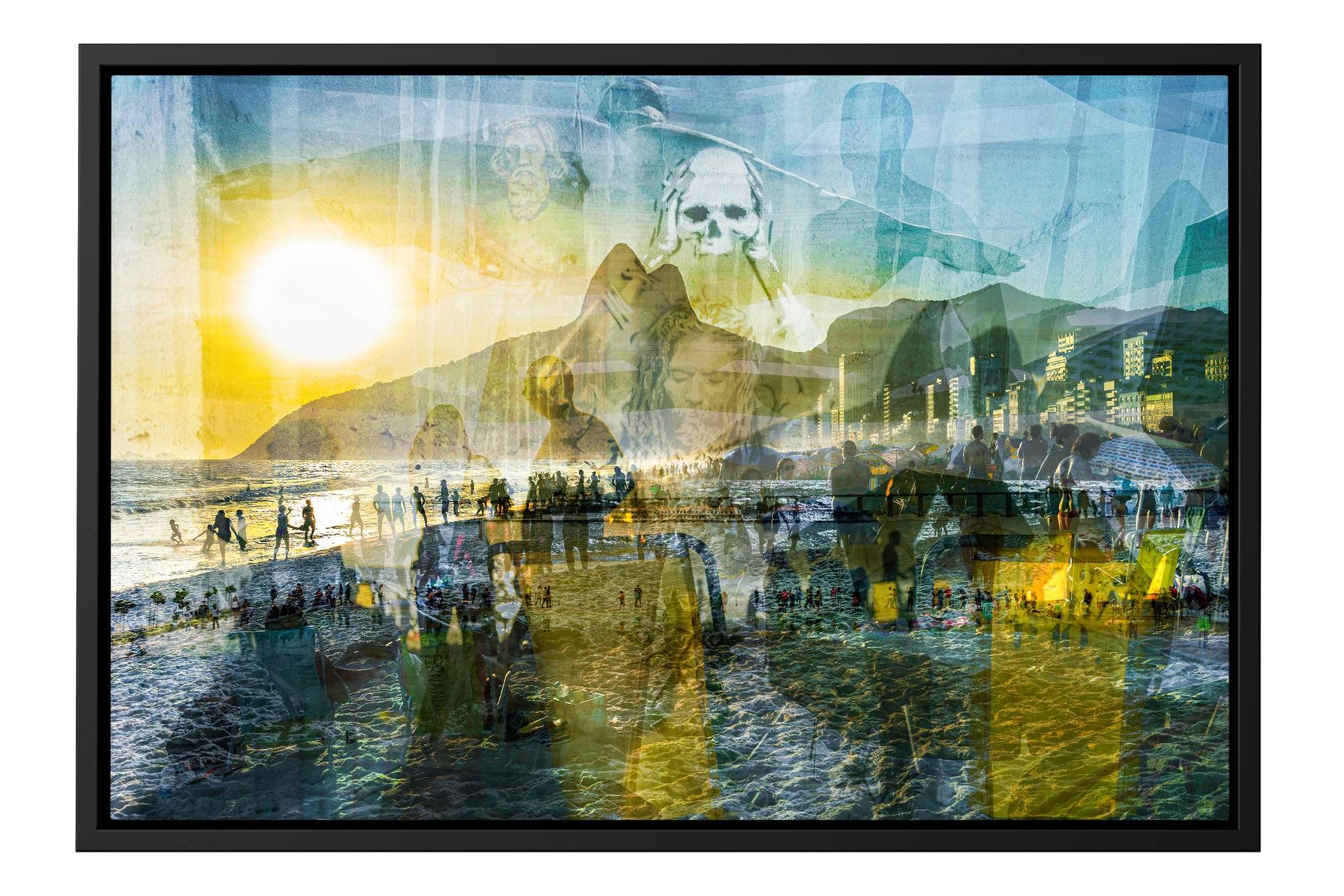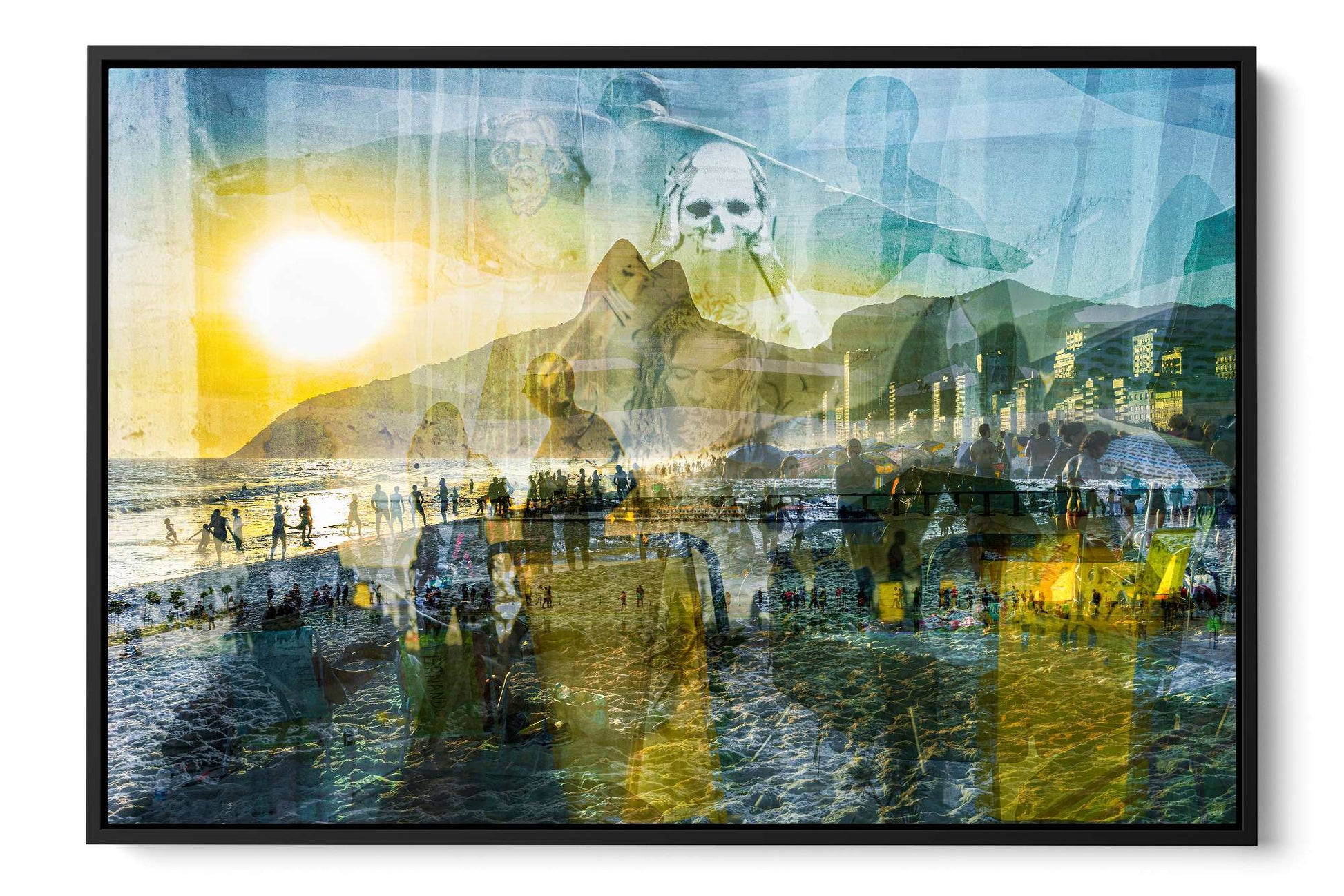 In Cidade Maravilhosa, Charlotte Fonne captures the spirit of Rio de Janeiro through a layered photographic exploration that blends reality and memory. The artwork evokes the energy of Ipanema Beach, with sunbathers, players of frescobol, and casual conversations bathed in the golden hour. The iconic Dois Irmãos mountains form the backdrop as Christ the Redeemer oversees the city. Unexpected details, like a skull mural from a quiet side street, tiny figures exploring the Museu do Amanhã, and São Judas Tadeu from a local church, add contemplative depth. This fine art photography print is a personal interpretation of Rio as an emotional topography where energy, light, and spirituality coexist.