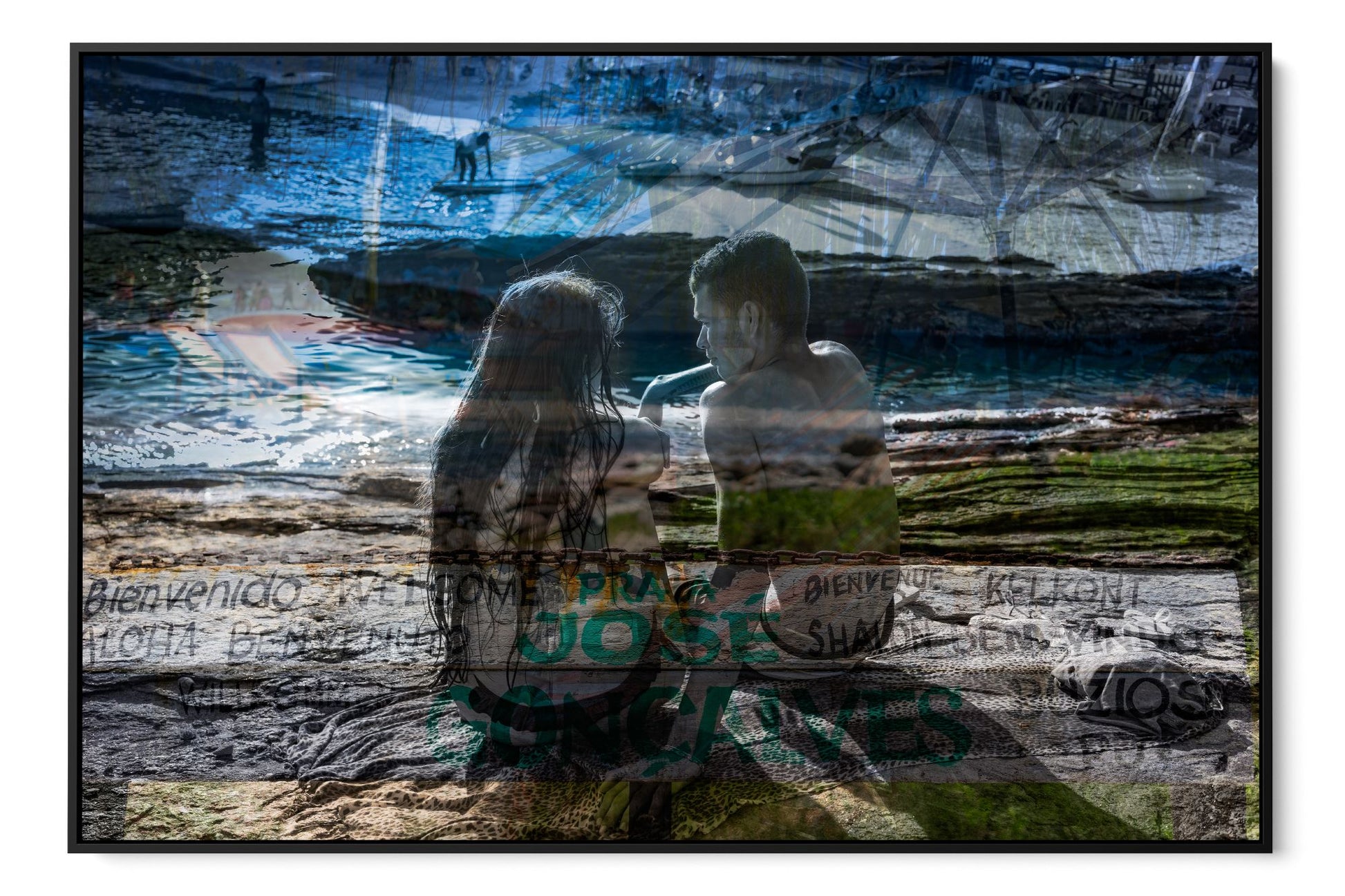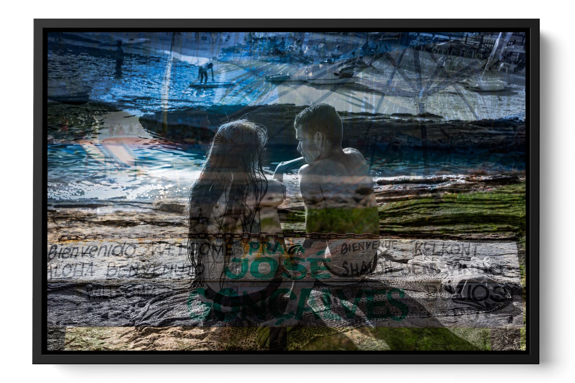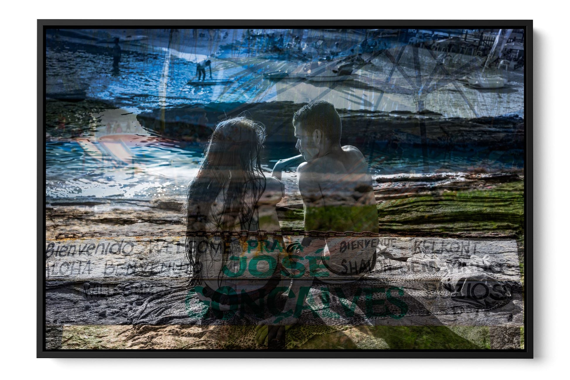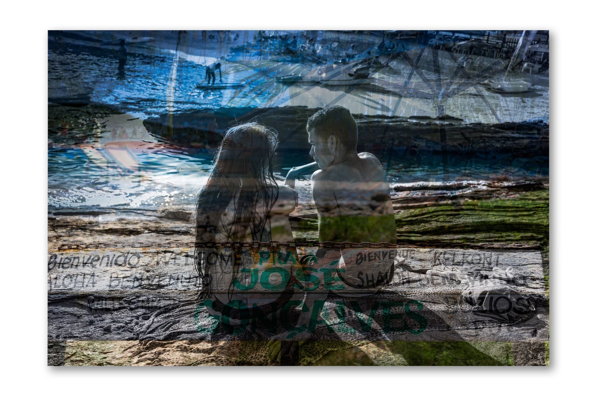 In Couple in Búzios, Charlotte Fonne creates a portrait of a young couple sitting under the Brazilian sun in Búzios through her layered photographic technique. Each element of the artwork is carefully selected to represent fragments of their lives and environment, forming a visual exploration of identity. The fusion of their calm postures with elements surrounding them, including the blue ocean, a welcome sign in multiple languages, palm trees, umbrellas, and people enjoying the beach, reflects the relaxing ambiance and the natural beauty of the peninsula. This fine art photography print captures both the candidness of the subjects and the vibrant energy of life in Búzios.