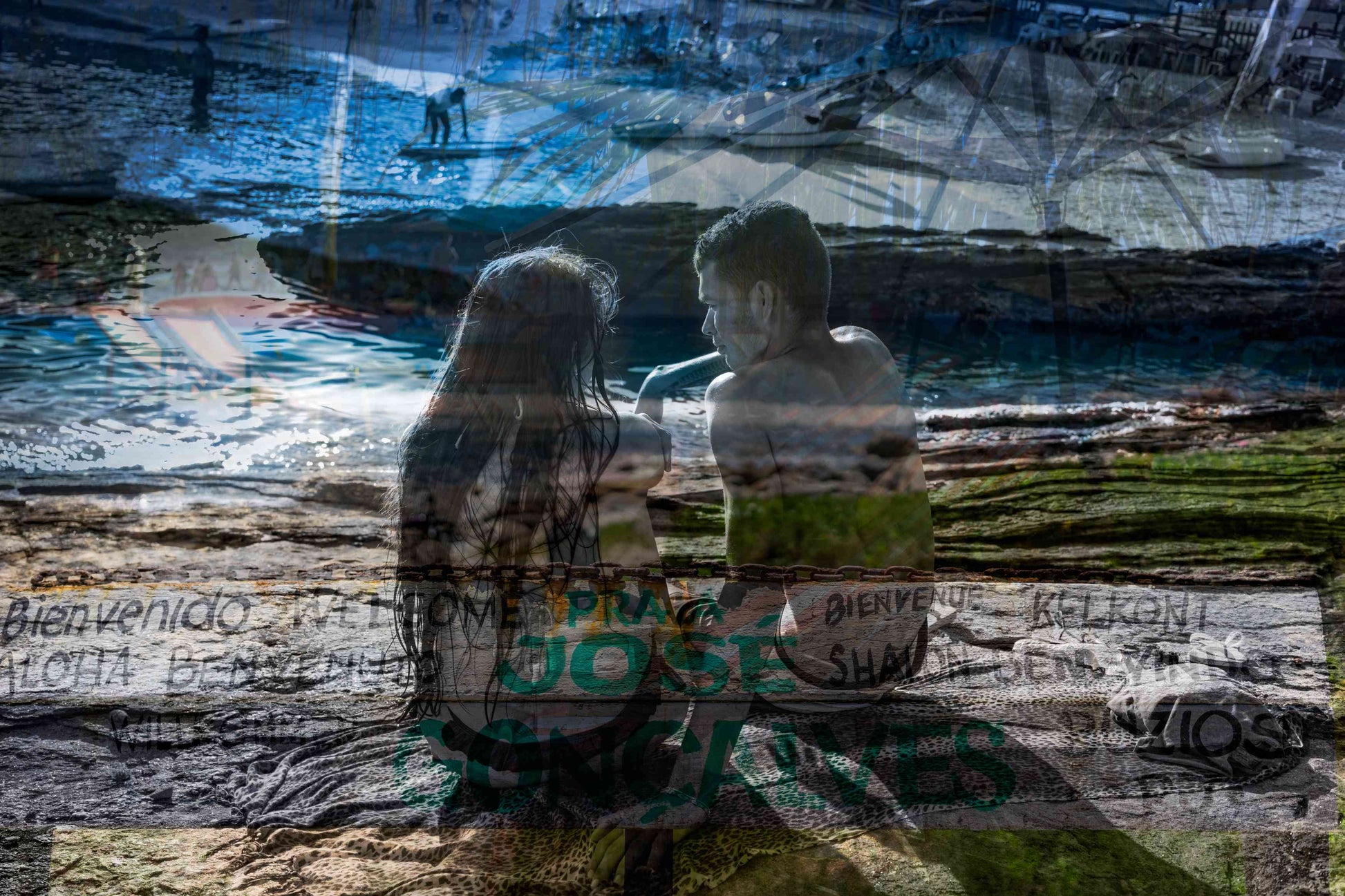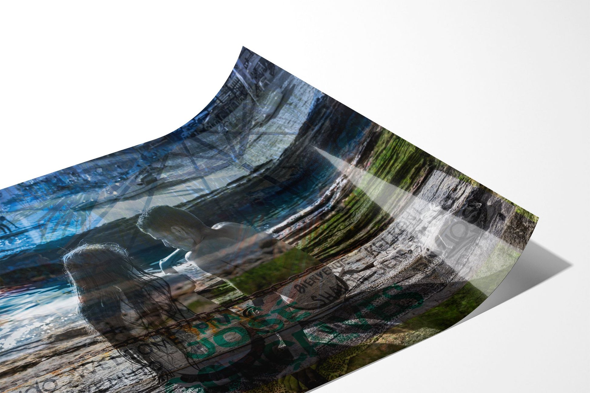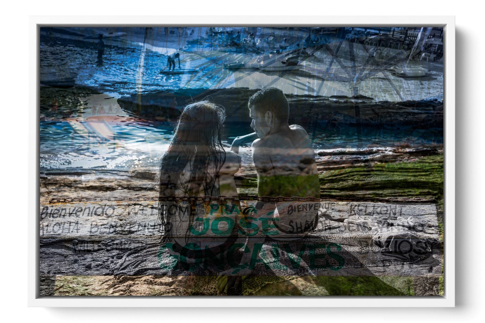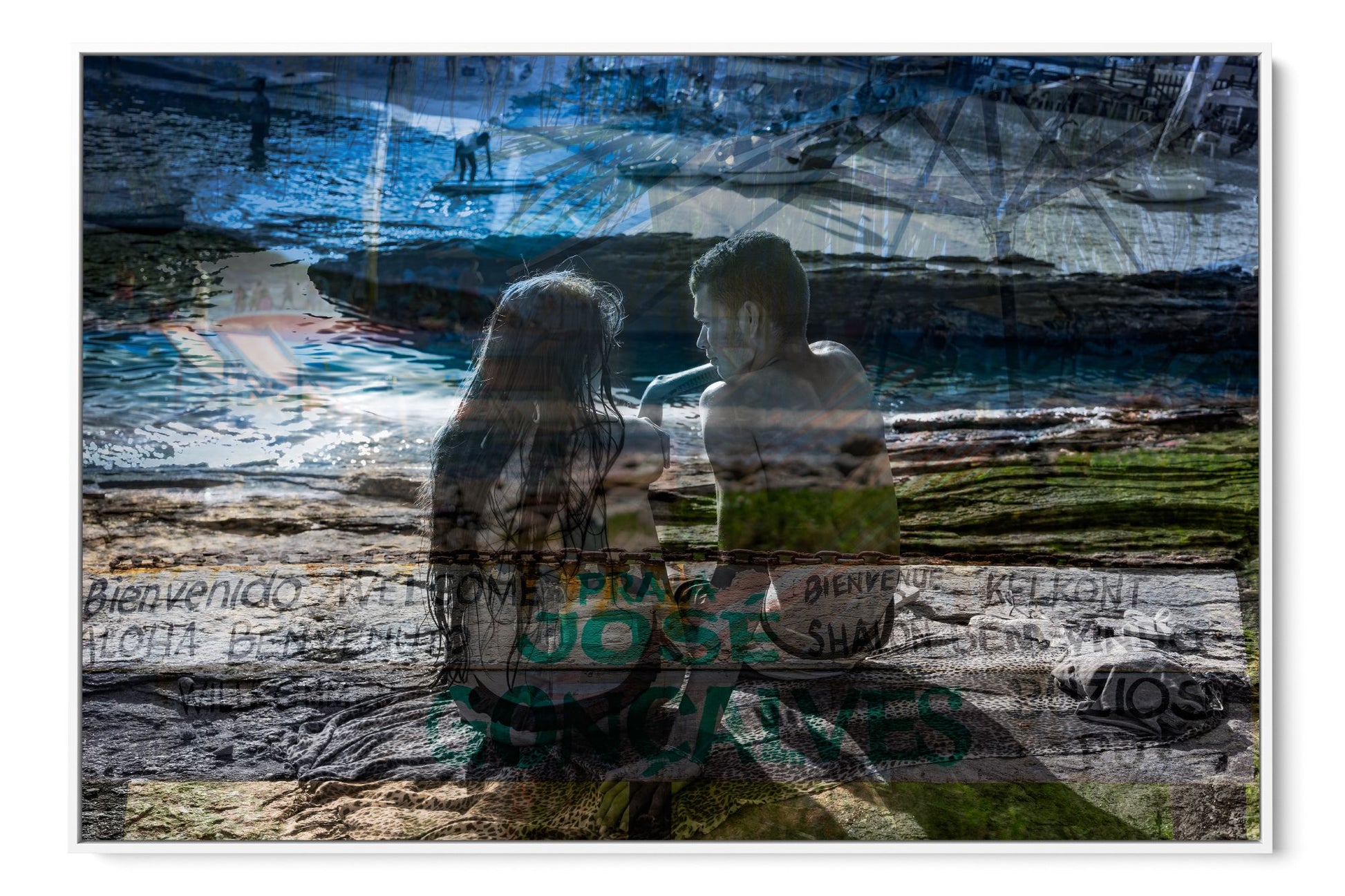 In Couple in Búzios, Charlotte Fonne creates a portrait of a young couple sitting under the Brazilian sun in Búzios through her layered photographic technique. Each element of the artwork is carefully selected to represent fragments of their lives and environment, forming a visual exploration of identity. The fusion of their calm postures with elements surrounding them, including the blue ocean, a welcome sign in multiple languages, palm trees, umbrellas, and people enjoying the beach, reflects the relaxing ambiance and the natural beauty of the peninsula. This fine art photography print captures both the candidness of the subjects and the vibrant energy of life in Búzios.
