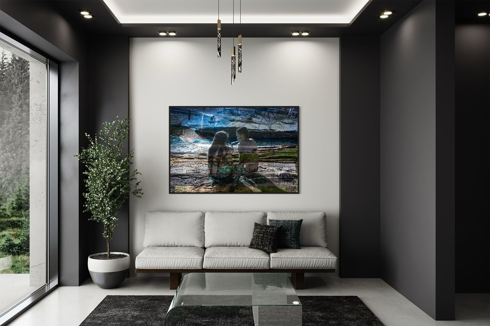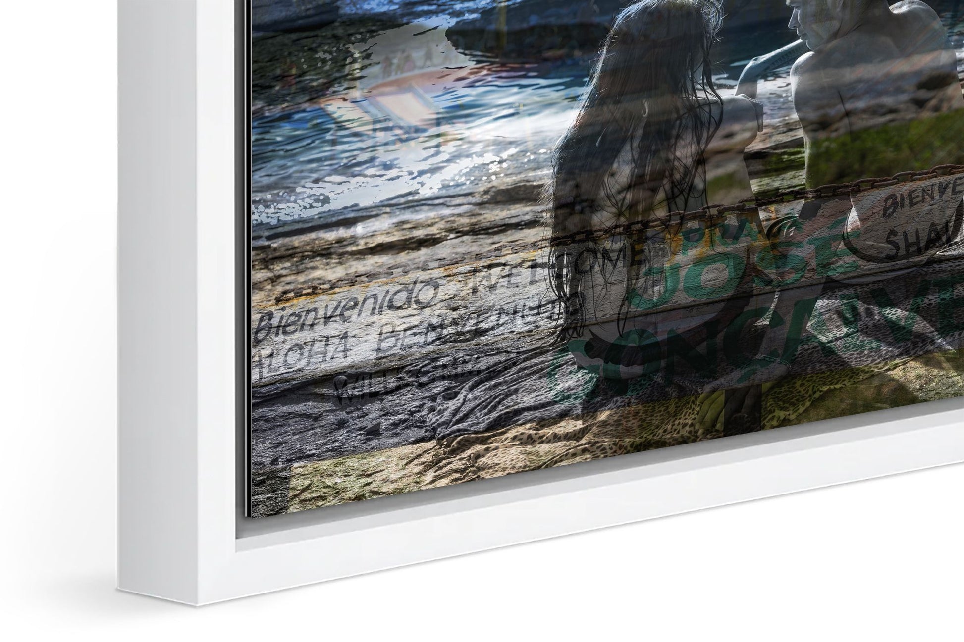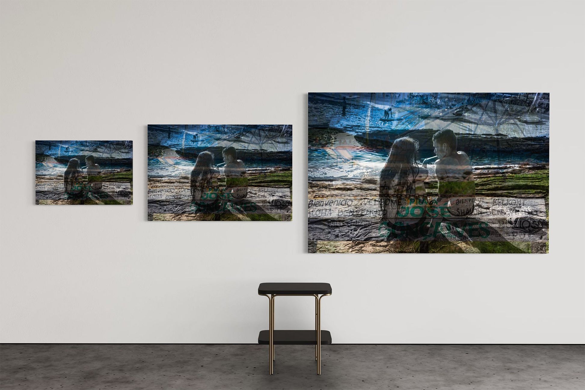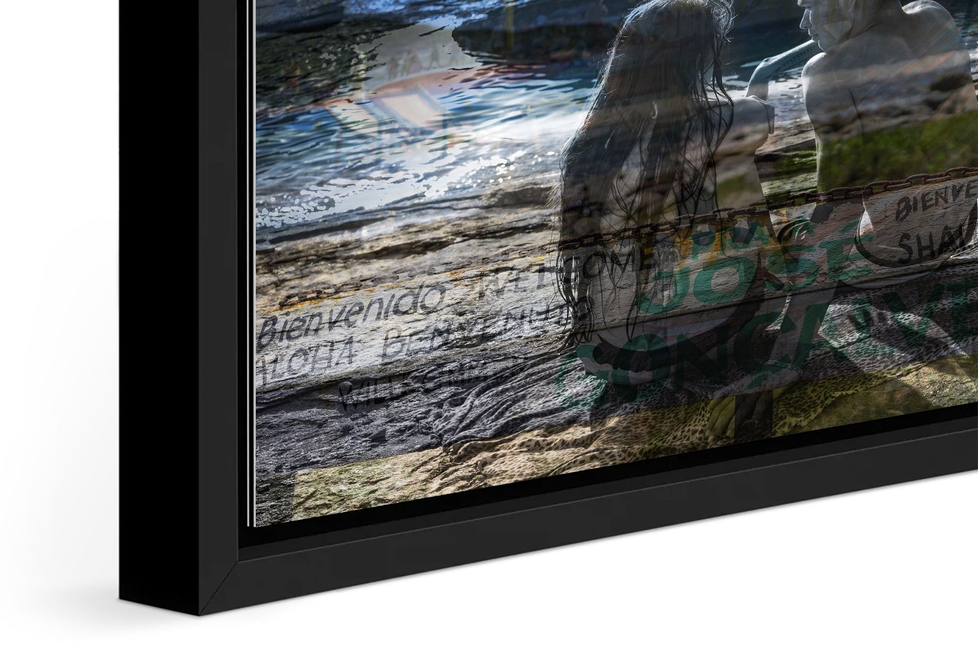 In Couple in Búzios, Charlotte Fonne creates a portrait of a young couple sitting under the Brazilian sun in Búzios through her layered photographic technique. Each element of the artwork is carefully selected to represent fragments of their lives and environment, forming a visual exploration of identity. The fusion of their calm postures with elements surrounding them, including the blue ocean, a welcome sign in multiple languages, palm trees, umbrellas, and people enjoying the beach, reflects the relaxing ambiance and the natural beauty of the peninsula. This fine art photography print captures both the candidness of the subjects and the vibrant energy of life in Búzios.