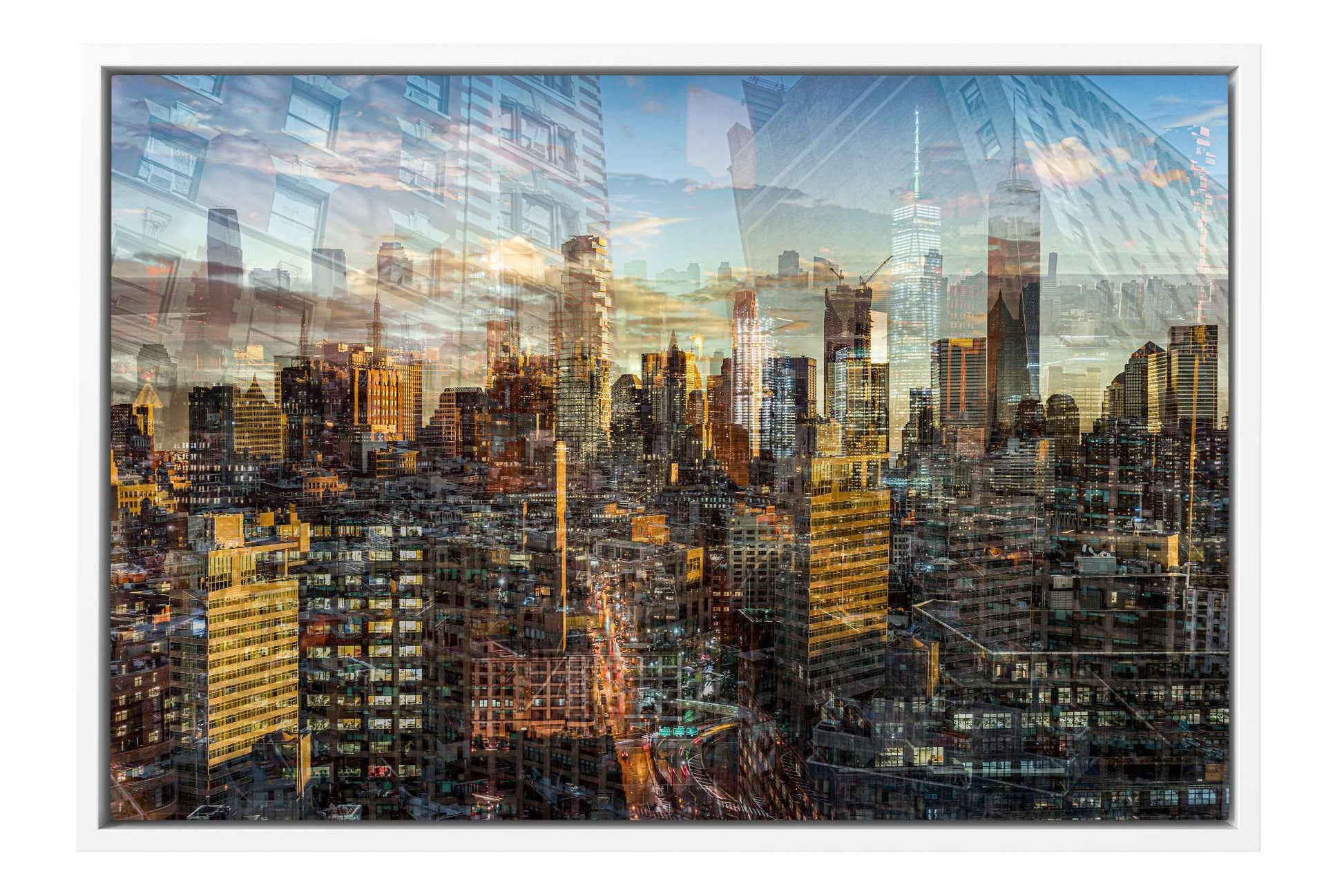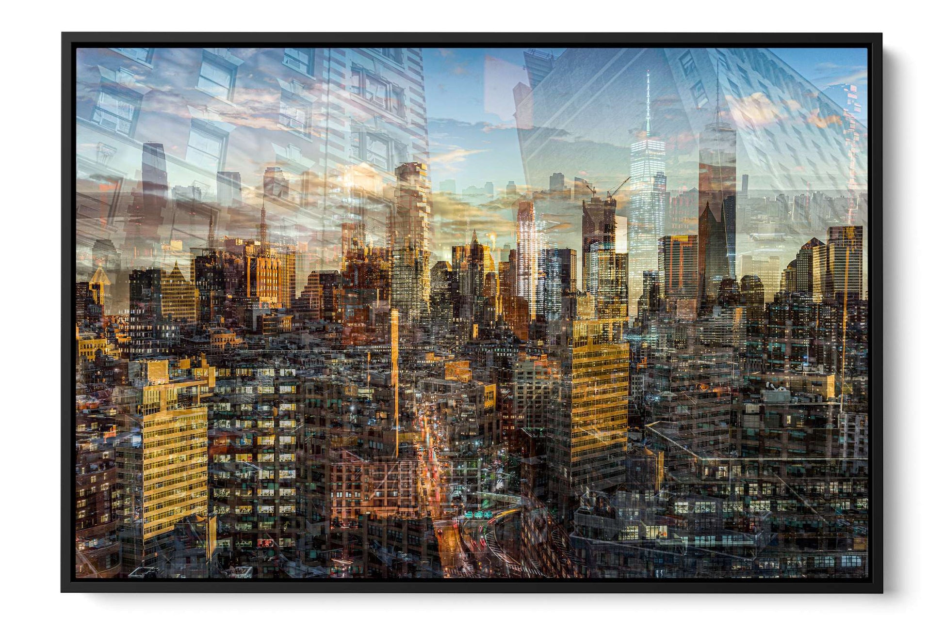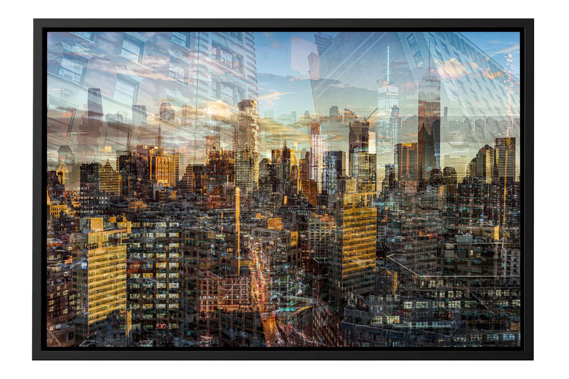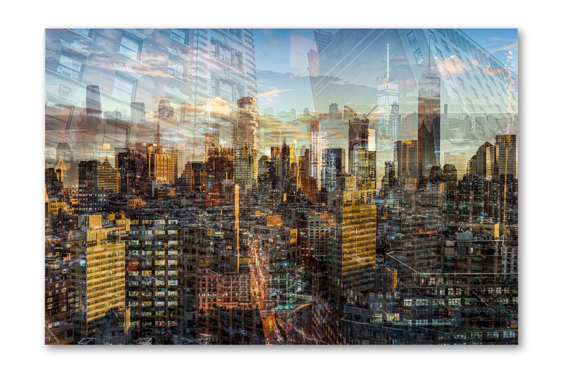 In Manhattan View, Charlotte Fonne captures the energy and architectural grandeur of New York City during a golden sunset through her layered photographic technique. The artwork reflects her memories from an unforgettable evening in SoHo, where the city’s pulse felt alive. Multiple photographs merge to create a mosaic of city life, with glimpses of strangers behind windows and fleeting moments of movement. Iconic landmarks such as One World Trade Center, 3 World Trade Center, the Four Seasons Hotel, the Jenga Tower, the Thurgood Marshall U.S. Courthouse, and the historic Woolworth Building are woven into the composition, each telling its own story. This fine art photography print recreates the sense of wonder, belonging, and ceaseless energy that defines Manhattan, forming an emotional cityscape that combines the rhythm and light of the city that never sleeps.