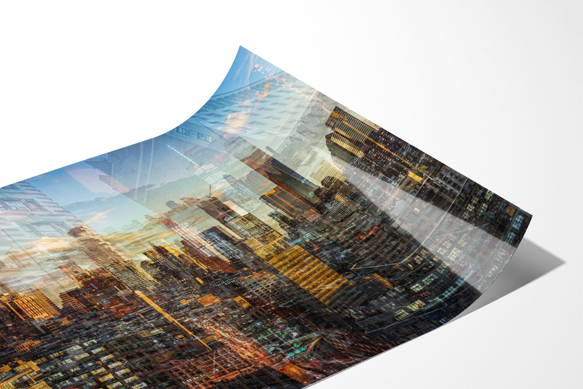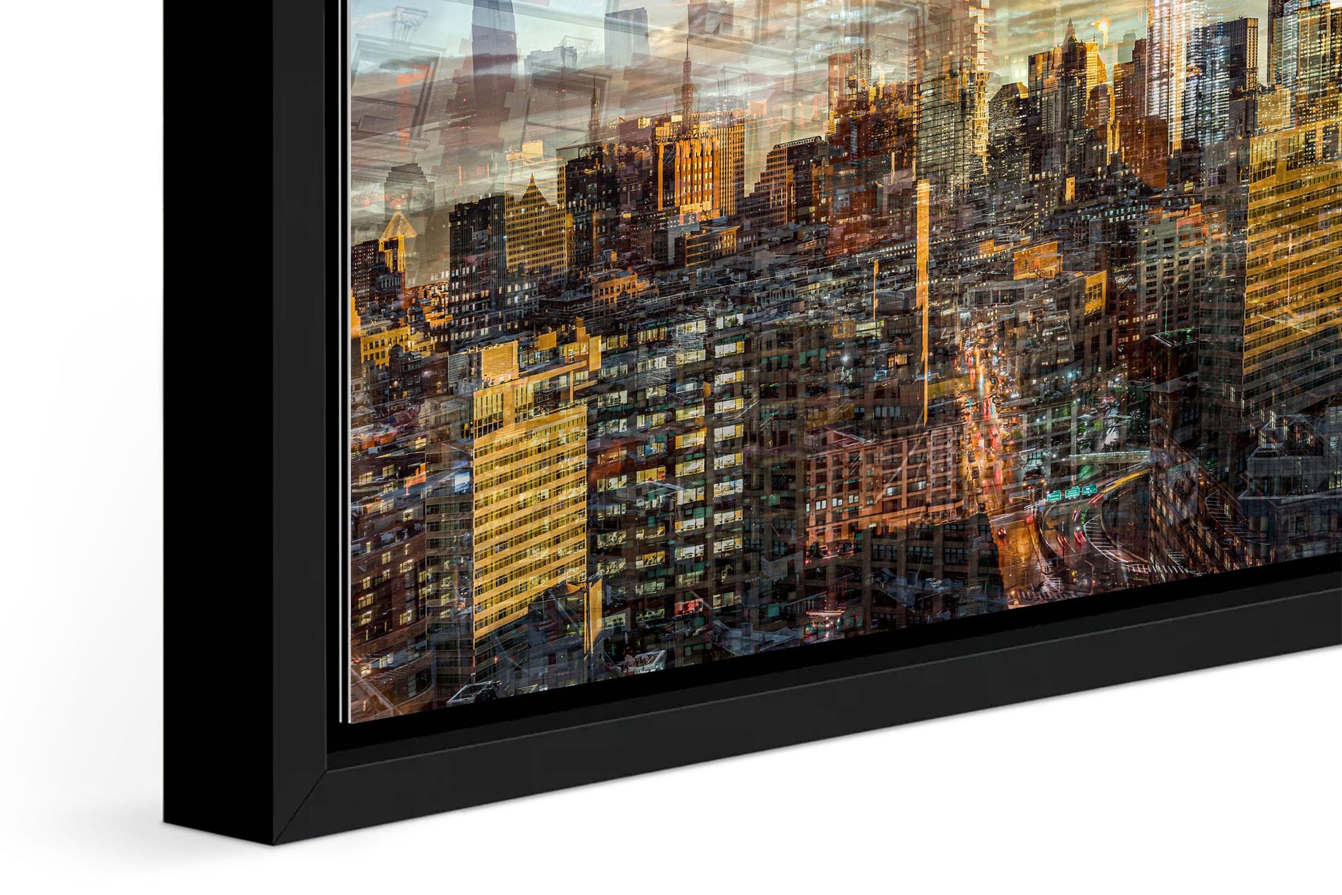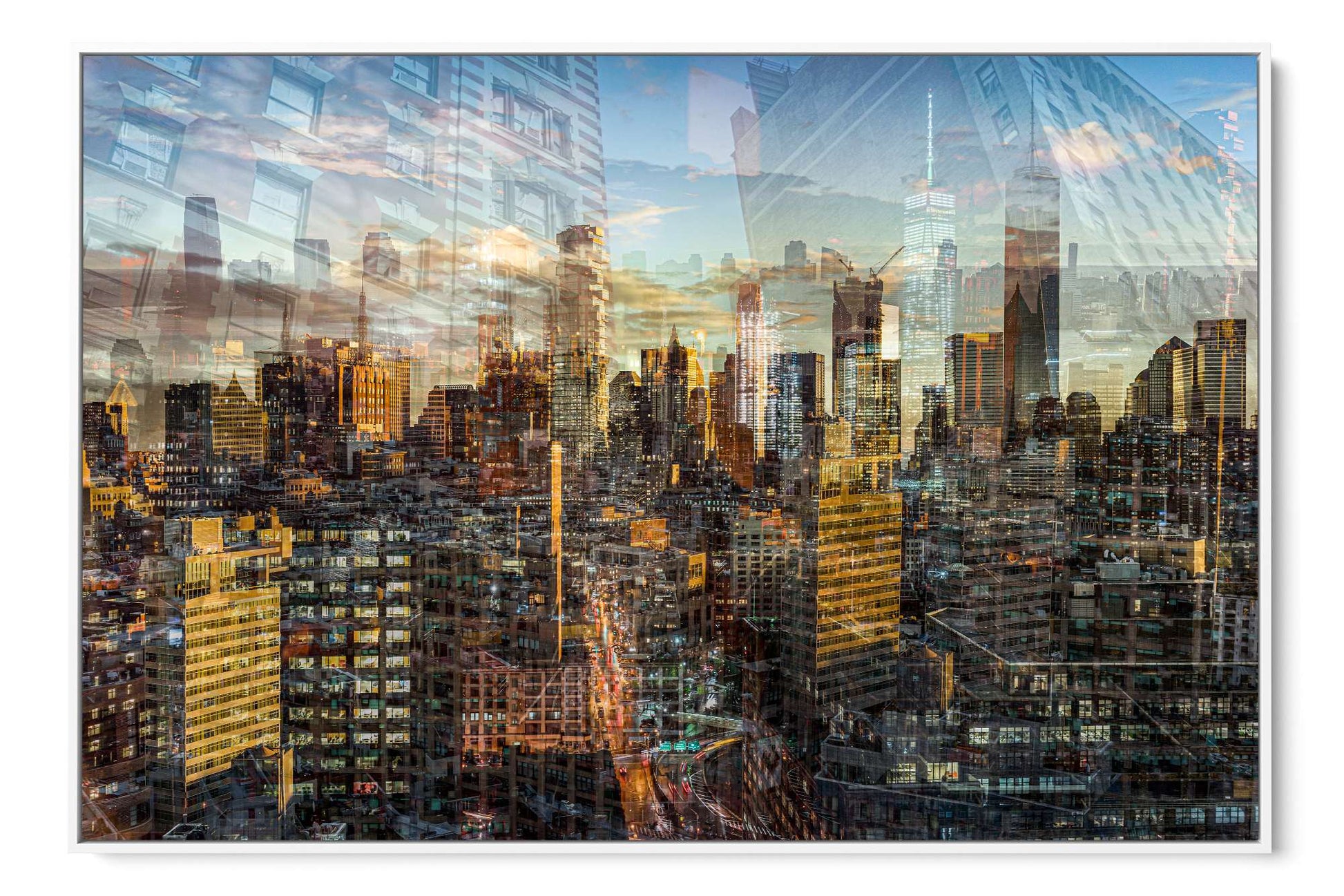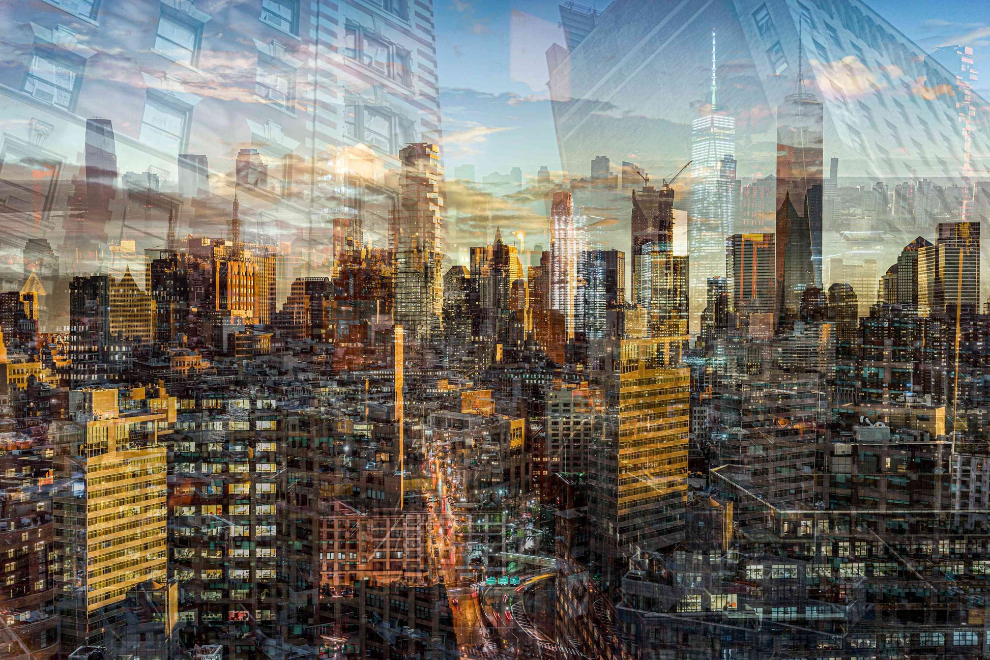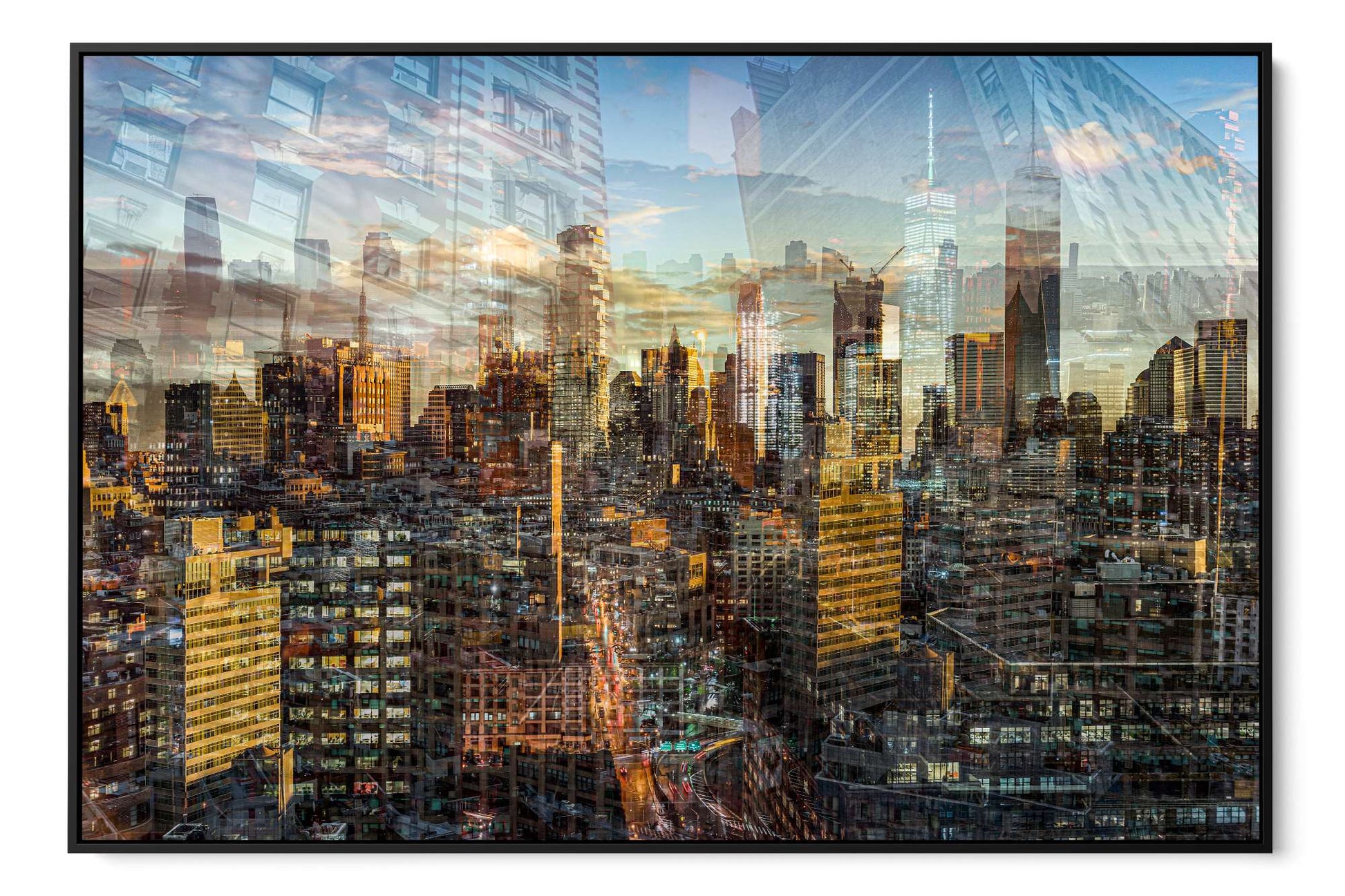 In Manhattan View, Charlotte Fonne captures the energy and architectural grandeur of New York City during a golden sunset through her layered photographic technique. The artwork reflects her memories from an unforgettable evening in SoHo, where the city’s pulse felt alive. Multiple photographs merge to create a mosaic of city life, with glimpses of strangers behind windows and fleeting moments of movement. Iconic landmarks such as One World Trade Center, 3 World Trade Center, the Four Seasons Hotel, the Jenga Tower, the Thurgood Marshall U.S. Courthouse, and the historic Woolworth Building are woven into the composition, each telling its own story. This fine art photography print recreates the sense of wonder, belonging, and ceaseless energy that defines Manhattan, forming an emotional cityscape that combines the rhythm and light of the city that never sleeps.