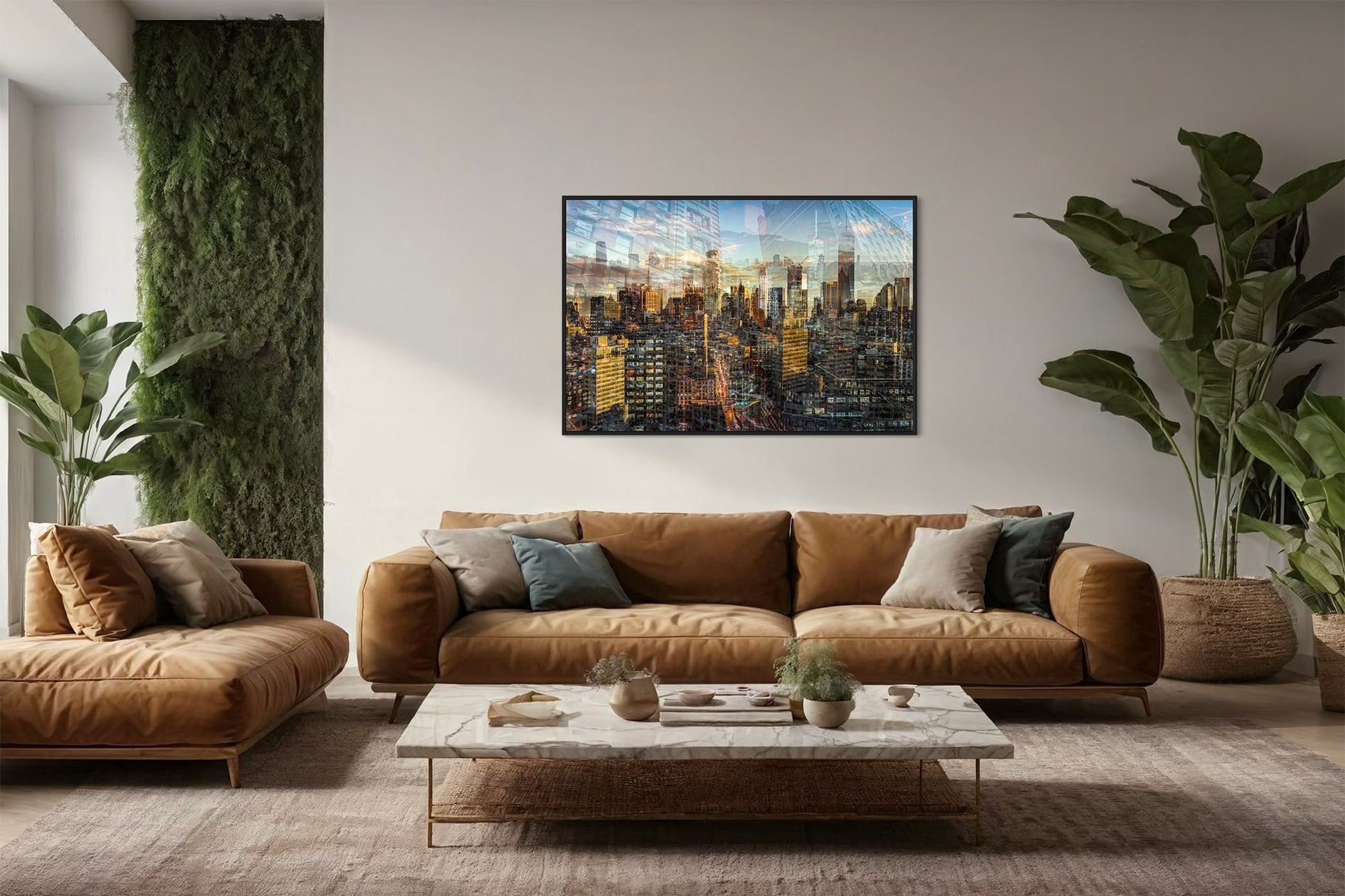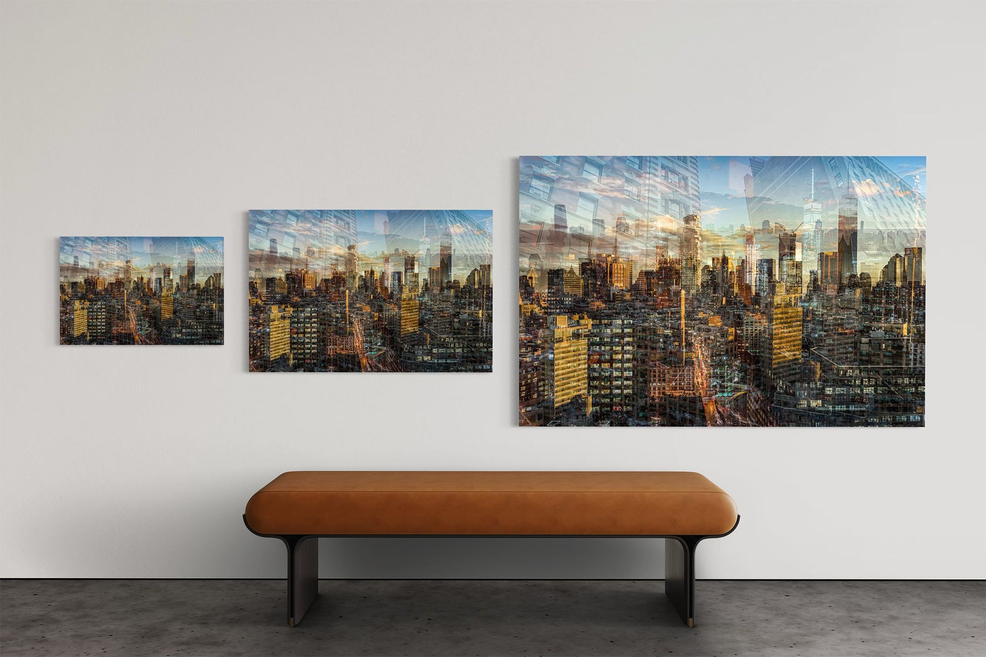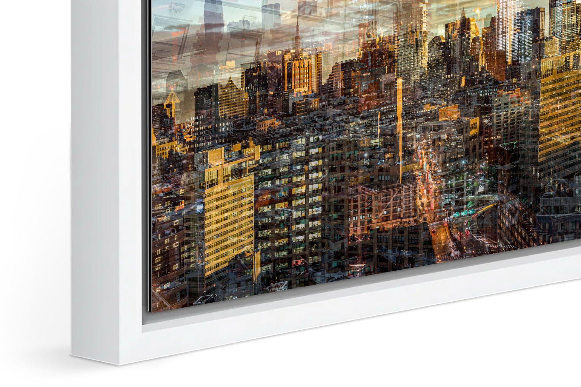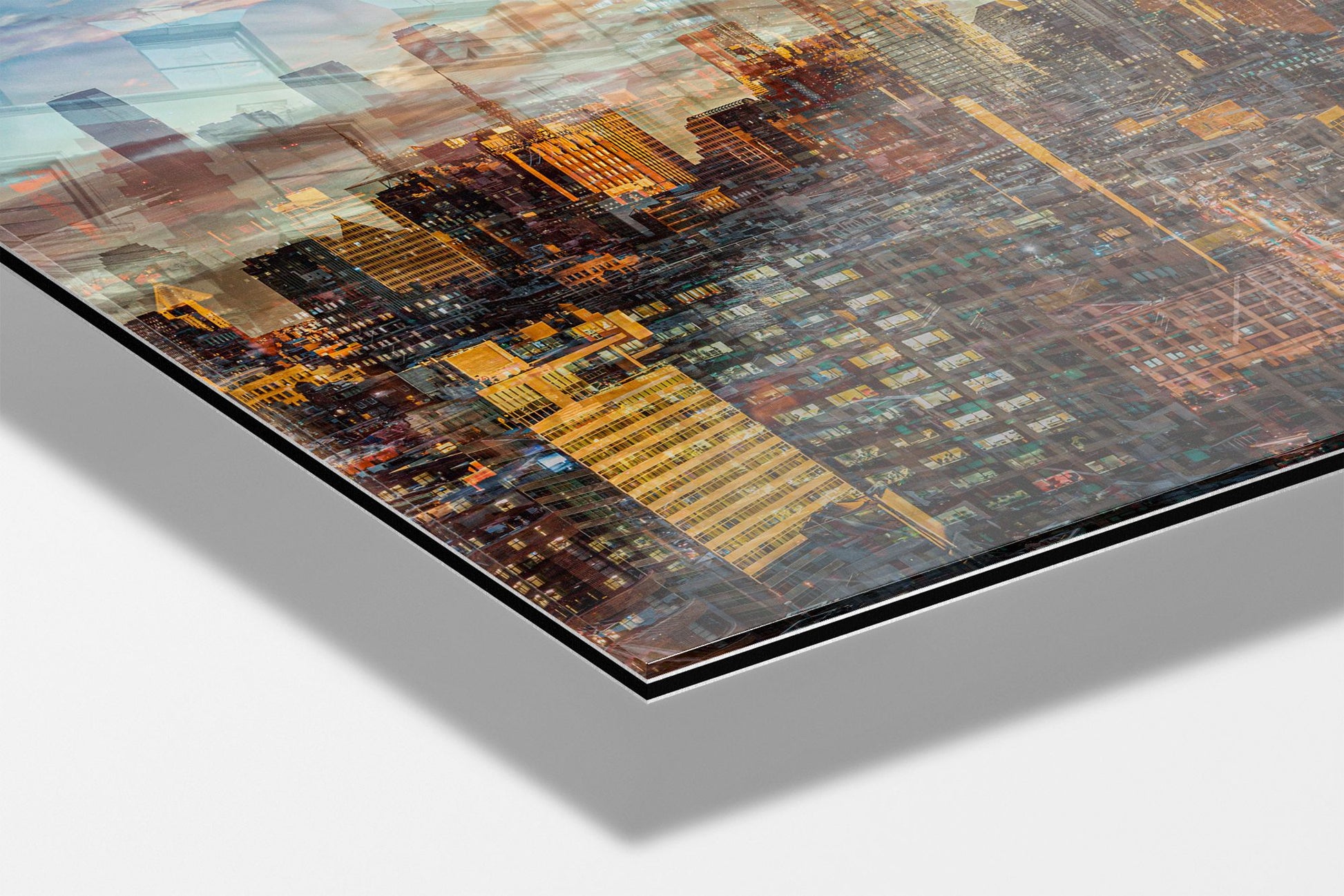 In Manhattan View, Charlotte Fonne captures the energy and architectural grandeur of New York City during a golden sunset through her layered photographic technique. The artwork reflects her memories from an unforgettable evening in SoHo, where the city’s pulse felt alive. Multiple photographs merge to create a mosaic of city life, with glimpses of strangers behind windows and fleeting moments of movement. Iconic landmarks such as One World Trade Center, 3 World Trade Center, the Four Seasons Hotel, the Jenga Tower, the Thurgood Marshall U.S. Courthouse, and the historic Woolworth Building are woven into the composition, each telling its own story. This fine art photography print recreates the sense of wonder, belonging, and ceaseless energy that defines Manhattan, forming an emotional cityscape that combines the rhythm and light of the city that never sleeps.