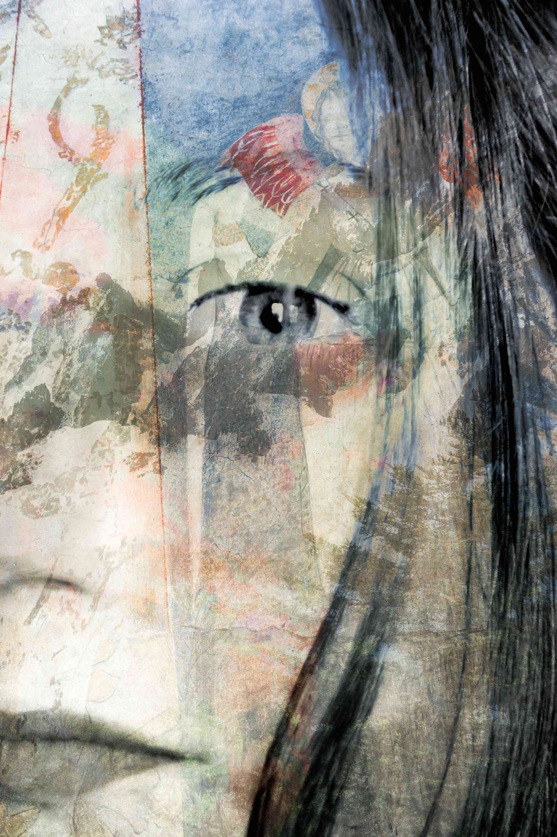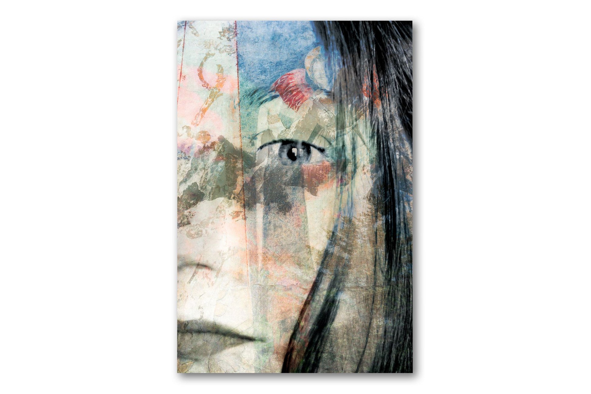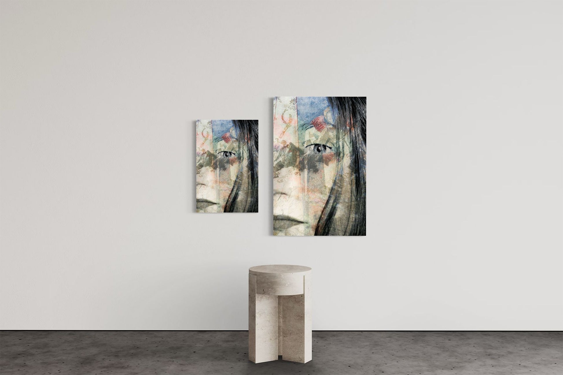 In Mirror, Charlotte Fonne creates a self-portrait through her layered photographic technique. Each element of the artwork is carefully selected to represent fragments of her life and environment from the time she lived in France. The fusion of her portrait with elements of the French Alps where she grew up, including snow-covered mountains, rocky peaks, fir trees, hints of color from flowers, and a painted angel close to her heart, reflects her origins. This fine art photography print brings memories of a past time to the surface, shaping the expression of her face.