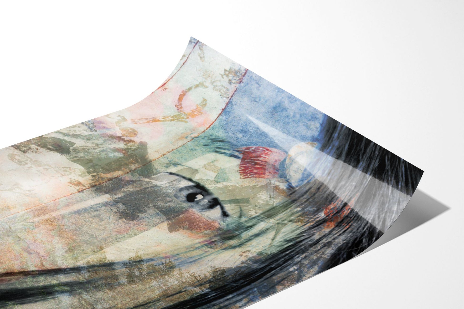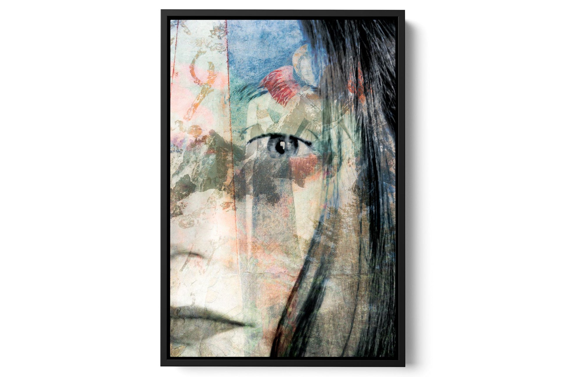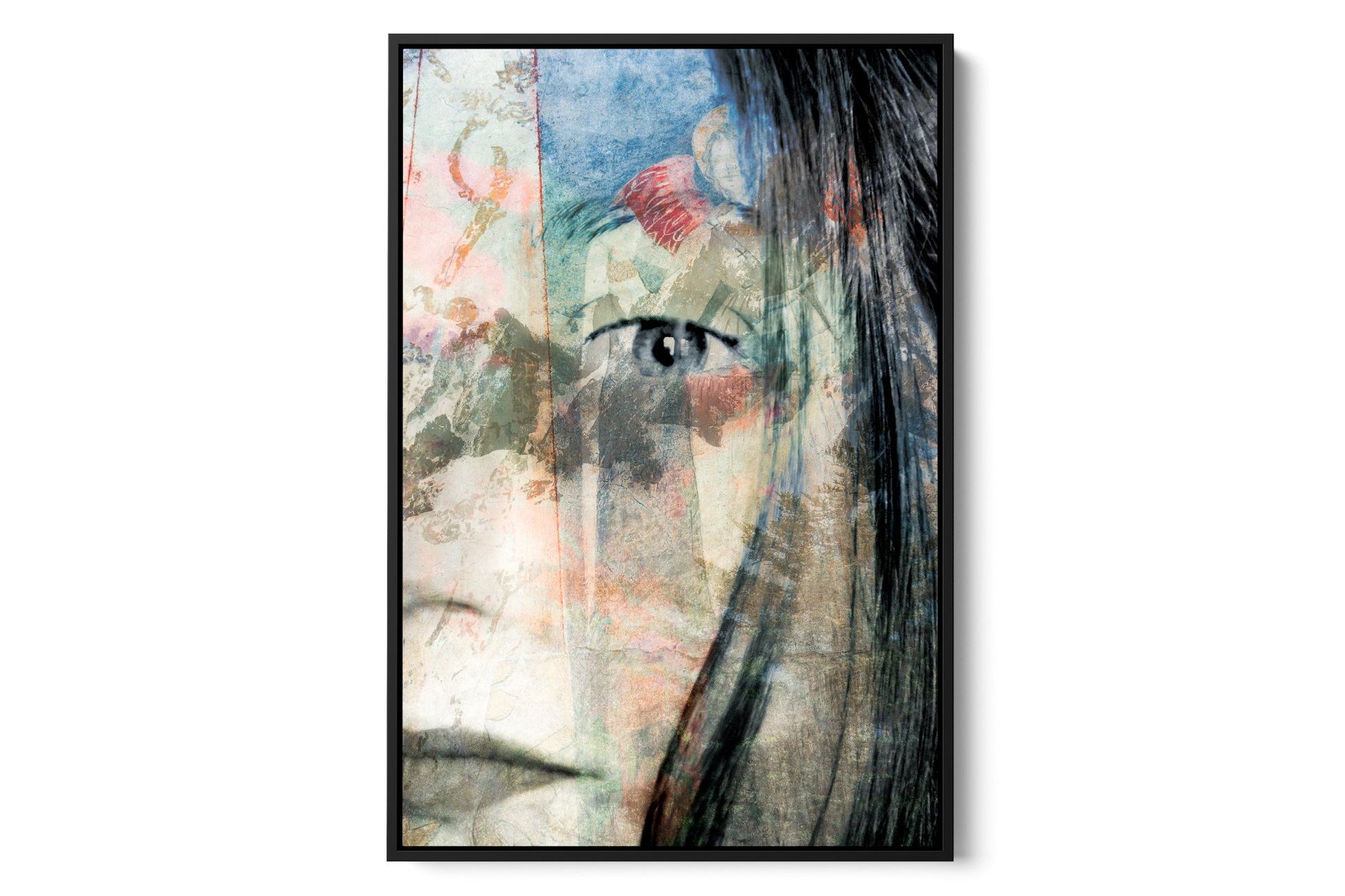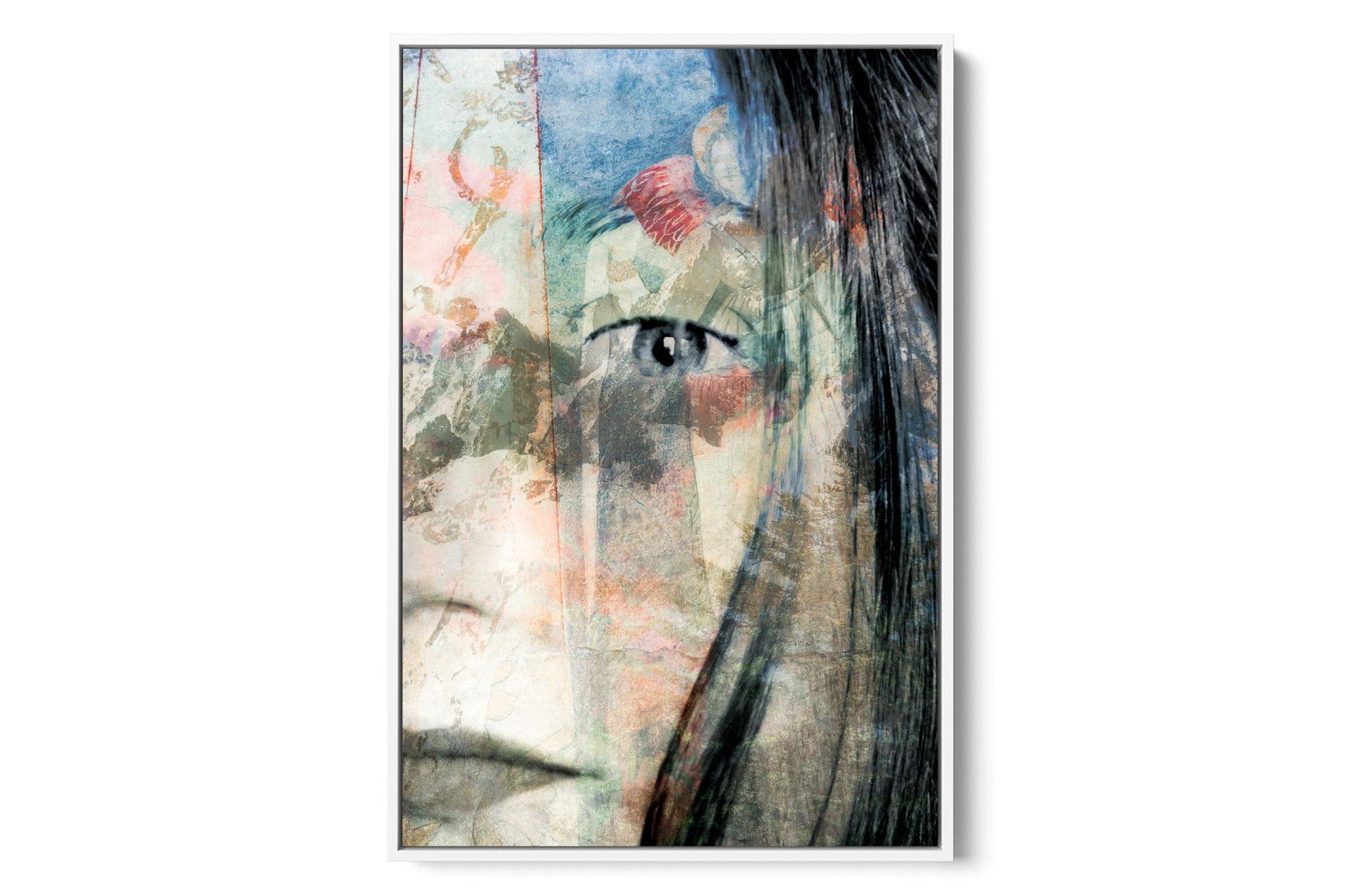 In Mirror, Charlotte Fonne creates a self-portrait through her layered photographic technique. Each element of the artwork is carefully selected to represent fragments of her life and environment from the time she lived in France. The fusion of her portrait with elements of the French Alps where she grew up, including snow-covered mountains, rocky peaks, fir trees, hints of color from flowers, and a painted angel close to her heart, reflects her origins. This fine art photography print brings memories of a past time to the surface, shaping the expression of her face.