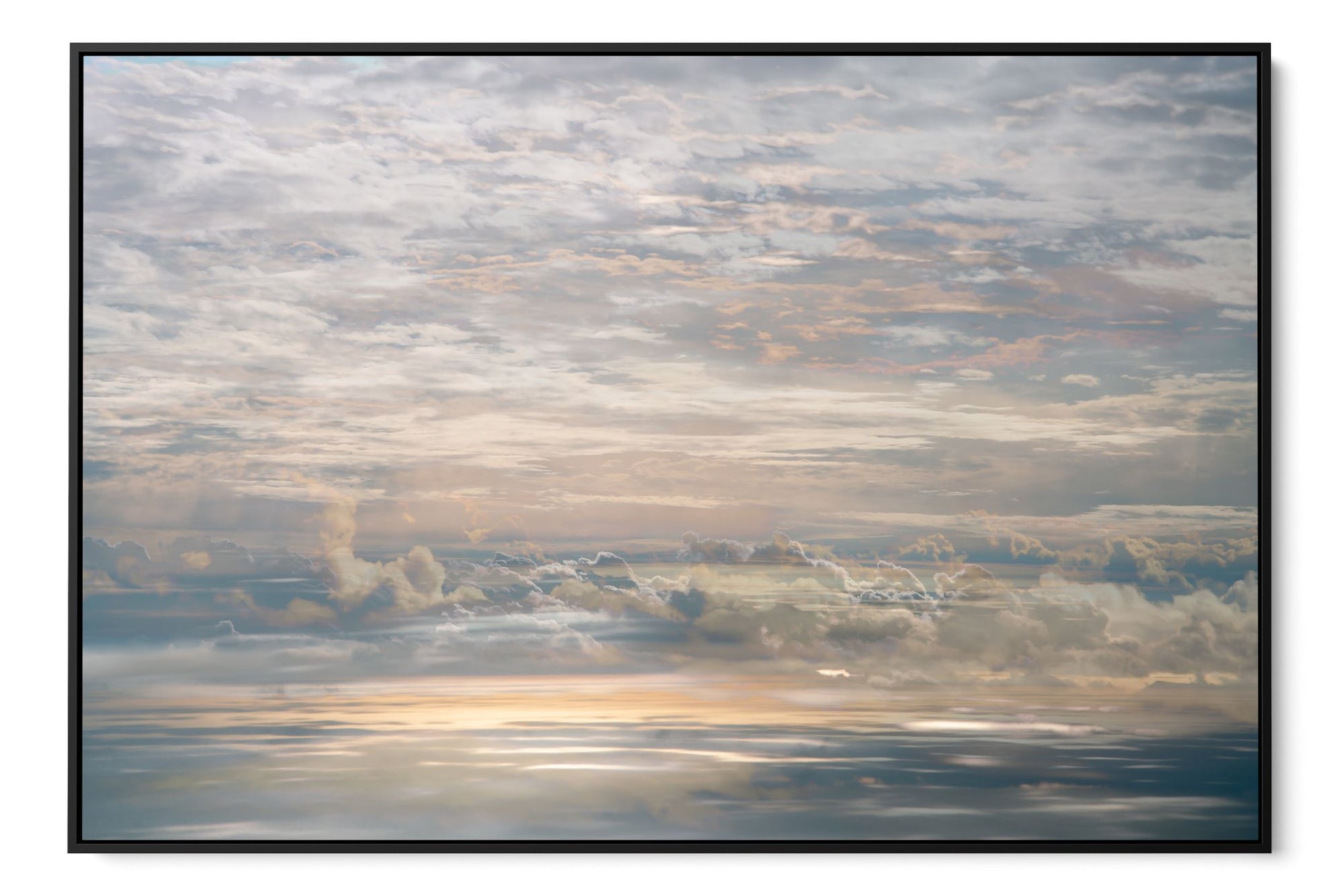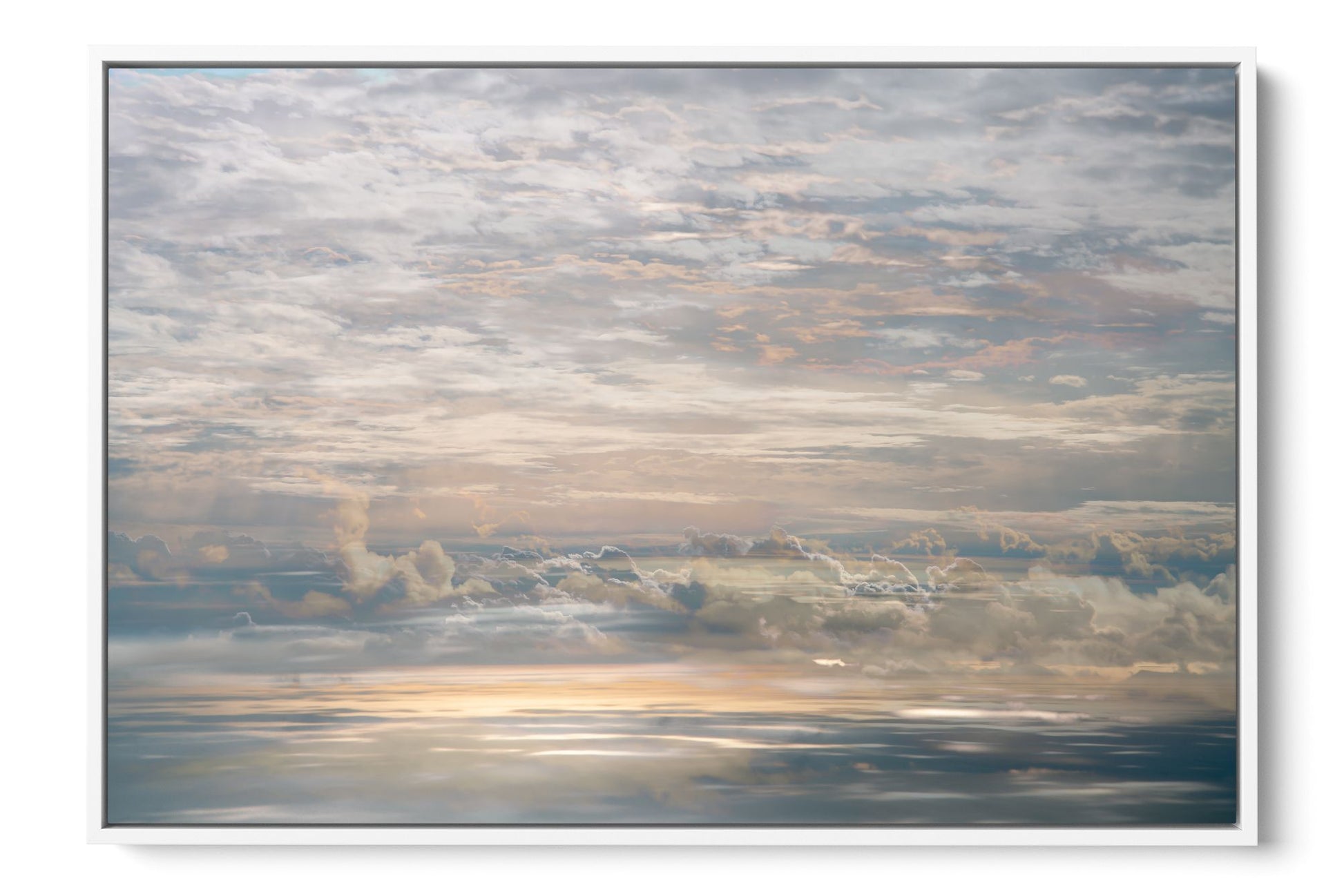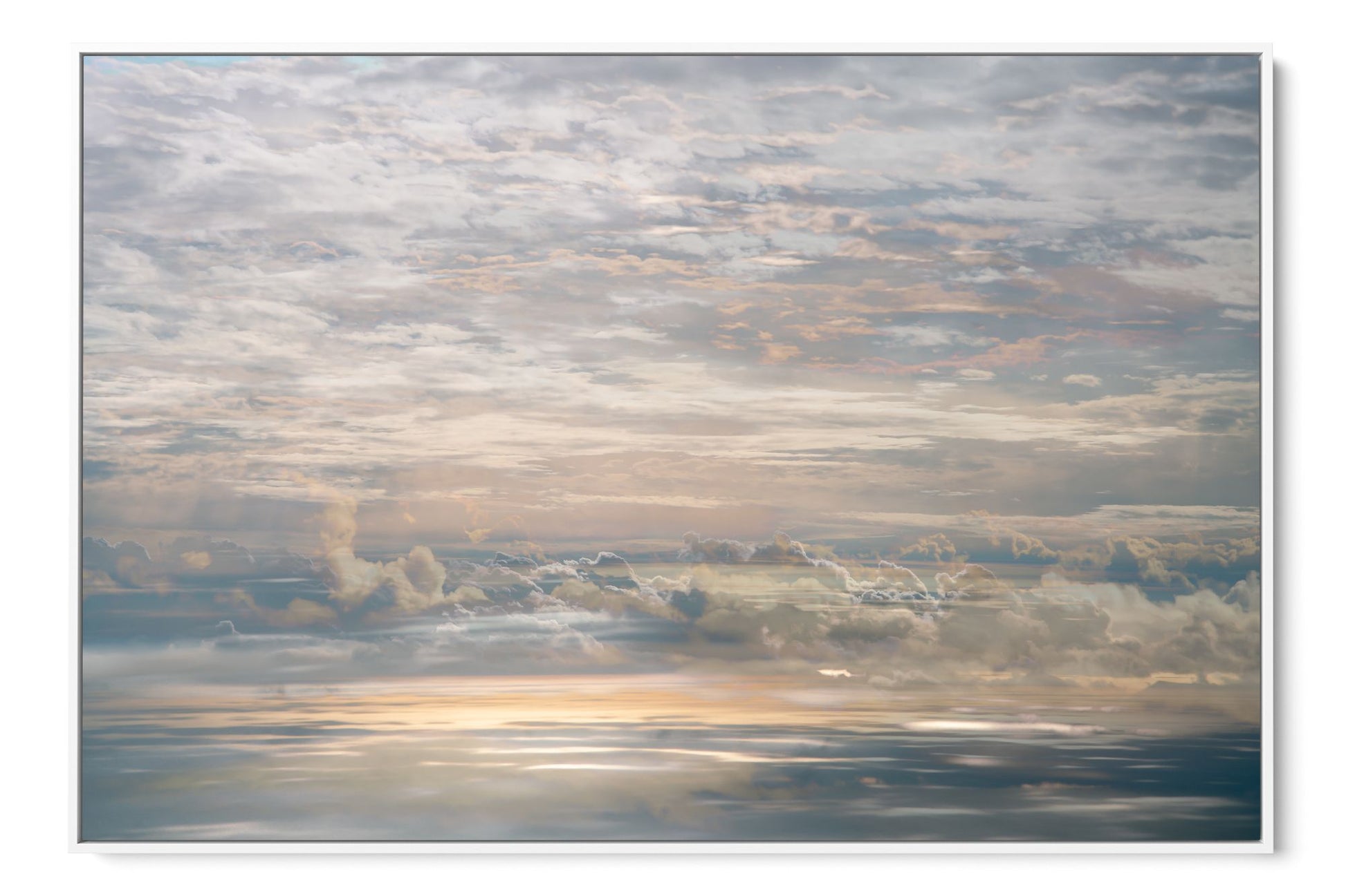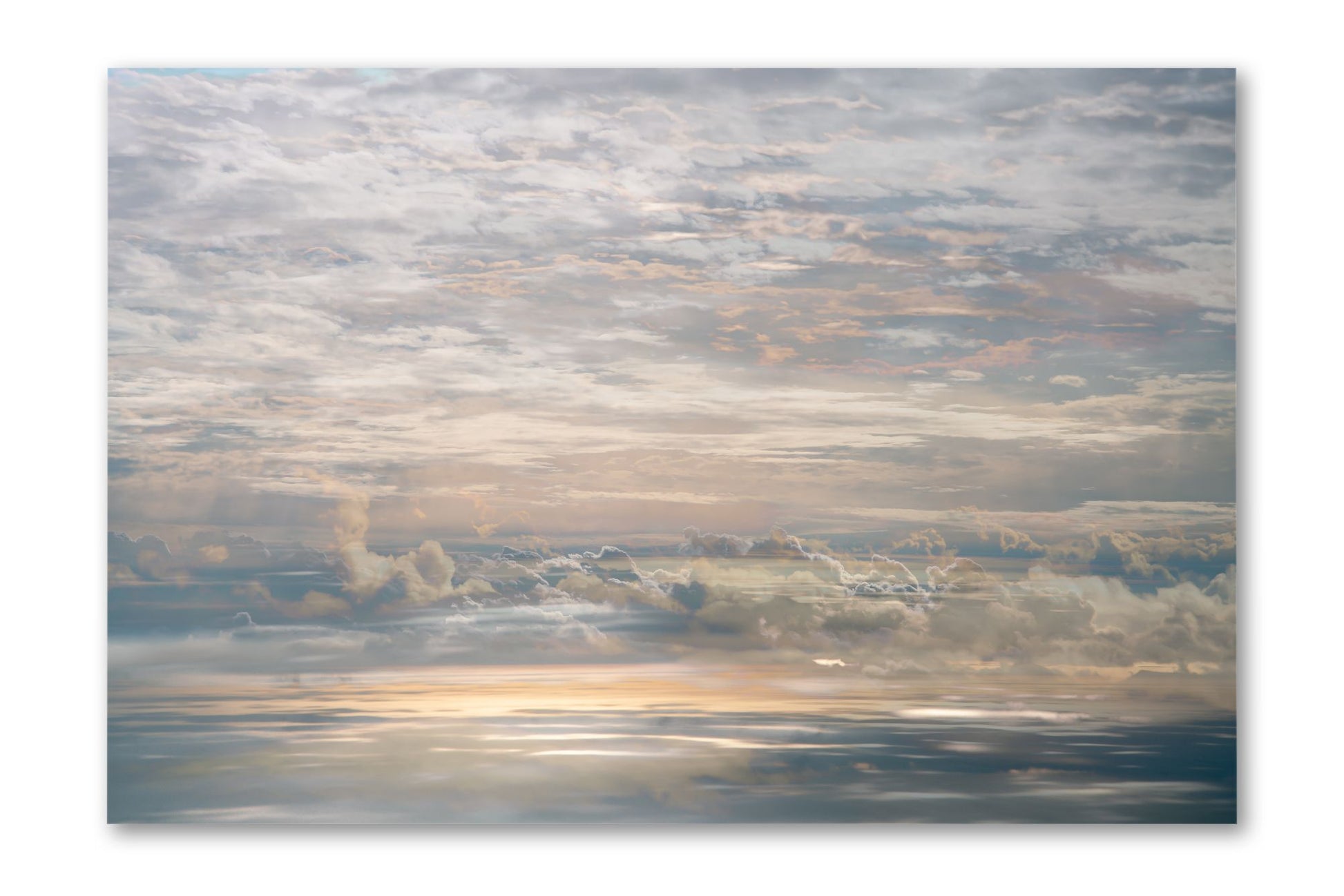 In On High, Charlotte Fonne creates an artwork capturing the tranquil cloudy sky seen from an airplane through her layered photographic technique. From the fusion of images, recurring motifs emerge with horizontal lines from the clouds to form a visual rhythm. Gradient palettes shifting from blue to pink to yellow and contrasts with blurred edges and reflections of sunlight, offer a dreamlike interpretation. This skyscape fine art photography print reflects serenity, peace, and the quiet intensity of life in a state of stillness.
