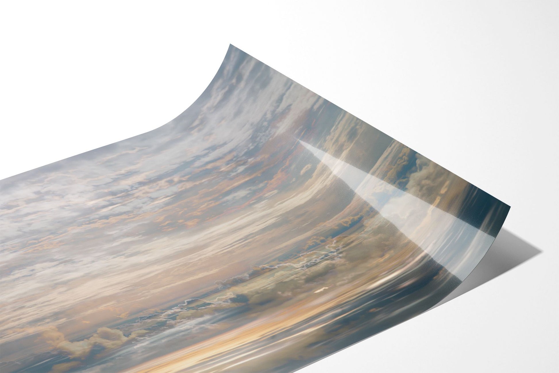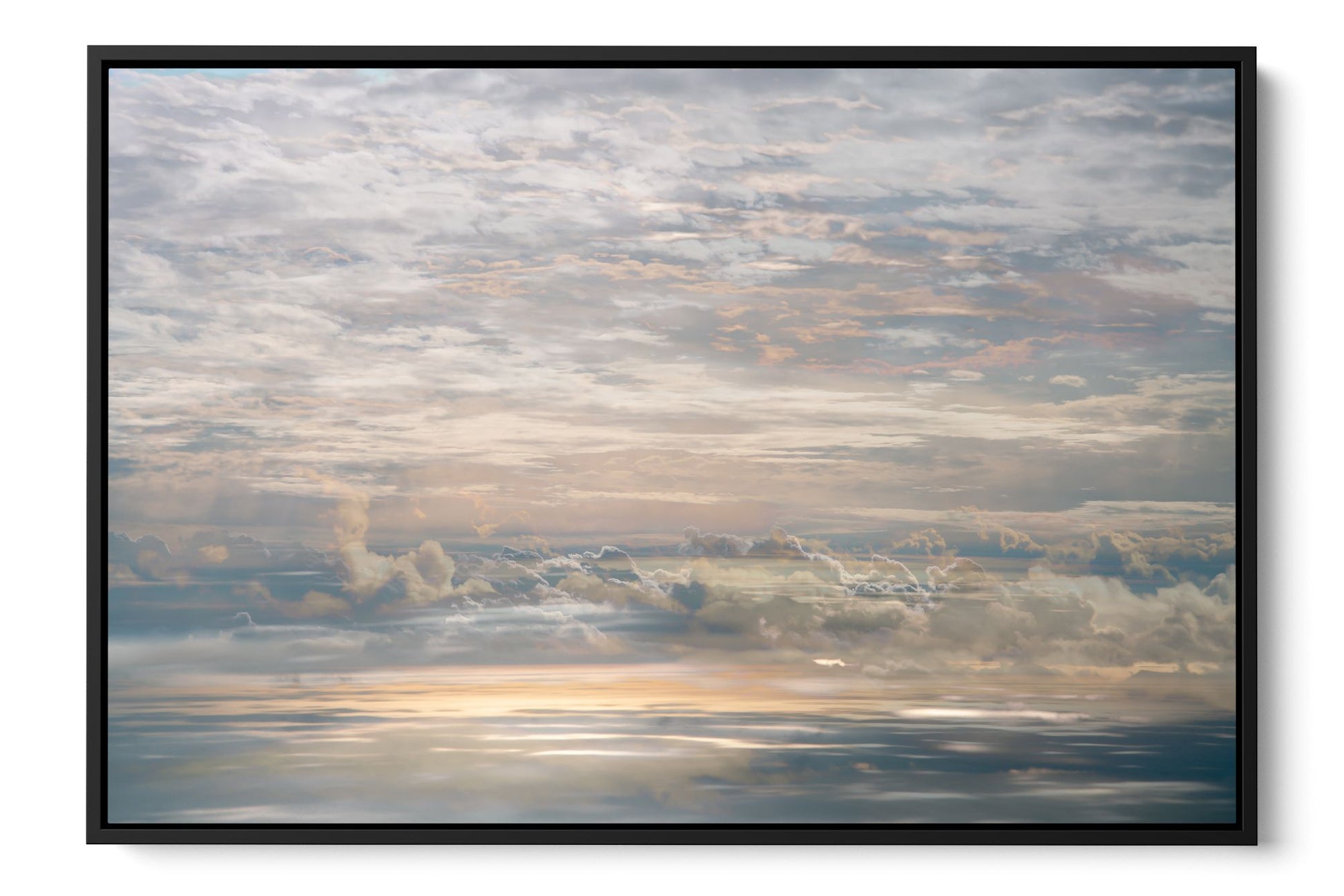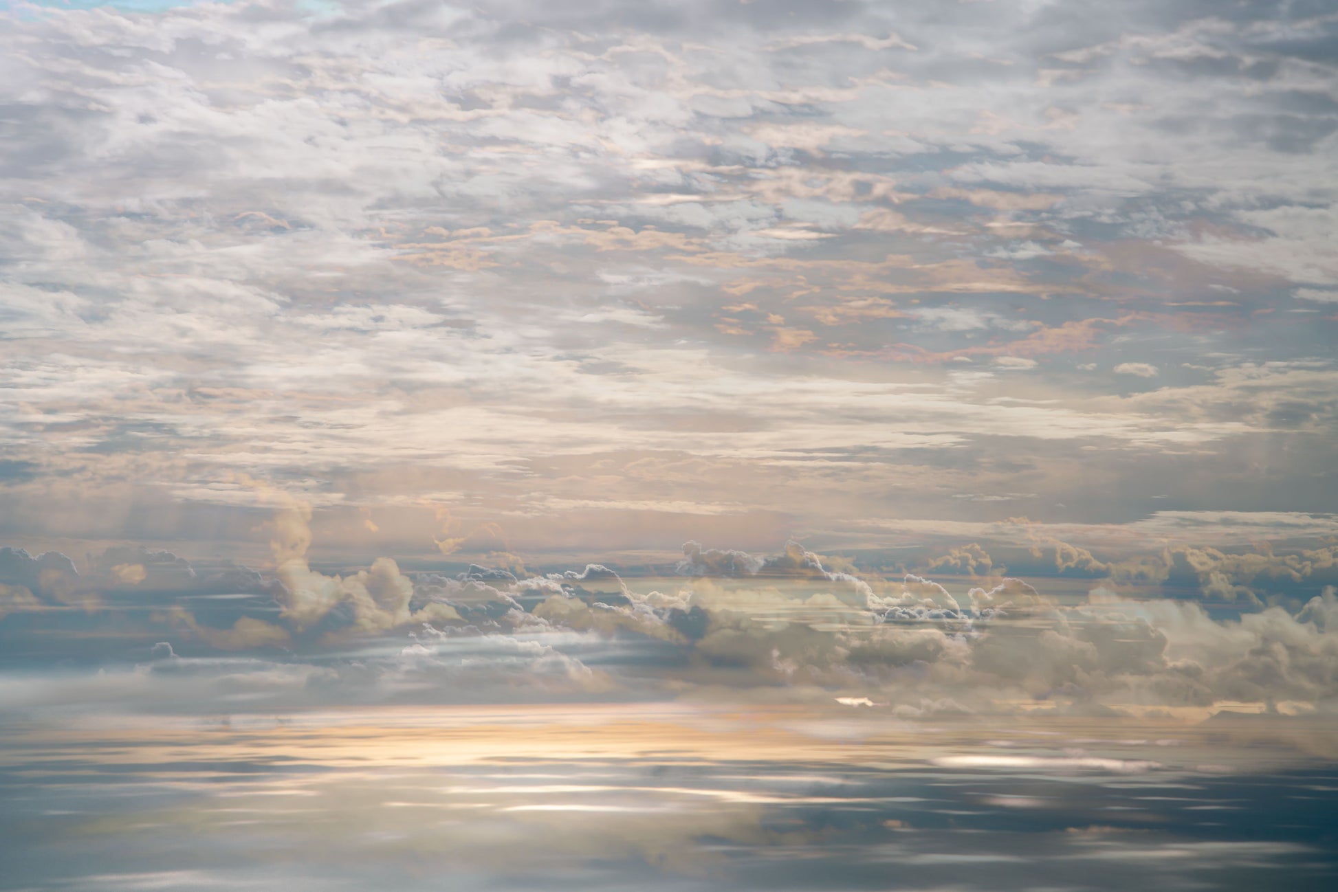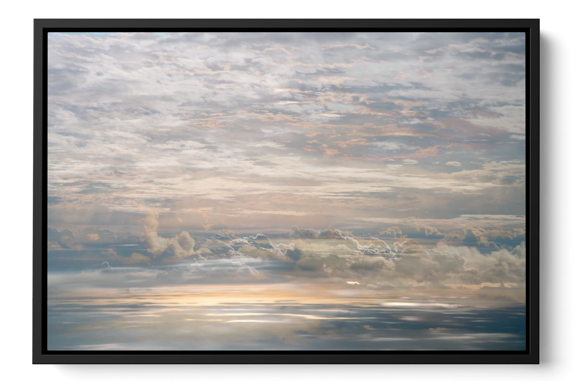 In On High, Charlotte Fonne creates an artwork capturing the tranquil cloudy sky seen from an airplane through her layered photographic technique. From the fusion of images, recurring motifs emerge with horizontal lines from the clouds to form a visual rhythm. Gradient palettes shifting from blue to pink to yellow and contrasts with blurred edges and reflections of sunlight, offer a dreamlike interpretation. This skyscape fine art photography print reflects serenity, peace, and the quiet intensity of life in a state of stillness.
