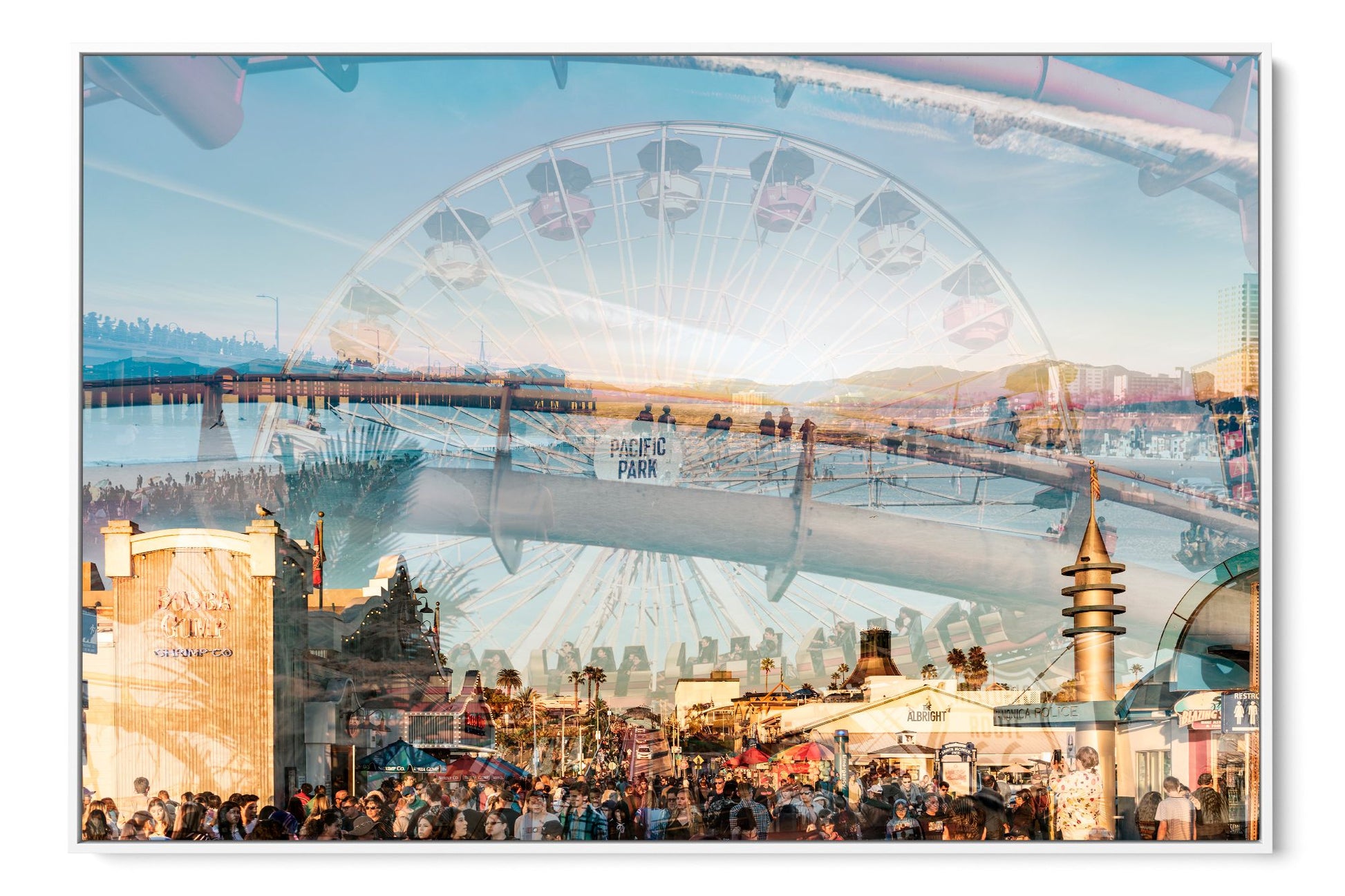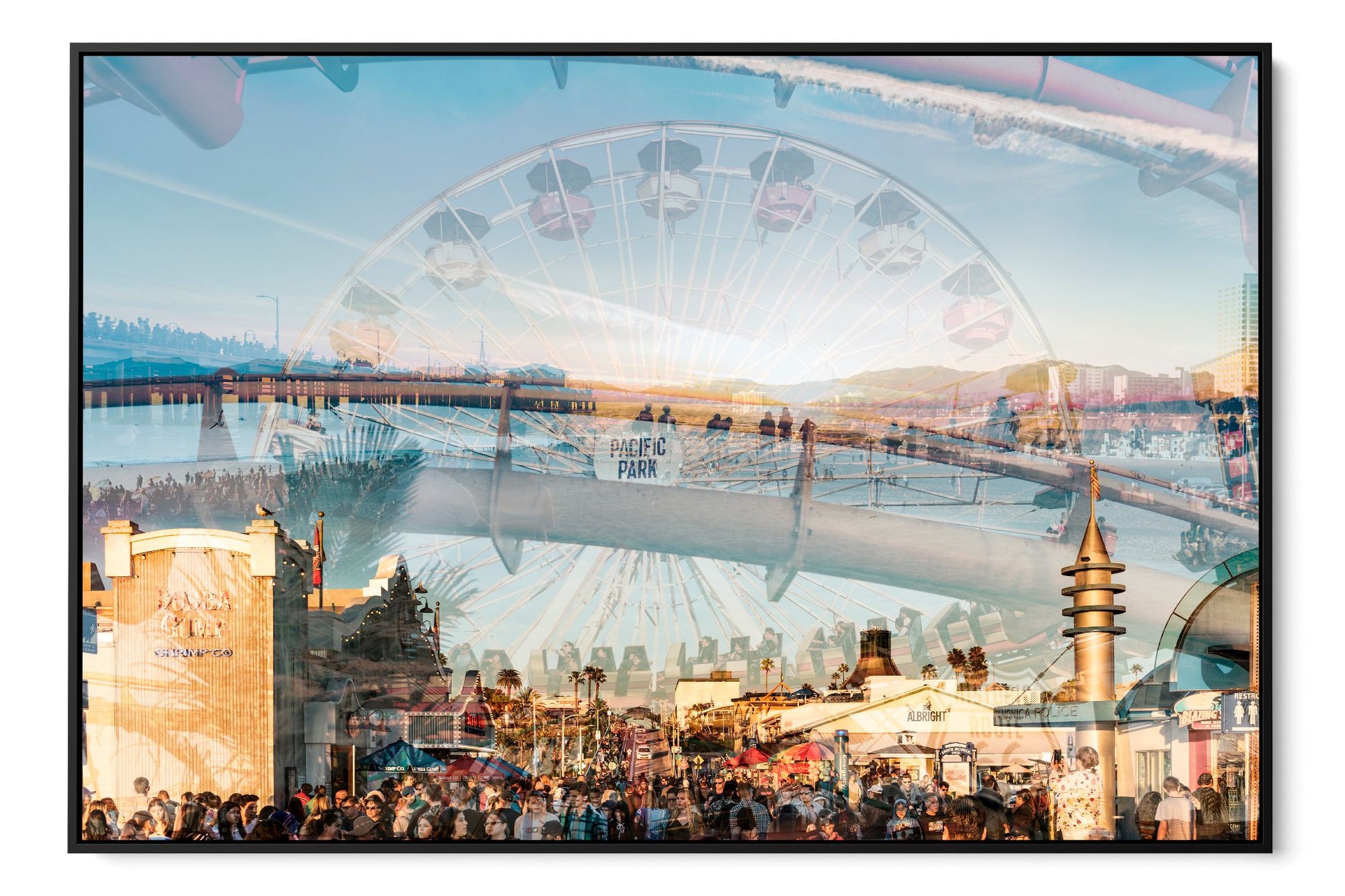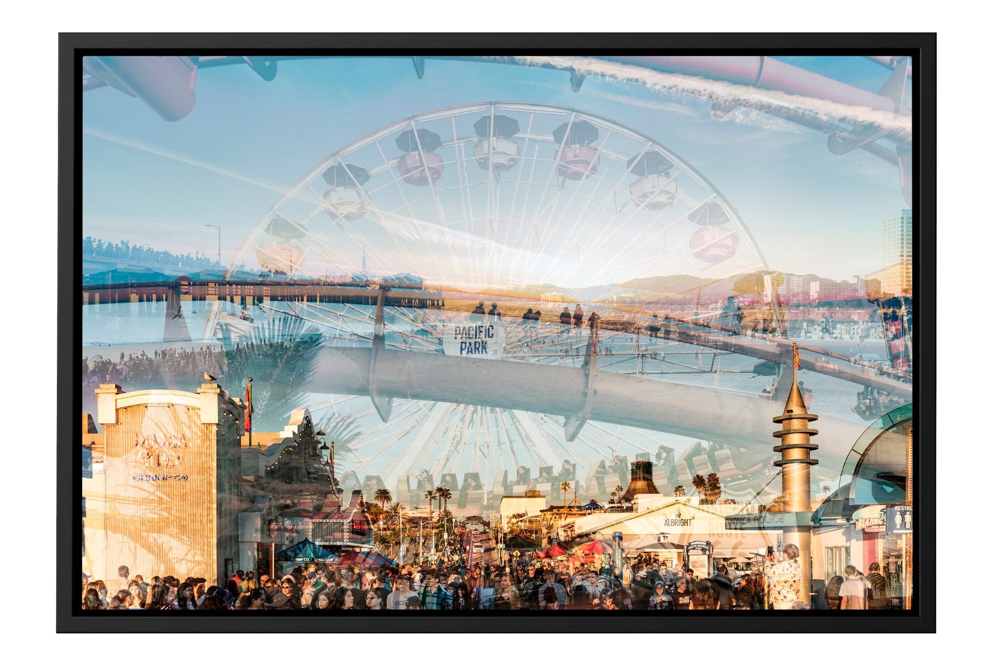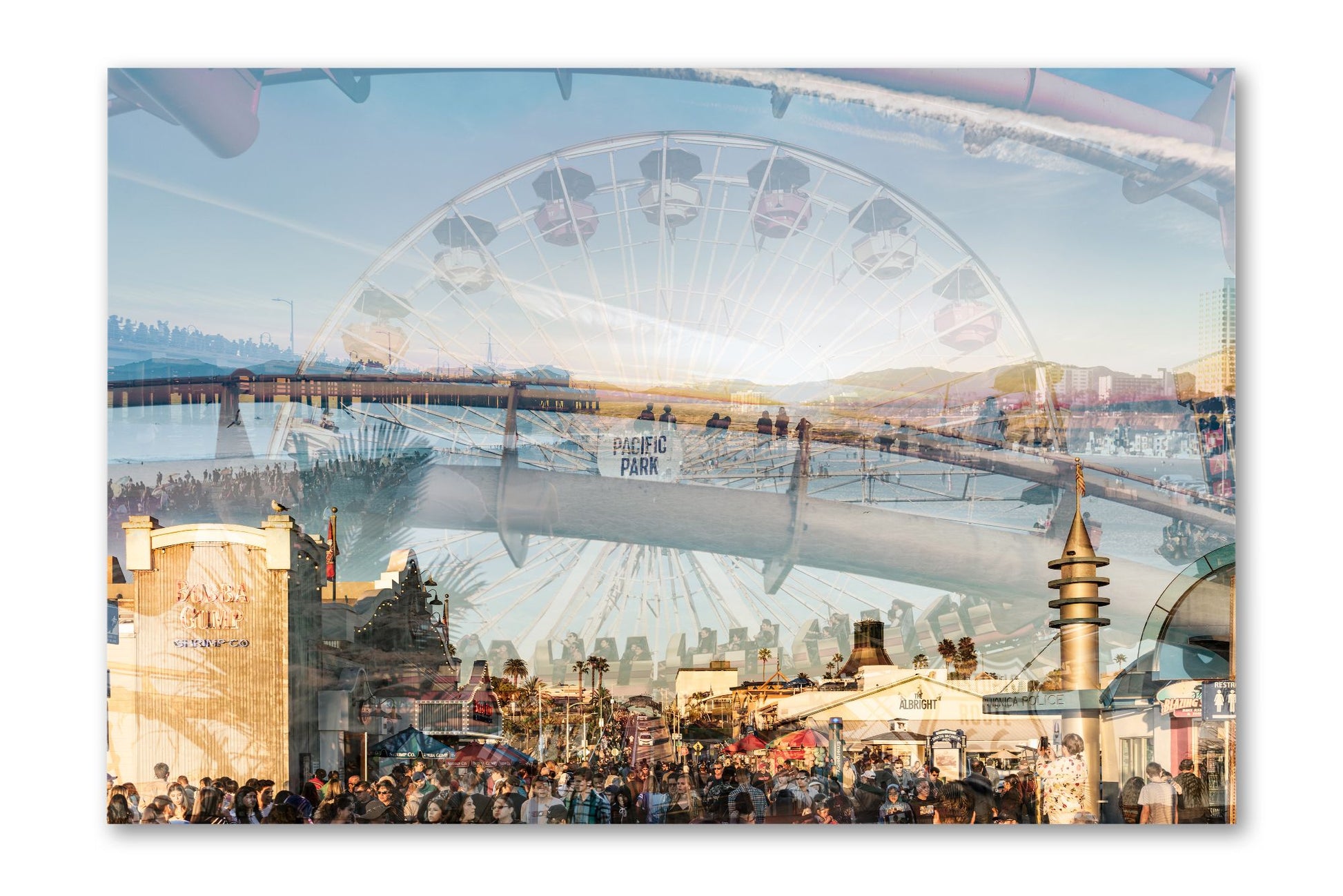 In Pacific Park, Charlotte Fonne captures the essence of Santa Monica, California, through her layered photographic technique, blending reality and memory. The artwork reflects the flow of people along Colorado Avenue and the Santa Monica Pier, moving among landmarks such as Bubba Gump Shrimp Co., the Police Station, and Pacific Park. The Ferris wheel and West Coaster add playful energy, while couples are walking hand in hand, friends are laughing, and families are making memories in the warm sand under the golden light of the sunset. This fine art photography print reinterprets Santa Monica as an emotional landscape where golden hour light, human moments, and coastal charm intertwine.
