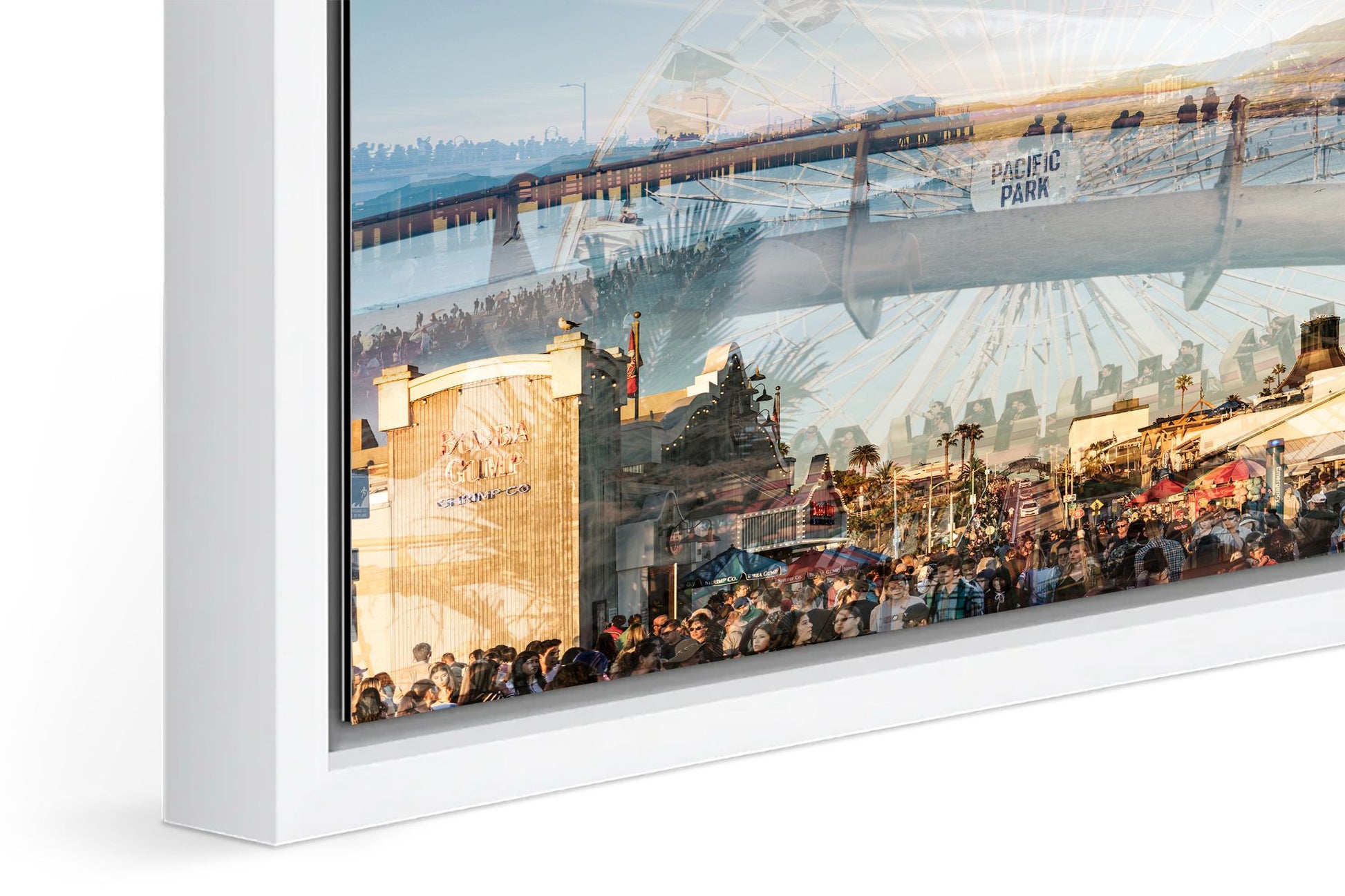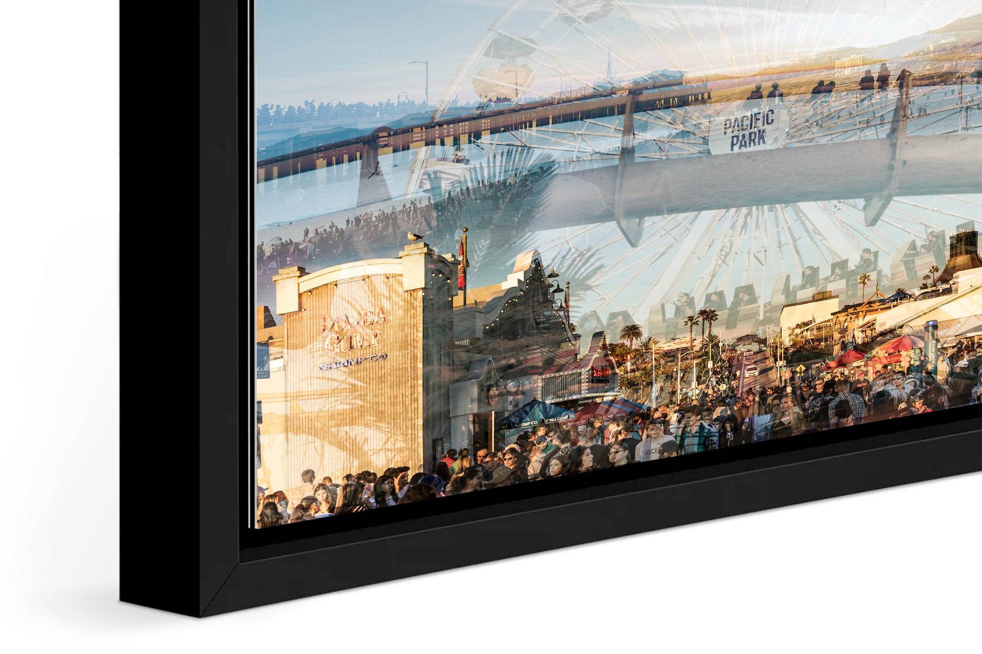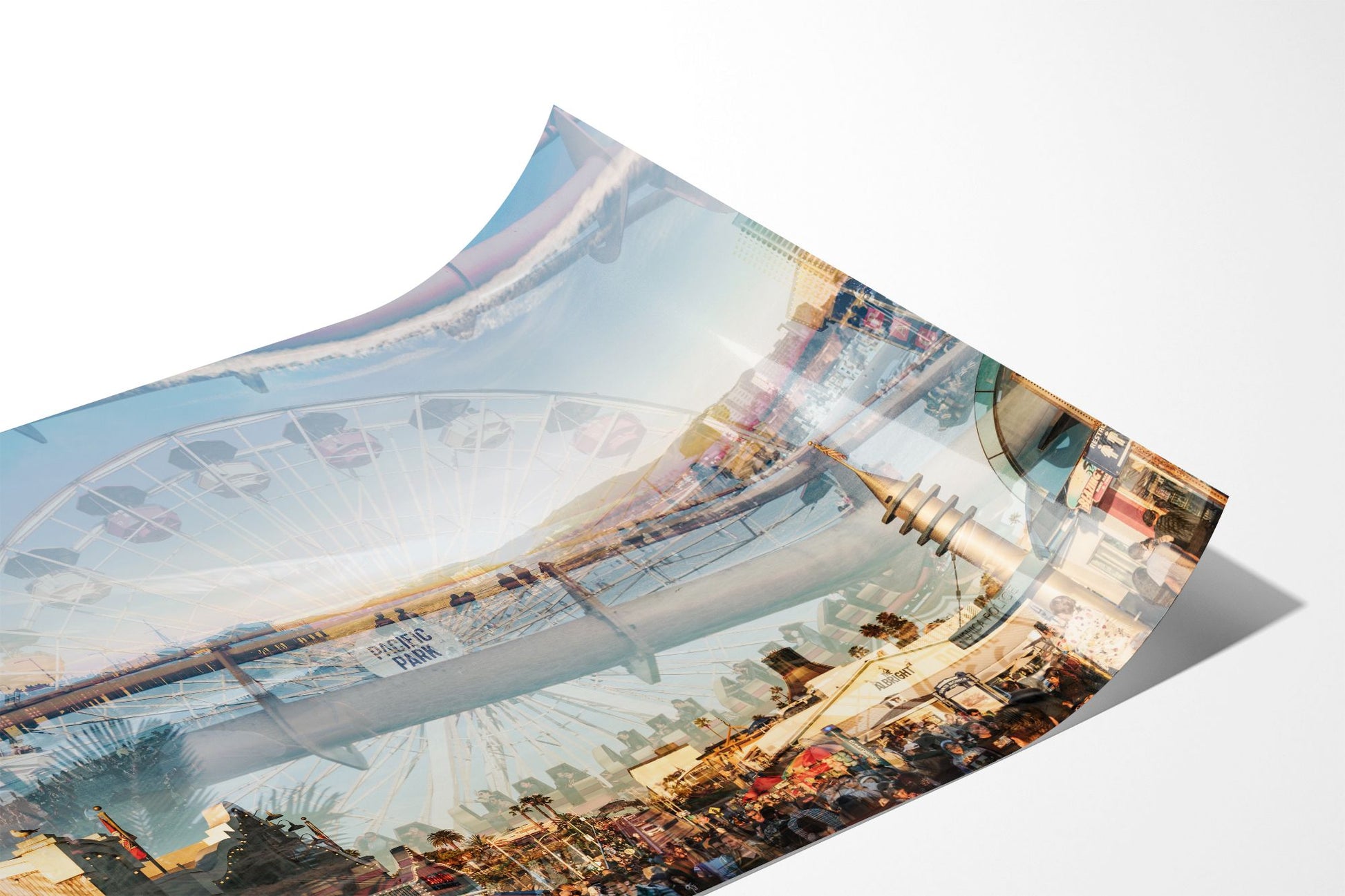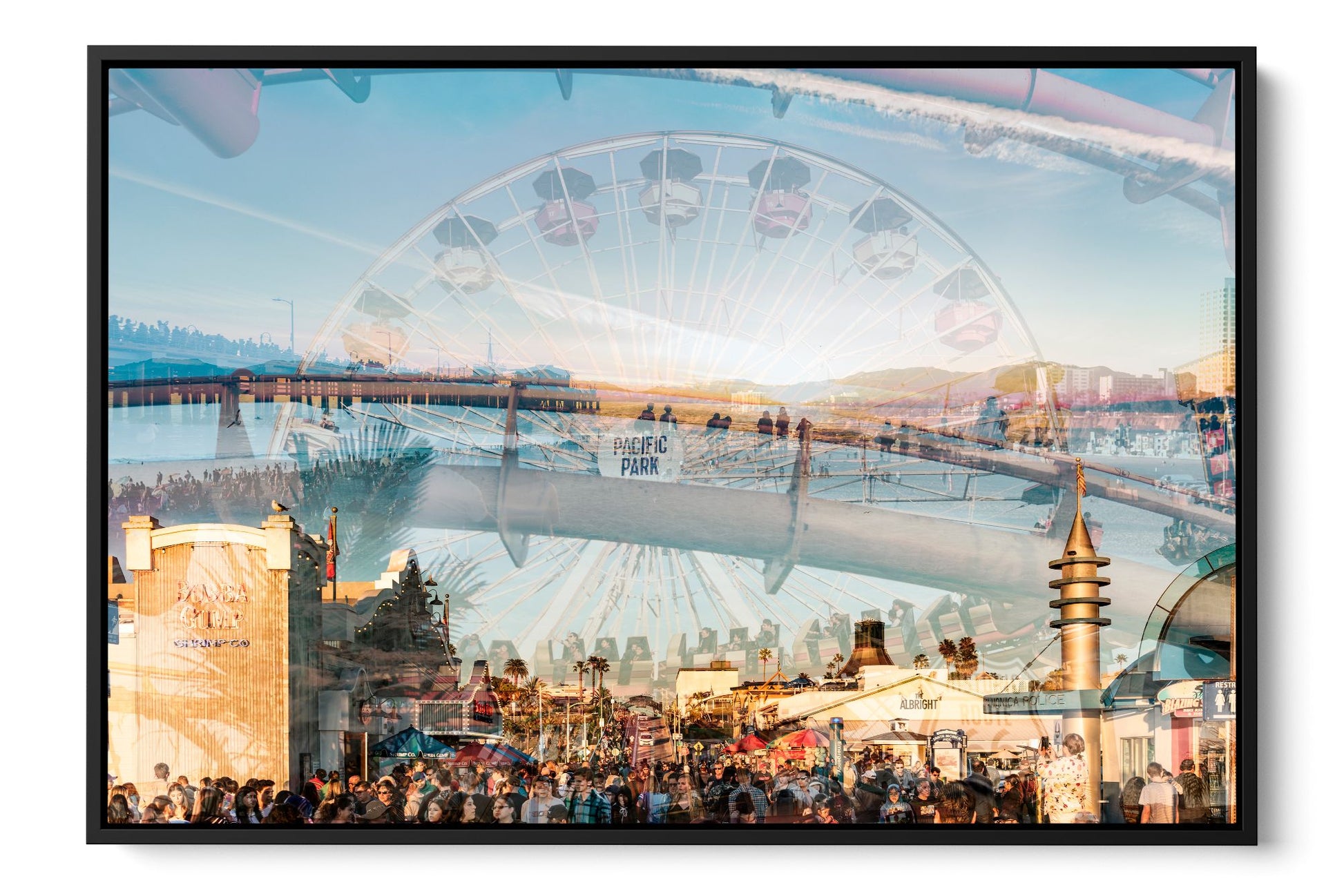 In Pacific Park, Charlotte Fonne captures the essence of Santa Monica, California, through her layered photographic technique, blending reality and memory. The artwork reflects the flow of people along Colorado Avenue and the Santa Monica Pier, moving among landmarks such as Bubba Gump Shrimp Co., the Police Station, and Pacific Park. The Ferris wheel and West Coaster add playful energy, while couples are walking hand in hand, friends are laughing, and families are making memories in the warm sand under the golden light of the sunset. This fine art photography print reinterprets Santa Monica as an emotional landscape where golden hour light, human moments, and coastal charm intertwine.