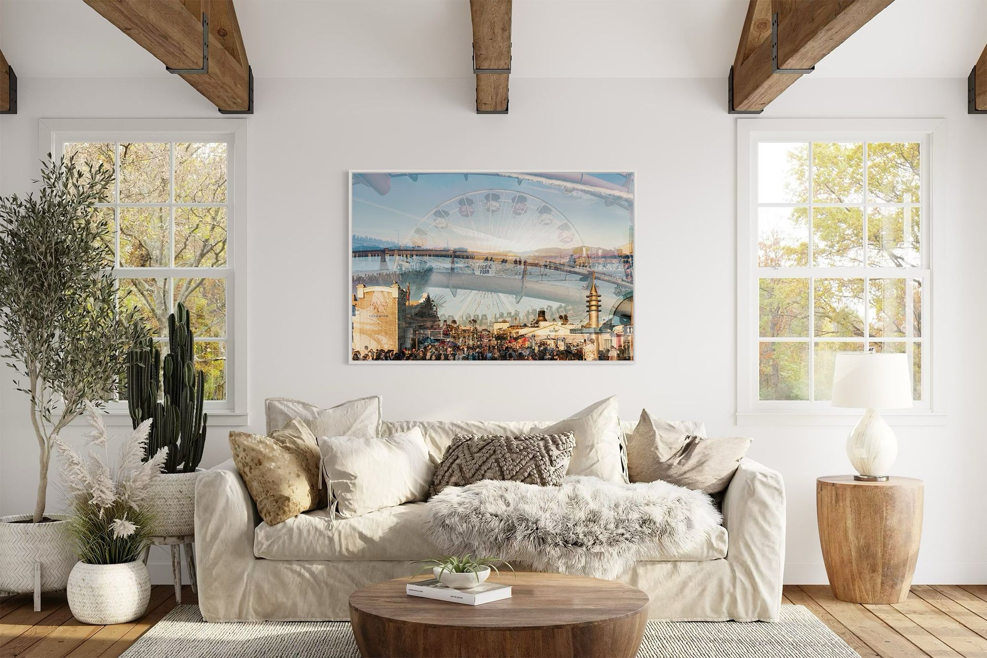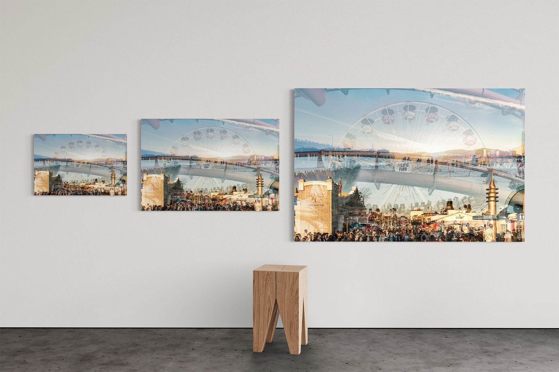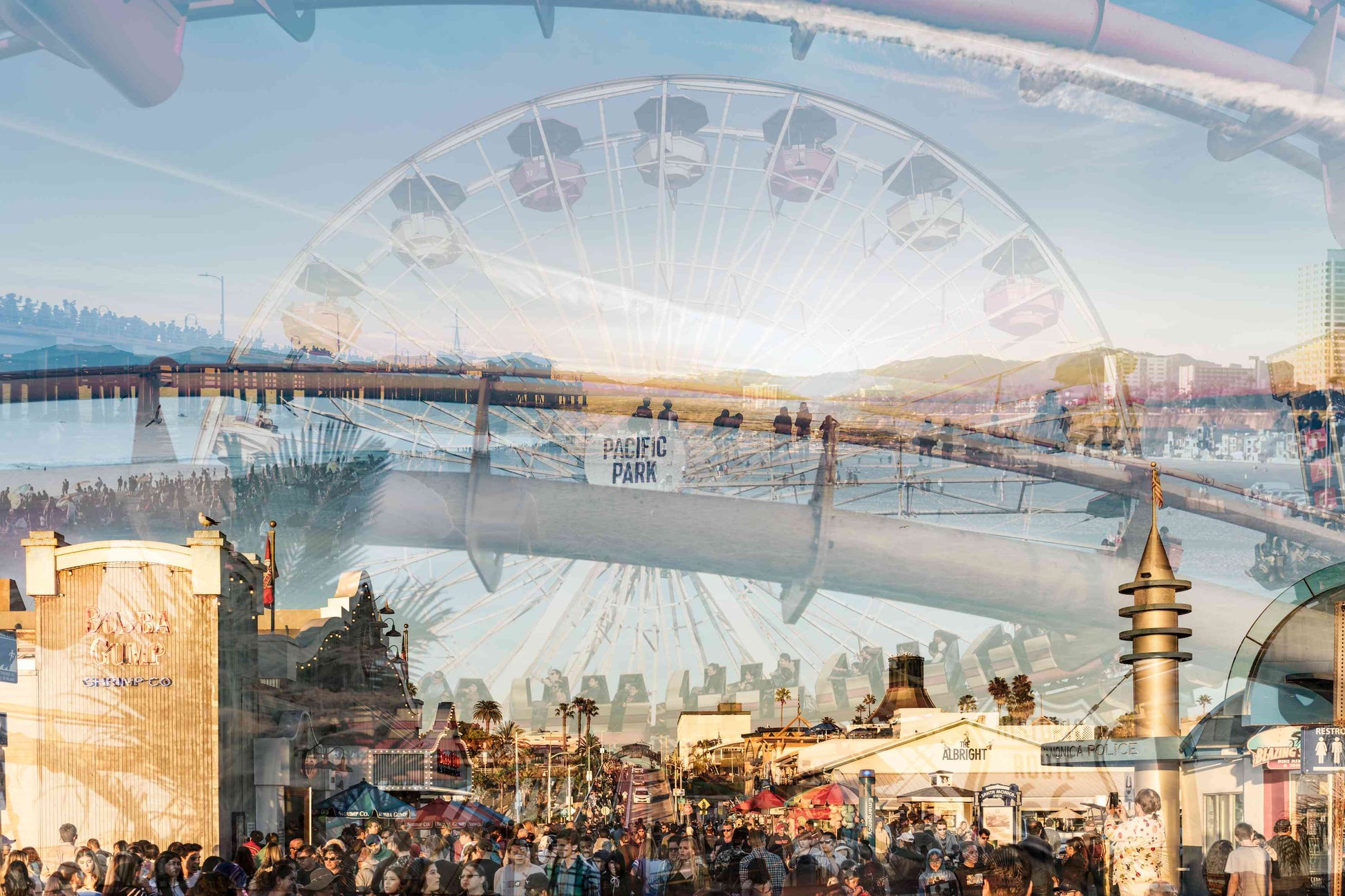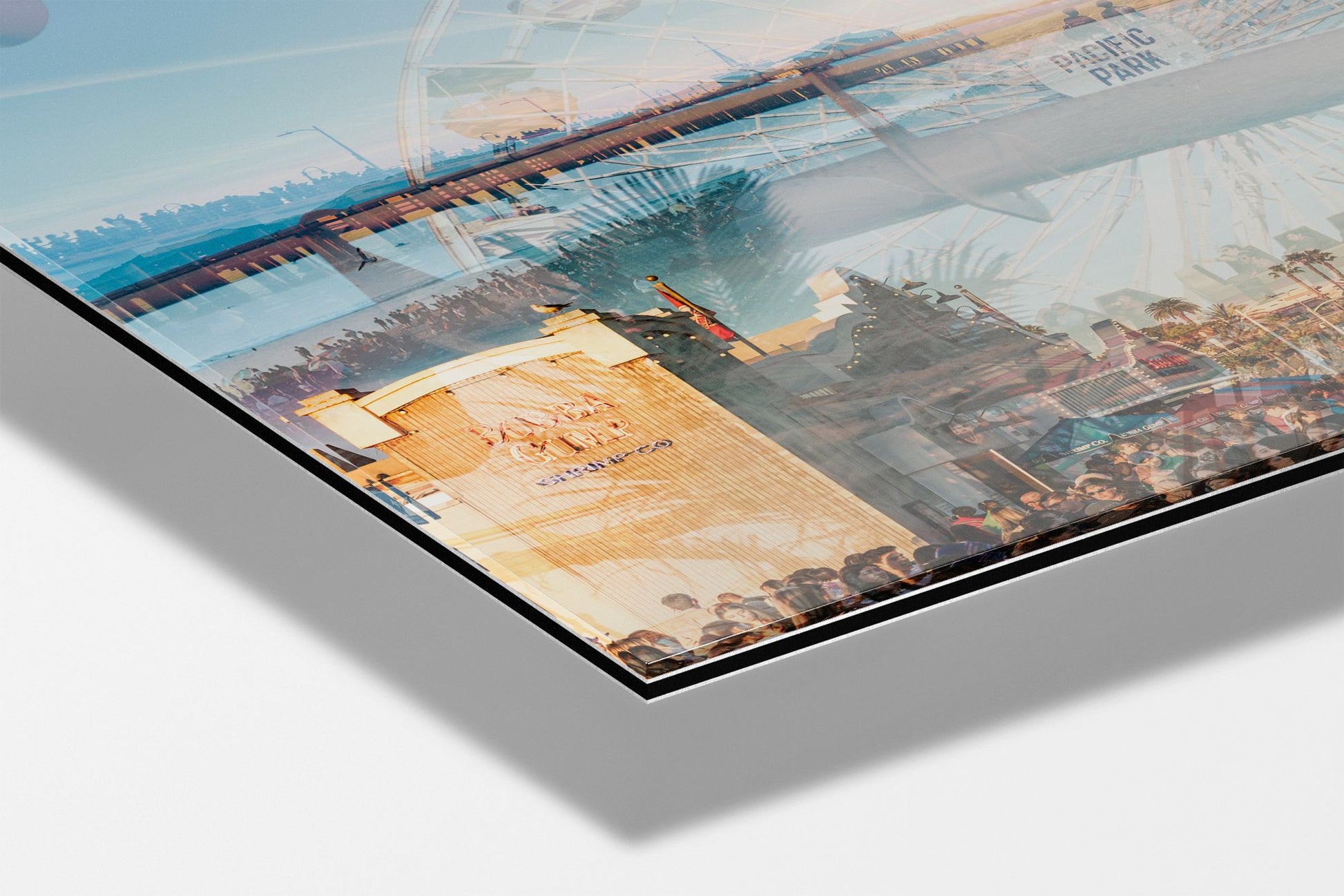 In Pacific Park, Charlotte Fonne captures the essence of Santa Monica, California, through her layered photographic technique, blending reality and memory. The artwork reflects the flow of people along Colorado Avenue and the Santa Monica Pier, moving among landmarks such as Bubba Gump Shrimp Co., the Police Station, and Pacific Park. The Ferris wheel and West Coaster add playful energy, while couples are walking hand in hand, friends are laughing, and families are making memories in the warm sand under the golden light of the sunset. This fine art photography print reinterprets Santa Monica as an emotional landscape where golden hour light, human moments, and coastal charm intertwine.