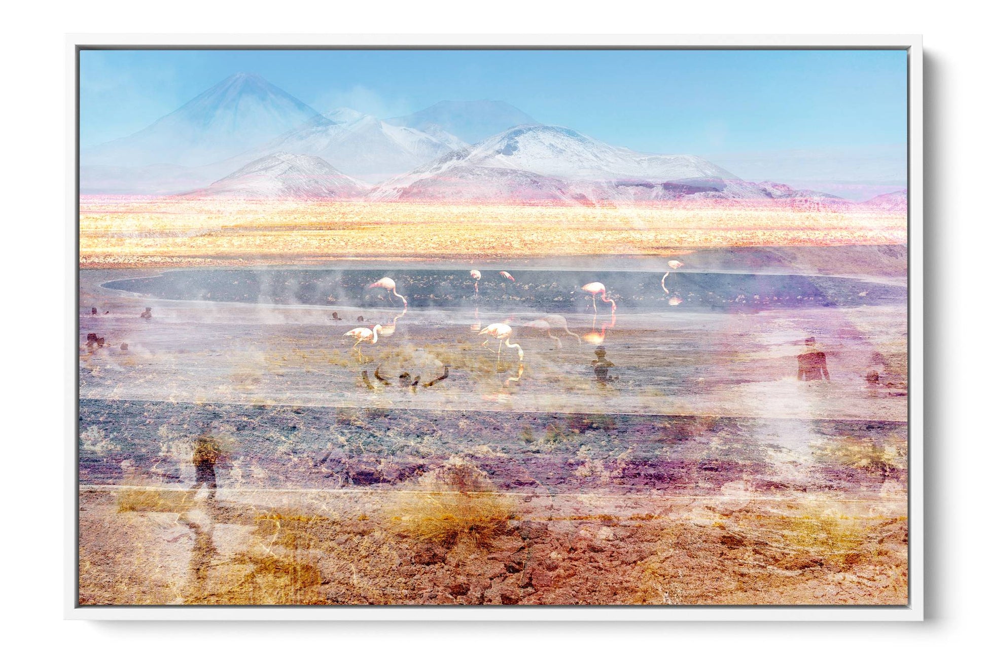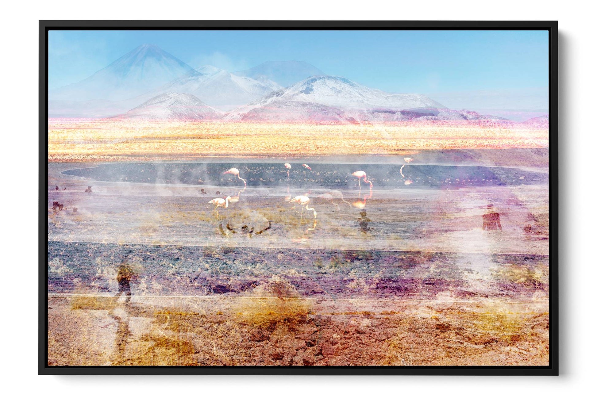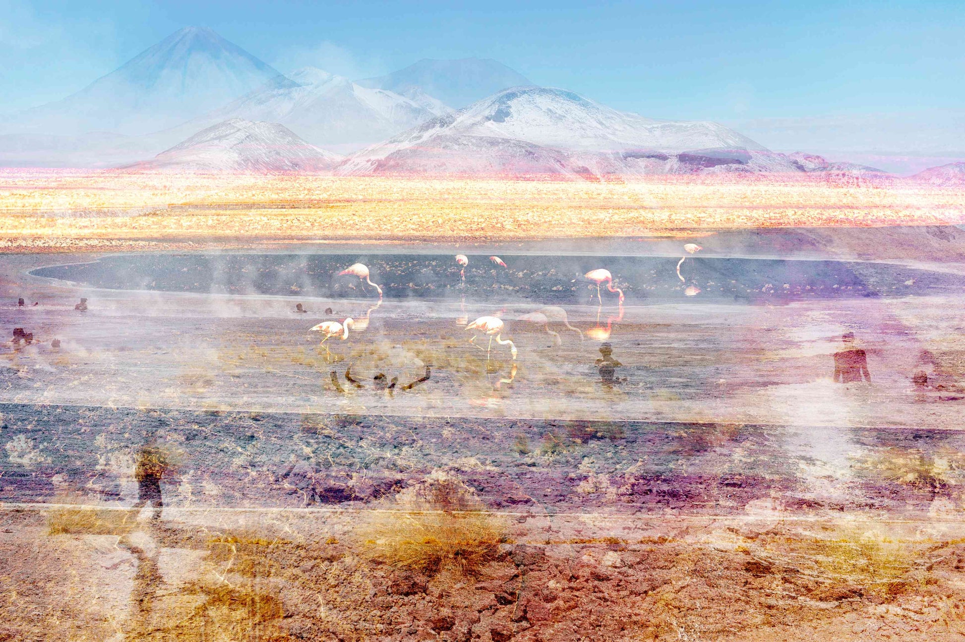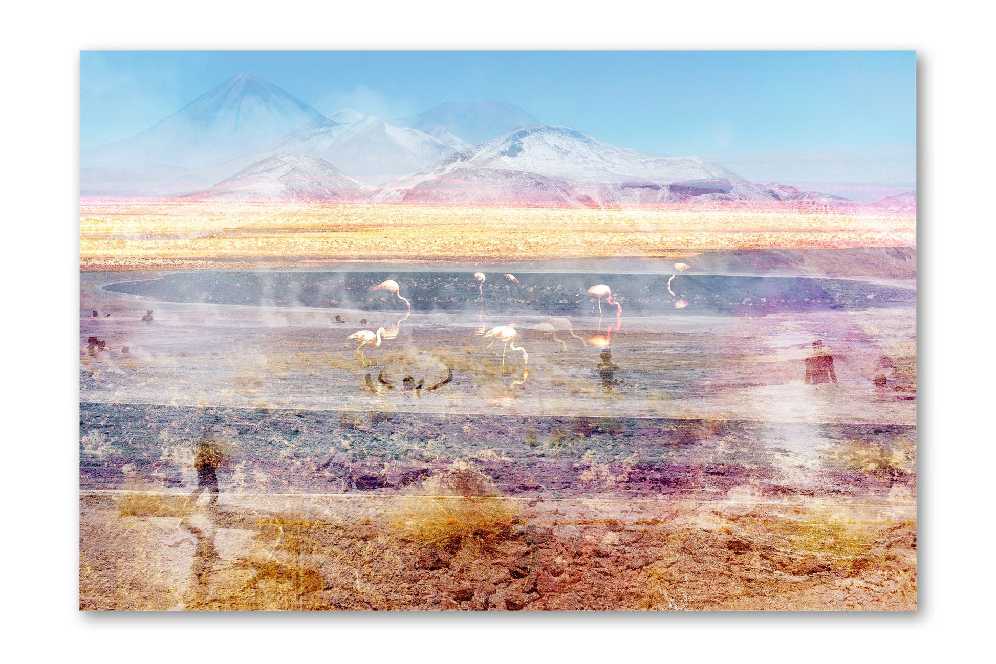 In Pink Atacama, Charlotte Fonne captures the stillness and subtle intensity of Chile’s Atacama Desert through her layered photographic technique, blending reality and memory. This fine art photography print reflects her experience of lagoons and volcanoes tinted with shades of pink and purple beneath an azure sky. Iconic landmarks appear throughout: flamingos gathering at Lagunas Cejar and Chaxa, visitors floating in the mineral-rich Laguna Piedra, the vast salt flats of Laguna Tebinquinche, and the serene Lagunas Miscanti and Miñiques at the base of the Miscanti volcano. Rising steam from the Geysers del Tatio adds movement, while subtle layering evokes the unity of humans, wildlife, and nature in this unique region.