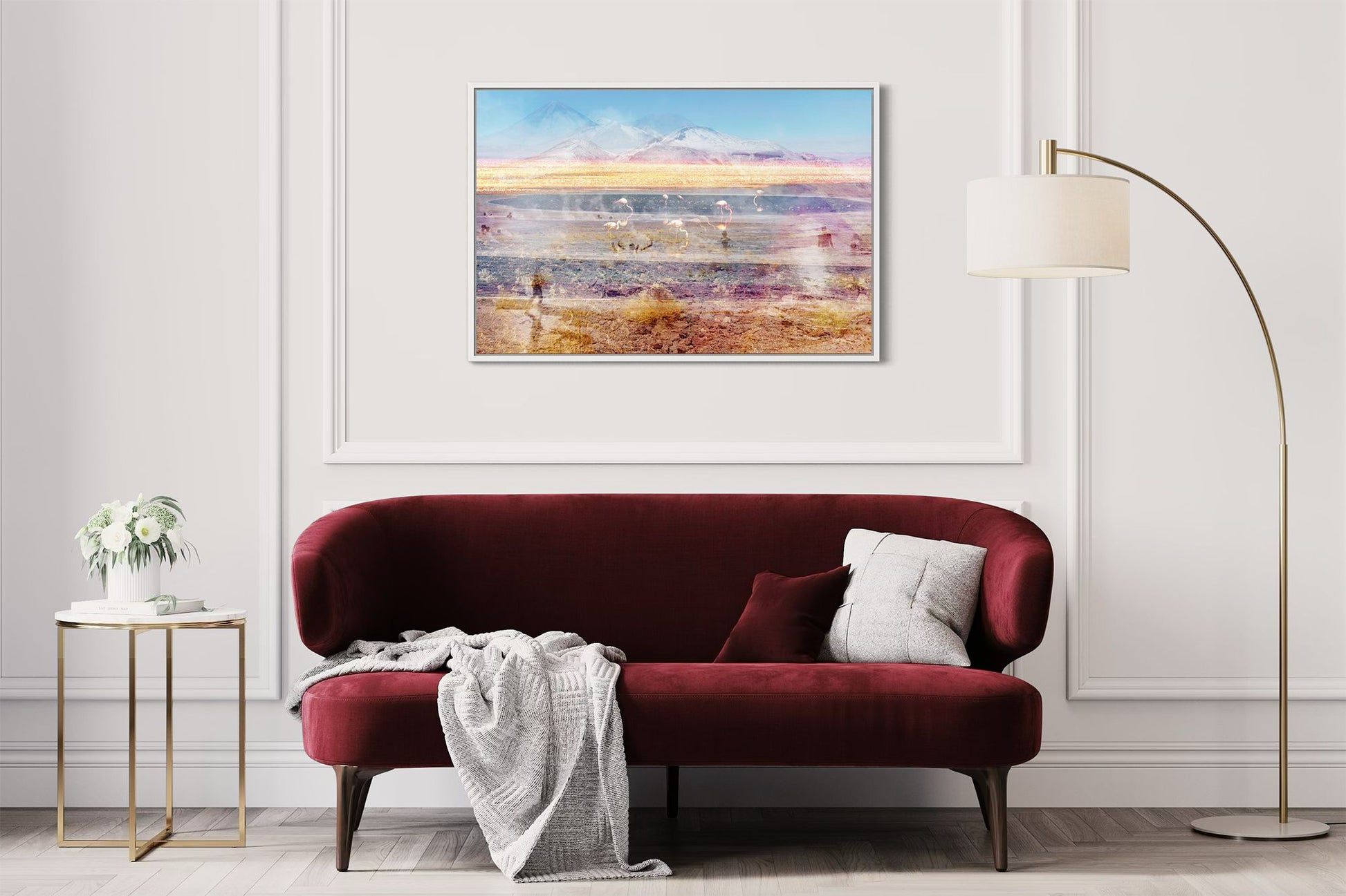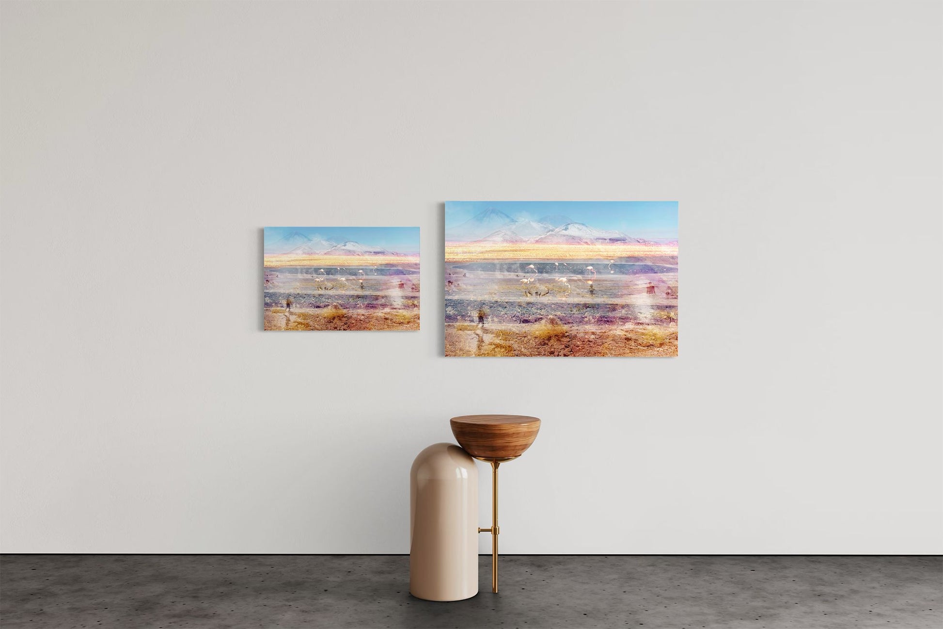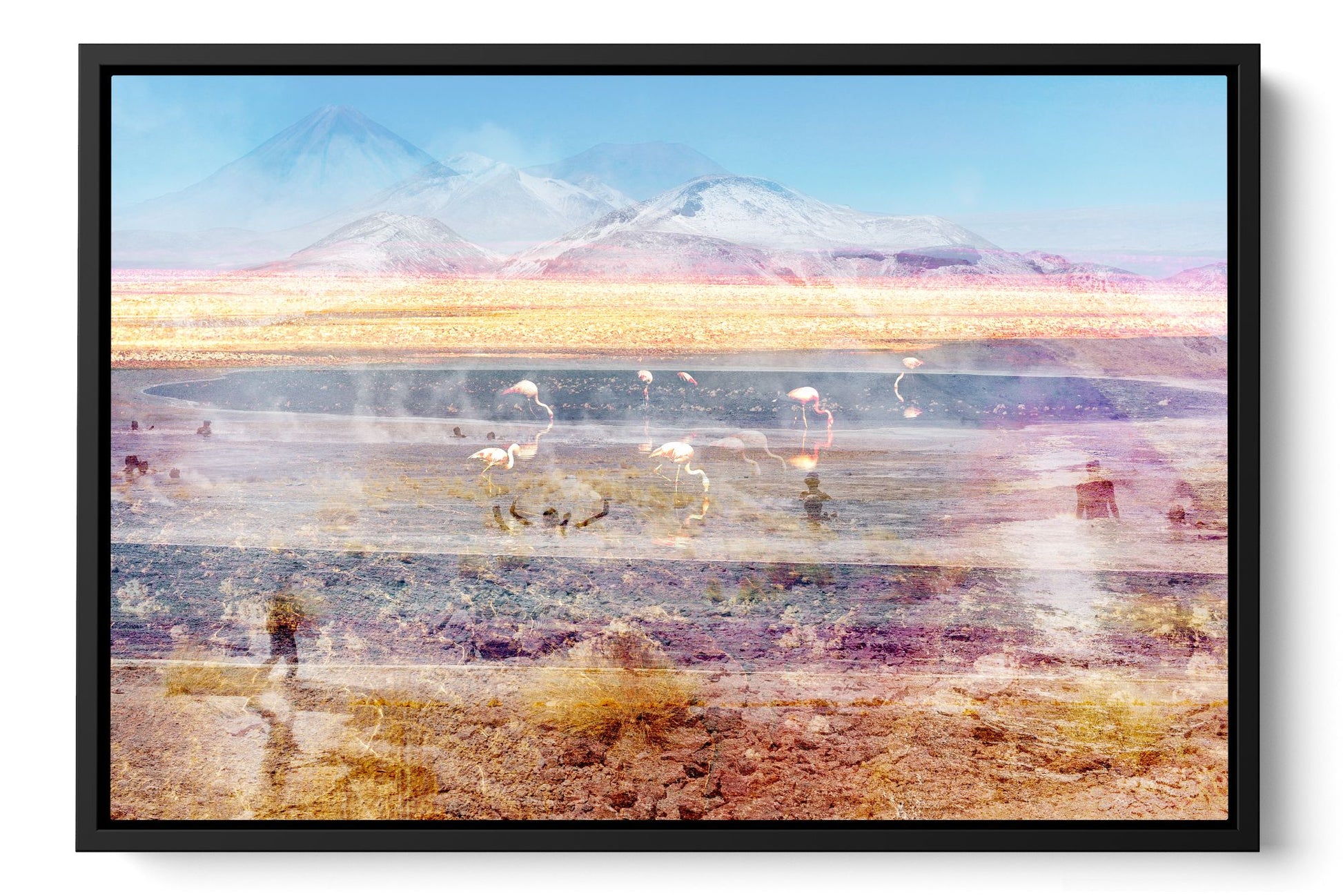 In Pink Atacama, Charlotte Fonne captures the stillness and subtle intensity of Chile’s Atacama Desert through her layered photographic technique, blending reality and memory. This fine art photography print reflects her experience of lagoons and volcanoes tinted with shades of pink and purple beneath an azure sky. Iconic landmarks appear throughout: flamingos gathering at Lagunas Cejar and Chaxa, visitors floating in the mineral-rich Laguna Piedra, the vast salt flats of Laguna Tebinquinche, and the serene Lagunas Miscanti and Miñiques at the base of the Miscanti volcano. Rising steam from the Geysers del Tatio adds movement, while subtle layering evokes the unity of humans, wildlife, and nature in this unique region.