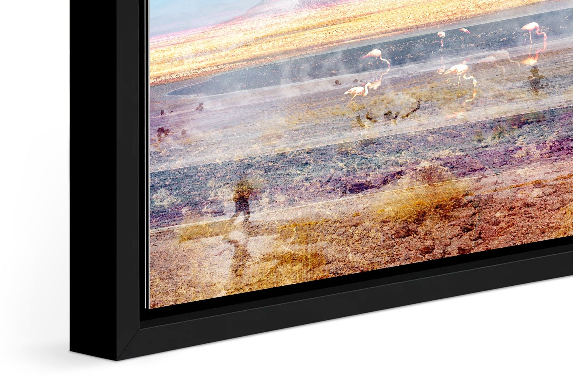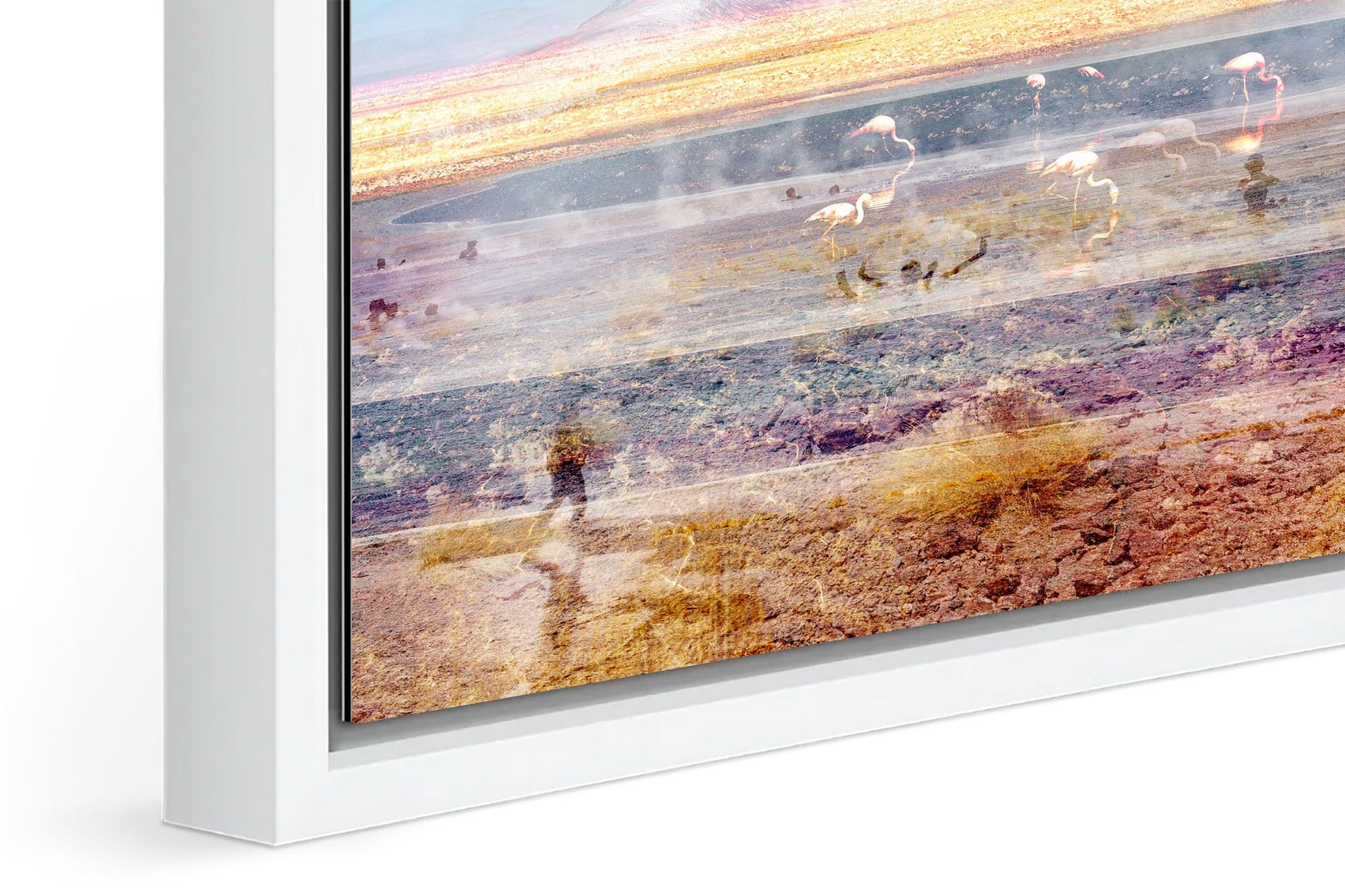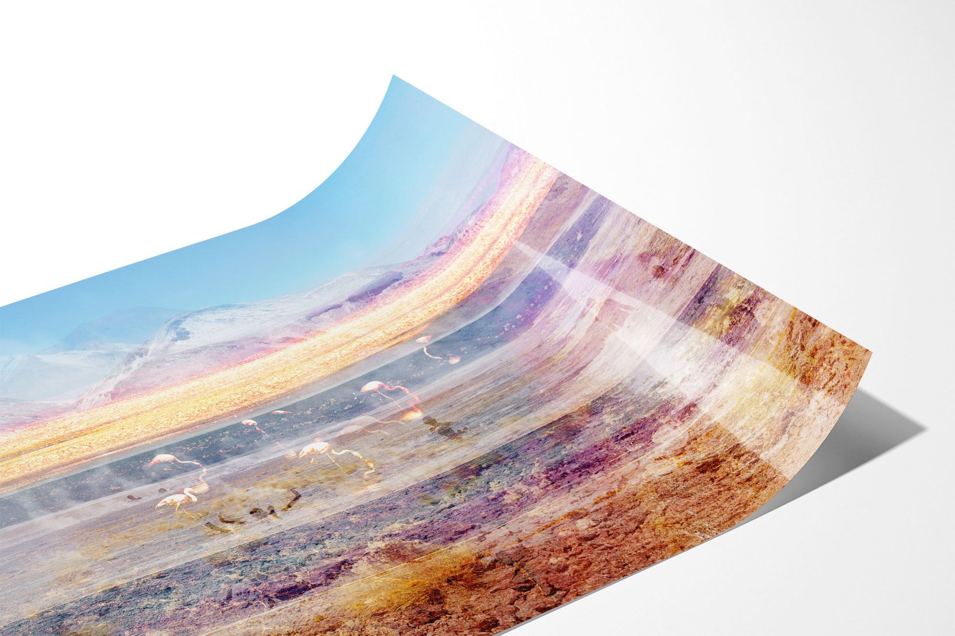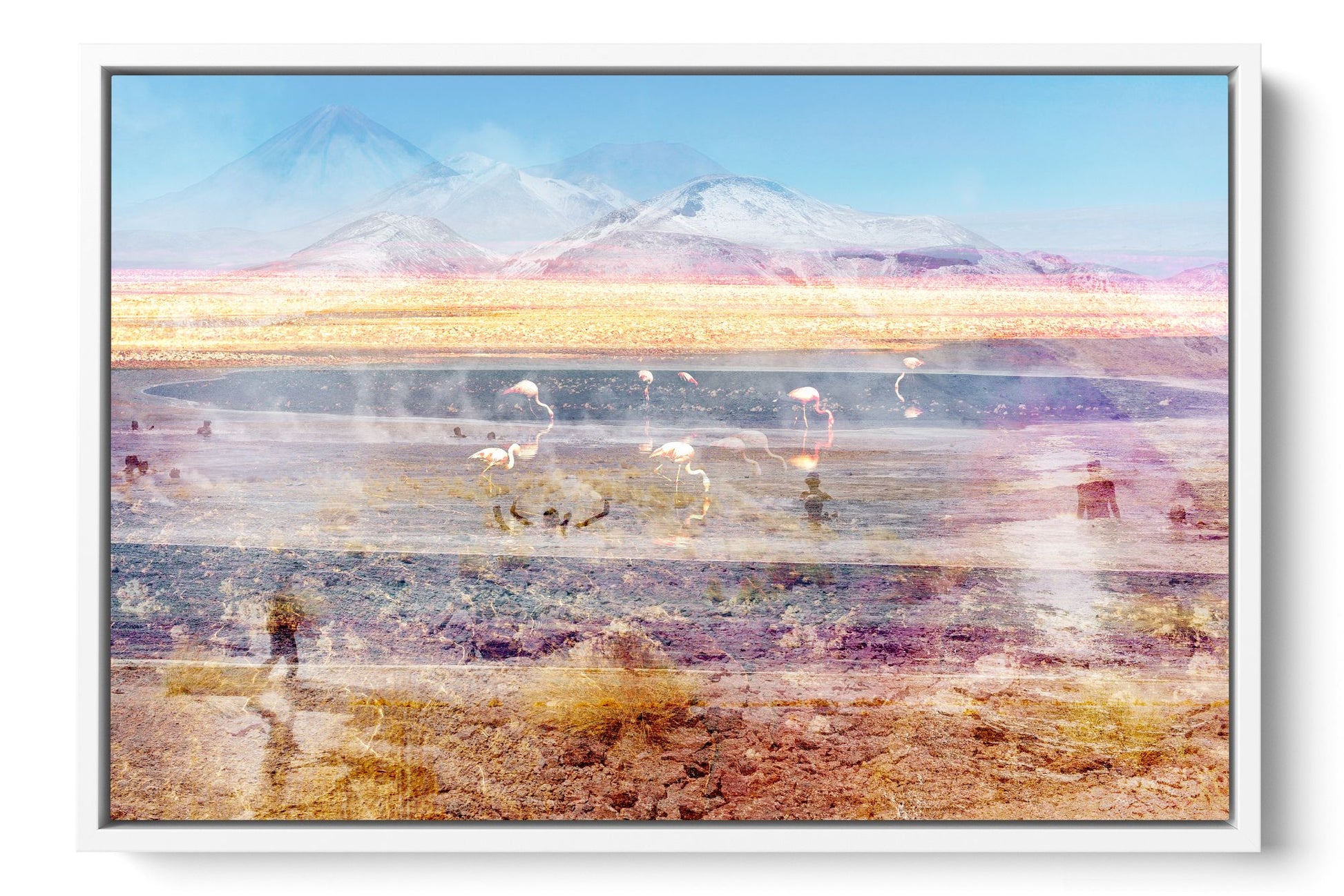 In Pink Atacama, Charlotte Fonne captures the stillness and subtle intensity of Chile’s Atacama Desert through her layered photographic technique, blending reality and memory. This fine art photography print reflects her experience of lagoons and volcanoes tinted with shades of pink and purple beneath an azure sky. Iconic landmarks appear throughout: flamingos gathering at Lagunas Cejar and Chaxa, visitors floating in the mineral-rich Laguna Piedra, the vast salt flats of Laguna Tebinquinche, and the serene Lagunas Miscanti and Miñiques at the base of the Miscanti volcano. Rising steam from the Geysers del Tatio adds movement, while subtle layering evokes the unity of humans, wildlife, and nature in this unique region.