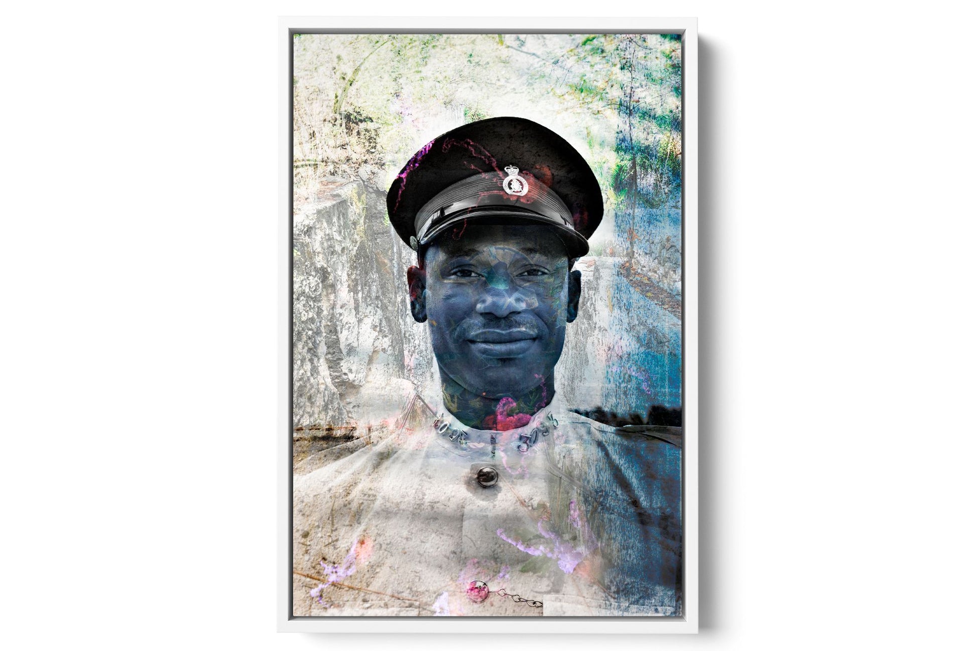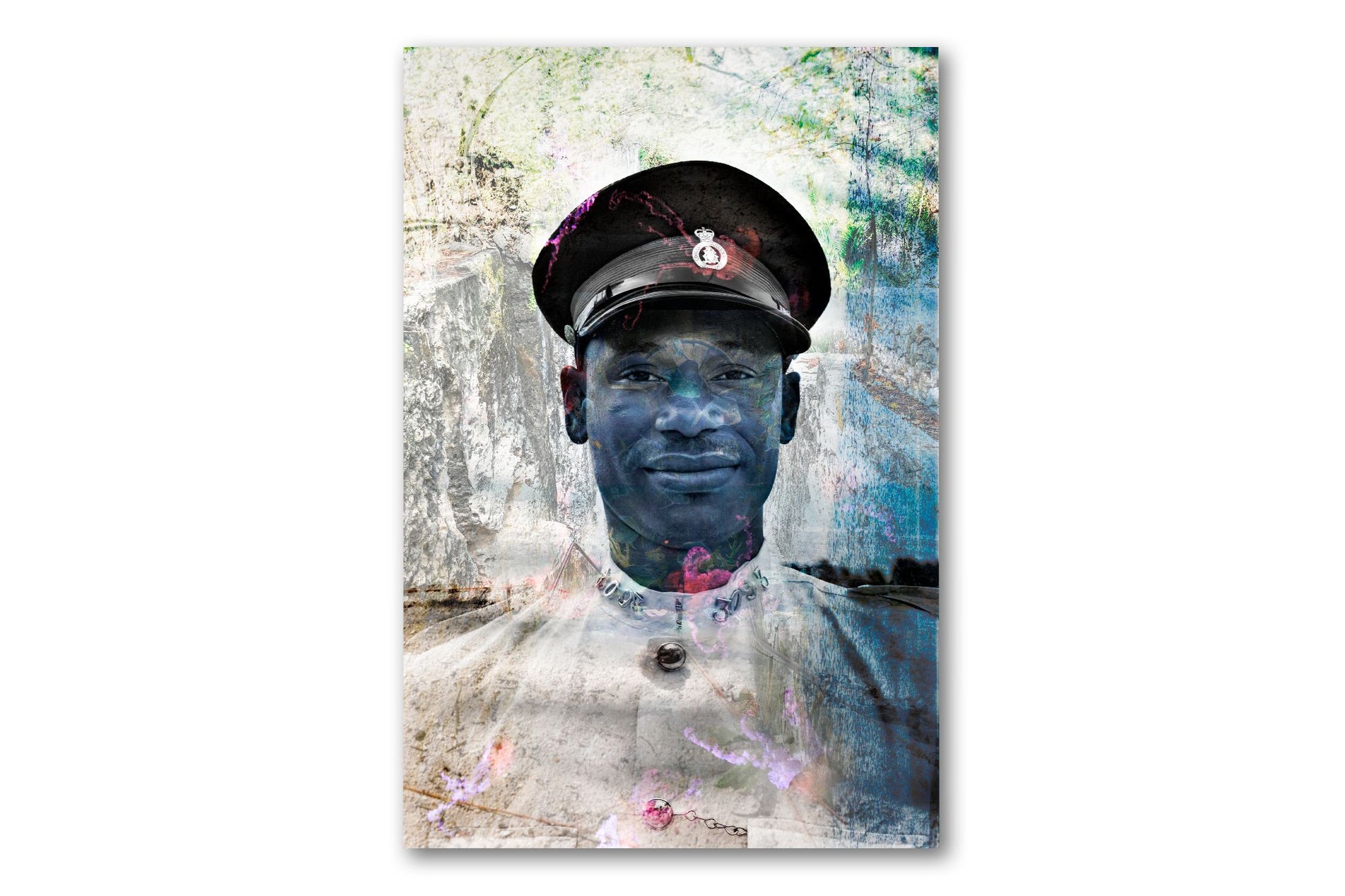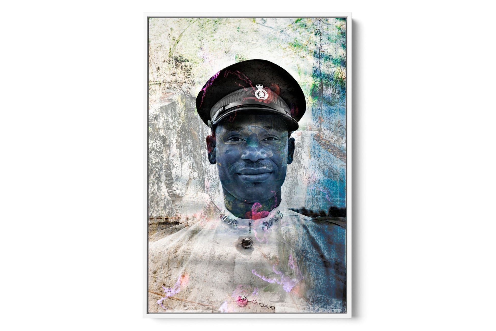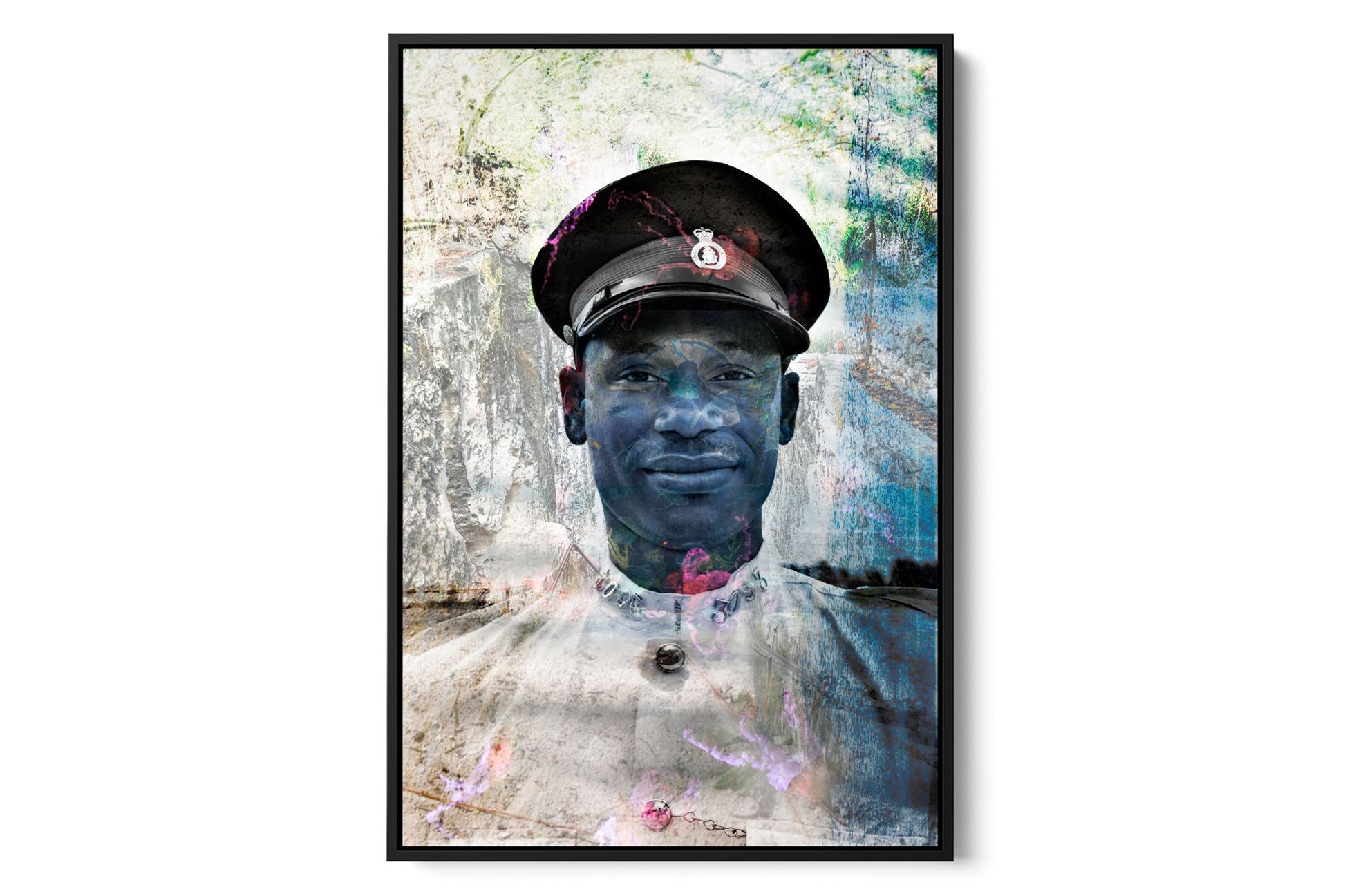 In Policeman in Nassau, Charlotte Fonne creates a portrait of a policeman in Nassau, Bahamas, wearing the official uniform through her layered photographic technique. Each element of the artwork is carefully selected to represent fragments of his life and environment, forming a visual exploration of identity. The fusion of his expression with elements of the Bahamas, including white sandy beaches, turquoise waters, lush vegetation, rocks, and marine life such as fish and jellyfish, adds depth and reflects the vibrant culture, natural beauty, and everyday life of the islands. This fine art photography print captures both the character of the subject and the energy of his surroundings.