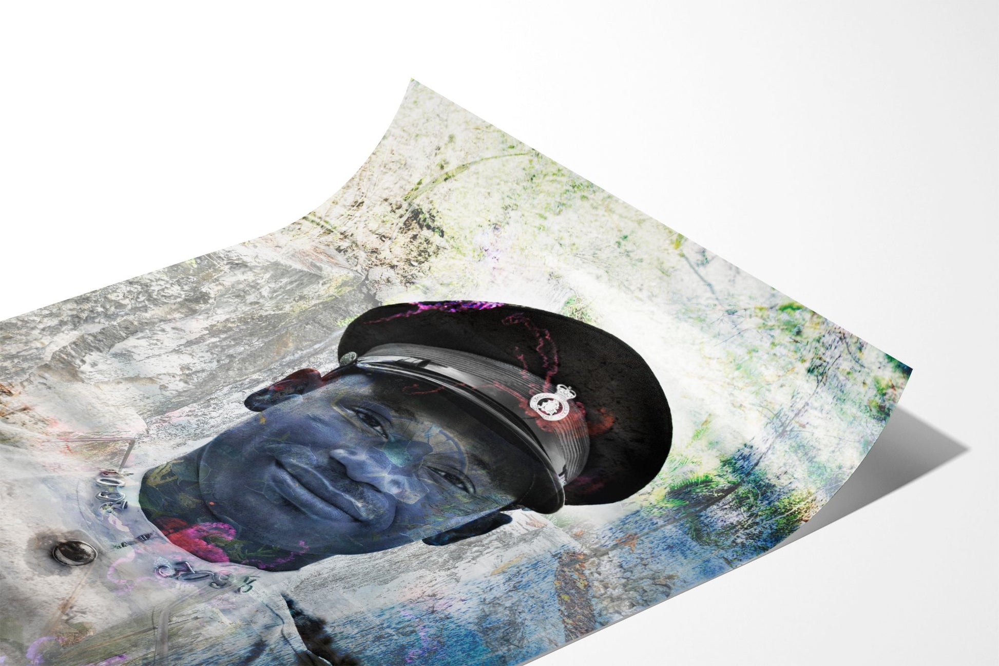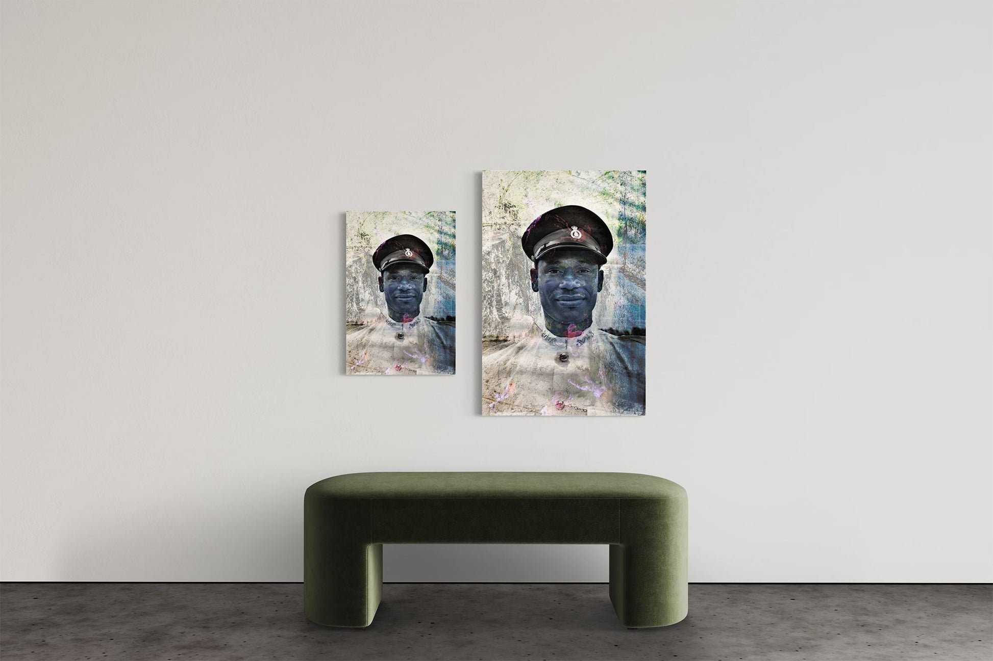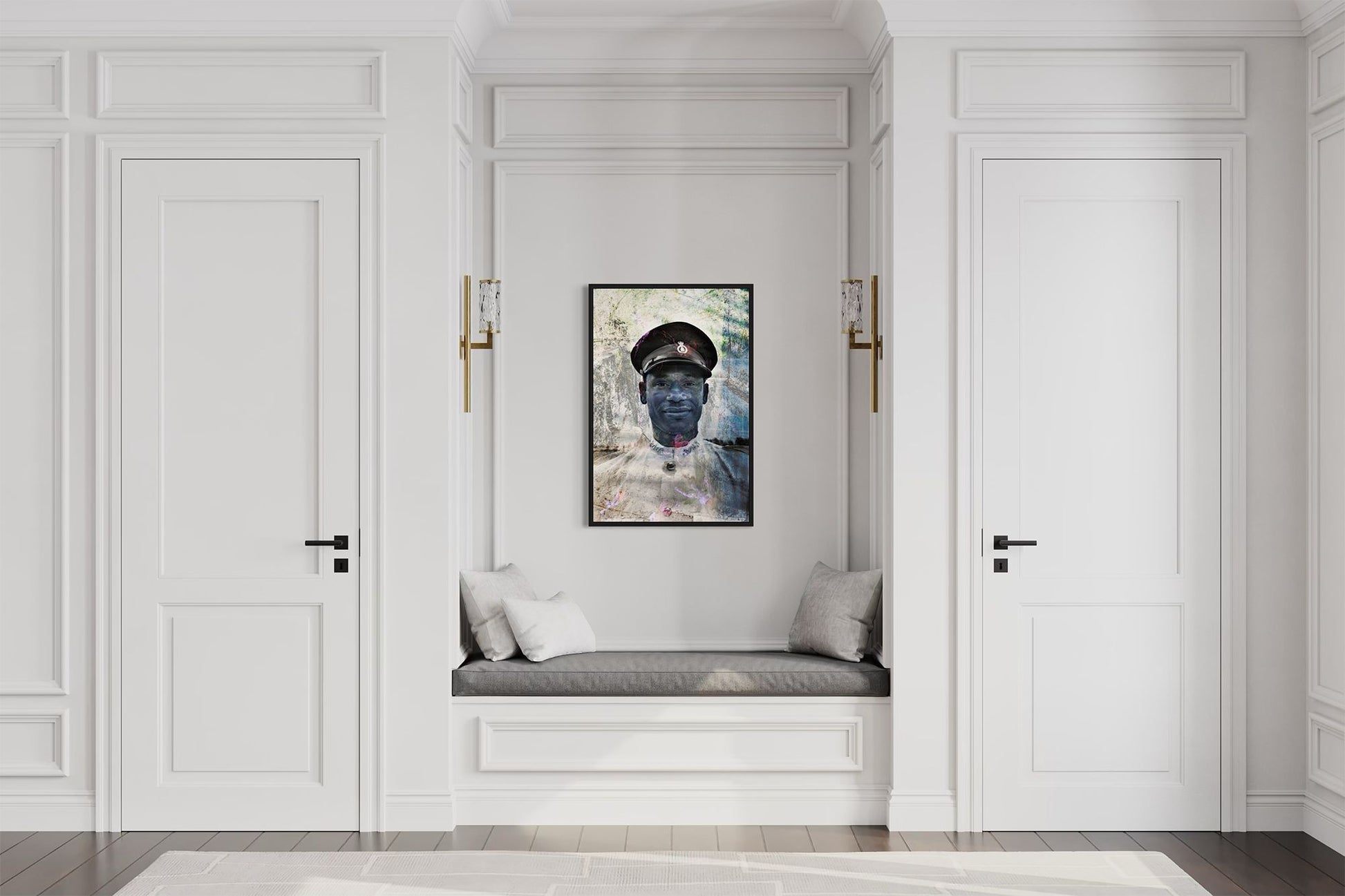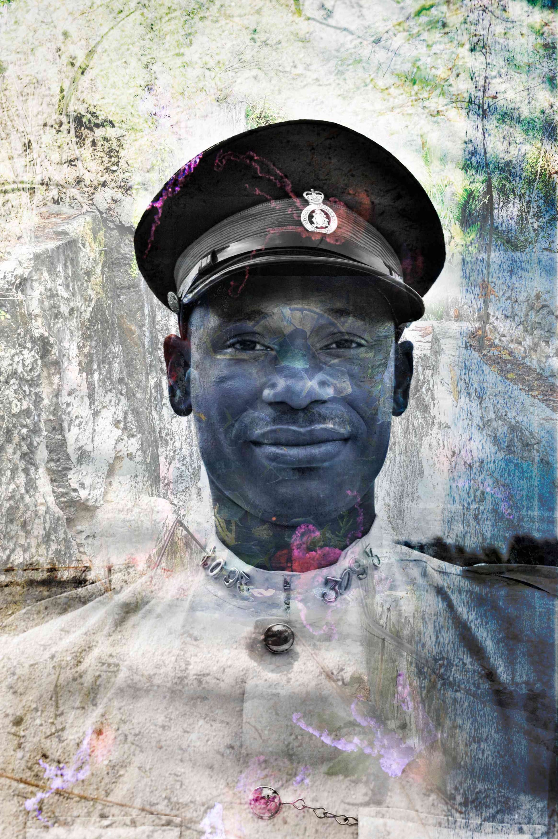 In Policeman in Nassau, Charlotte Fonne creates a portrait of a policeman in Nassau, Bahamas, wearing the official uniform through her layered photographic technique. Each element of the artwork is carefully selected to represent fragments of his life and environment, forming a visual exploration of identity. The fusion of his expression with elements of the Bahamas, including white sandy beaches, turquoise waters, lush vegetation, rocks, and marine life such as fish and jellyfish, adds depth and reflects the vibrant culture, natural beauty, and everyday life of the islands. This fine art photography print captures both the character of the subject and the energy of his surroundings.