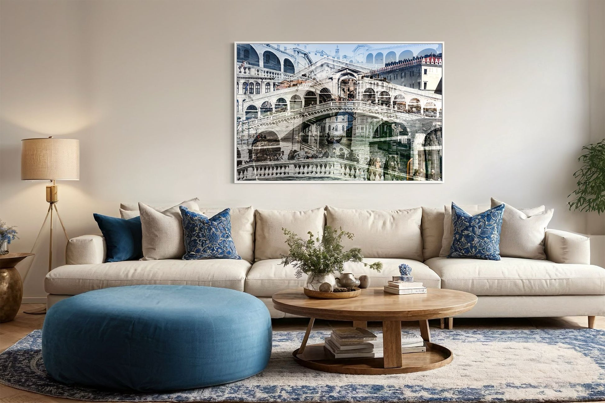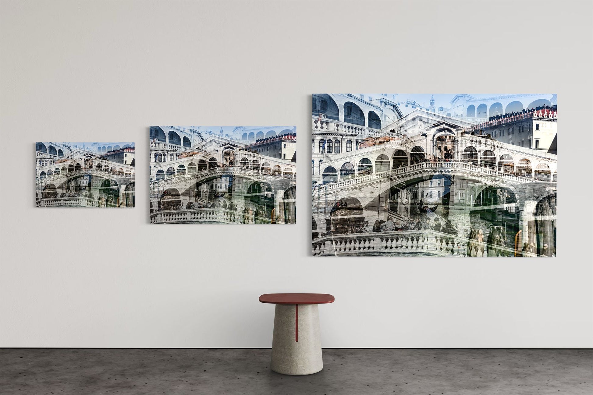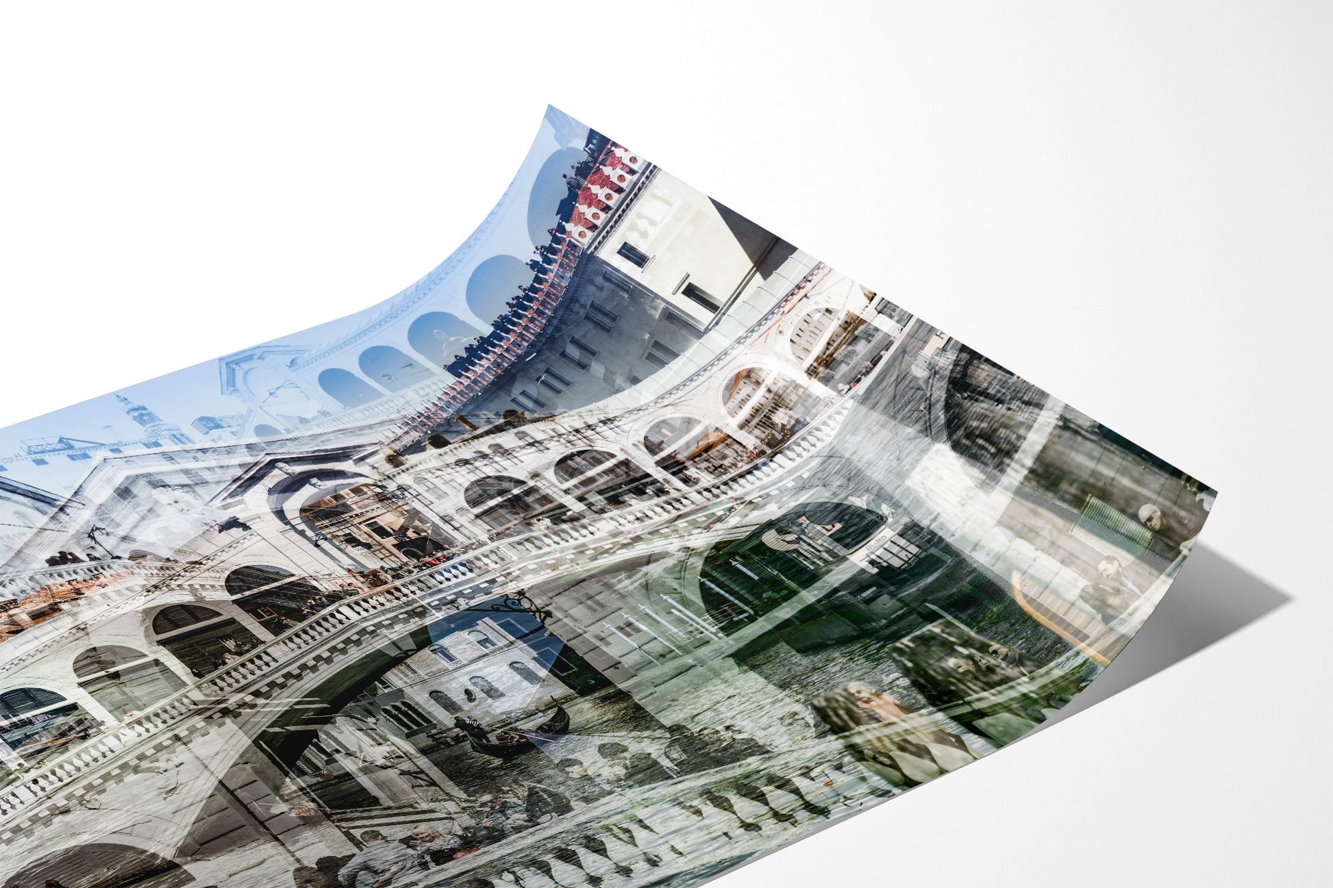 In Rialto Bridge, Charlotte Fonne reinterprets one of Venice’s most iconic landmarks through her layered photographic technique. This Cubist-inspired artwork blends multiple angles and perspectives into a fragmented composition that reflects the life and movement surrounding the Grand Canal. At the heart of the piece, a gondola evokes the essence of Venice while the overlapping views of the bridge bring out its details. Completed in 1591, the Rialto Bridge has long been both a center of trade and a passage through the city. The countless footsteps on its stones are represented by the visitors coming to appreciate the place. This fine art photography print celebrates the architectural grace and strength of the bridge and the atmosphere of Venice through rhythm and motion.