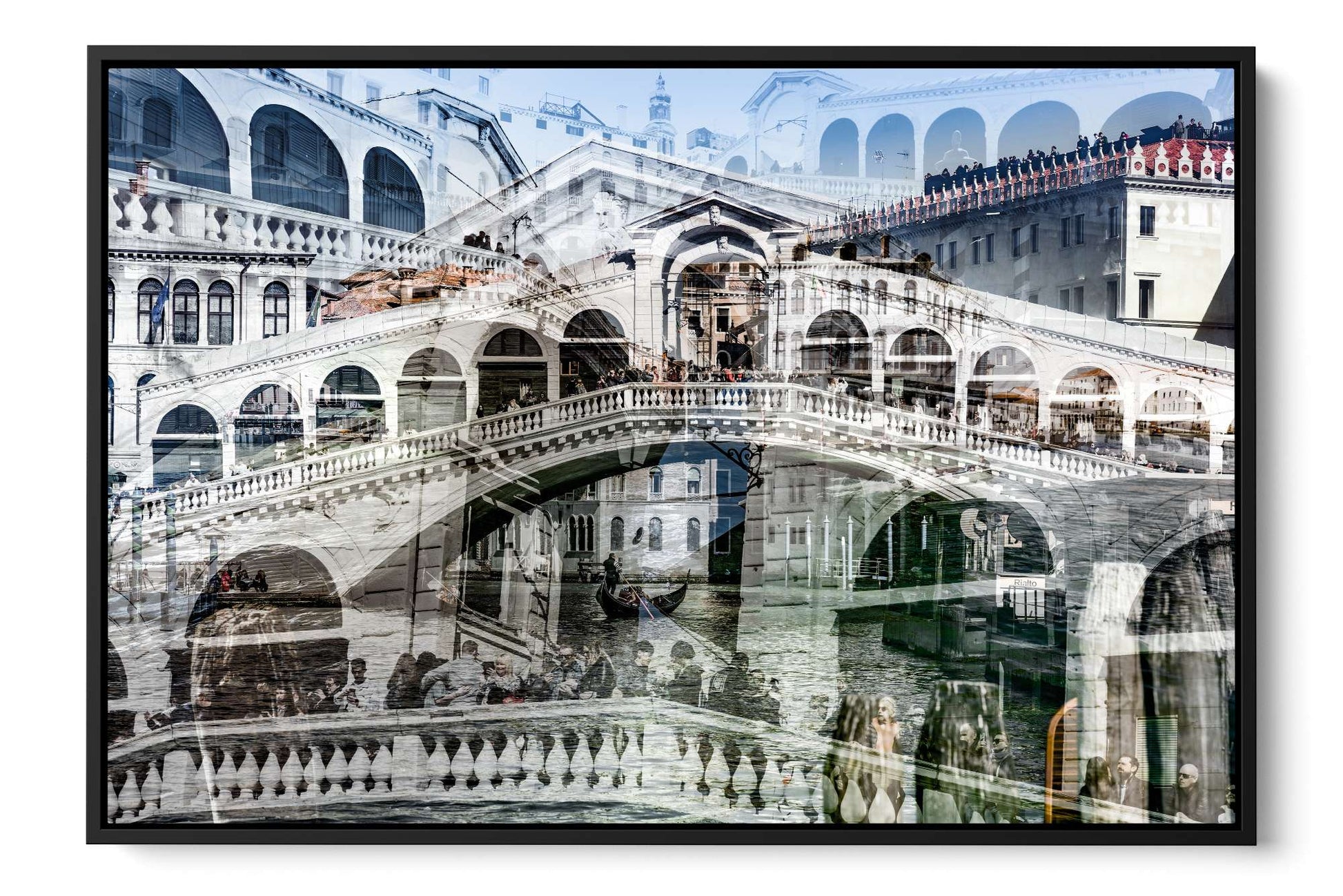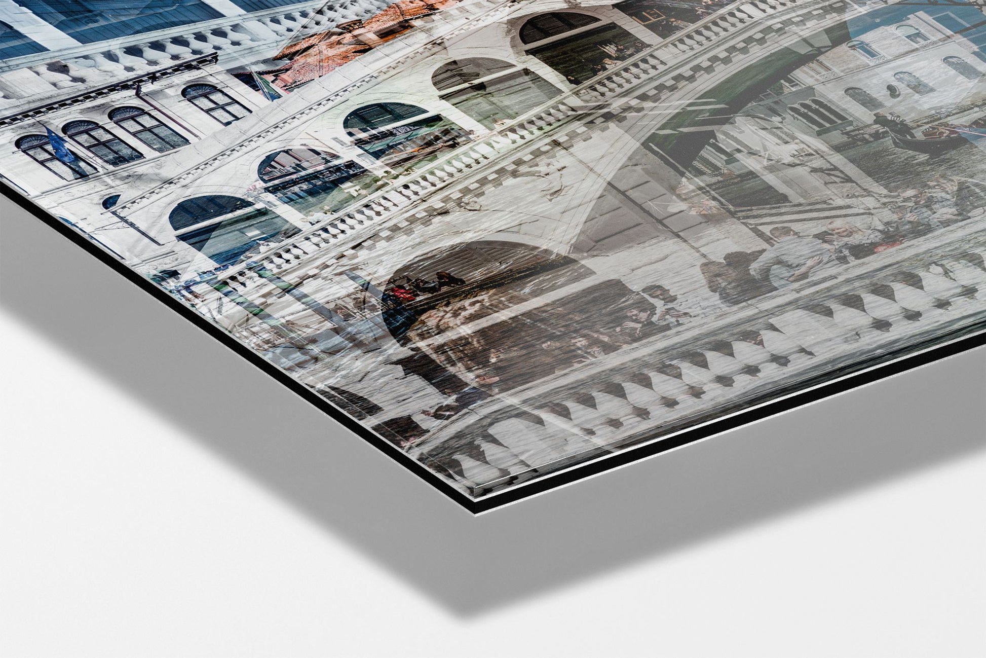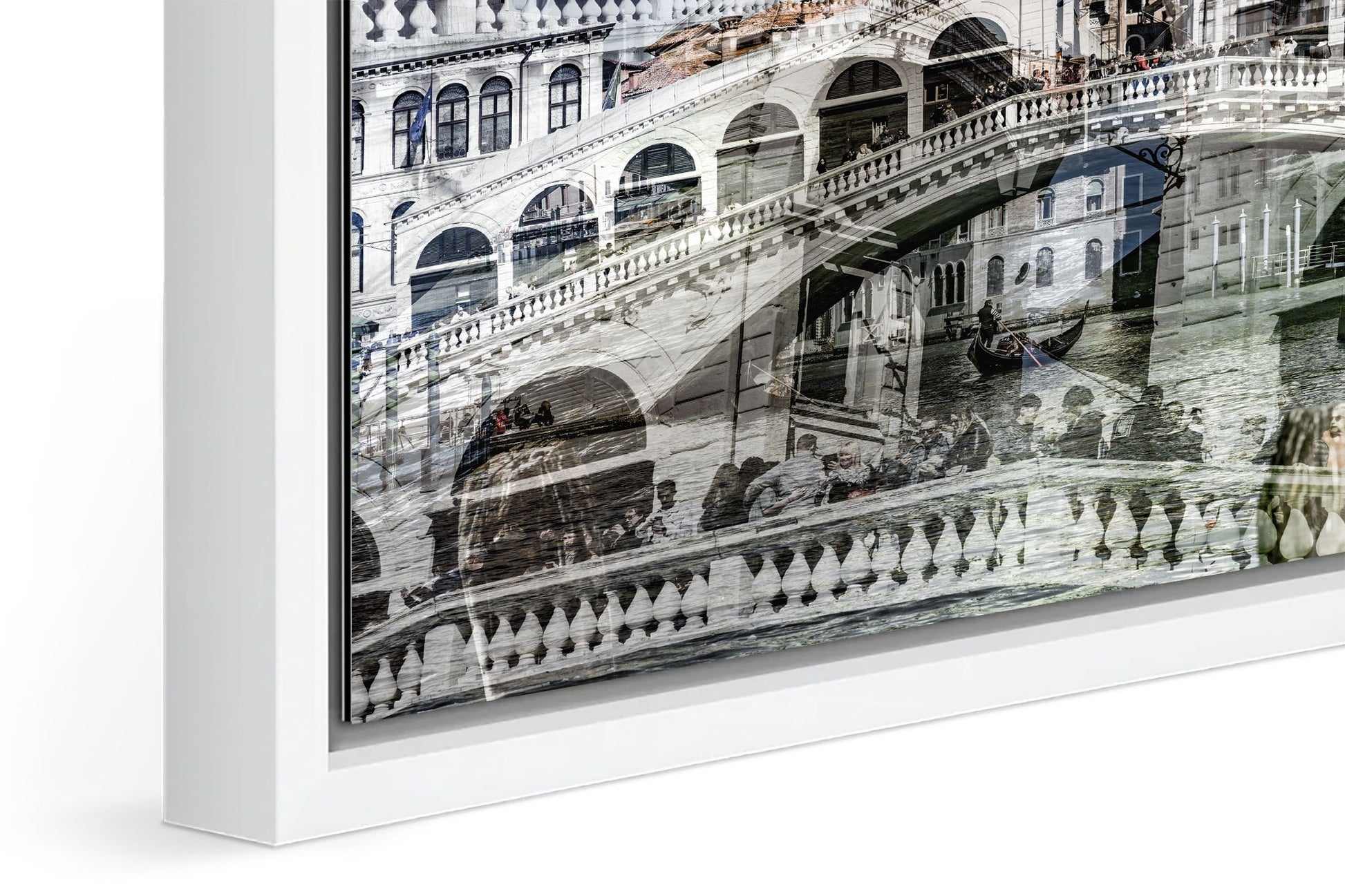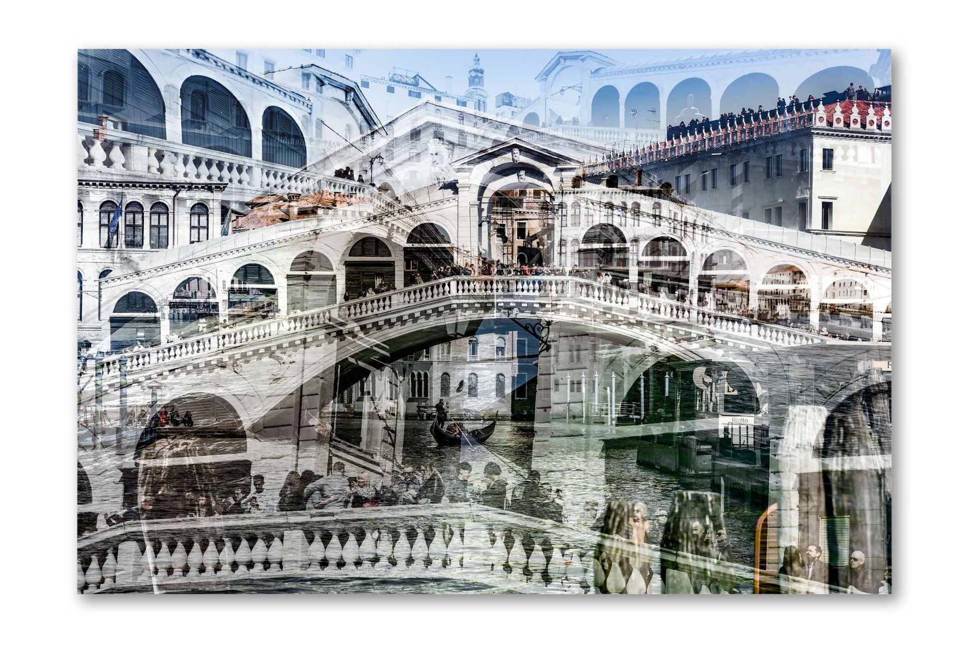 In Rialto Bridge, Charlotte Fonne reinterprets one of Venice’s most iconic landmarks through her layered photographic technique. This Cubist-inspired artwork blends multiple angles and perspectives into a fragmented composition that reflects the life and movement surrounding the Grand Canal. At the heart of the piece, a gondola evokes the essence of Venice while the overlapping views of the bridge bring out its details. Completed in 1591, the Rialto Bridge has long been both a center of trade and a passage through the city. The countless footsteps on its stones are represented by the visitors coming to appreciate the place. This fine art photography print celebrates the architectural grace and strength of the bridge and the atmosphere of Venice through rhythm and motion.