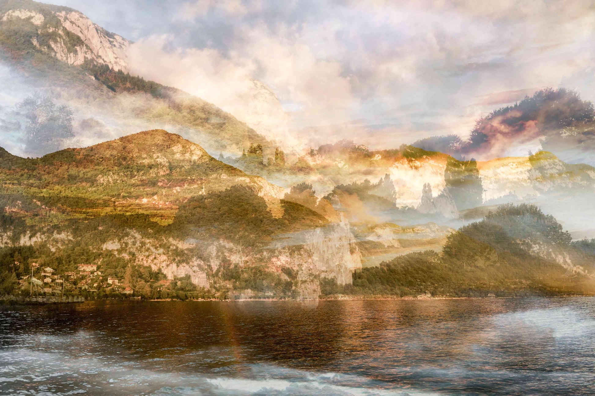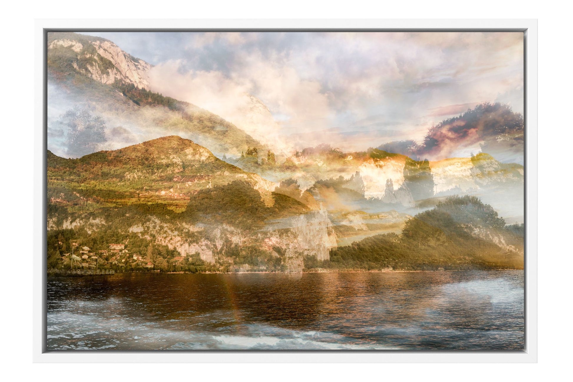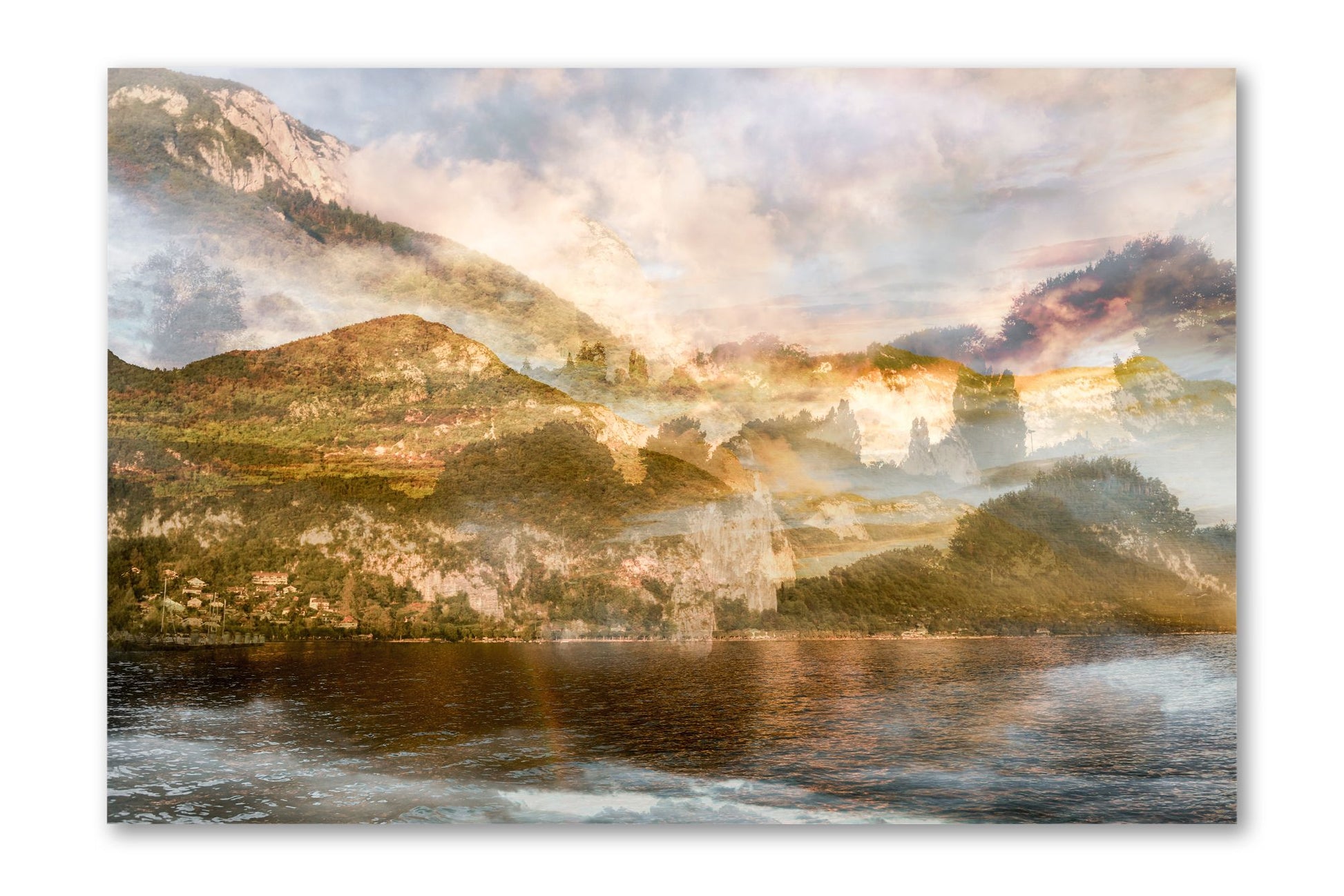 In Sunset over Mont Veyrier, Charlotte Fonne reimagines the serene beauty of her hometown in the French Alps through her layered photographic technique. The artwork reflects her memories of summer evenings by Lake Annecy, where the village of Veyrier-du-Lac lies at the mountain’s base. Warm sunset tones illuminate the forest and stone, casting a gentle light that evokes both quiet reflection and natural splendor. Echoing the spirit of Impressionism, this fine art photography print recalls the luminous atmosphere of Claude Monet’s Meules, transforming personal memory into a universal invitation to pause and appreciate the poetry of light in nature.
