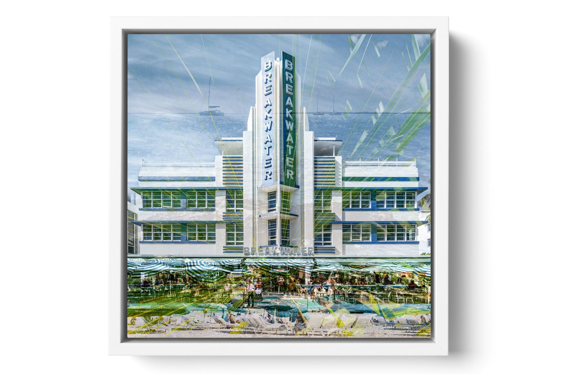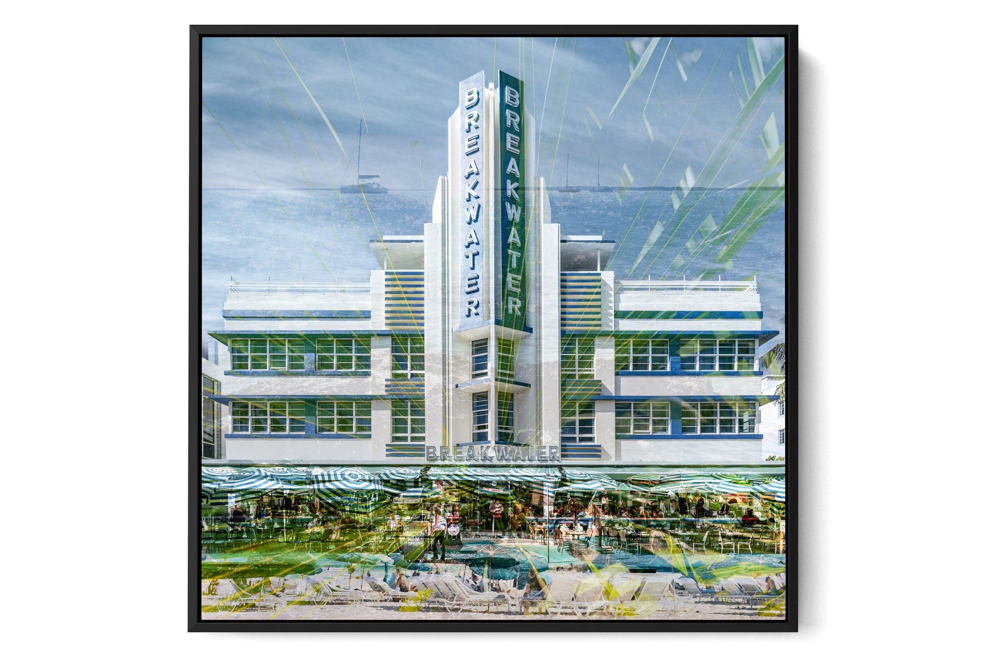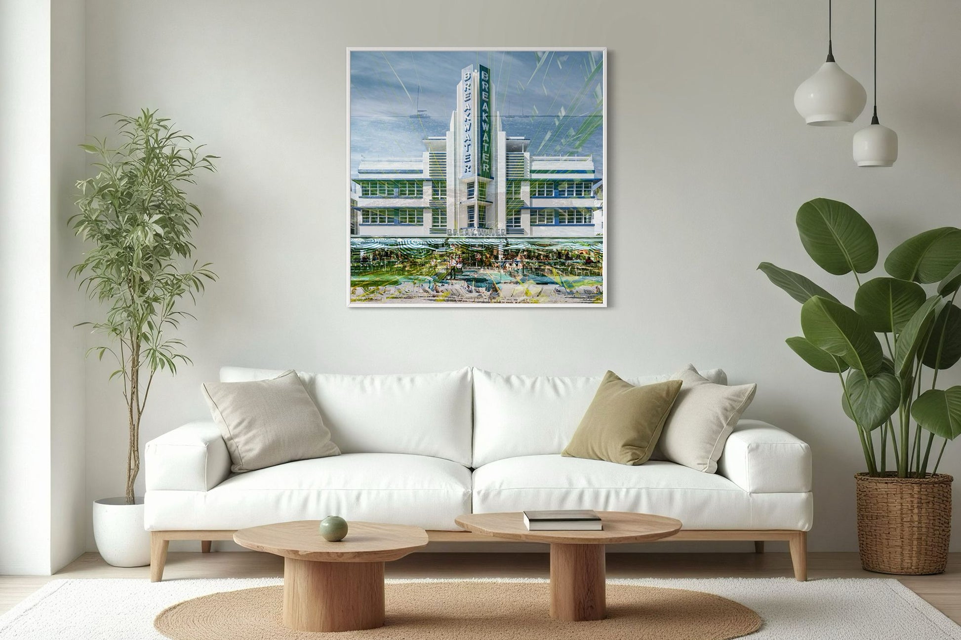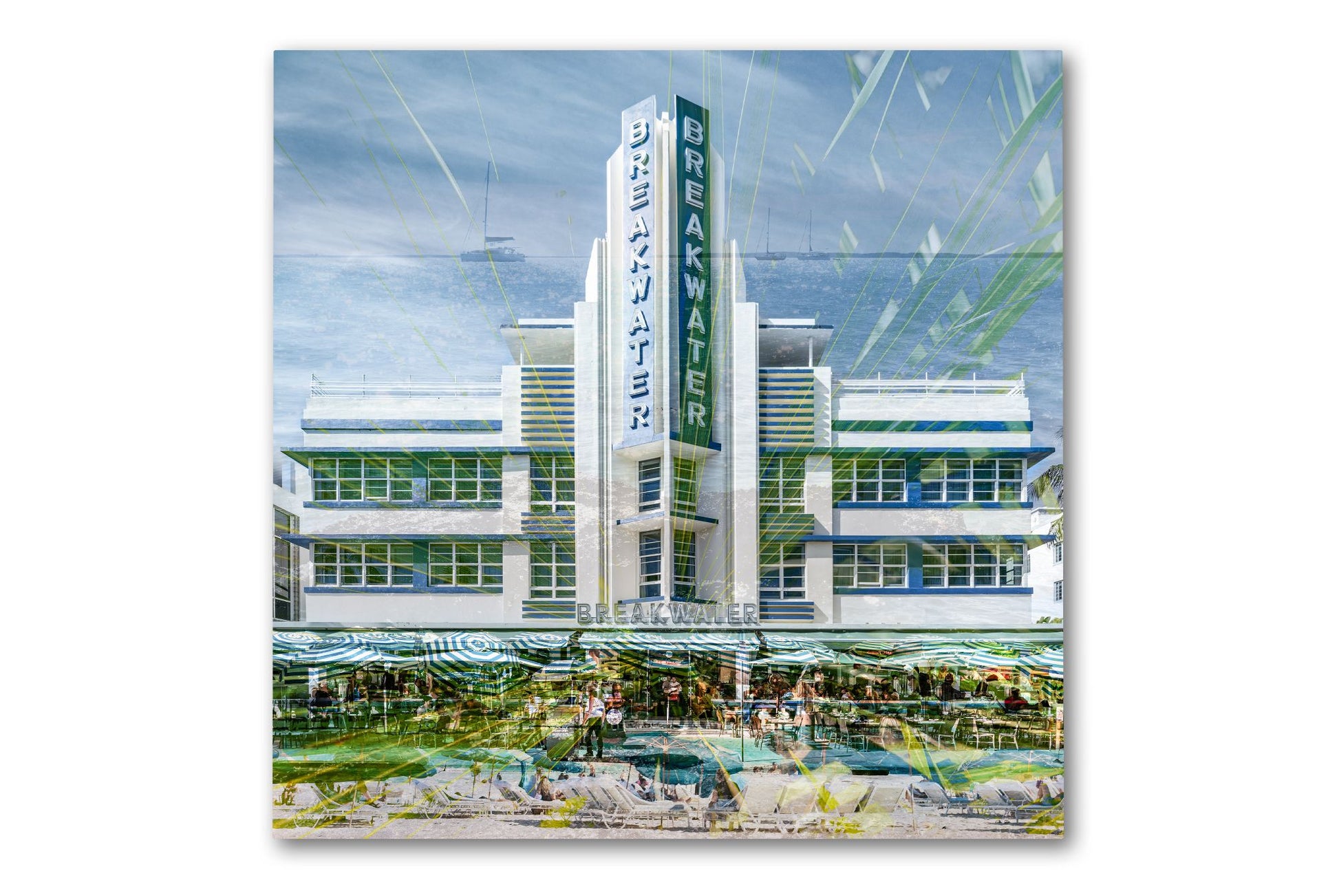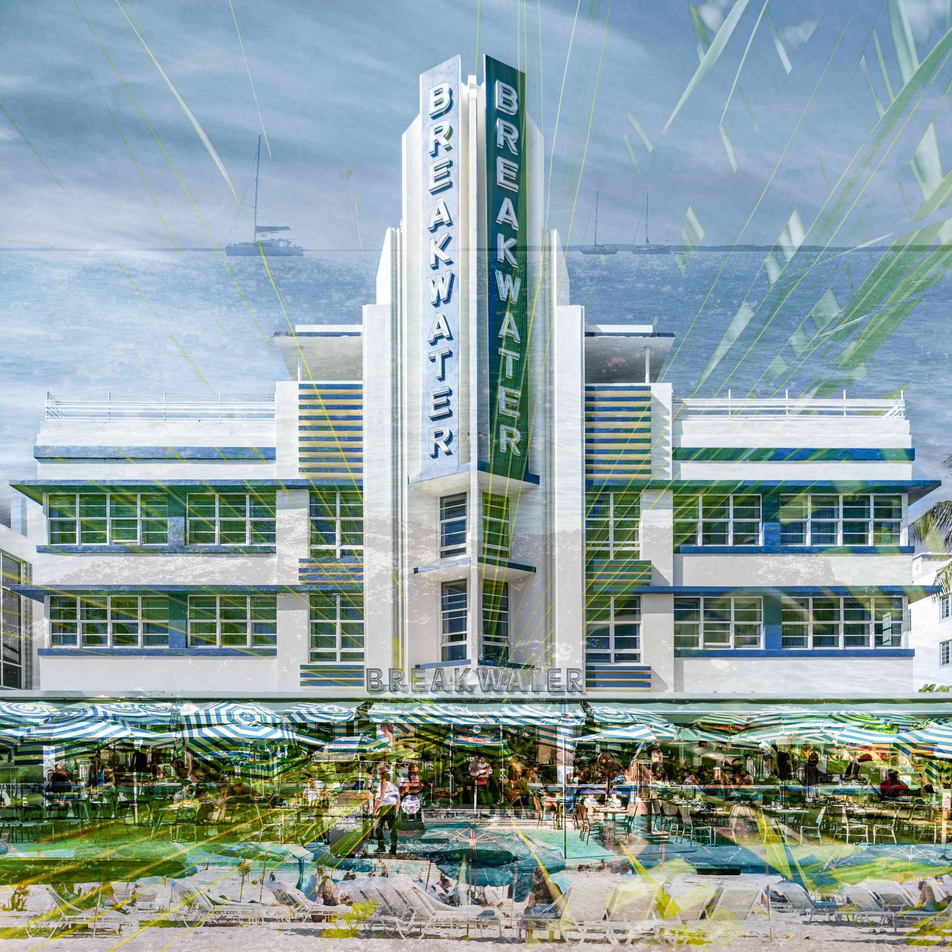 In The Breakwater, Charlotte Fonne creates an artwork that captures the architecture of one of Miami Beach’s iconic Art Deco hotels on Ocean Drive and its surroundings through her layered photographic technique. The fusion of the geometric architecture with carefully selected local elements, including the ocean, boats, palm tree leaves, waves with sun reflections in the water, beachgoers, beach chairs and umbrellas, forms a visual exploration rich in detail. This fine art photography print celebrates Miami’s Art Deco heritage and the energy of South Beach.