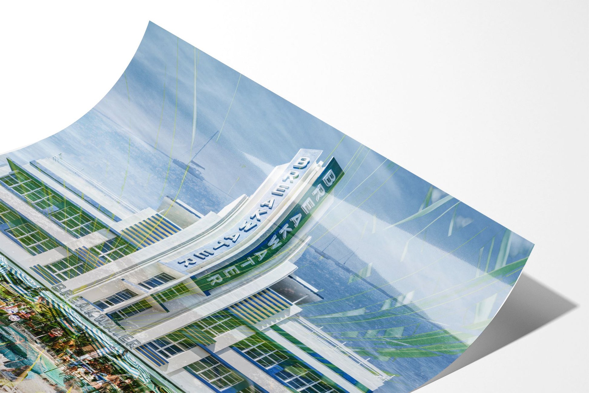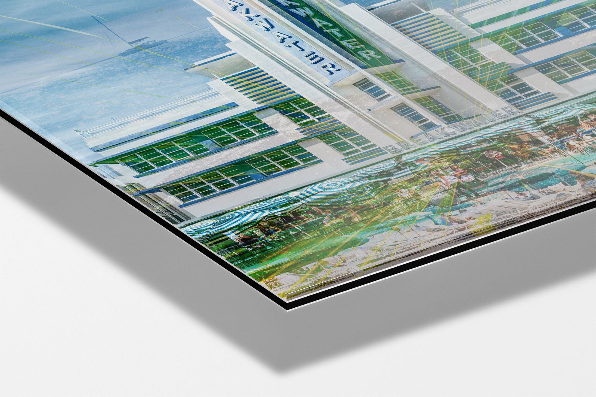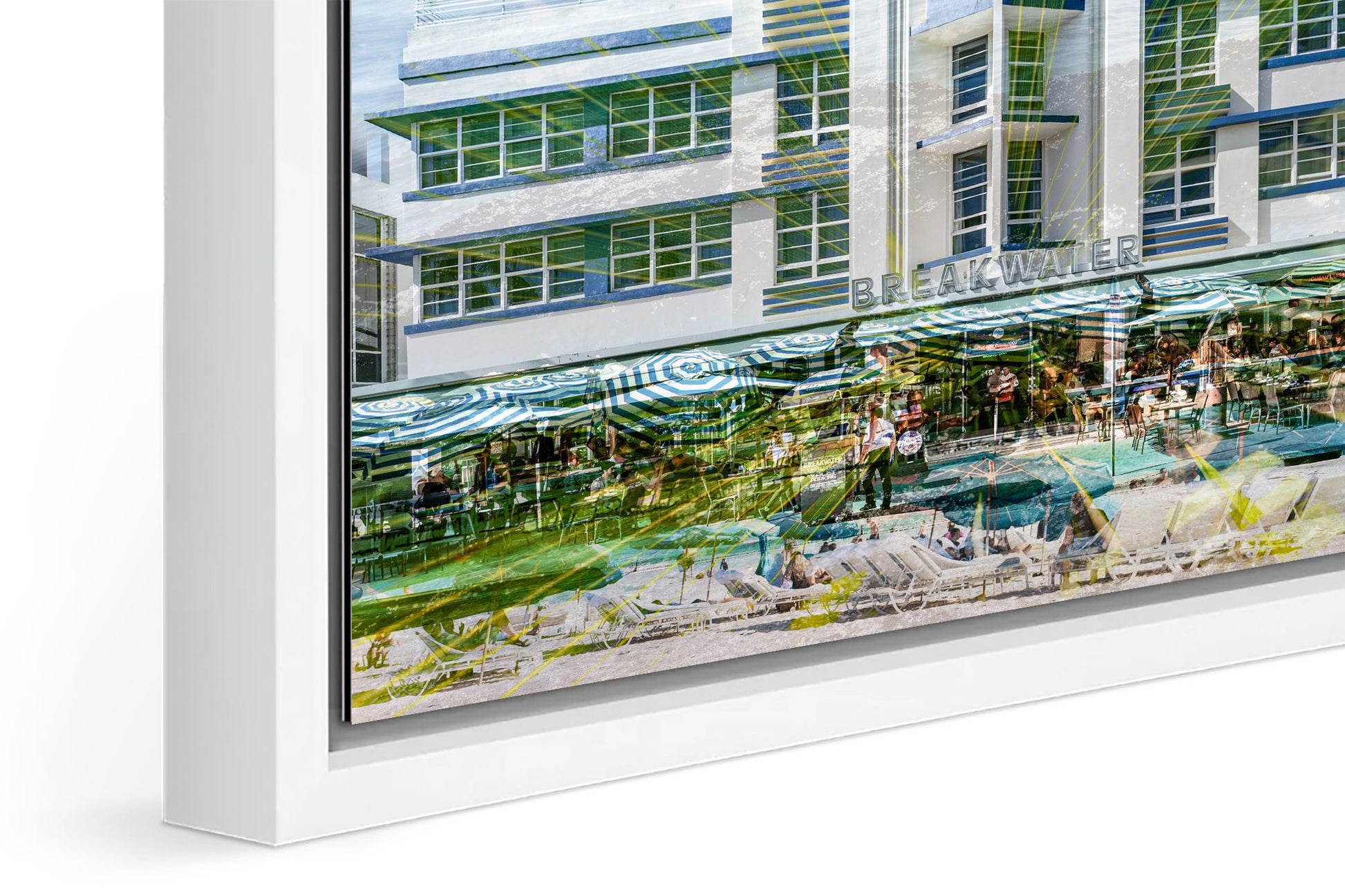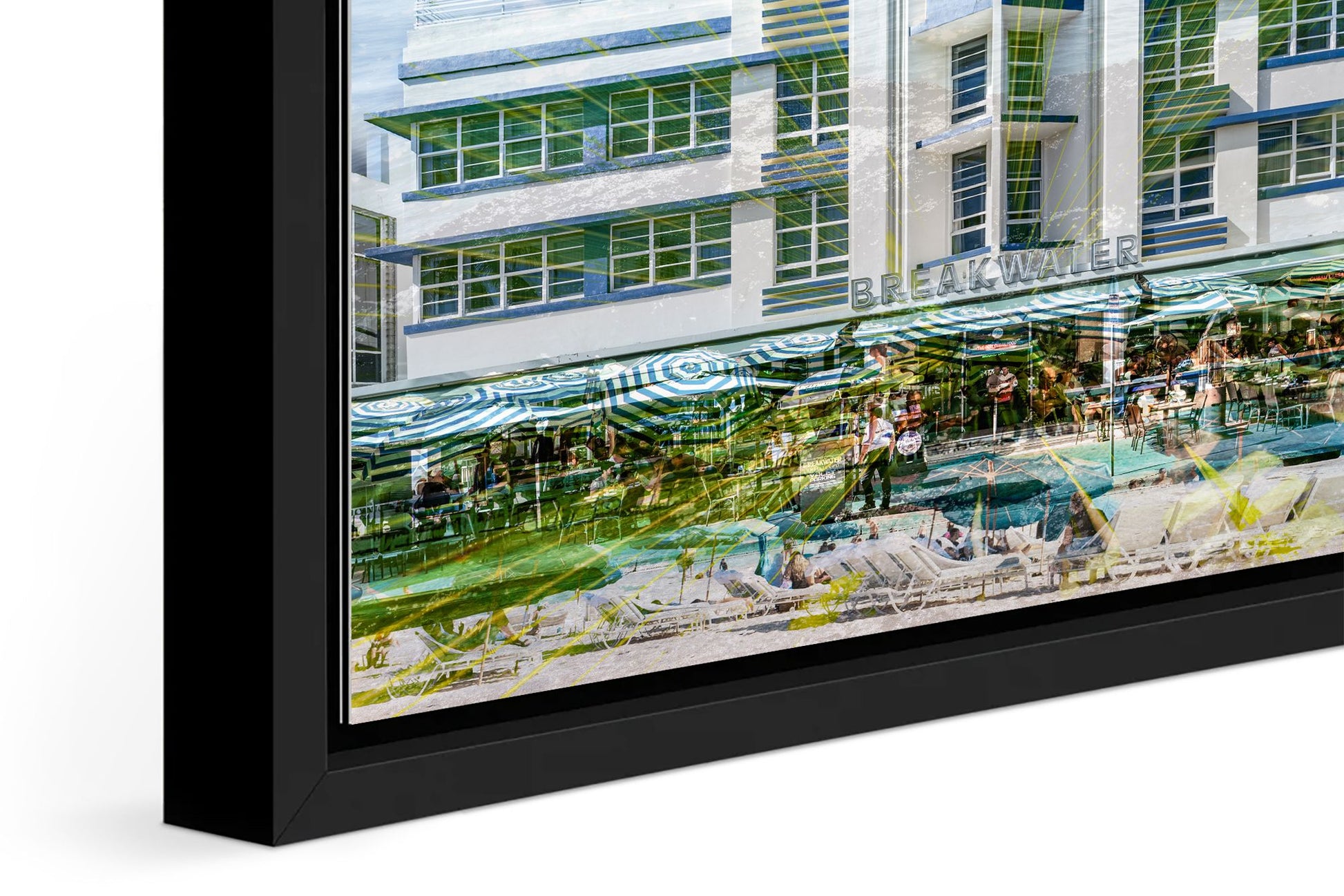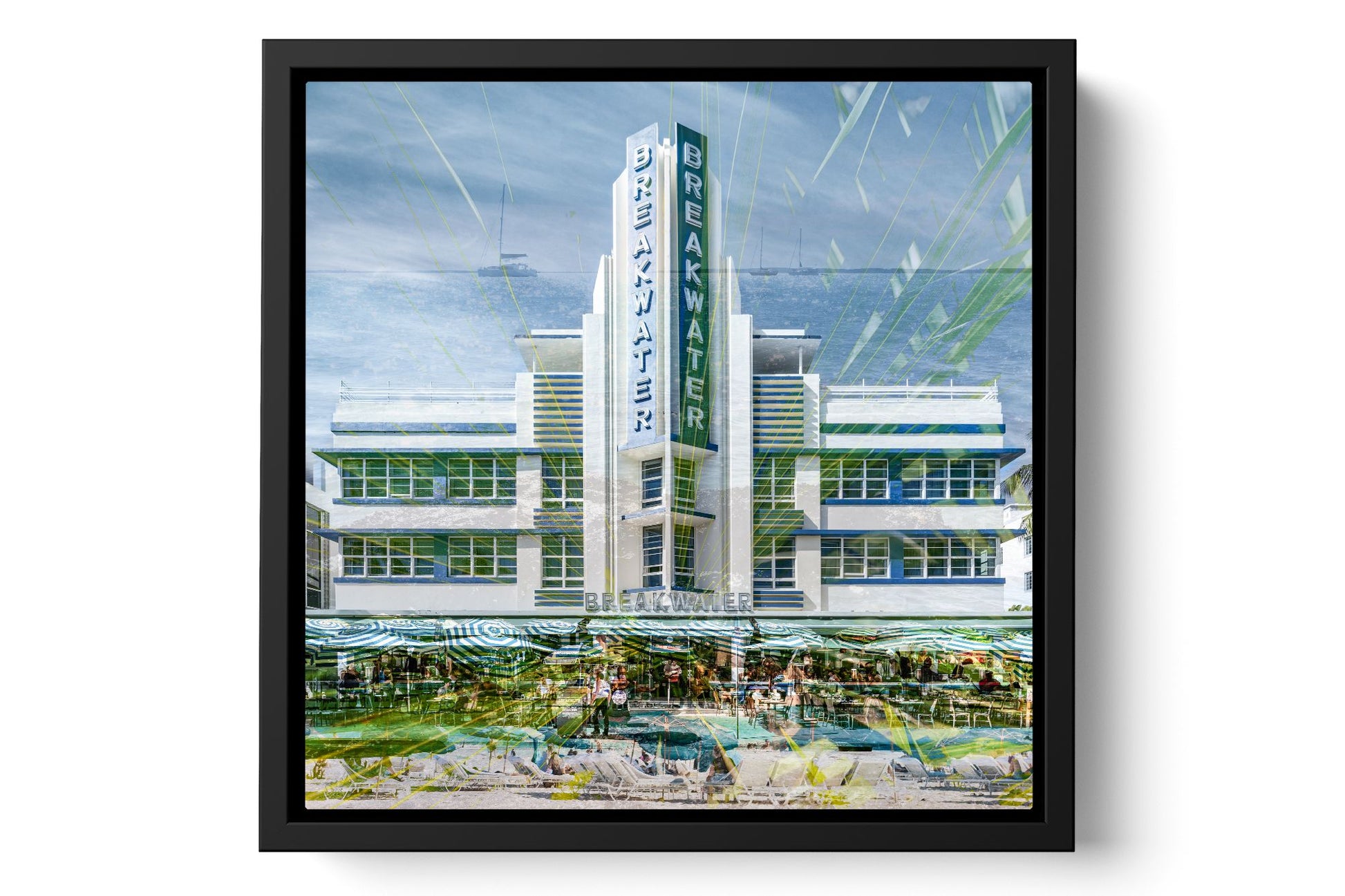 In The Breakwater, Charlotte Fonne creates an artwork that captures the architecture of one of Miami Beach’s iconic Art Deco hotels on Ocean Drive and its surroundings through her layered photographic technique. The fusion of the geometric architecture with carefully selected local elements, including the ocean, boats, palm tree leaves, waves with sun reflections in the water, beachgoers, beach chairs and umbrellas, forms a visual exploration rich in detail. This fine art photography print celebrates Miami’s Art Deco heritage and the energy of South Beach.