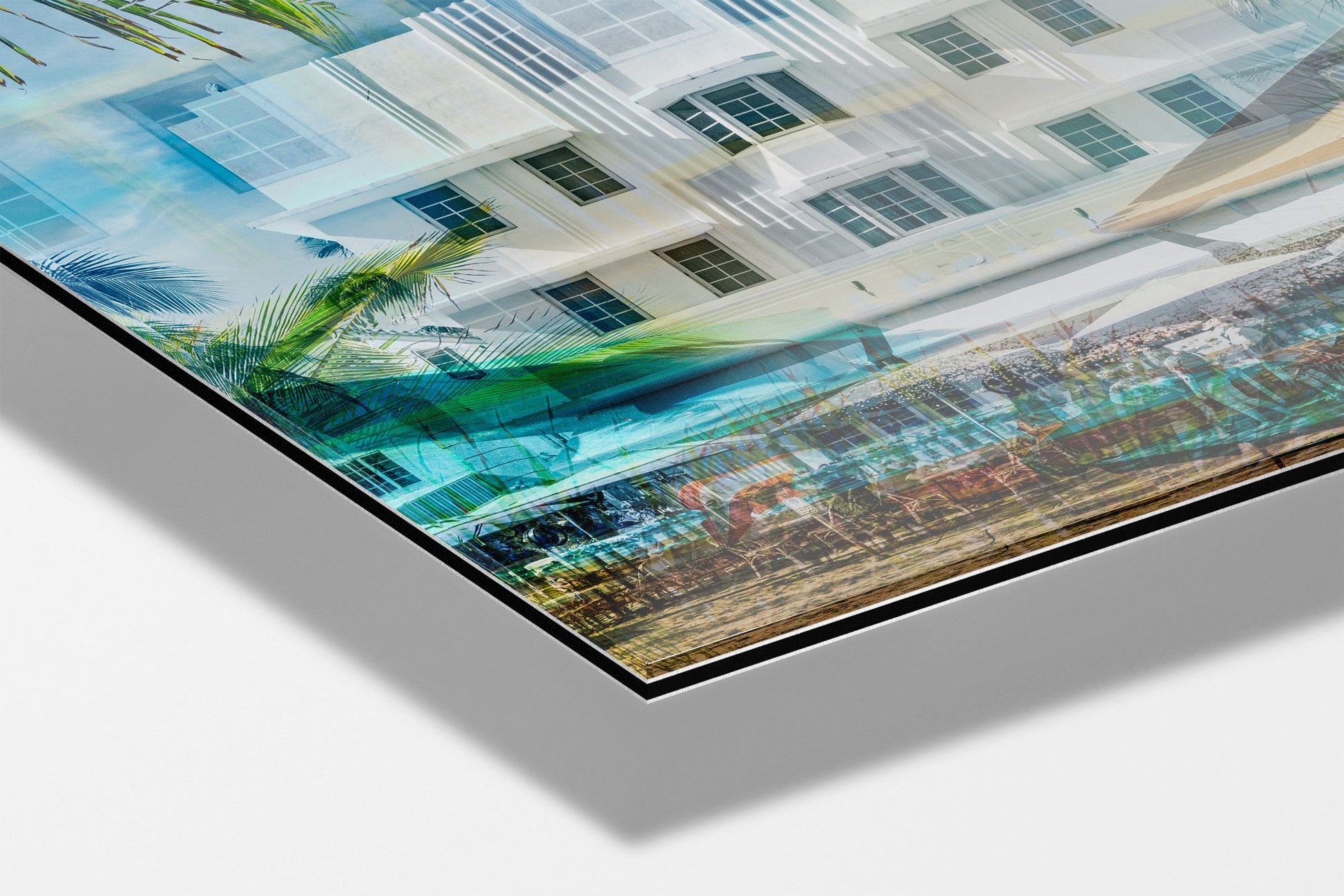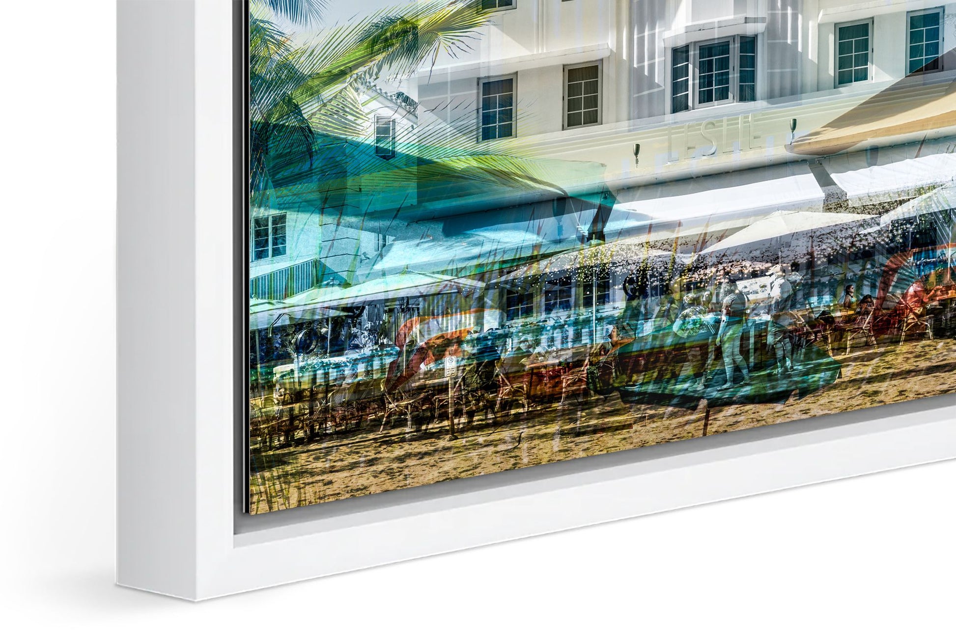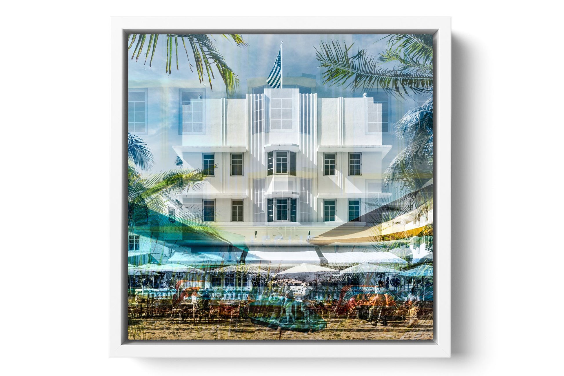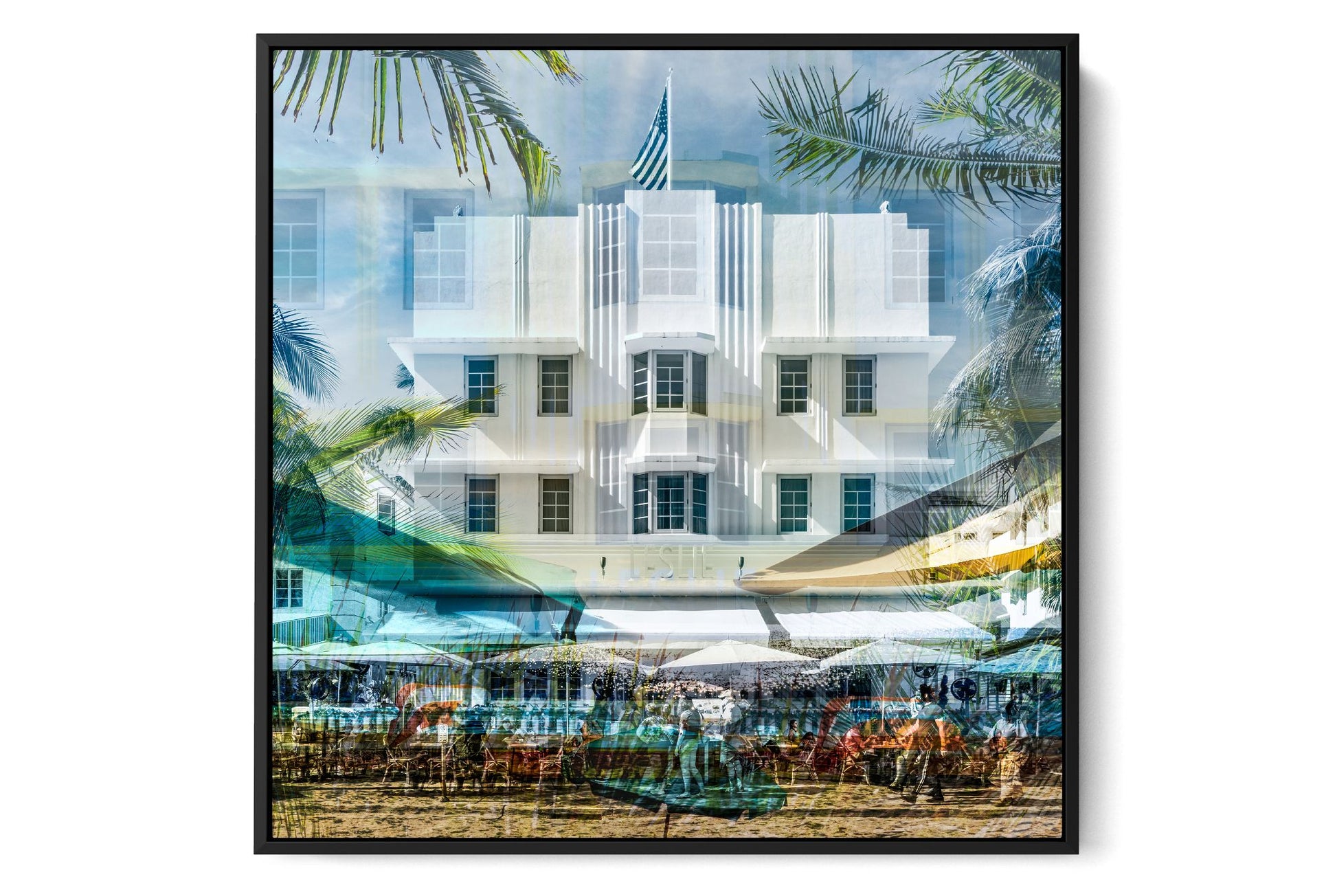 In The Leslie, Charlotte Fonne creates an artwork that captures the architecture of one of Miami Beach’s iconic Art Deco hotels on Ocean Drive and its surroundings through her layered photographic technique. The fusion of the geometric architecture with carefully selected local elements, including palm tree leaves, umbrellas, beach cabanas, warm sand, and sun reflections in the ocean, forms a visual exploration rich in detail. A closer shot of the façade adds a graphic rhythm and yellow color in the sky. This fine art photography print celebrates Miami’s Art Deco heritage and the energy of South Beach.