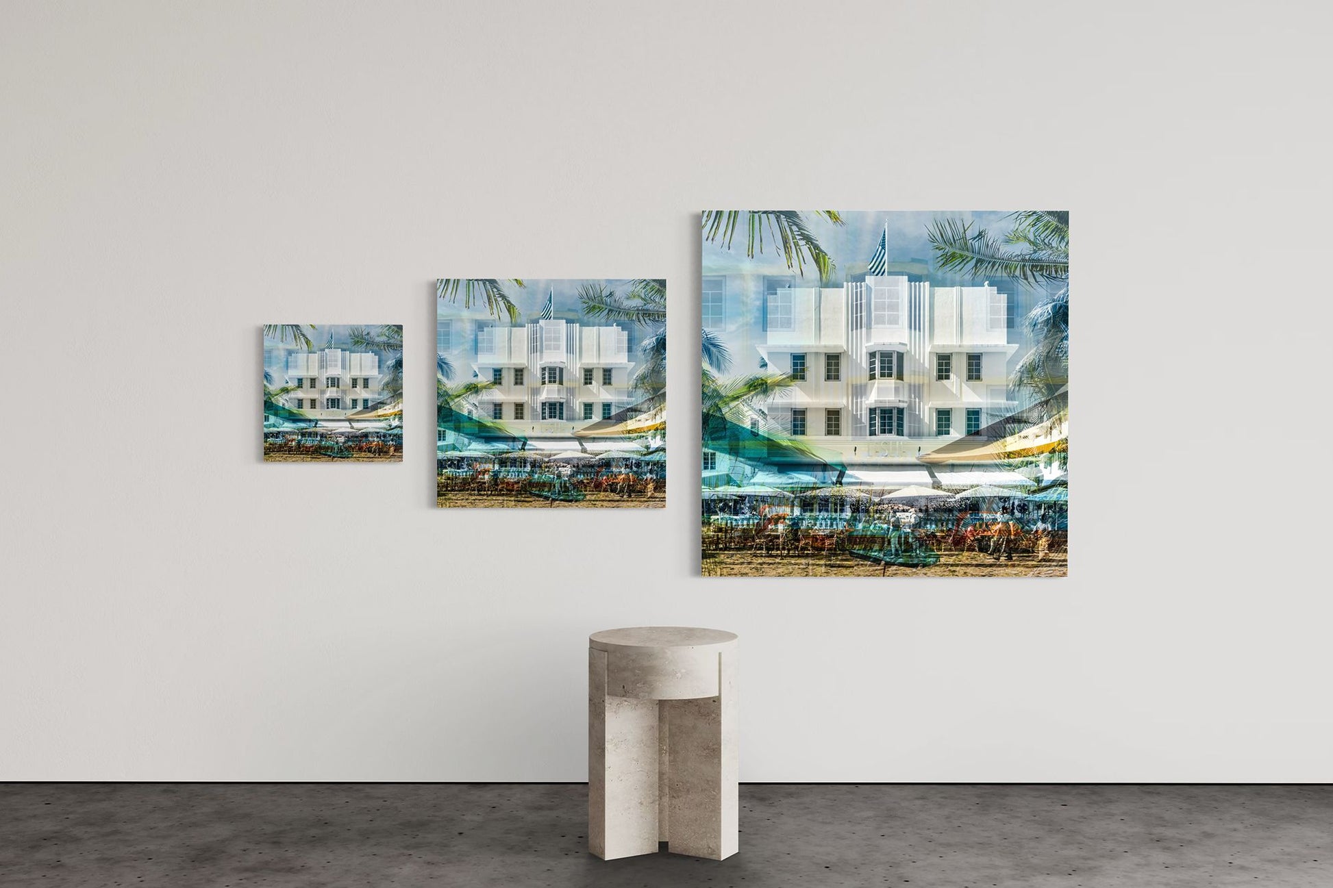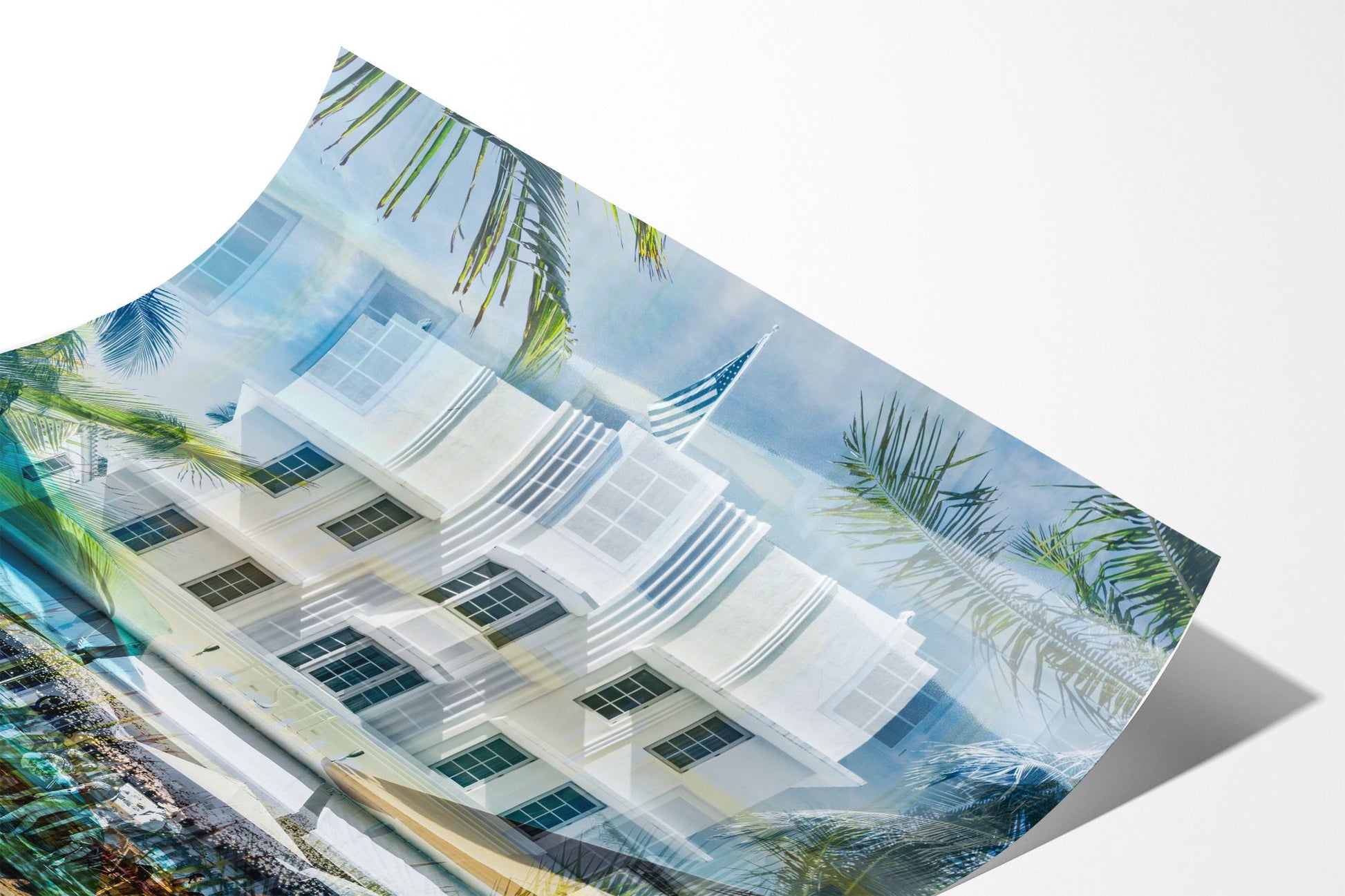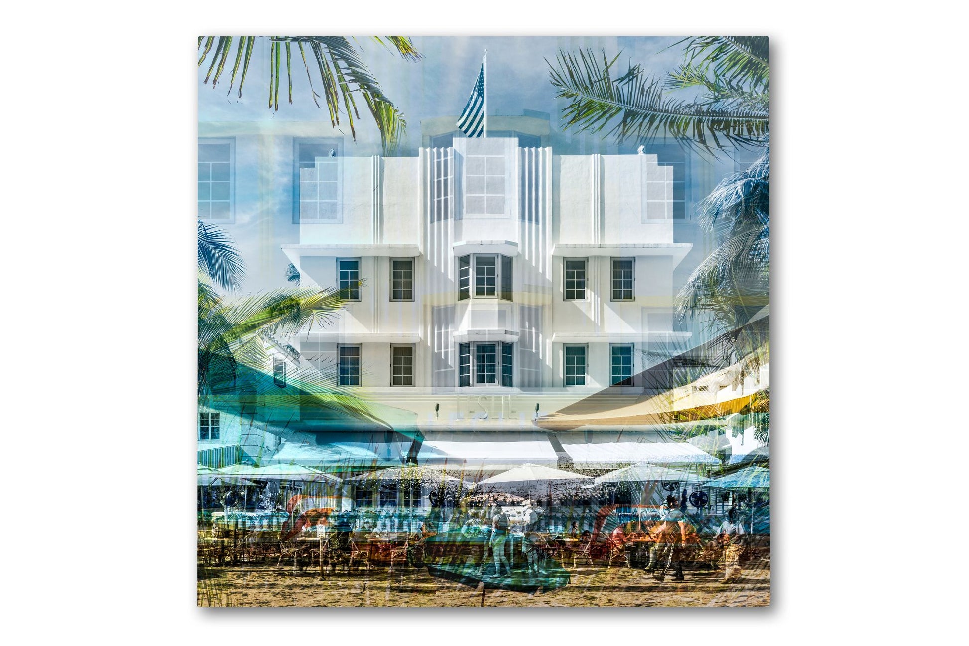 In South Beach, the atmosphere these architectural gems create is something I adore, animating the city and transforming it into a living, breathing canvas. My layered photographs aim to capture more than just the design of these masterpieces. They delve into the life that pulses around them, with beachgoers soaking up the sun, palm trees swaying in the breeze, and the unique light that fills our skies—all set against a timeless elegant background. This is a convergence of past and present, of architecture and humanity. The Art Deco style, renowned for its exotic flora and fauna motifs, resonates naturally with Miami's vibrant colors and elements: the azure ocean, flowers punctuating the cityscape, and the golden sun casting a warm glow over everything.