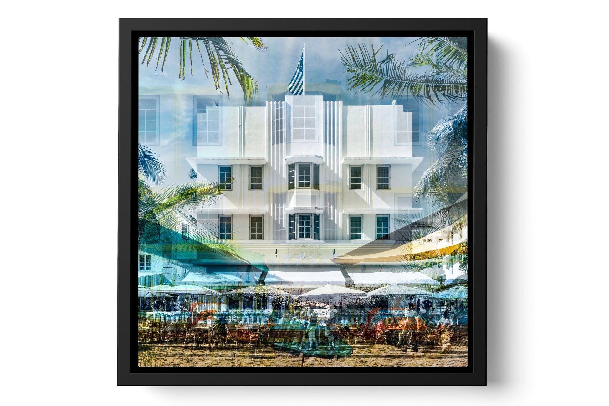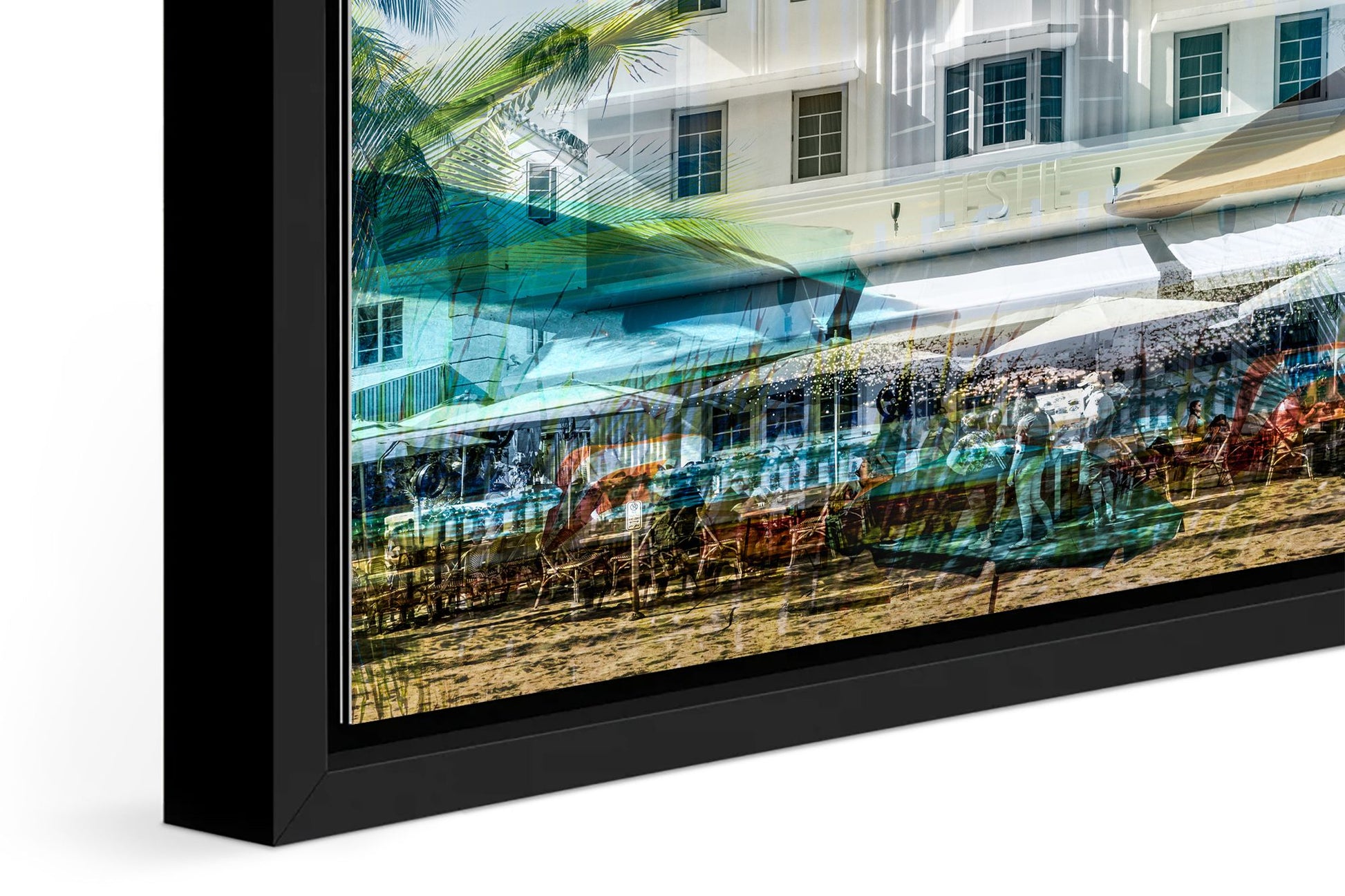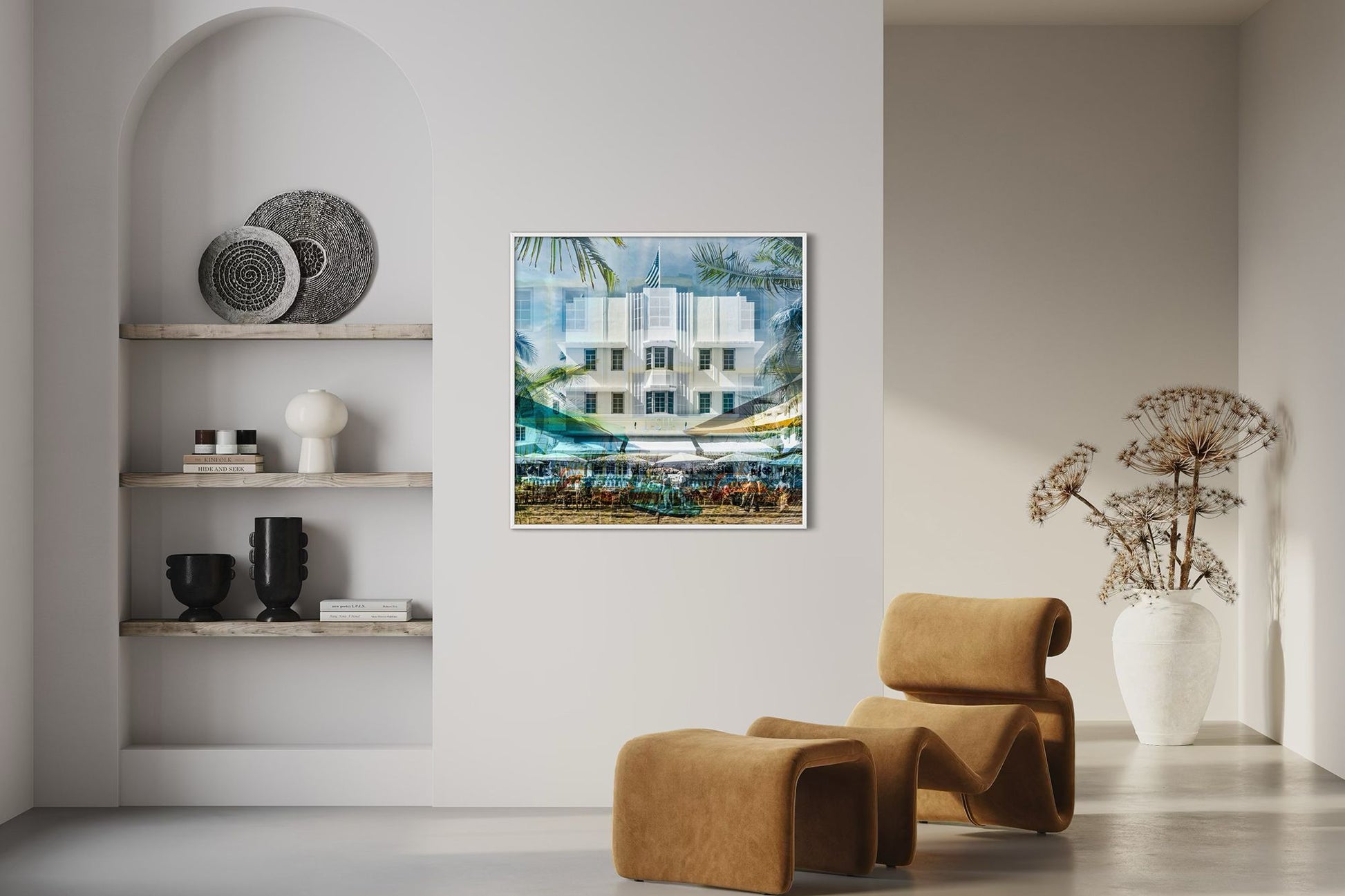 In South Beach, the atmosphere these architectural gems create is something I adore, animating the city and transforming it into a living, breathing canvas. My layered photographs aim to capture more than just the design of these masterpieces. They delve into the life that pulses around them, with beachgoers soaking up the sun, palm trees swaying in the breeze, and the unique light that fills our skies—all set against a timeless elegant background. This is a convergence of past and present, of architecture and humanity. The Art Deco style, renowned for its exotic flora and fauna motifs, resonates naturally with Miami's vibrant colors and elements: the azure ocean, flowers punctuating the cityscape, and the golden sun casting a warm glow over everything.