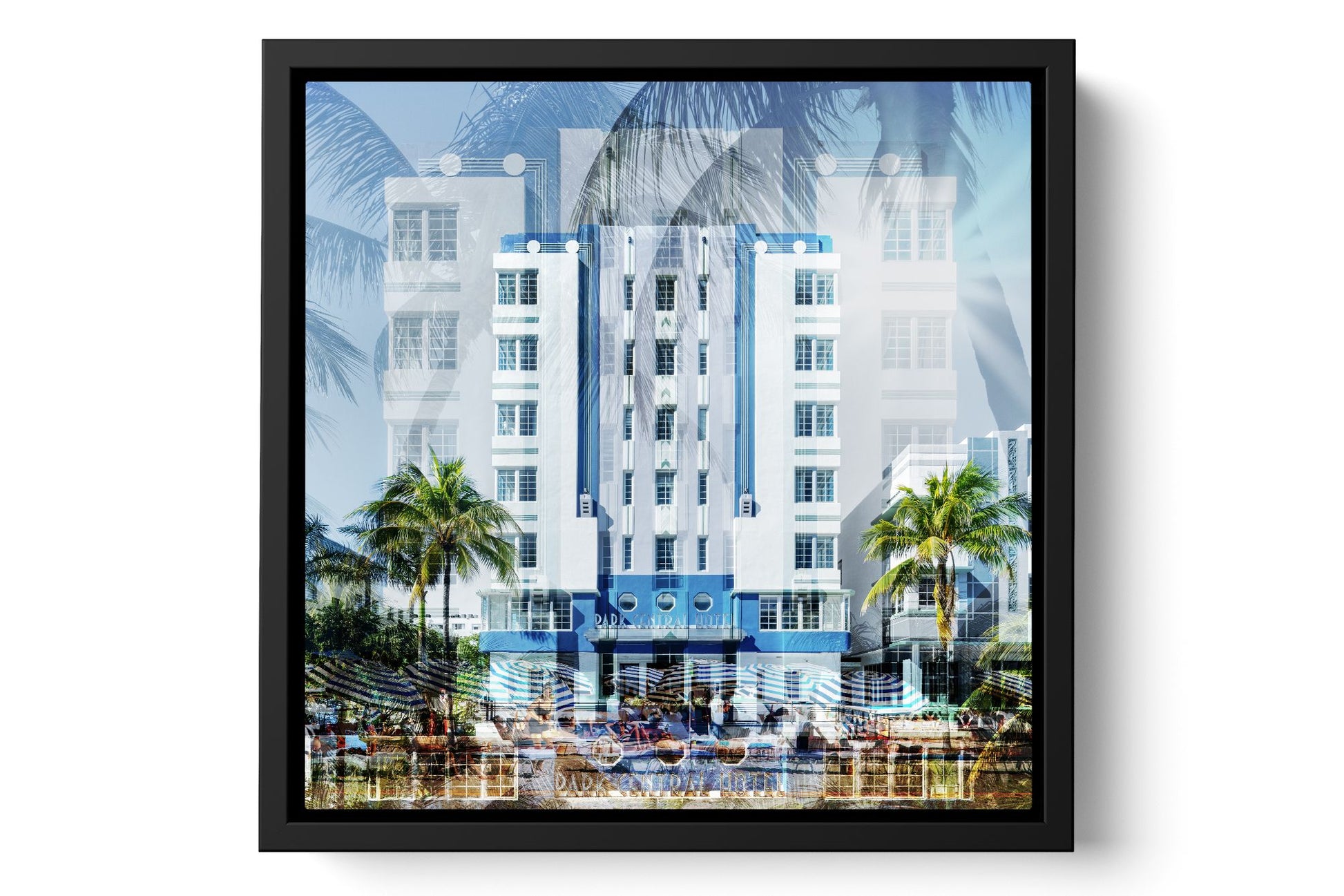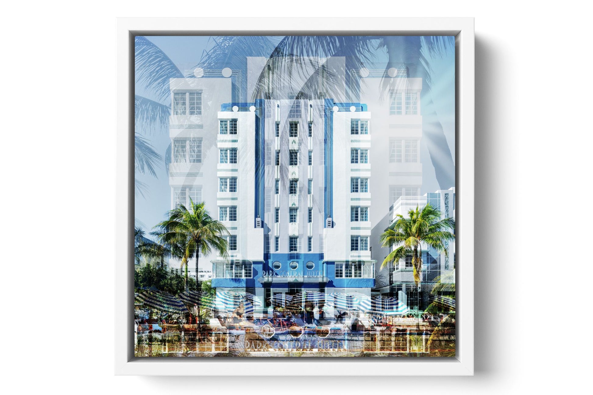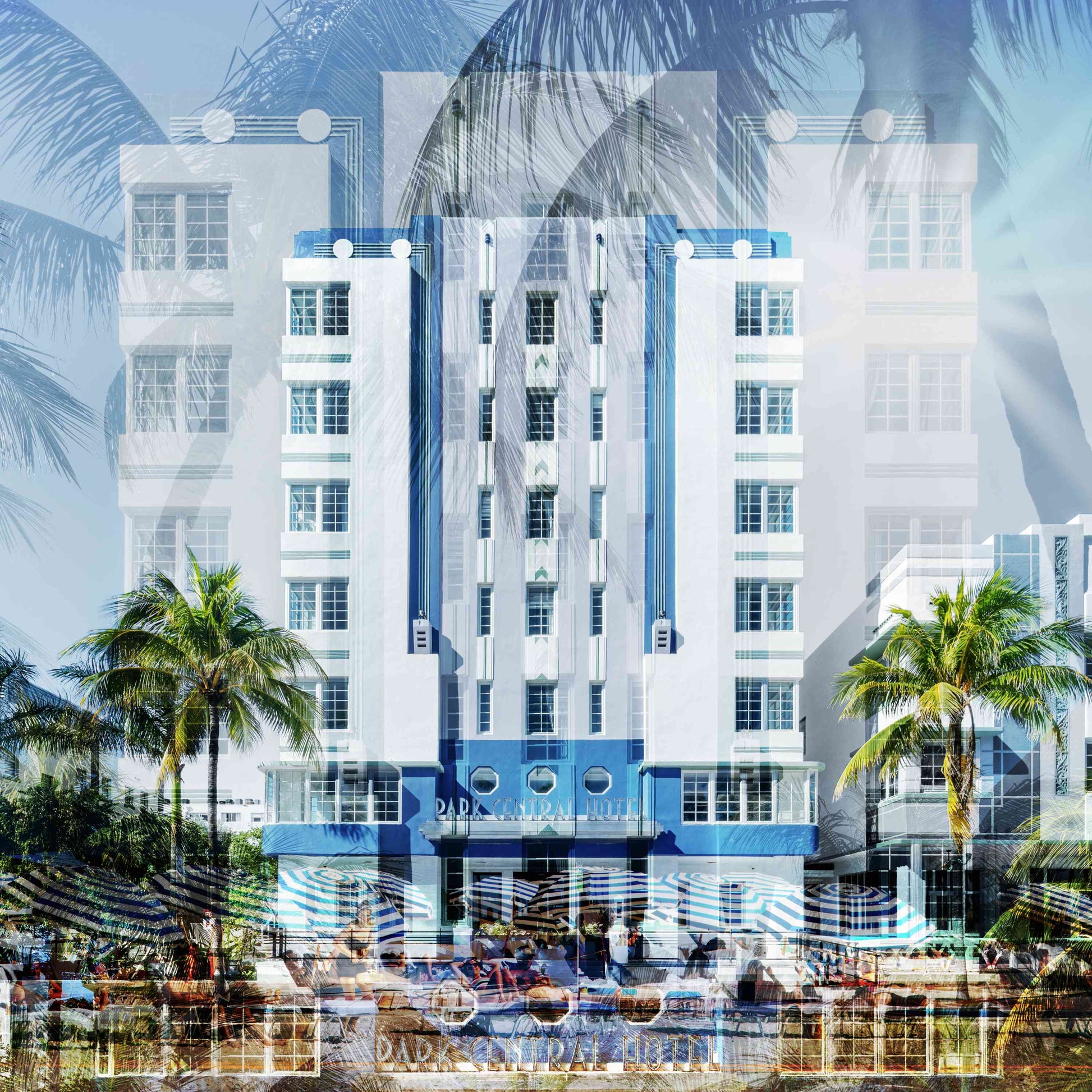 In The Park Central, Charlotte Fonne creates an artwork that captures the architecture of one of Miami Beach’s iconic Art Deco hotels on Ocean Drive and its surroundings through her layered photographic technique. The fusion of the geometric architecture with carefully selected local elements, including palm trees, a glowing sun, and people enjoying the beach on lounge chairs under umbrellas, forms a visual exploration rich in detail. A closer shot of the façade adds a graphic rhythm, gives a better look at the structure, and brings up the name of the hotel. This fine art photography print celebrates Miami’s Art Deco heritage and the energy of South Beach.
