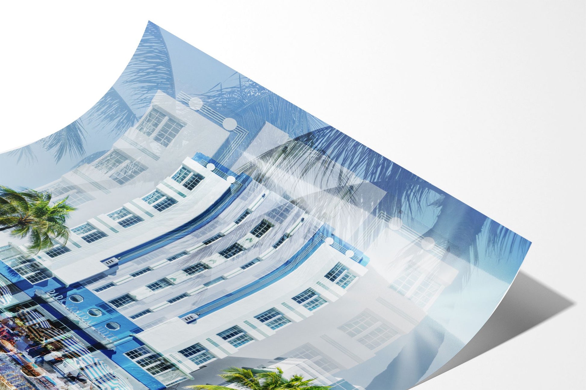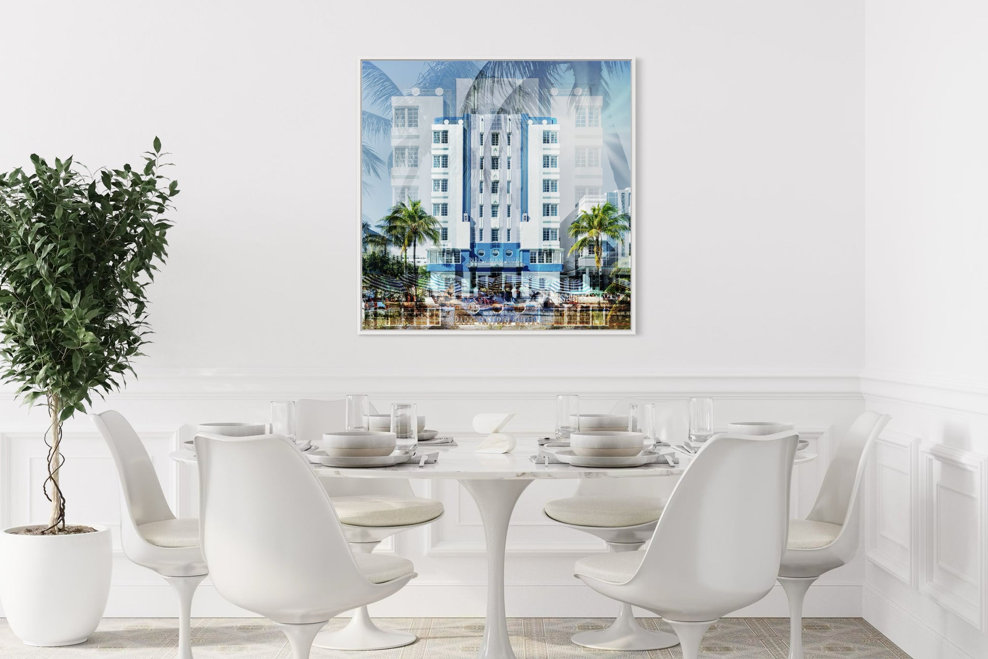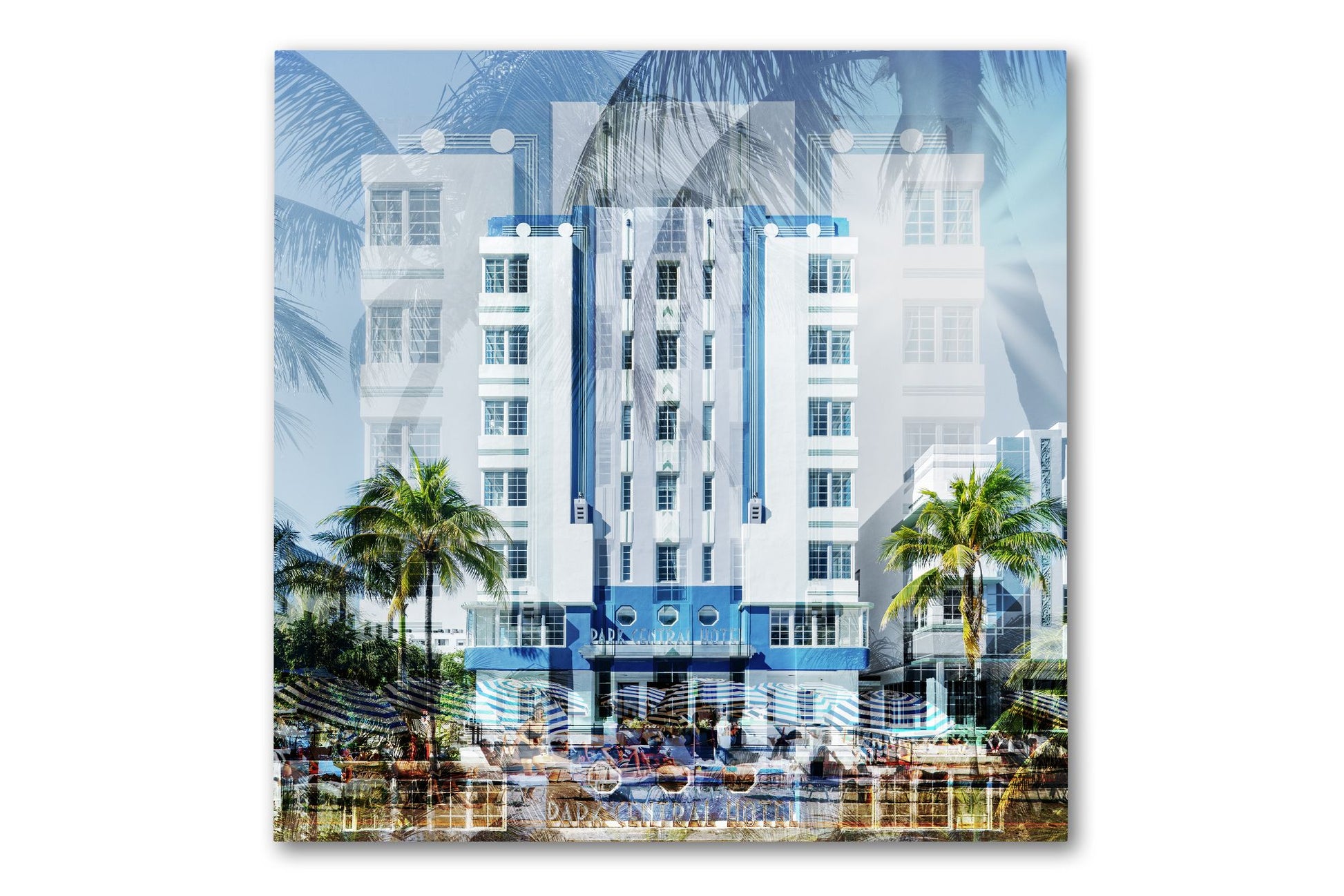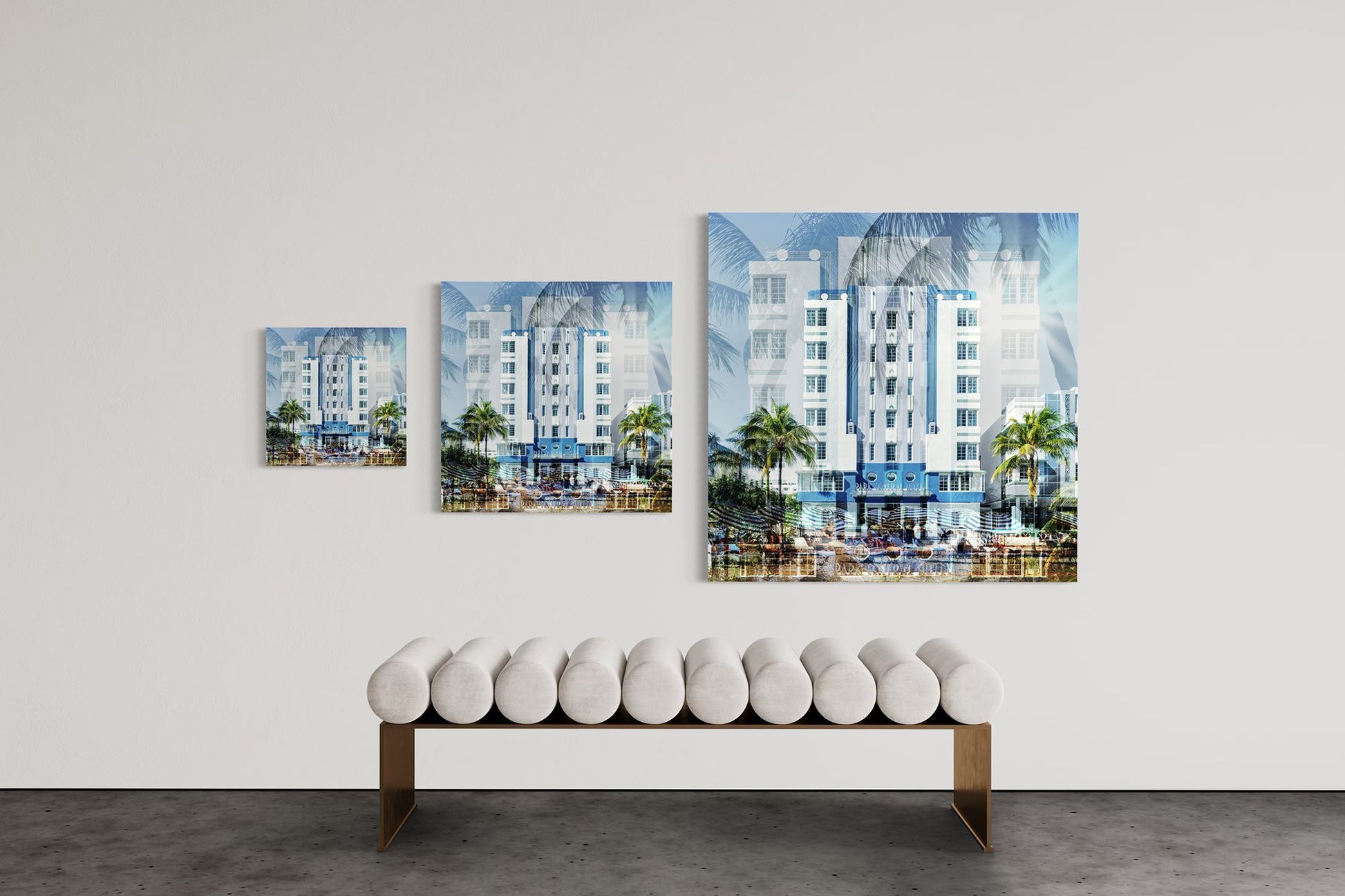 In South Beach, the atmosphere these architectural gems create is something I adore, animating the city and transforming it into a living, breathing canvas. My layered photographs aim to capture more than just the design of these masterpieces. They delve into the life that pulses around them, with beachgoers soaking up the sun, palm trees swaying in the breeze, and the unique light that fills our skies—all set against a timeless elegant background. This is a convergence of past and present, of architecture and humanity. The Art Deco style, renowned for its exotic flora and fauna motifs, resonates naturally with Miami's vibrant colors and elements: the azure ocean, flowers punctuating the cityscape, and the golden sun casting a warm glow over everything.