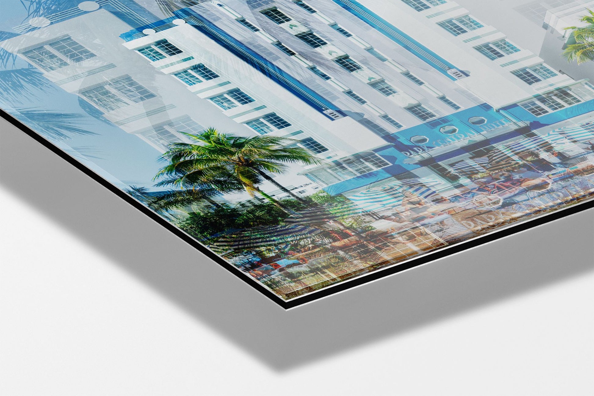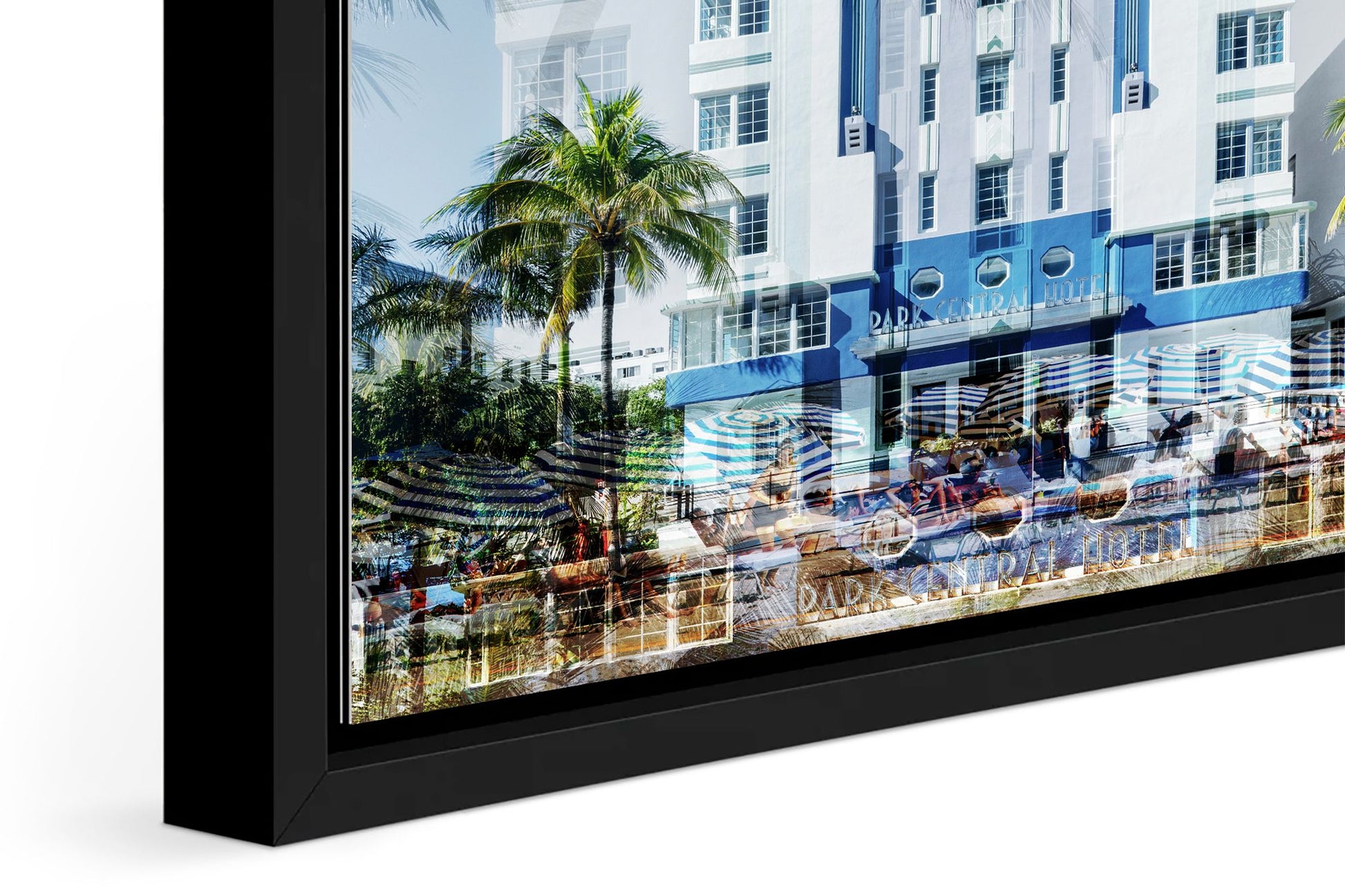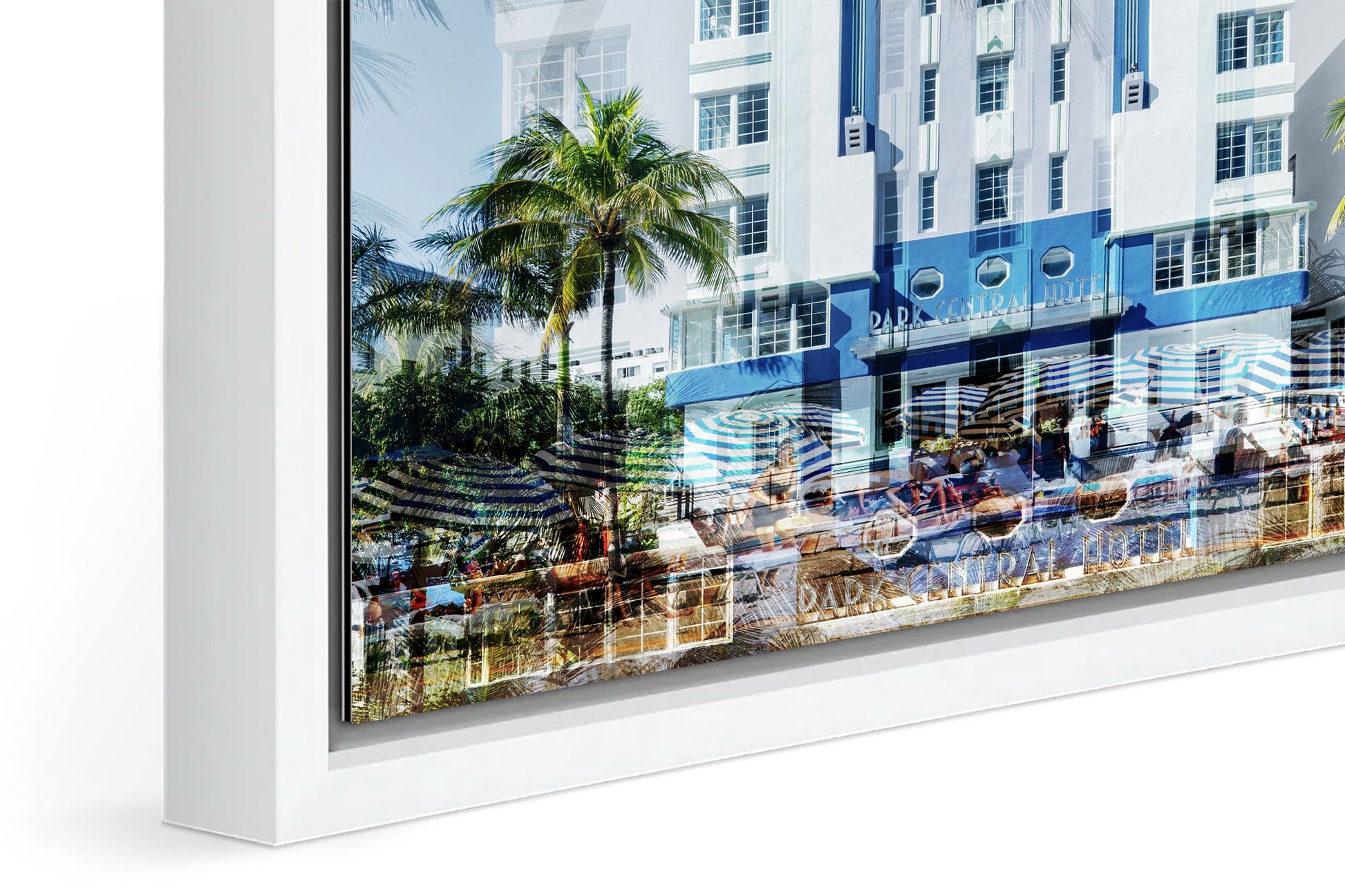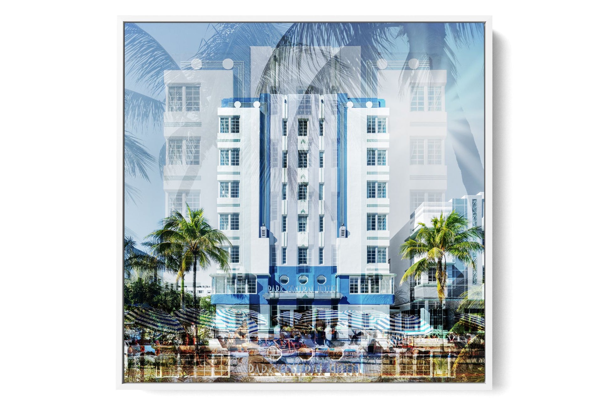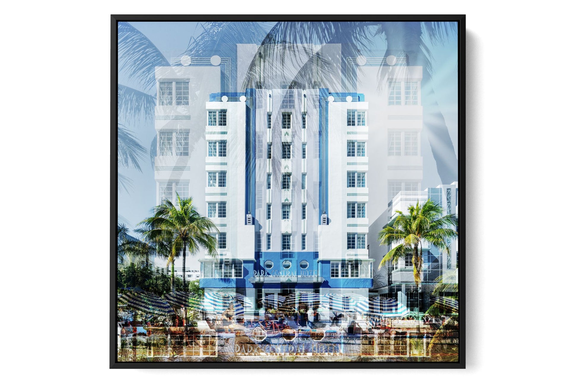 In South Beach, the atmosphere these architectural gems create is something I adore, animating the city and transforming it into a living, breathing canvas. My layered photographs aim to capture more than just the design of these masterpieces. They delve into the life that pulses around them, with beachgoers soaking up the sun, palm trees swaying in the breeze, and the unique light that fills our skies—all set against a timeless elegant background. This is a convergence of past and present, of architecture and humanity. The Art Deco style, renowned for its exotic flora and fauna motifs, resonates naturally with Miami's vibrant colors and elements: the azure ocean, flowers punctuating the cityscape, and the golden sun casting a warm glow over everything.