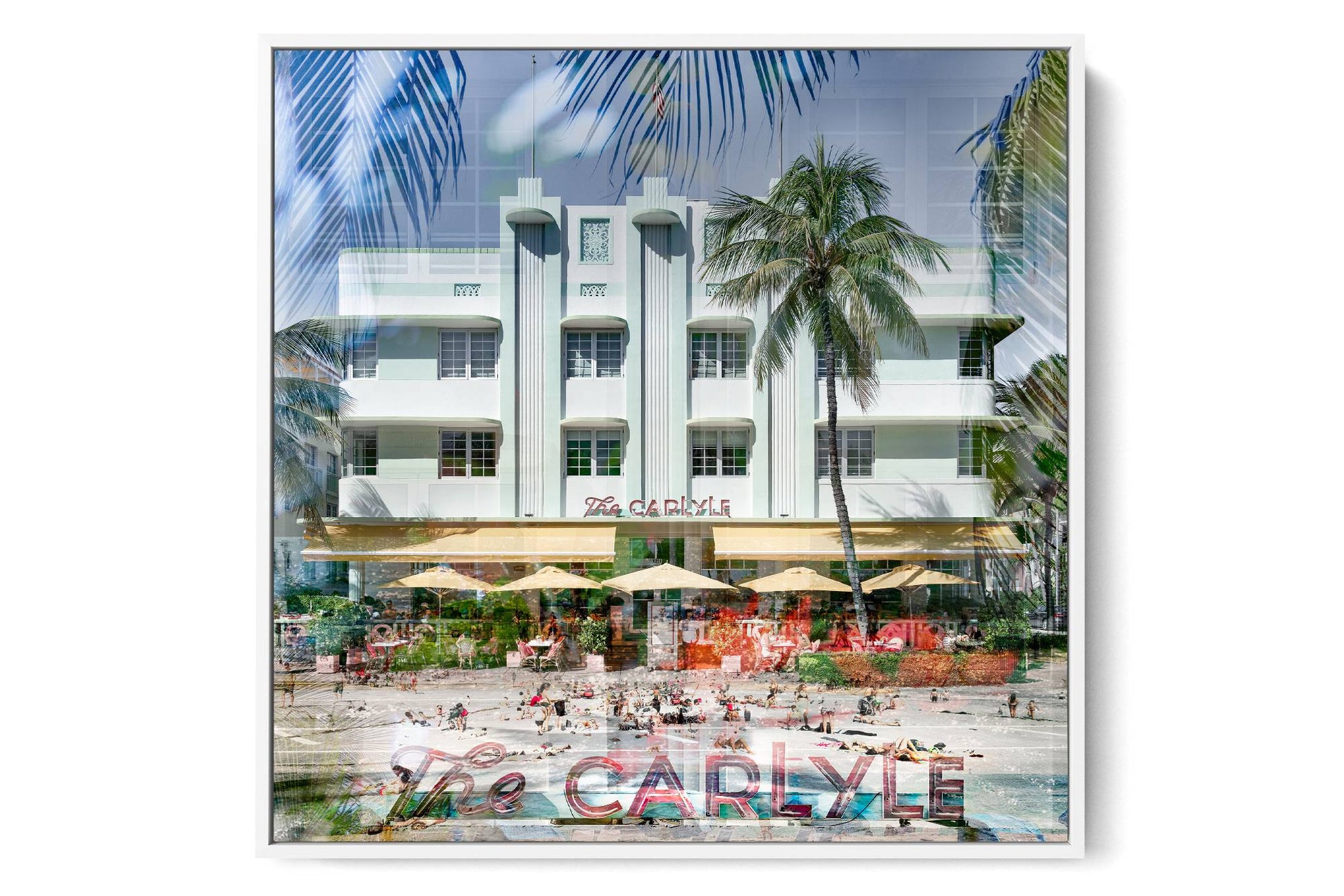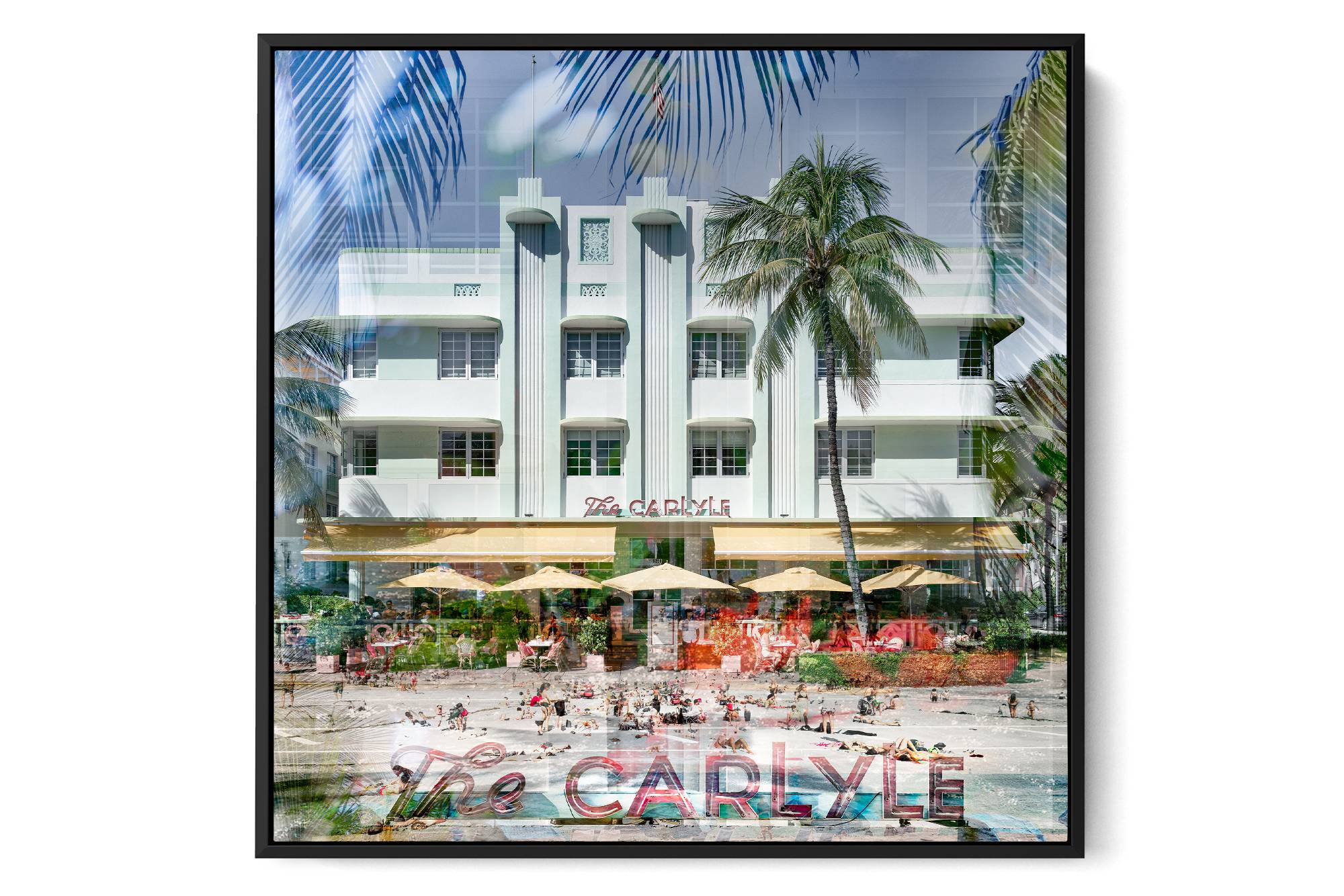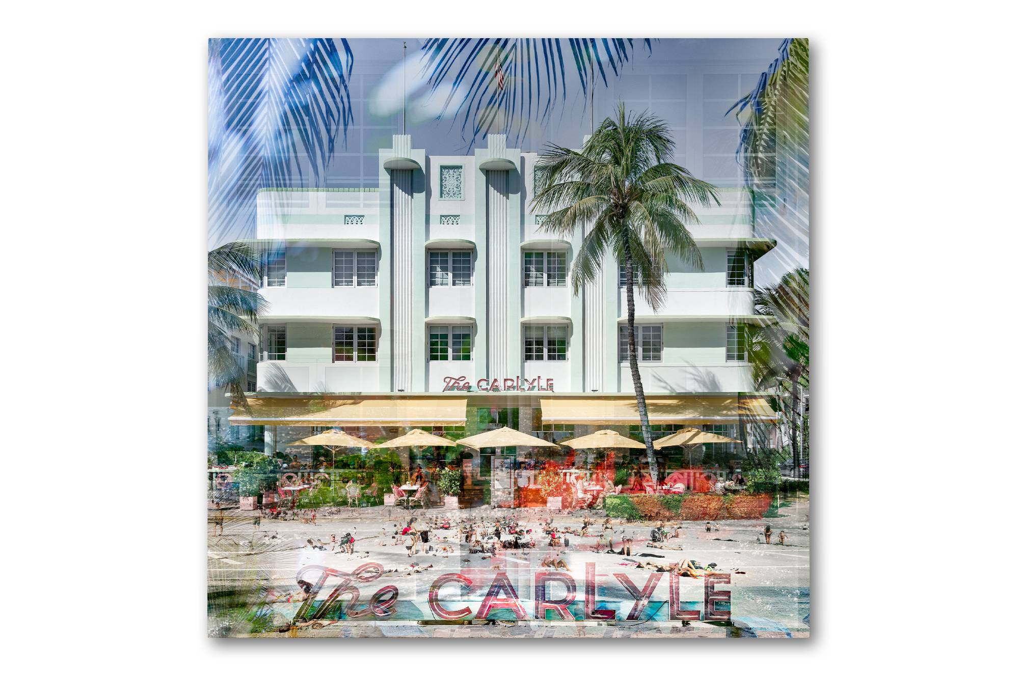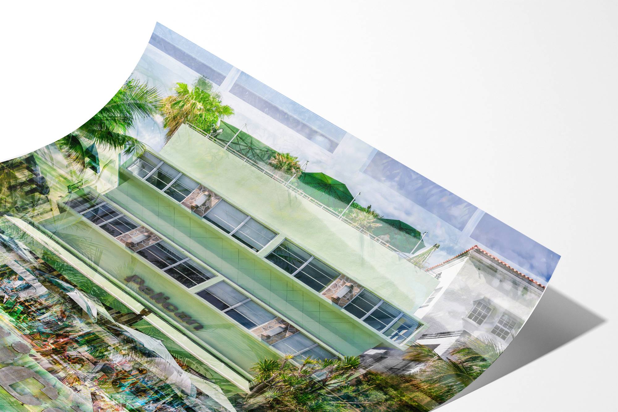 In South Beach, the atmosphere these architectural gems create is something I adore, animating the city and transforming it into a living, breathing canvas. My layered photographs aim to capture more than just the design of these masterpieces. They delve into the life that pulses around them, with beachgoers soaking up the sun, palm trees swaying in the breeze, and the unique light that fills our skies—all set against a timeless elegant background. This is a convergence of past and present, of architecture and humanity. The Art Deco style, renowned for its exotic flora and fauna motifs, resonates naturally with Miami's vibrant colors and elements: the azure ocean, flowers punctuating the cityscape, and the golden sun casting a warm glow over everything.