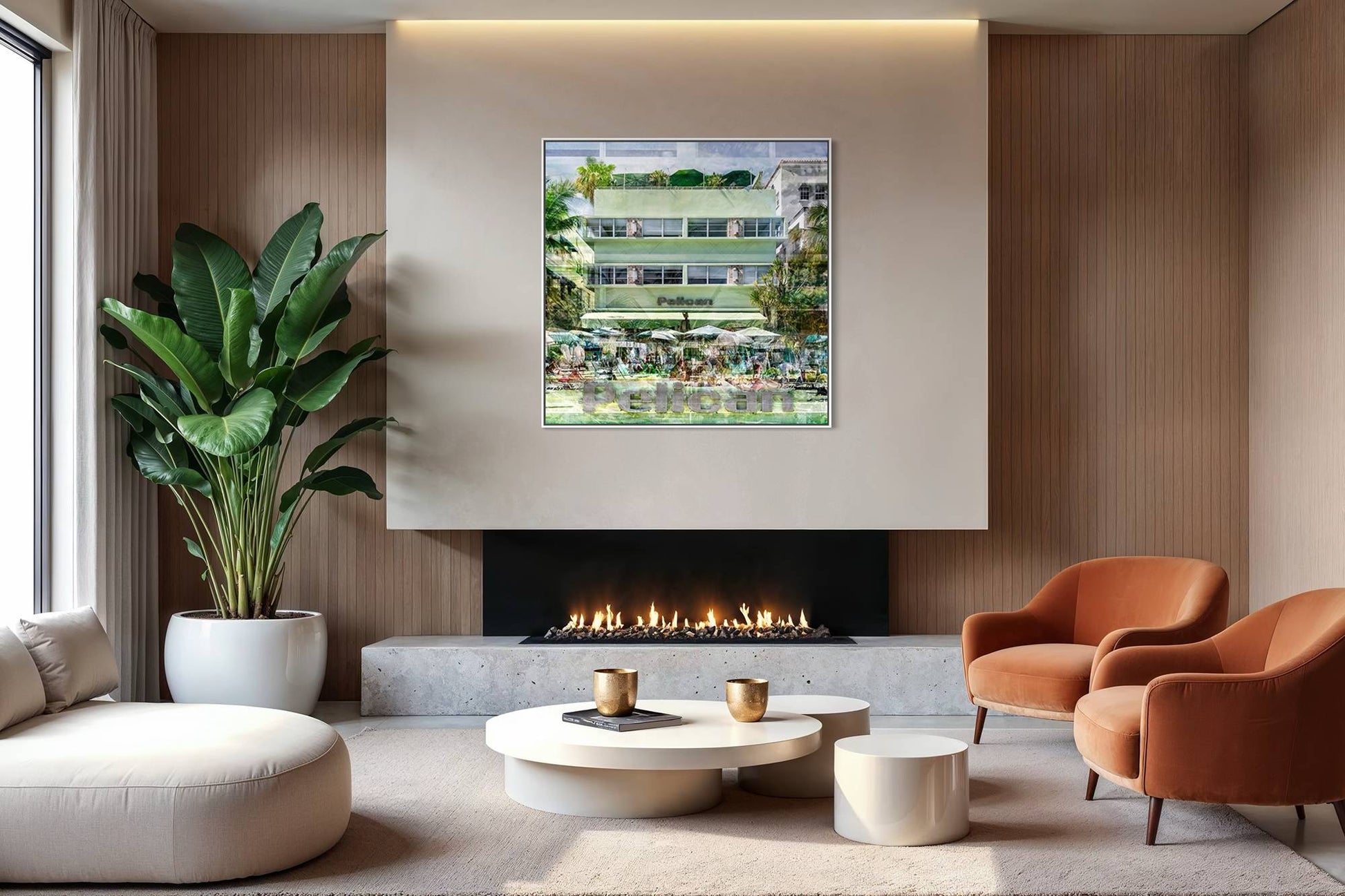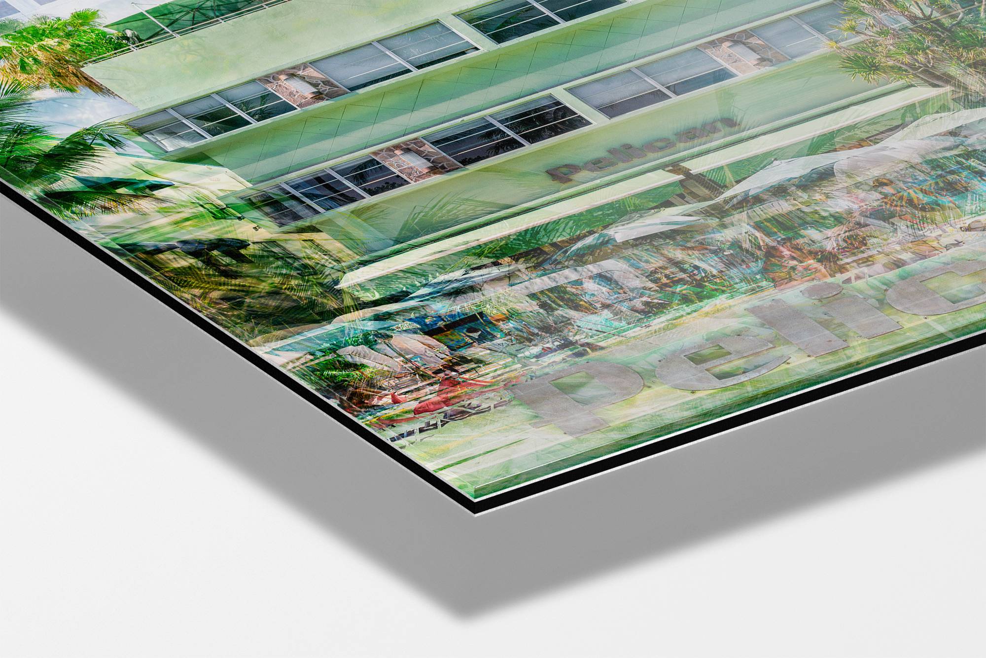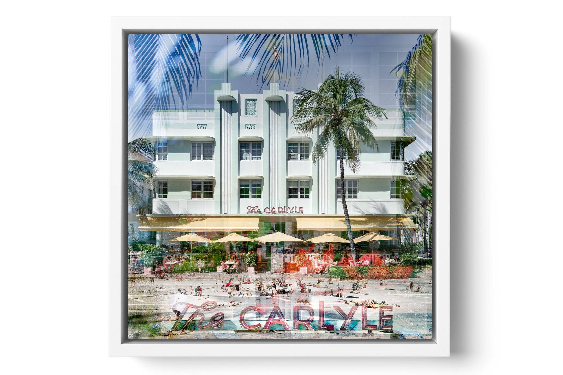 In South Beach, the atmosphere these architectural gems create is something I adore, animating the city and transforming it into a living, breathing canvas. My layered photographs aim to capture more than just the design of these masterpieces. They delve into the life that pulses around them, with beachgoers soaking up the sun, palm trees swaying in the breeze, and the unique light that fills our skies—all set against a timeless elegant background. This is a convergence of past and present, of architecture and humanity. The Art Deco style, renowned for its exotic flora and fauna motifs, resonates naturally with Miami's vibrant colors and elements: the azure ocean, flowers punctuating the cityscape, and the golden sun casting a warm glow over everything.