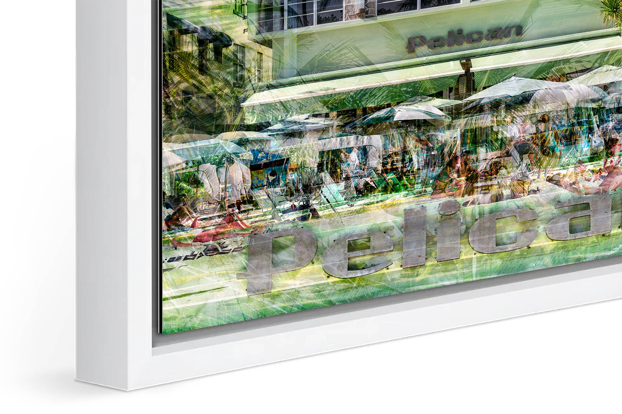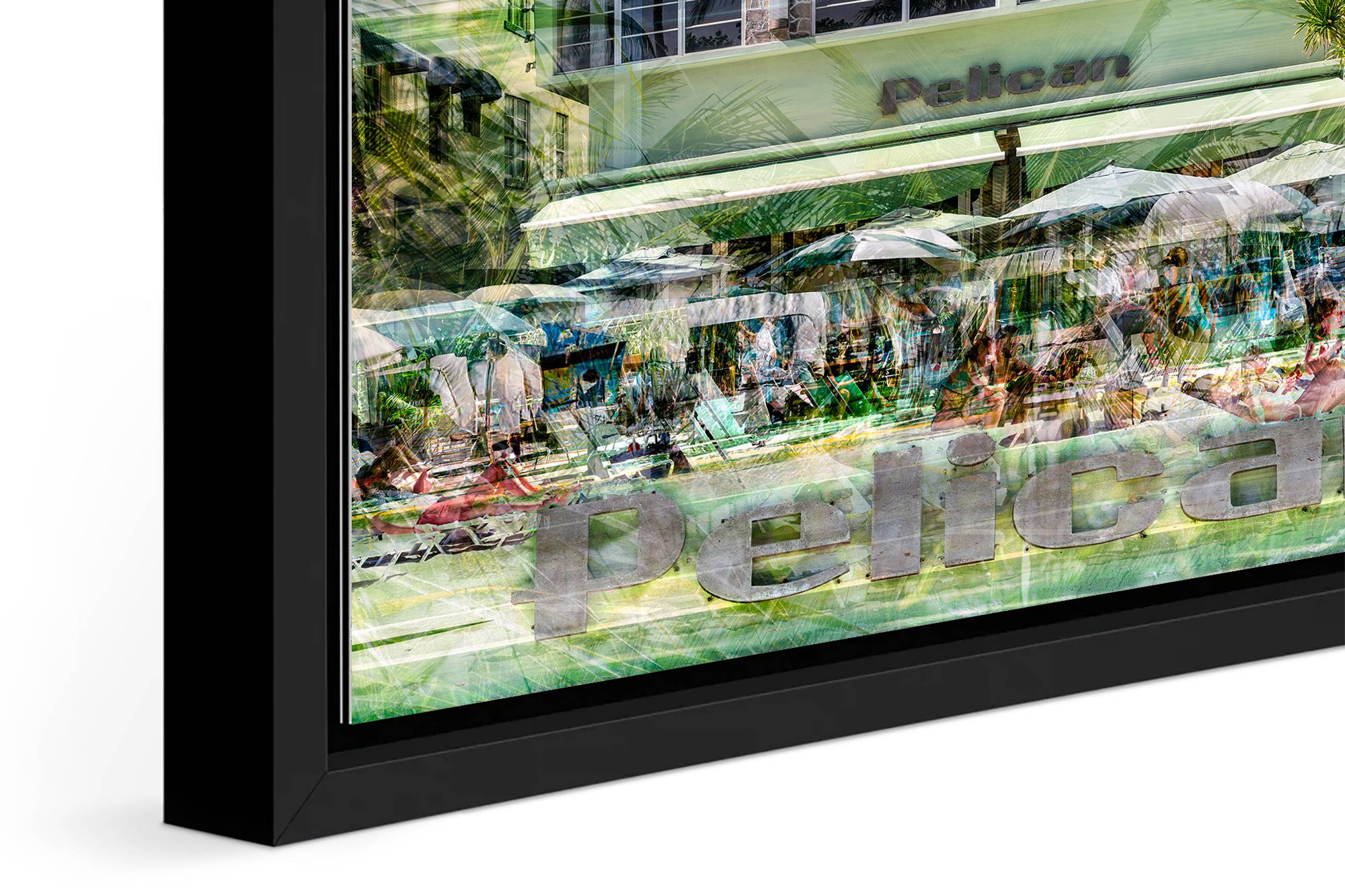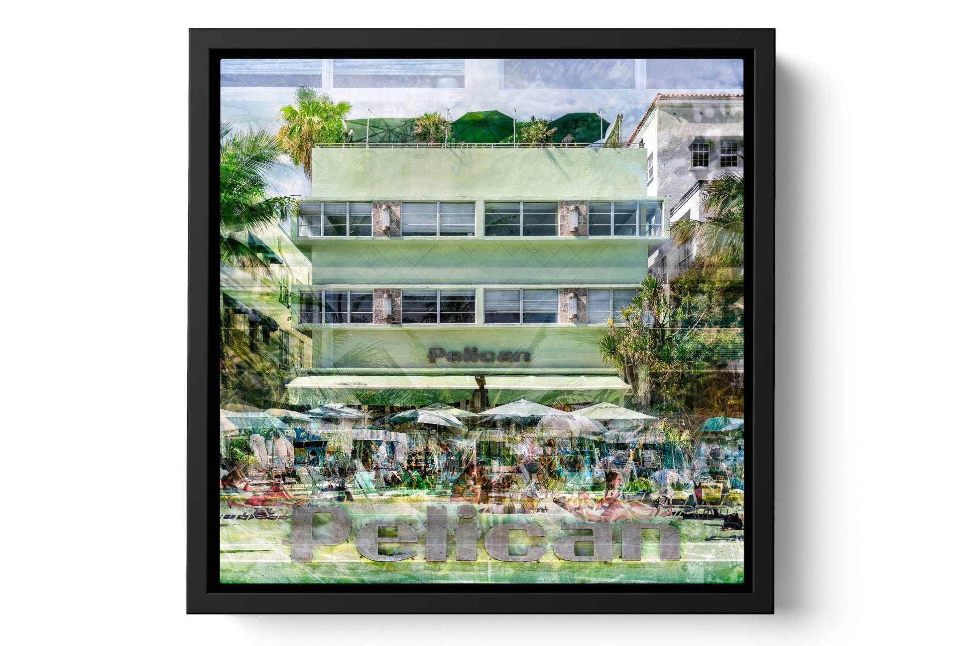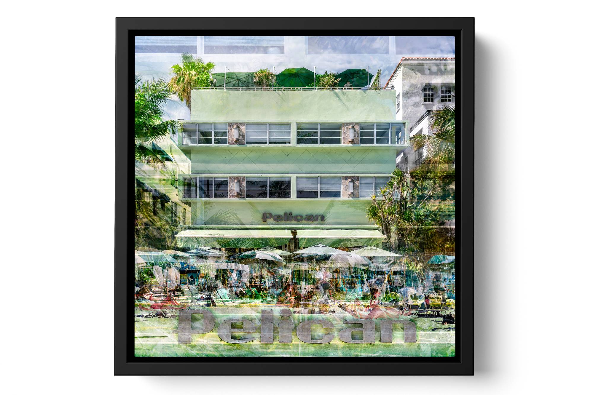 In South Beach, the atmosphere these architectural gems create is something I adore, animating the city and transforming it into a living, breathing canvas. My layered photographs aim to capture more than just the design of these masterpieces. They delve into the life that pulses around them, with beachgoers soaking up the sun, palm trees swaying in the breeze, and the unique light that fills our skies—all set against a timeless elegant background. This is a convergence of past and present, of architecture and humanity. The Art Deco style, renowned for its exotic flora and fauna motifs, resonates naturally with Miami's vibrant colors and elements: the azure ocean, flowers punctuating the cityscape, and the golden sun casting a warm glow over everything.