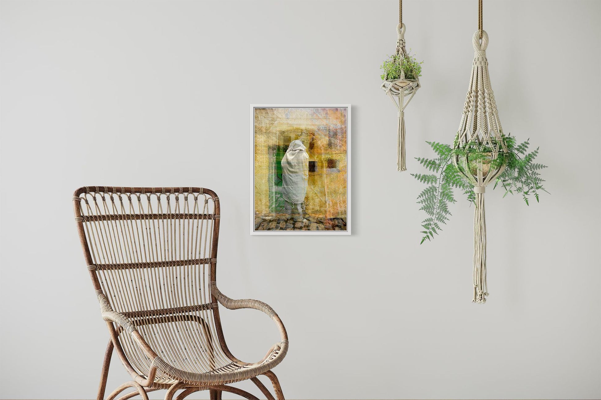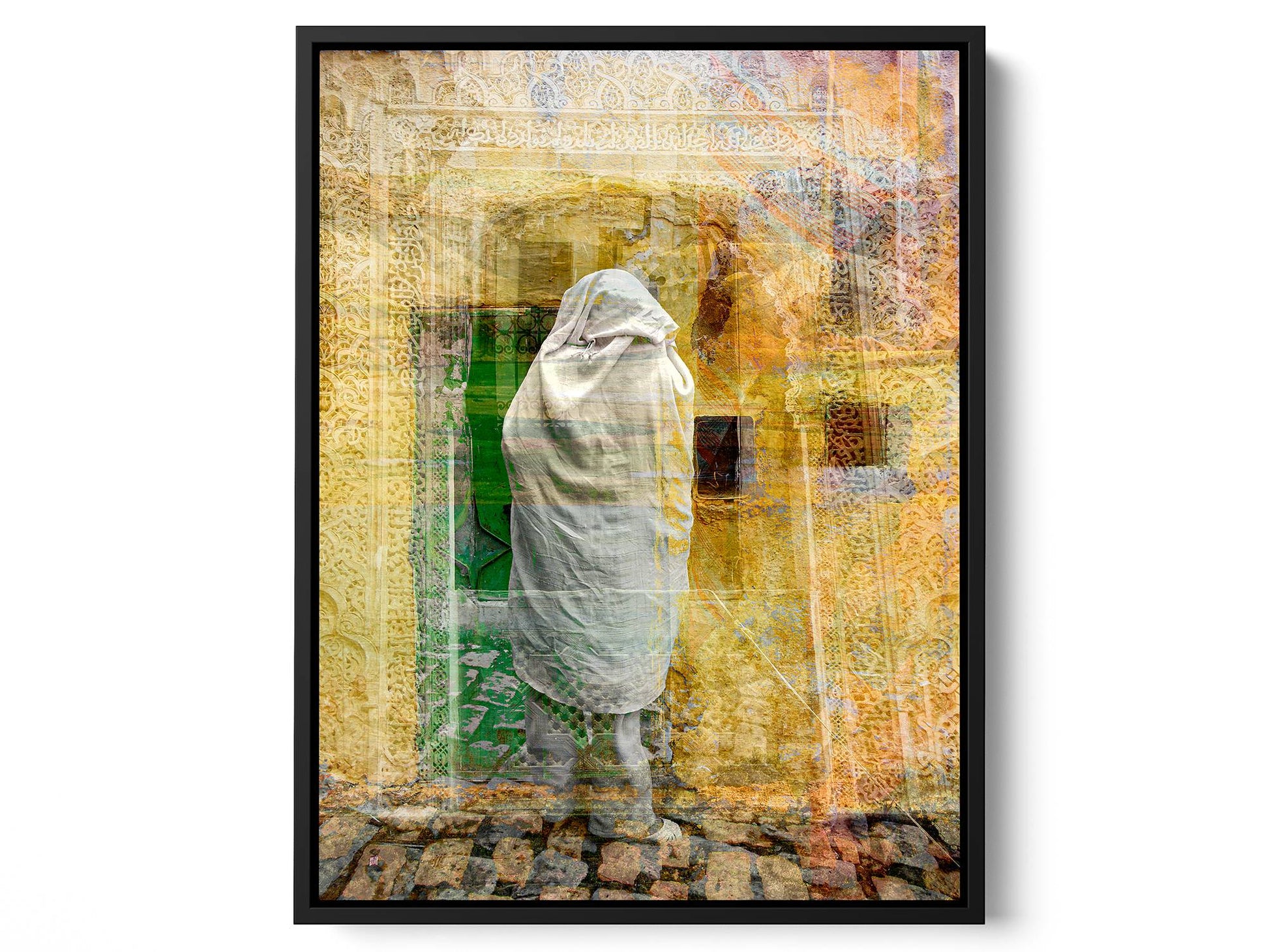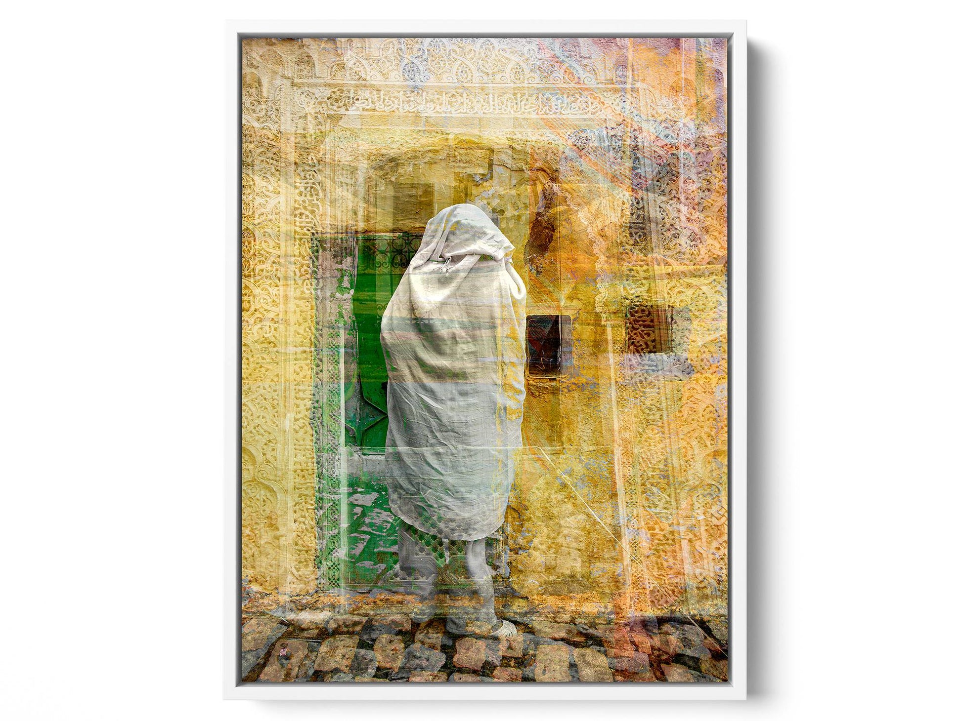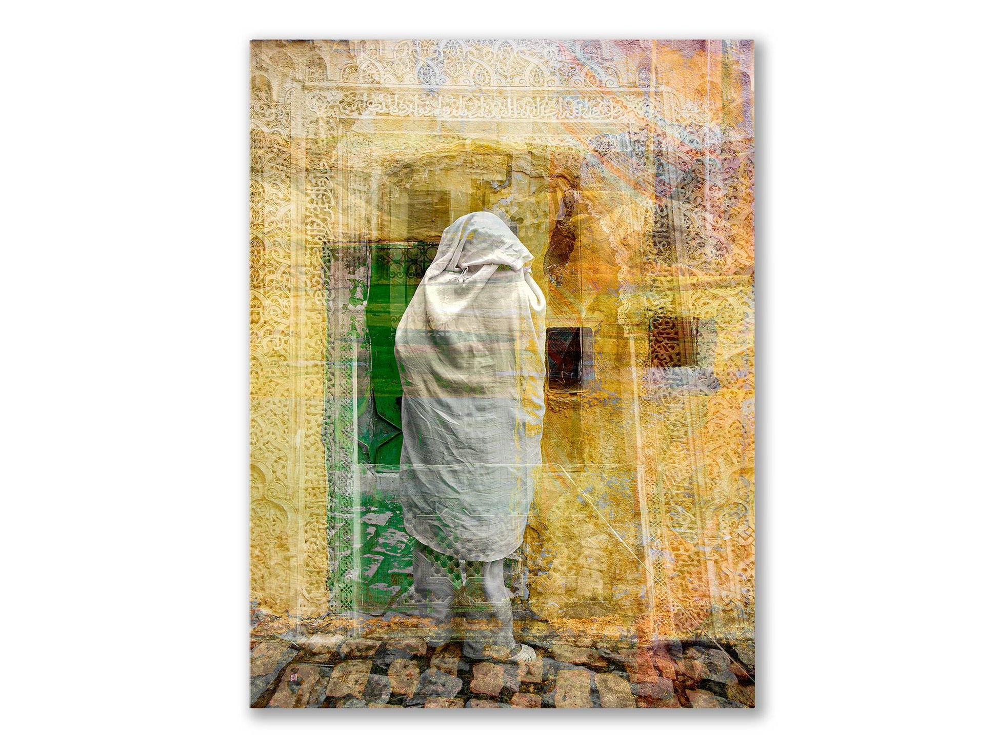 In Woman in White Haik, Charlotte Fonne creates a portrait of a woman wearing a Haik, a traditional Moroccan white garment, through her layered photographic technique. Each element of the artwork is carefully selected to represent fragments of her life and environment, forming a visual exploration of identity. The fusion of her posture, shown from the back draped in white, with elements of Bhalil village in Morocco, including the yellow façade of her house, a traditional sculpted marble window from a mosque, the surrounding hills, and the colorful fabrics from a local market, reflects the history and culture she carries with her. This fine art photography print focuses on the traditional attire that symbolizes modesty, purity, identity, and religious devotion while highlighting ancestral legacy.