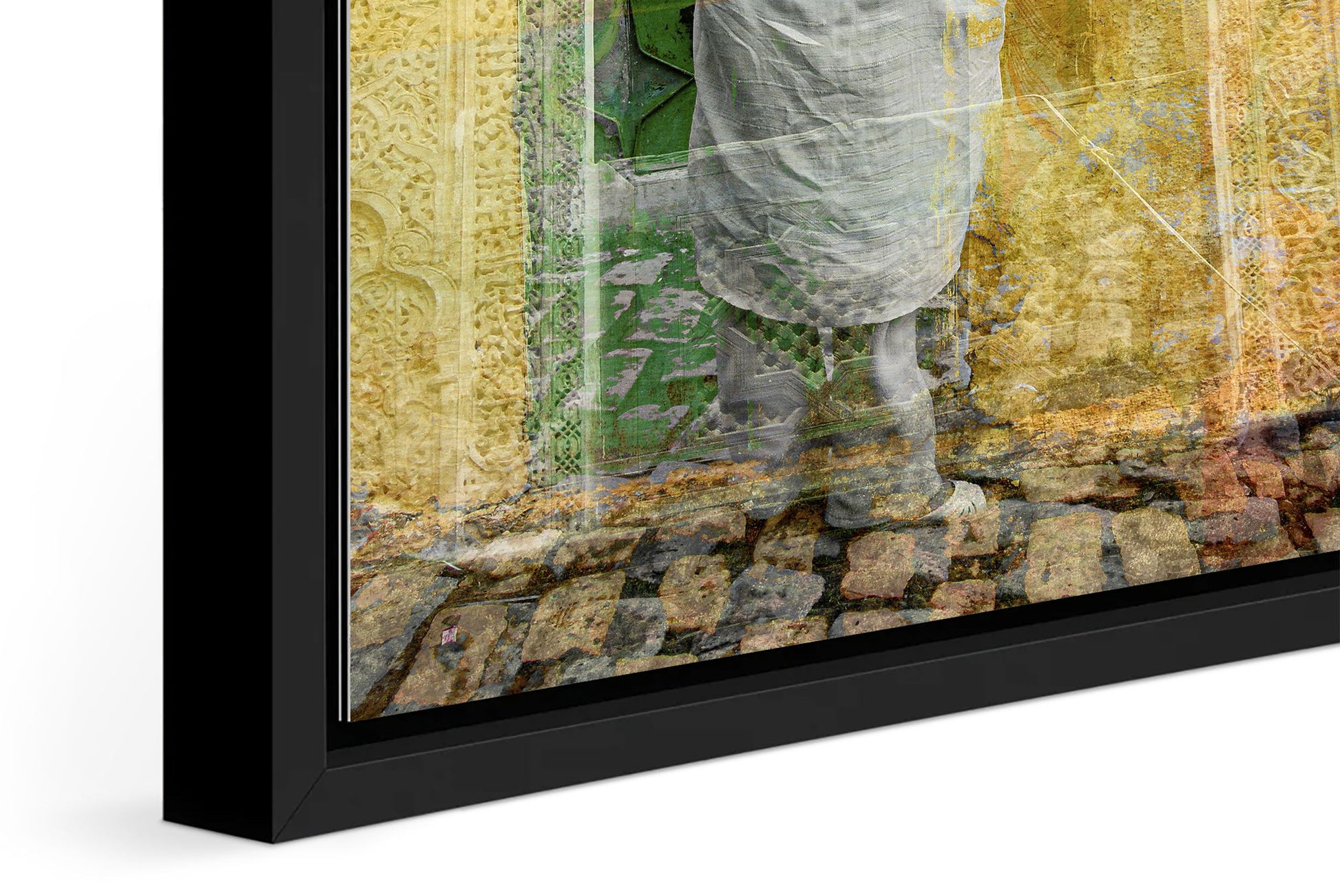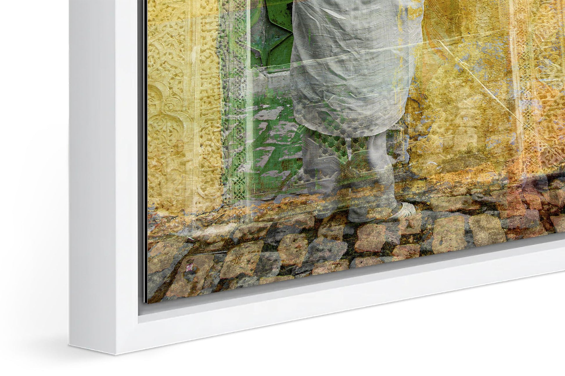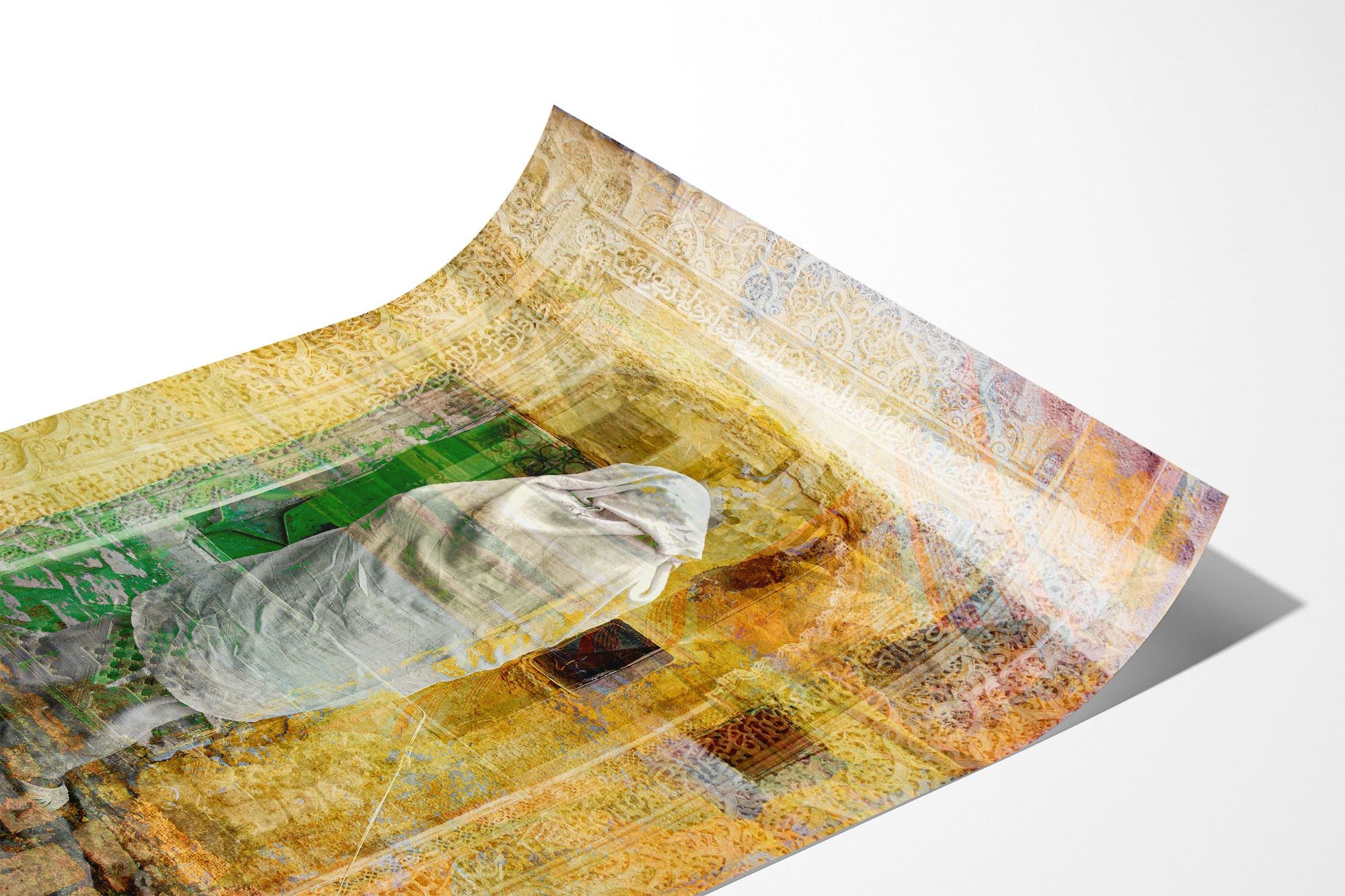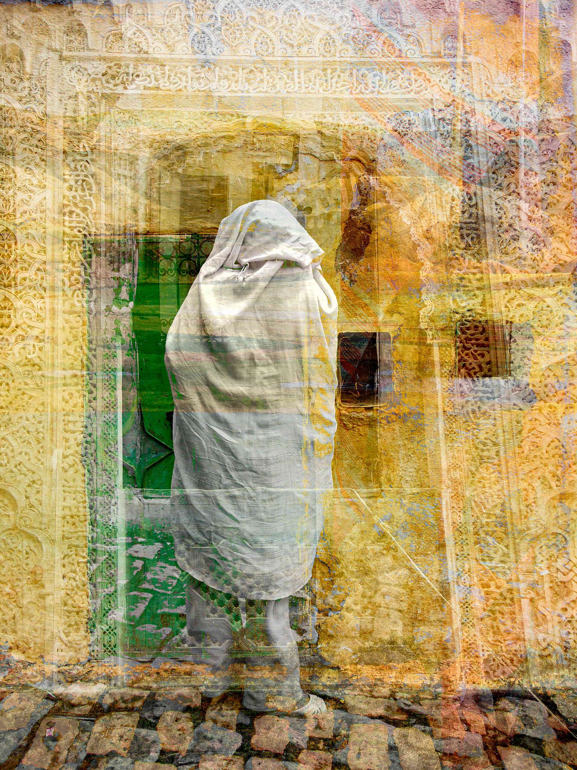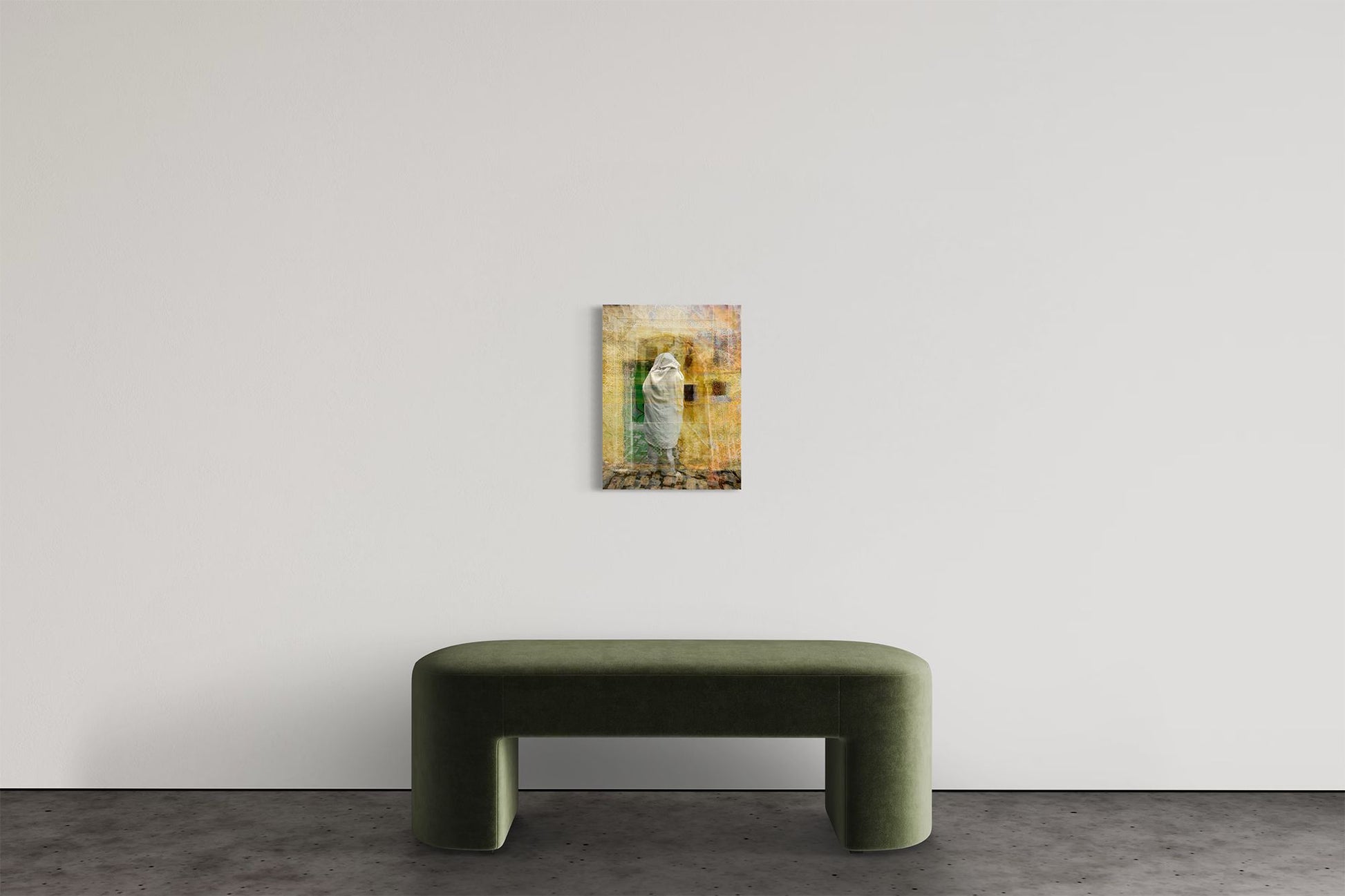 In Woman in White Haik, Charlotte Fonne creates a portrait of a woman wearing a Haik, a traditional Moroccan white garment, through her layered photographic technique. Each element of the artwork is carefully selected to represent fragments of her life and environment, forming a visual exploration of identity. The fusion of her posture, shown from the back draped in white, with elements of Bhalil village in Morocco, including the yellow façade of her house, a traditional sculpted marble window from a mosque, the surrounding hills, and the colorful fabrics from a local market, reflects the history and culture she carries with her. This fine art photography print focuses on the traditional attire that symbolizes modesty, purity, identity, and religious devotion while highlighting ancestral legacy.